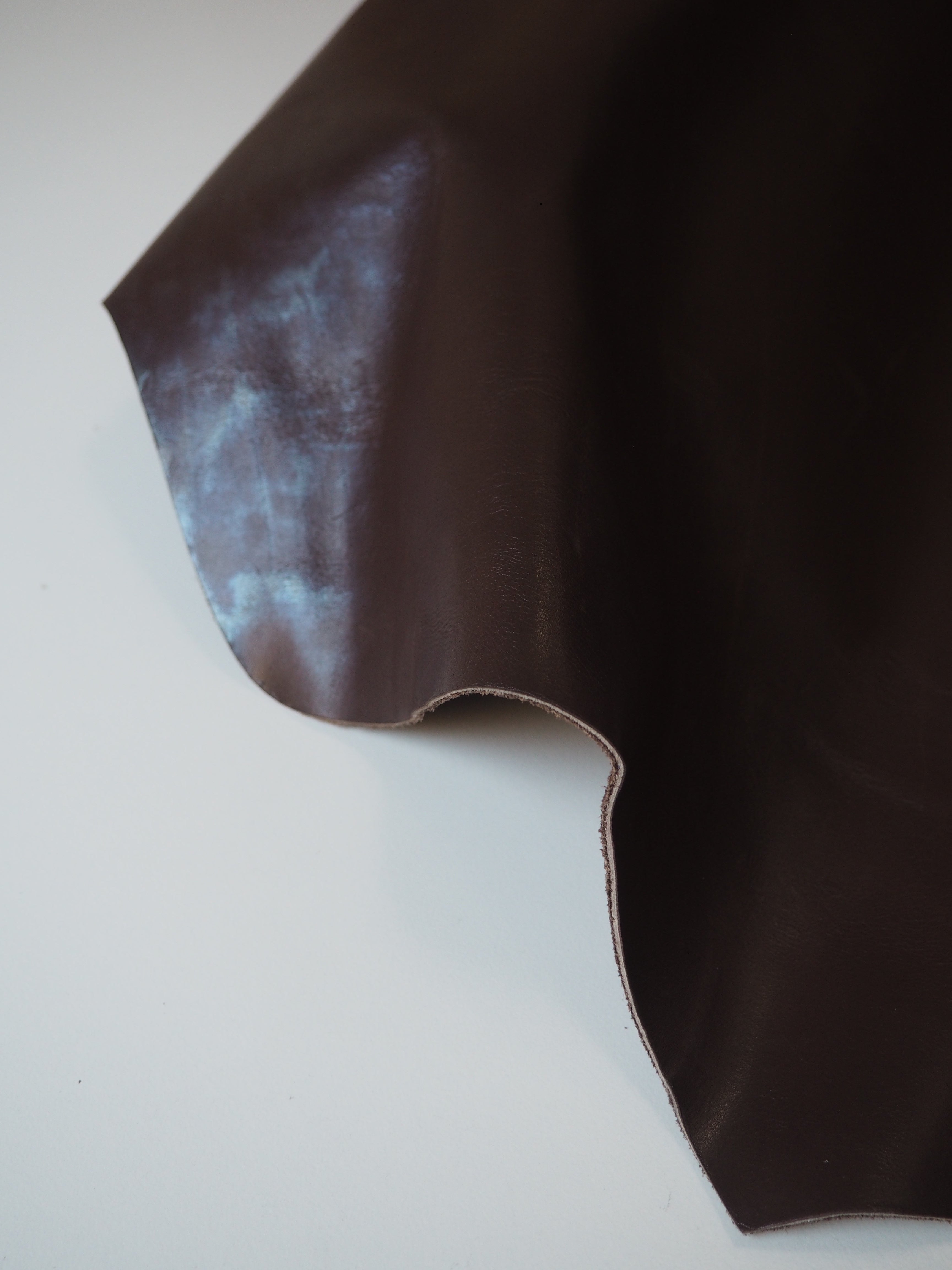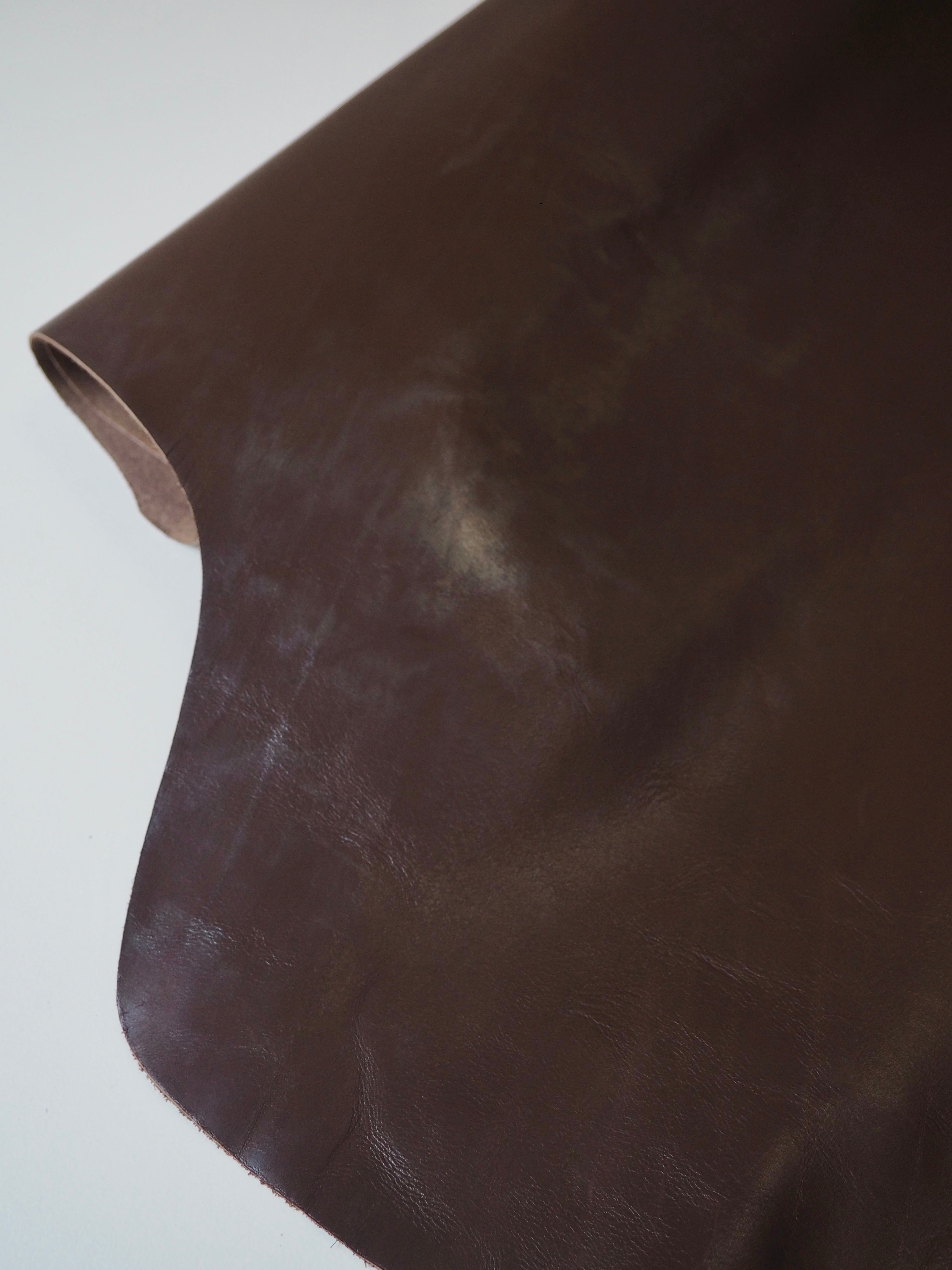 This ex-designer leather is a calfskin. It's a smooth leather with a shiny finish, a sturdy handle, and medium weight. Has a great structure, in a darker brown colour. We would love to see this made up into a bag or purse! Slight marks at the side, reflected in price.