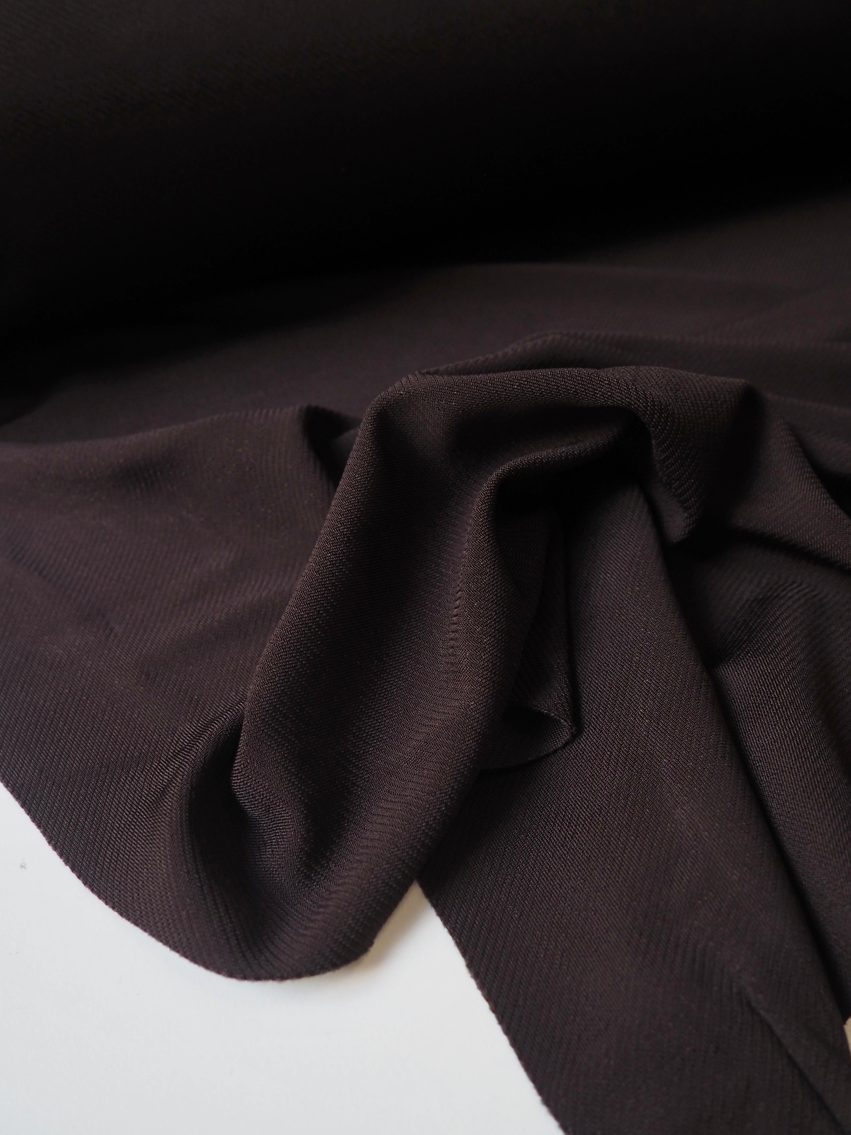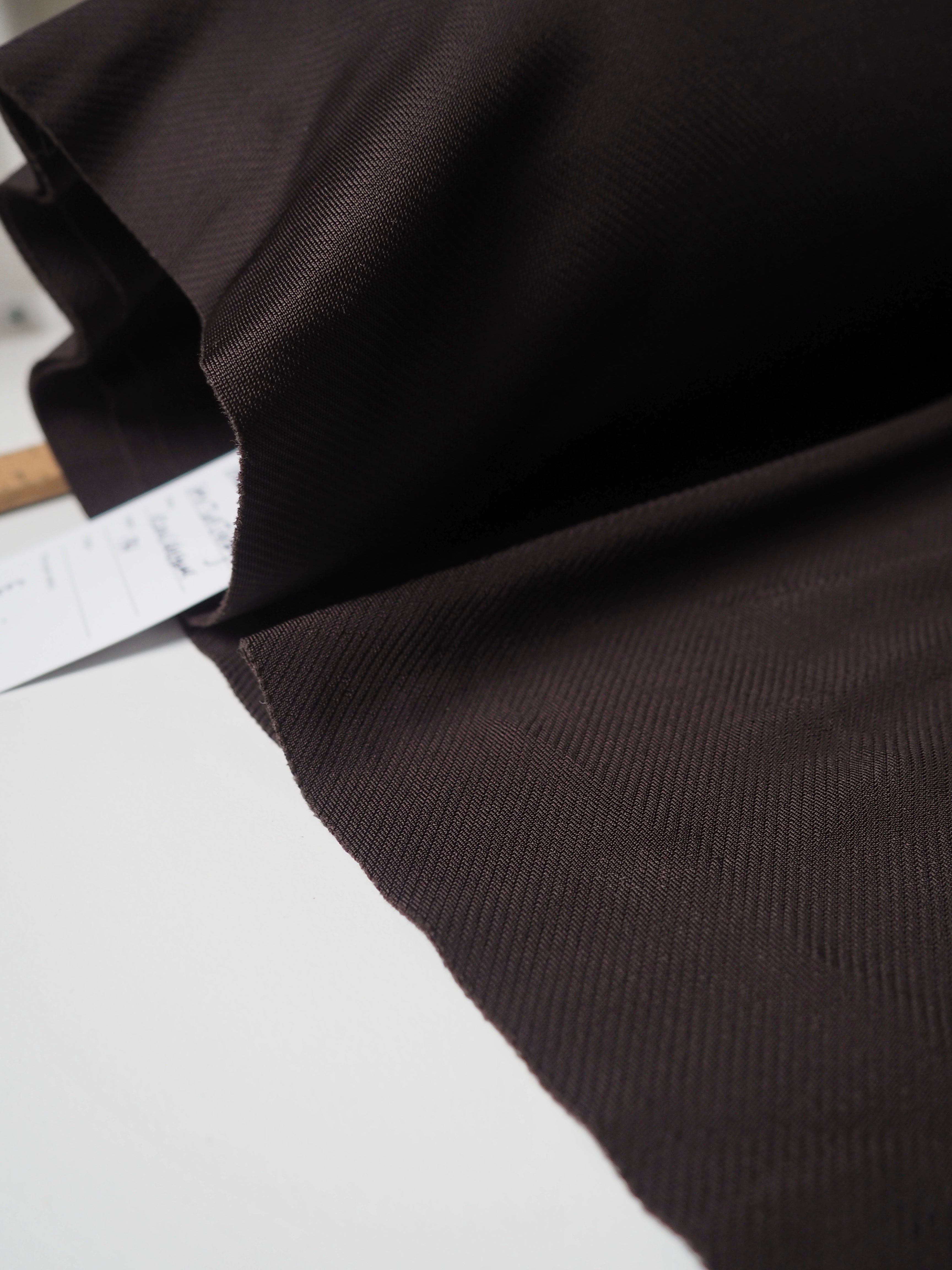 This ex-designer fabric is a jersey. It has a twill knit structure, which gives it an interesting texture and enhanced sheen. Completely opaque, quite slinky, with a lovely finish. Has a great drape and approximately 20% width-ways stretch, and slight length ways stretch. Perfect for an elevated basic!