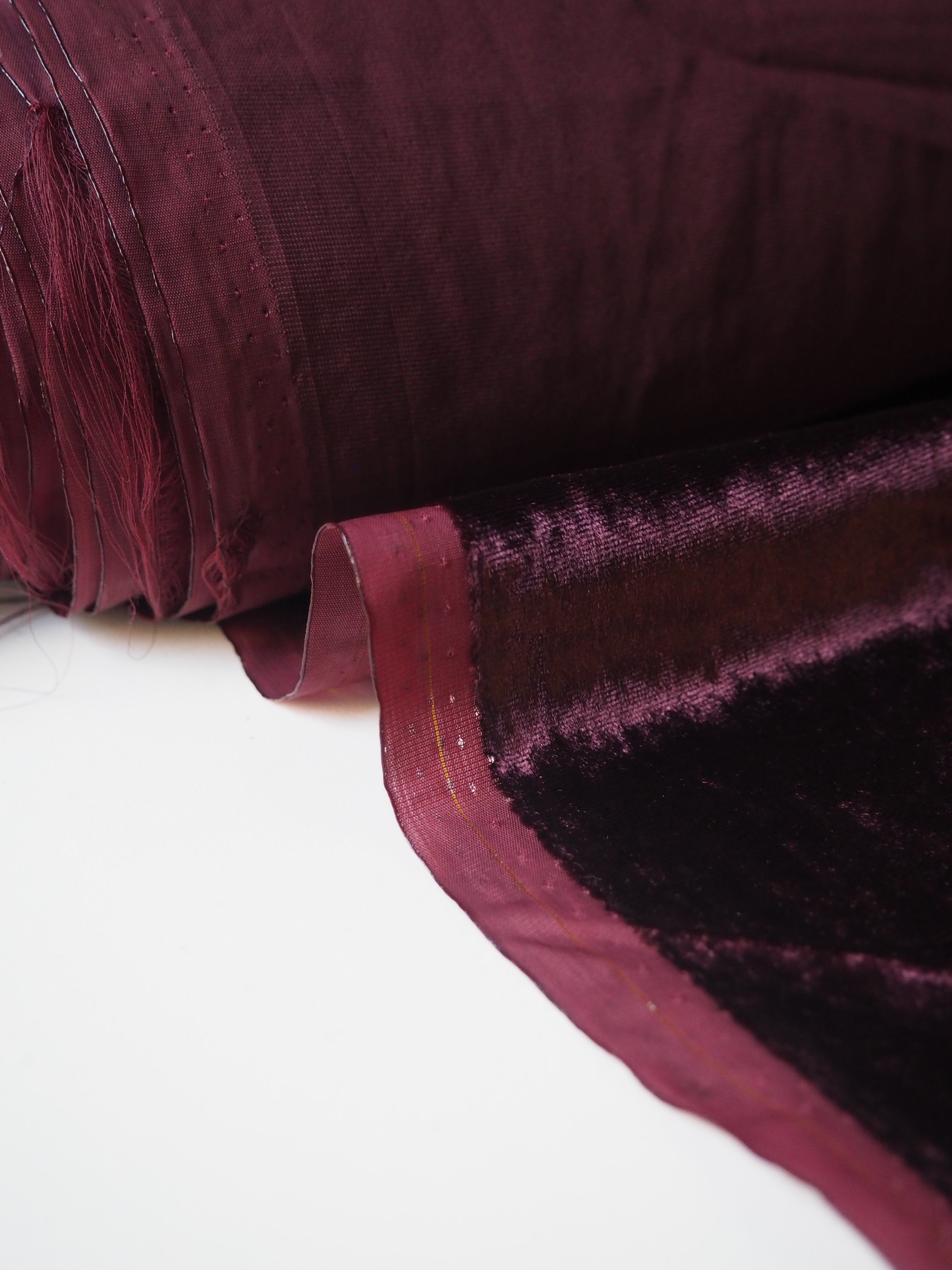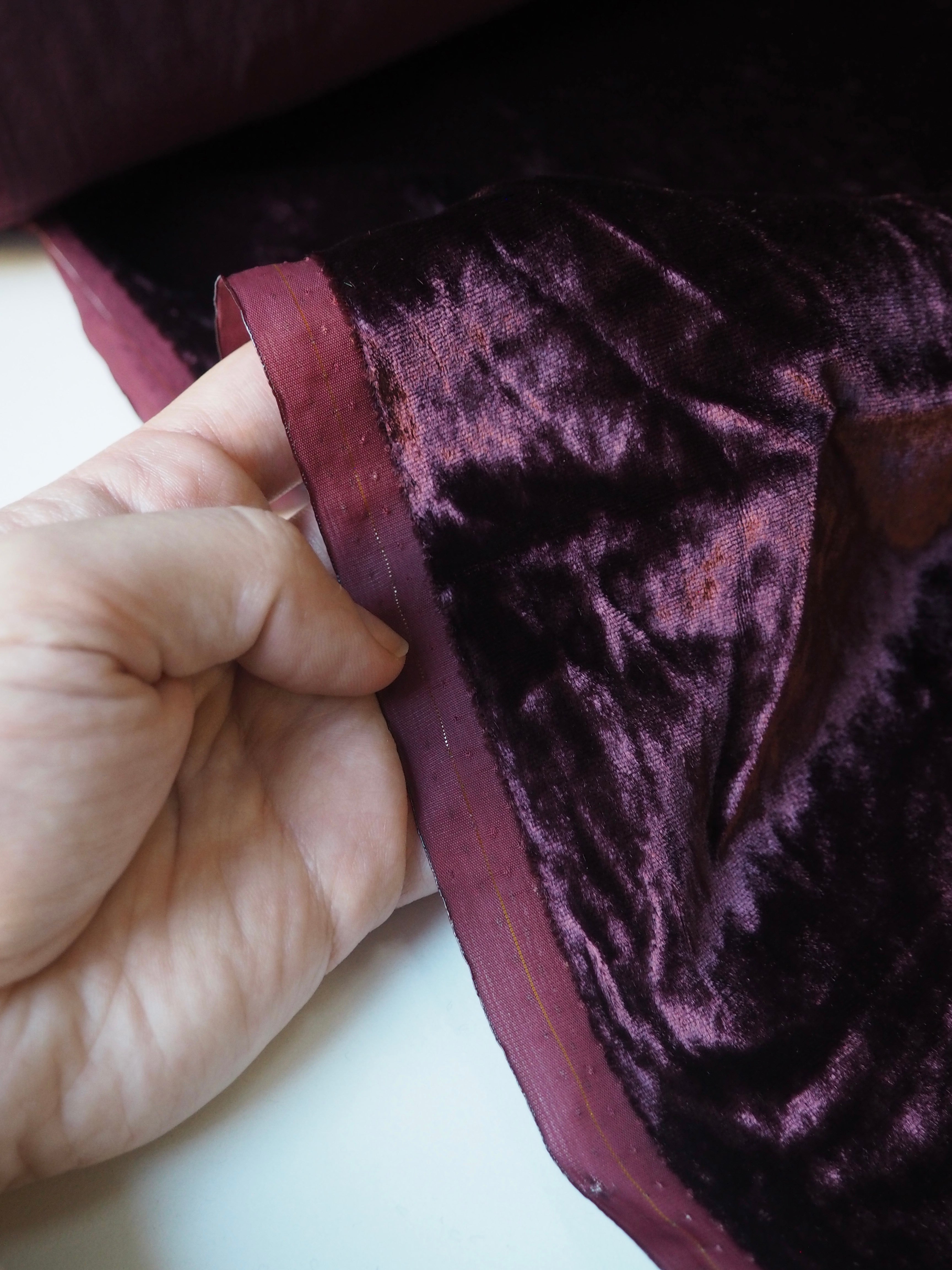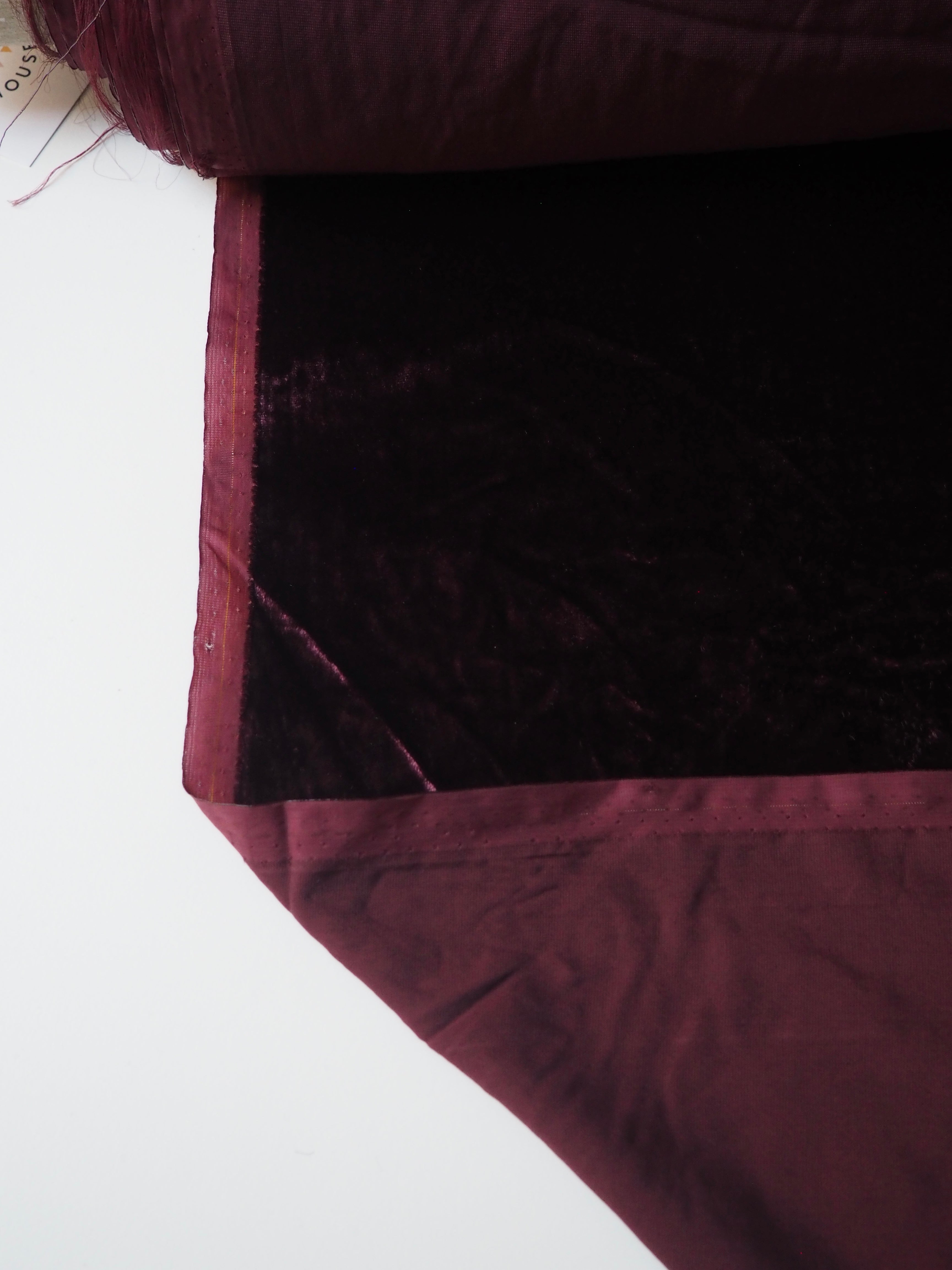This ex-designer fabric is a sumptuous velvet. It's incredibly soft and luxurious. It has a slightly crushed finish, it came from the designer in a box, so the pile has slight pressure marks. This should revive with steam and brushing! It's opaque, with such a beautiful sheen. Has a light to medium pile that is wonderful to handle. Lightweight and with a beautiful drape and lovely movement. Perfect for a dress or even a blouse!