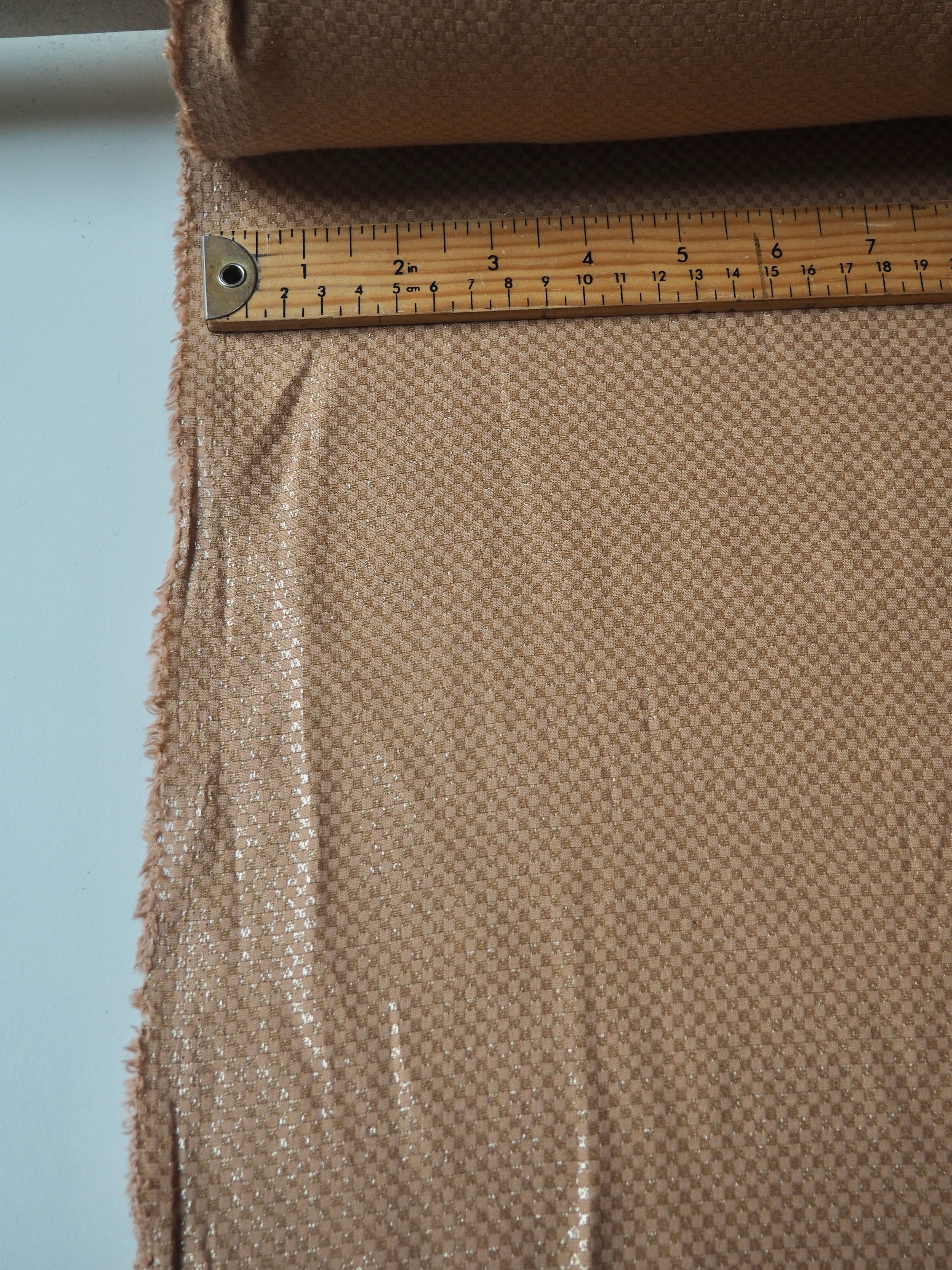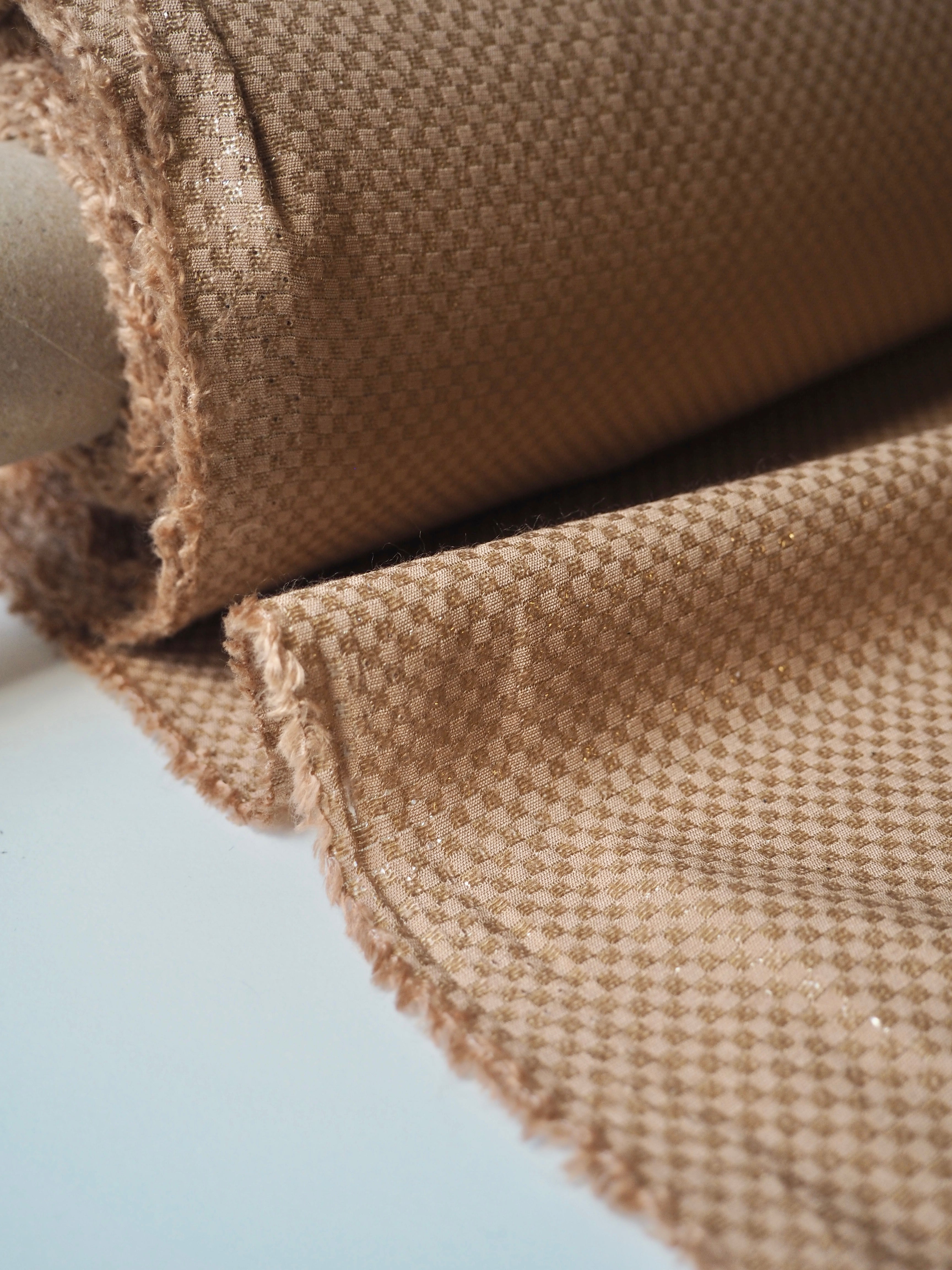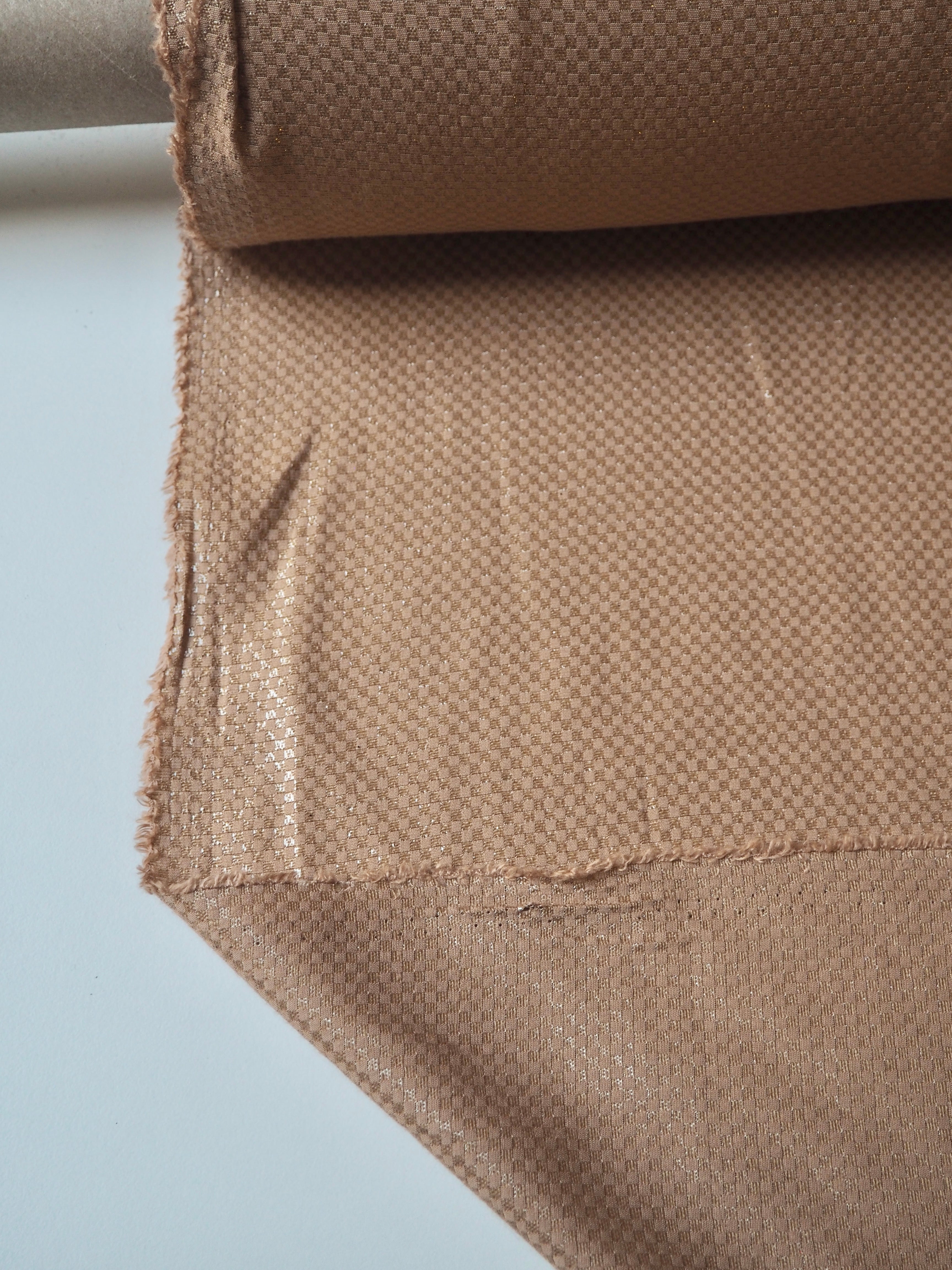 This ex-designer fabric is a cotton jacquard. This camel brown jacquard has a metallic checkerboard weave. It catches the light so beautifully and drapes so well! It's lightly textured, is lightweight, and so so soft! Would love to see a button up shirt!