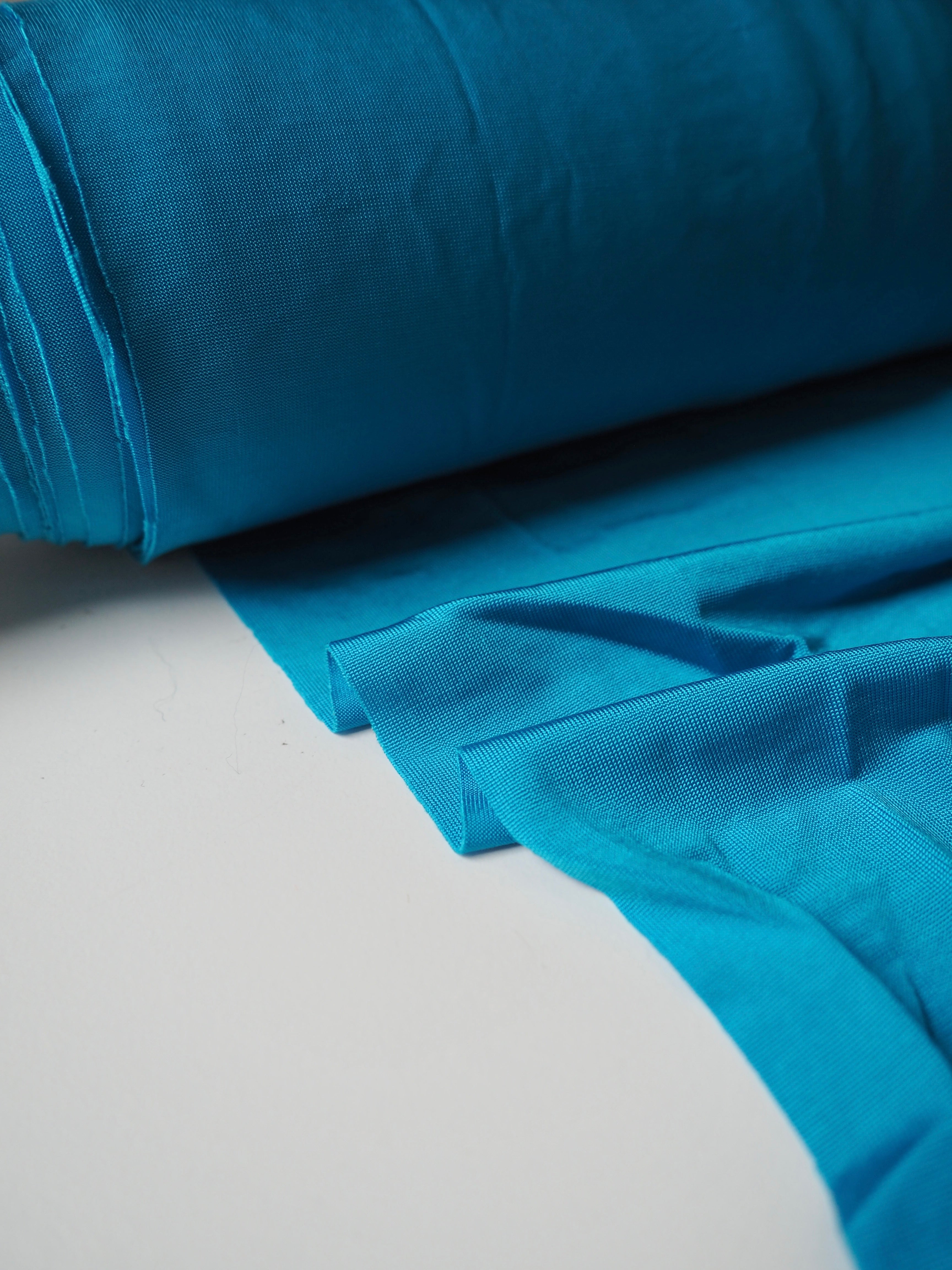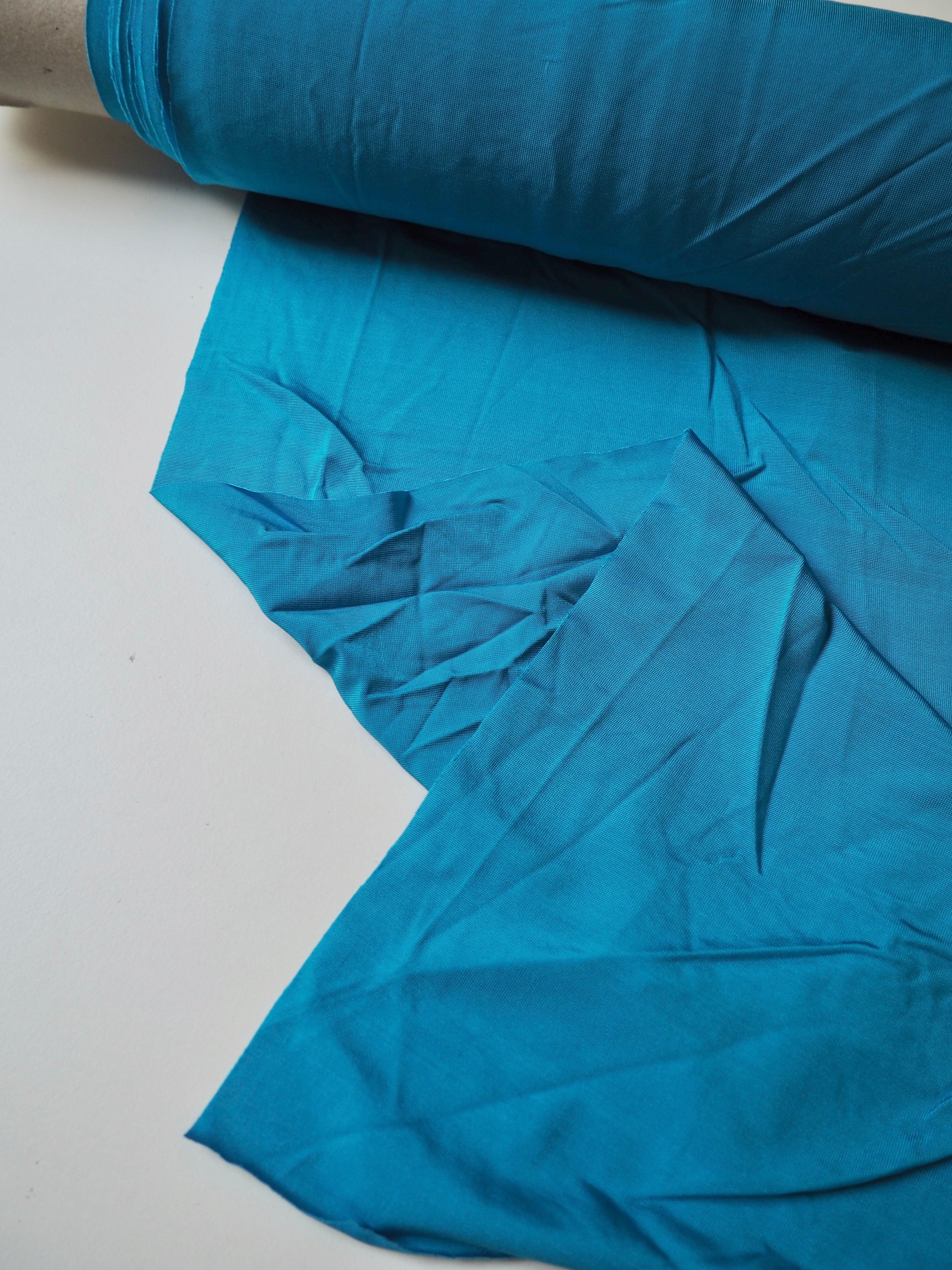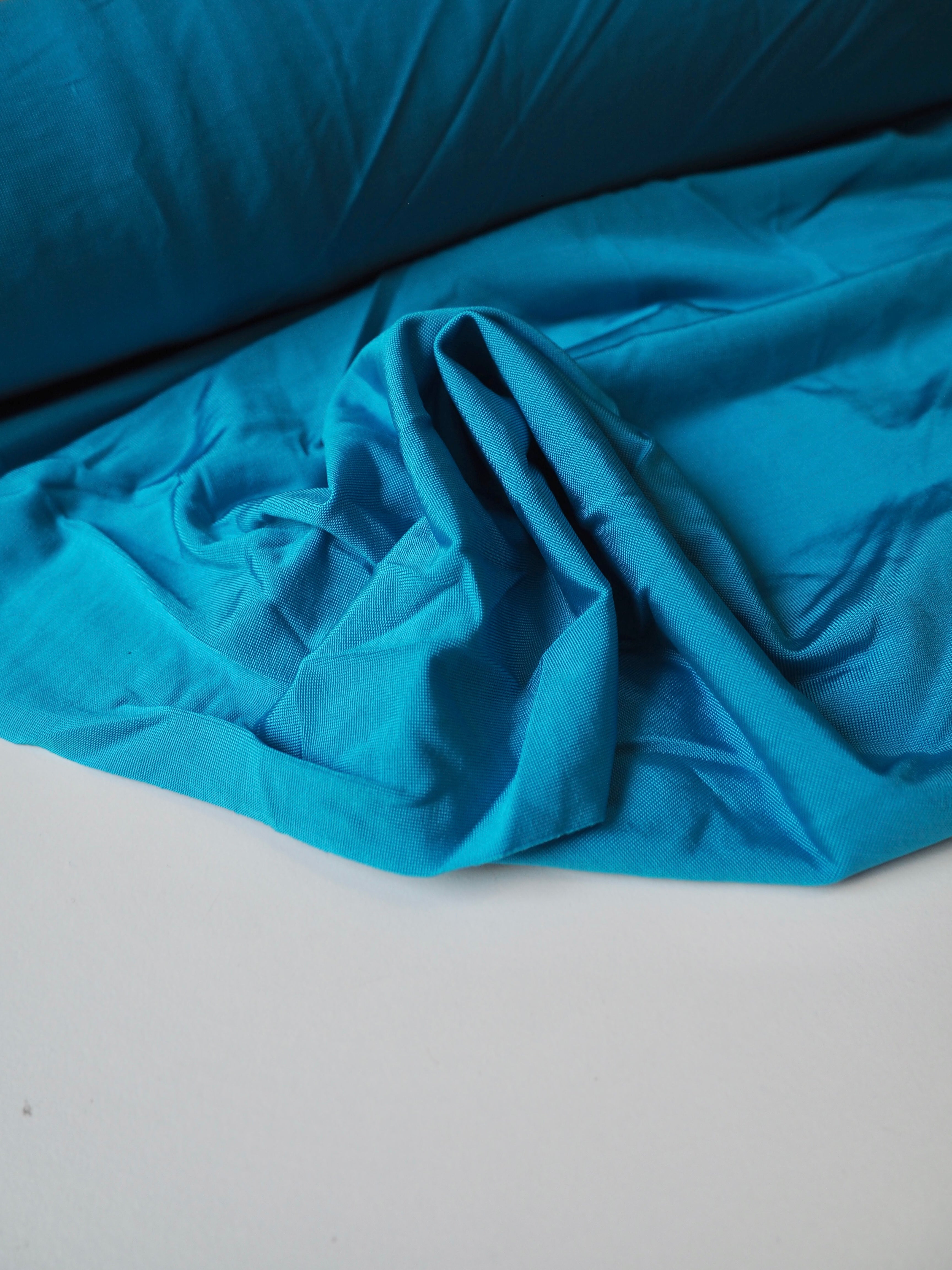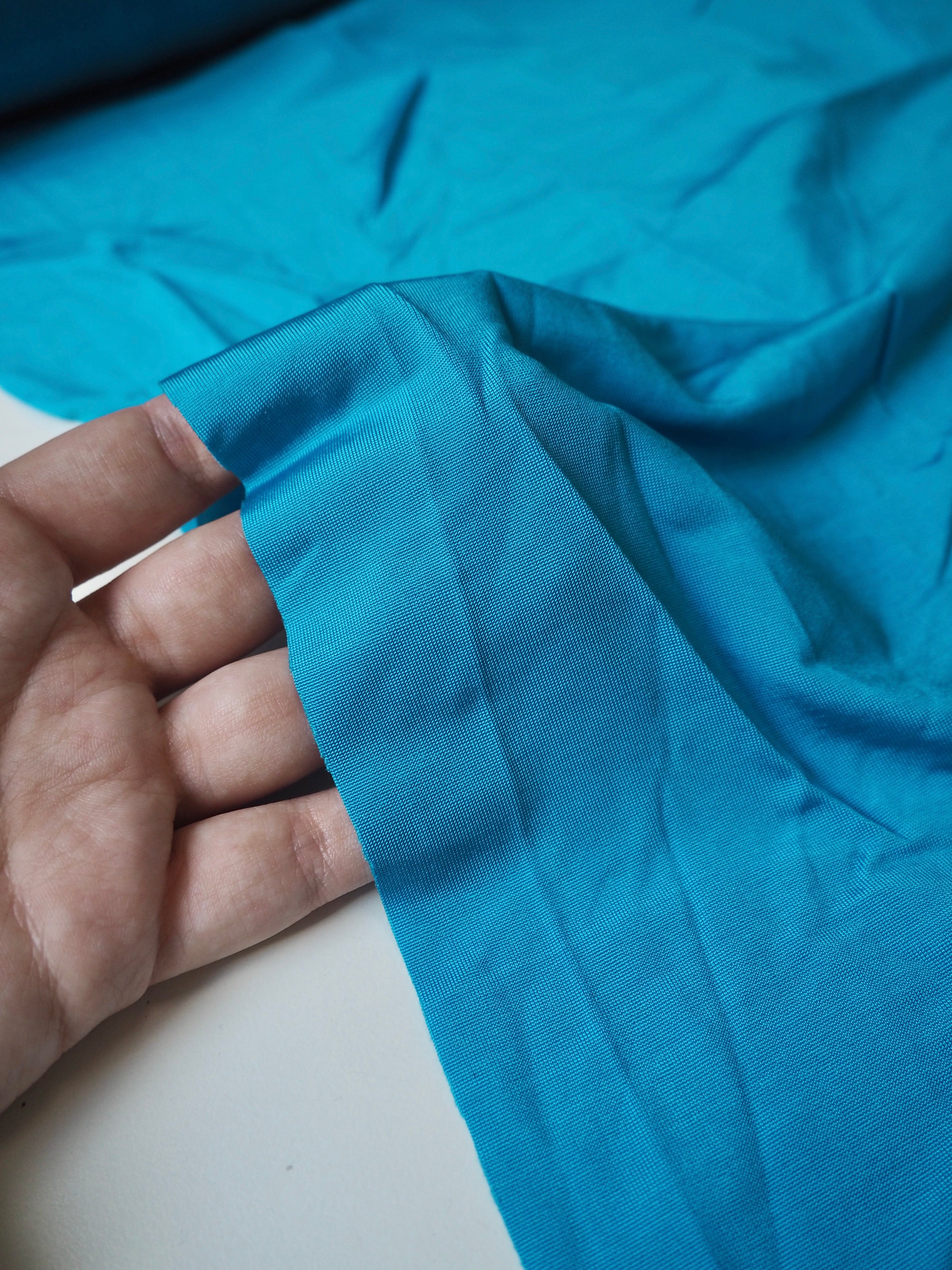 This ex-designer fabric is a jersey. It has a beautiful drape that’s quite swishy, and a slinky handle. It's lightweight and has a smooth handle. Has about 40% stretch width ways, and about 30% length ways, and great recovery. Opaque. Perfect for a skirt or elevated basics!