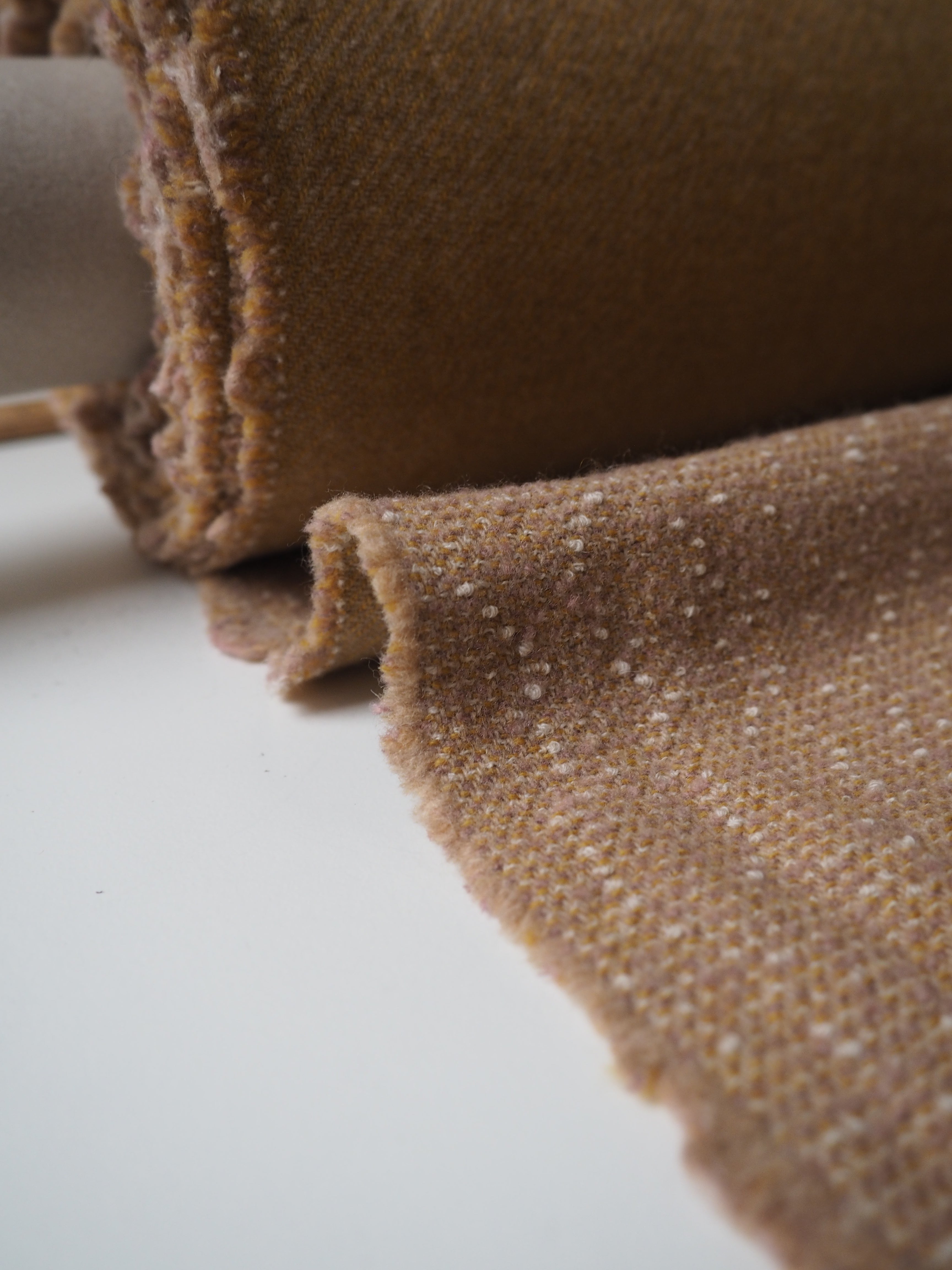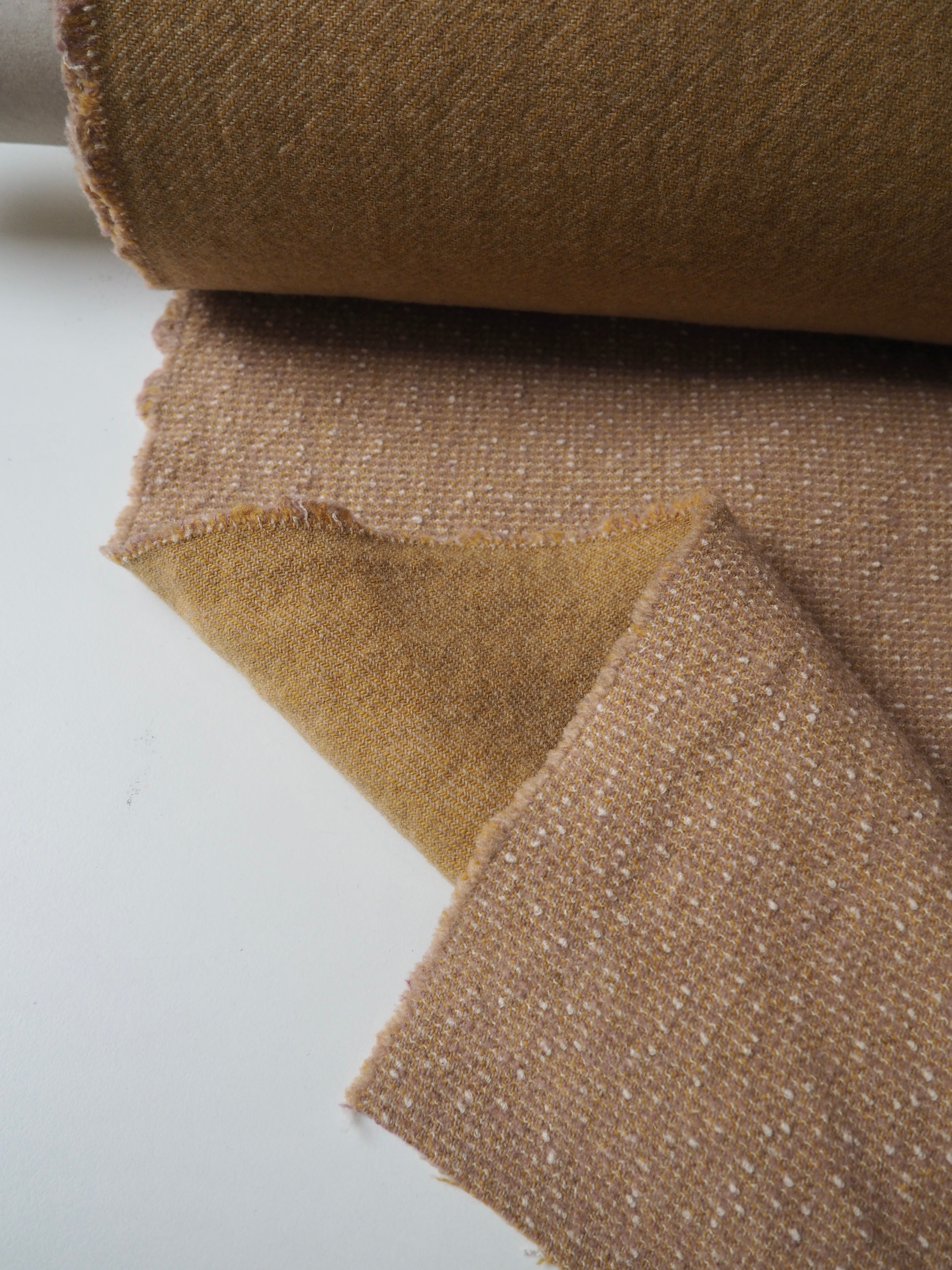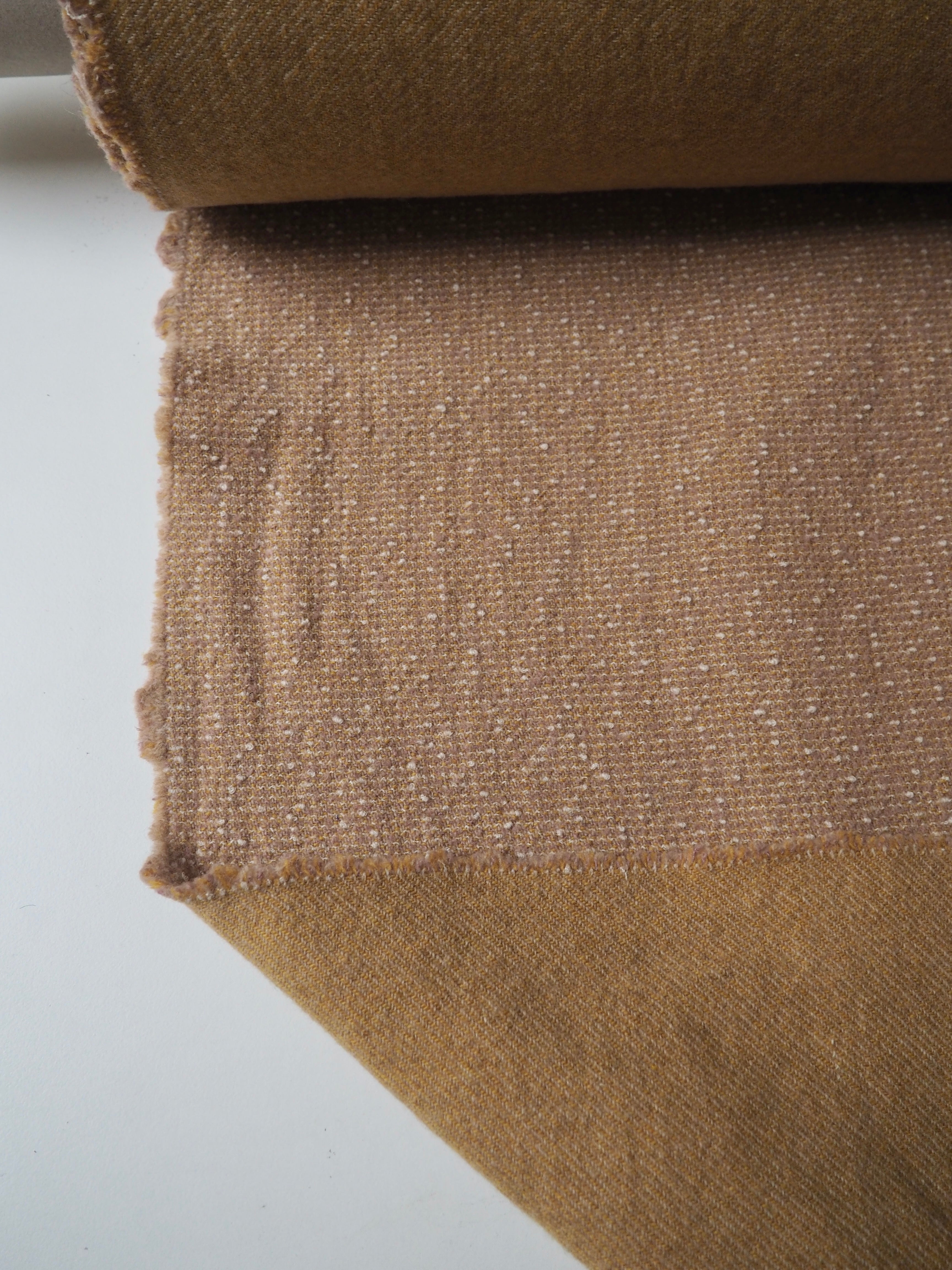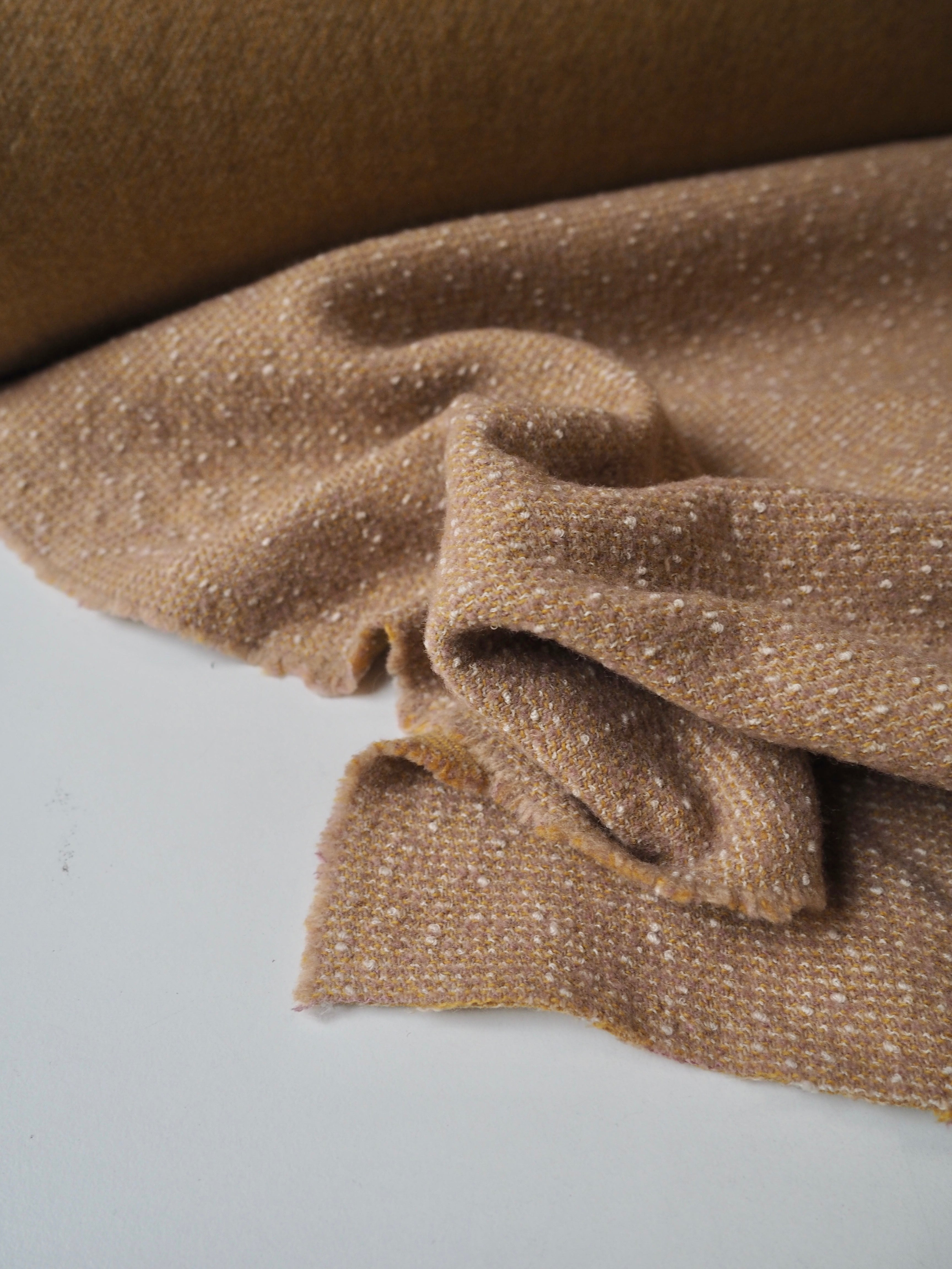 This ex-designer fabric is a bouclé coating. It's double-faced, with a twill weave one side, and a bouclé marl with subtle pink on the other side. It's so soft and woolly on both sides. It has a nice and interesting texture, has a great structure, and is medium to heavy weight. Perfect for a coat or jacket!