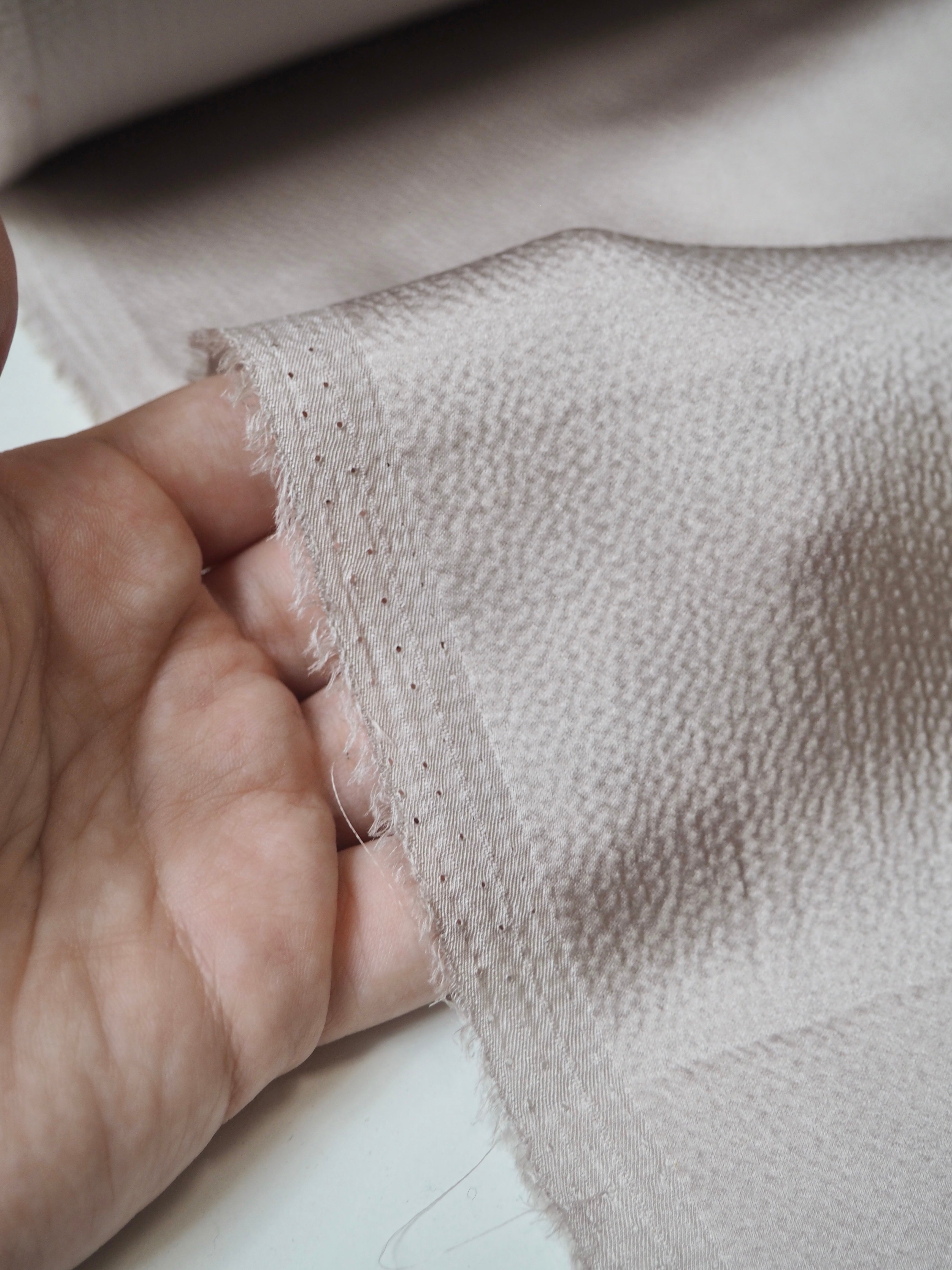 This ex-designer fabric is a hammered silk. It's lightweight and hangs beautifully! The hammered finish gives it an eye-catching texture, and it has a lovely medium sheen. Wonderful movement, and so soft and silky against the skin! Fantastic handle and fully opaque. It would make a beautiful Everyday Dress/Top!