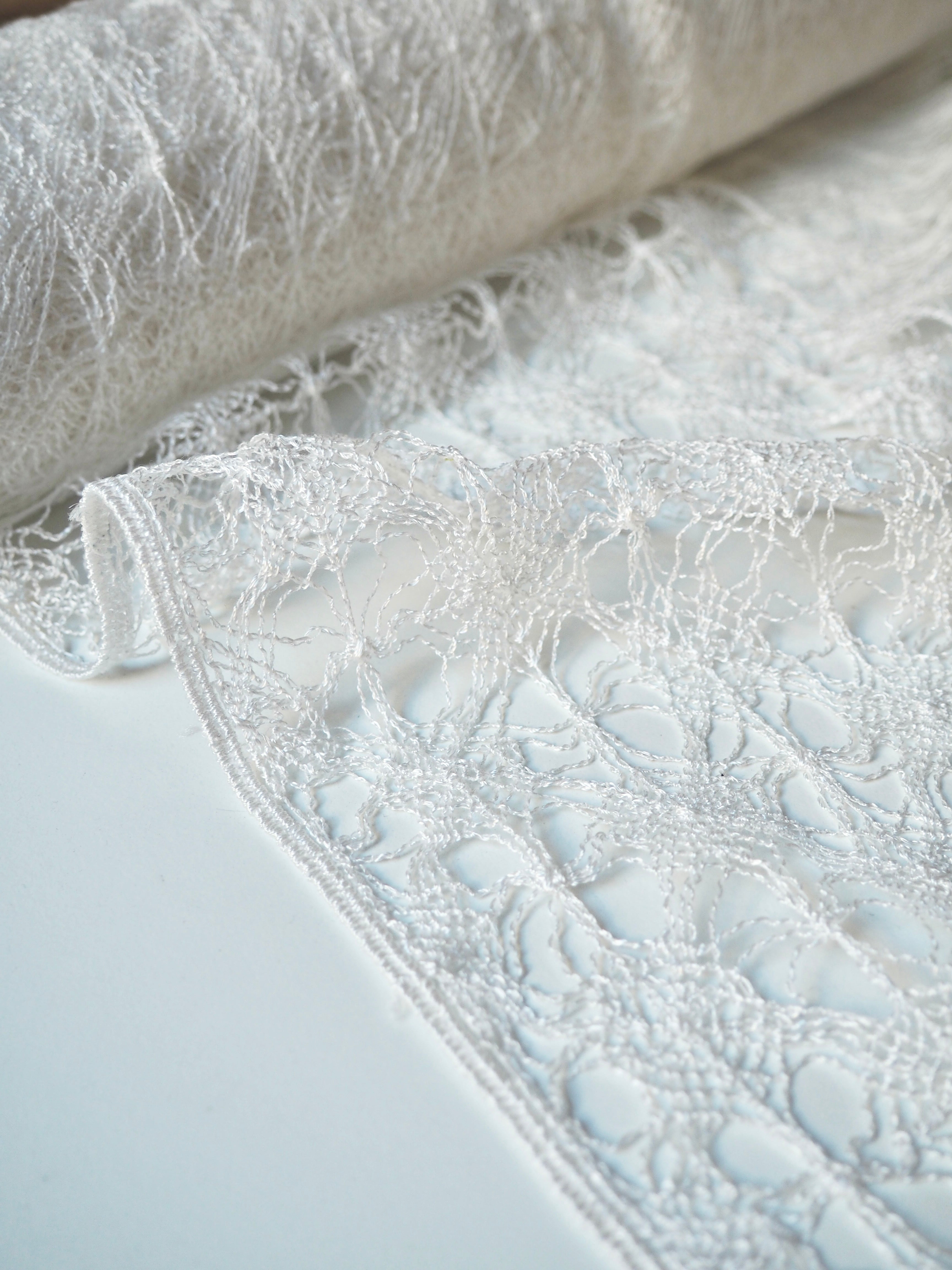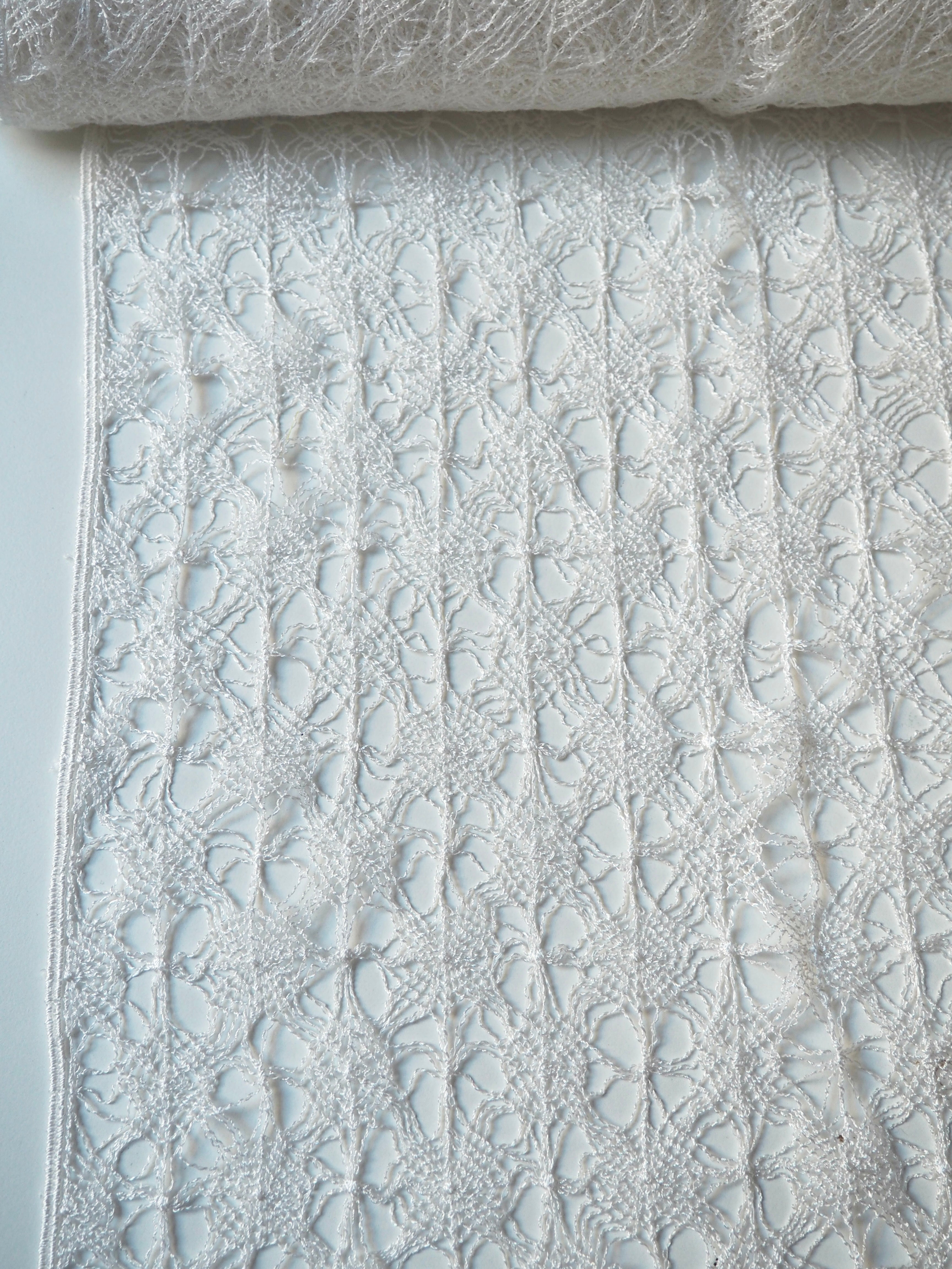 This incredible white lace fabric is made up of fine delicate strands of white in a square web-like design. The threads have a slight sheen which gives a beautiful lustre to the finish. This would be perfect for a bodice or skirt overlay on a bridal dress. Amazing quality, unusual fabric. Sourced from a high-end bridal designer.