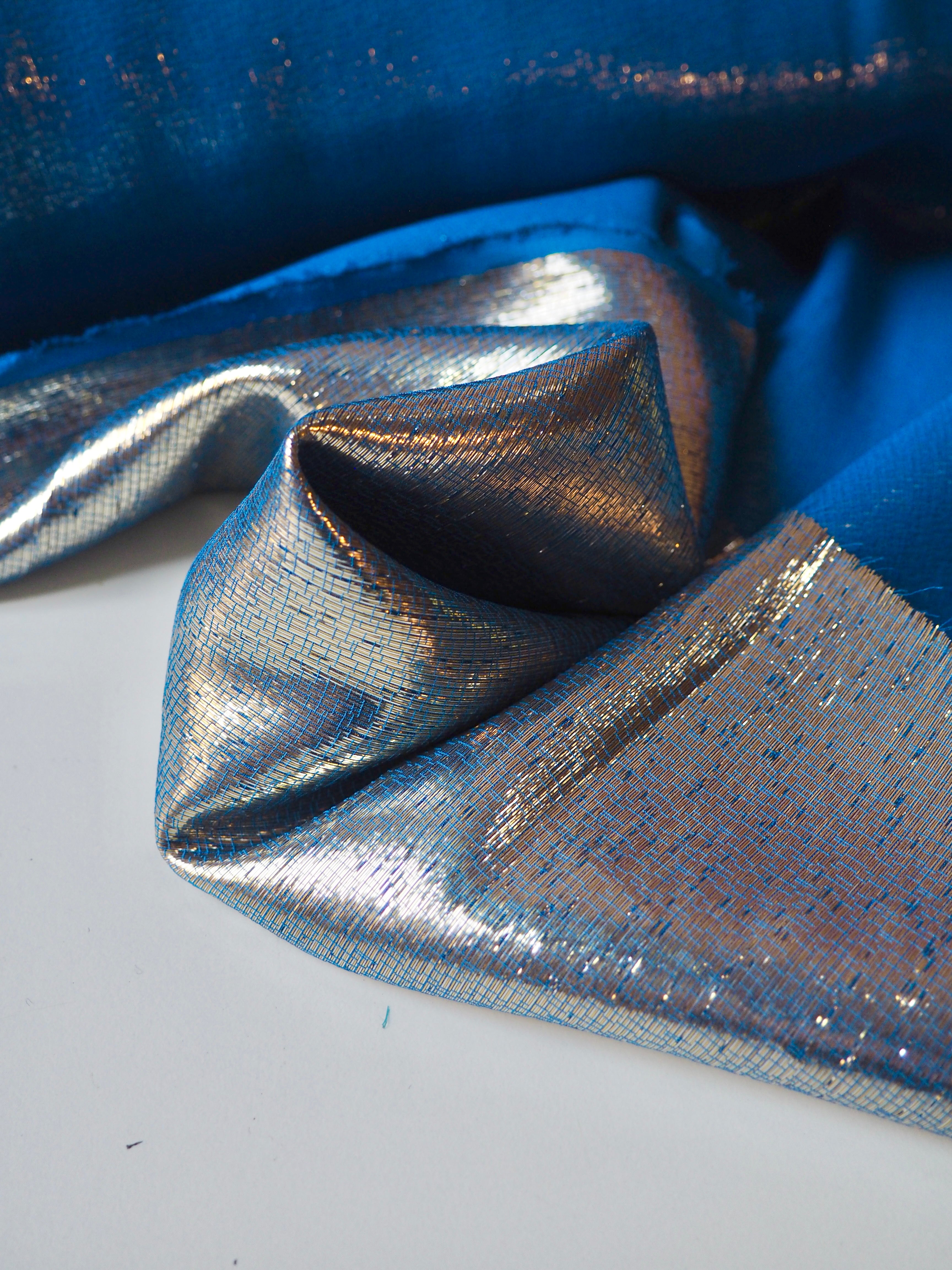 This ex-designer fabric is a unique cloth. It's a silk lamé, with gold metallic threads on the underside, and a bright cobalt blue topside. It has such a liquid movement and gorgeous sheen finish. The gold threads shine through the blue very subtly, but with just the right impact! Fully opaque. Super lightweight and drapey! Perfect for a top or dress!