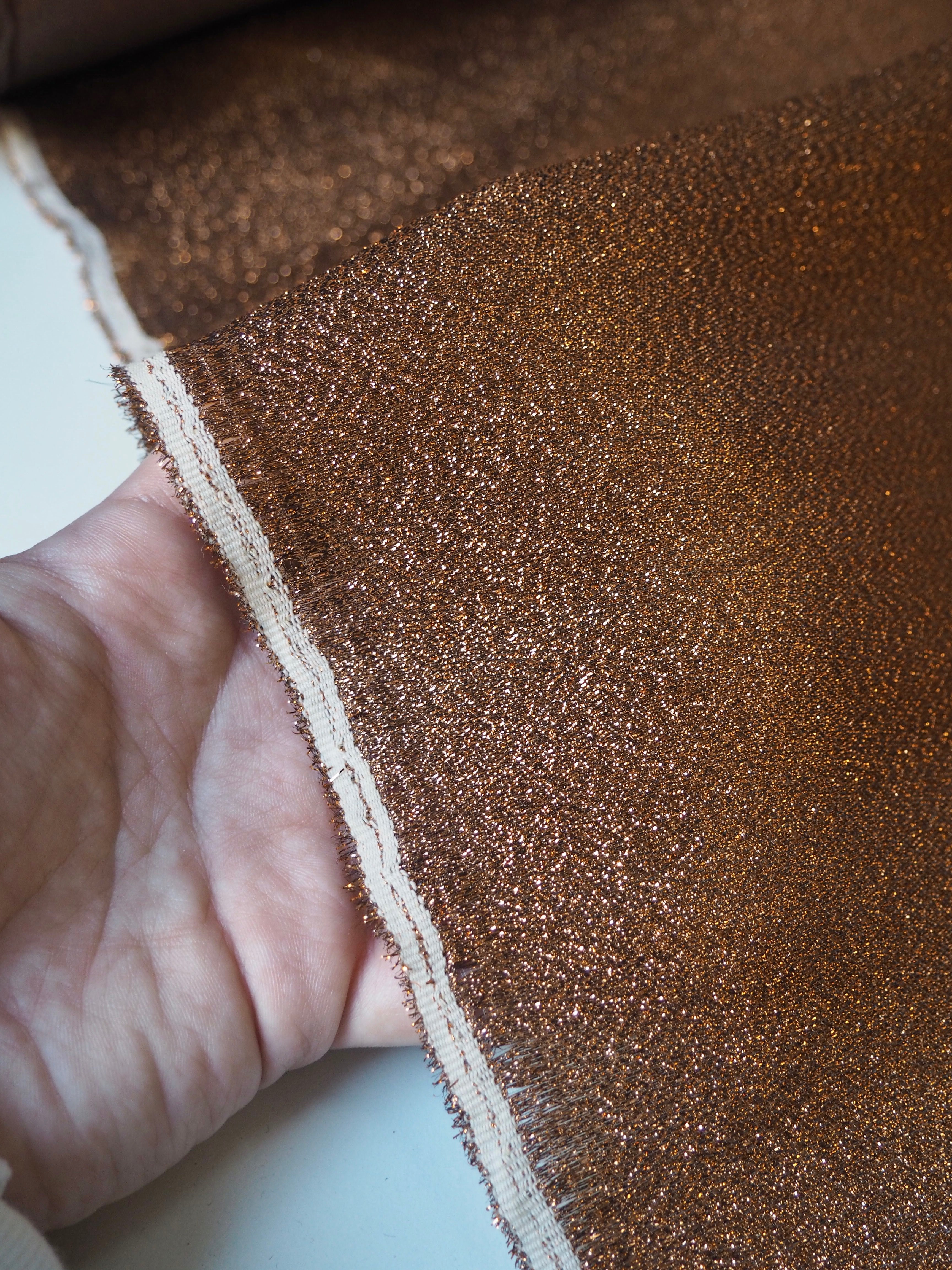 This ex-designer fabric is an unusual organza. It's a poly organza woven with a copper lurex layer. It has an incredible light-catching and tone shifting finish that's a really one-of-a-kind statement! It has incredible structure that will really stand on it's own, with a textured organza handle. Light to medium weight and mostly opaque. Either side could be the right side. We think it would make a great statement party dress or top, and is perfect for accessories like a tote or little evening bag!