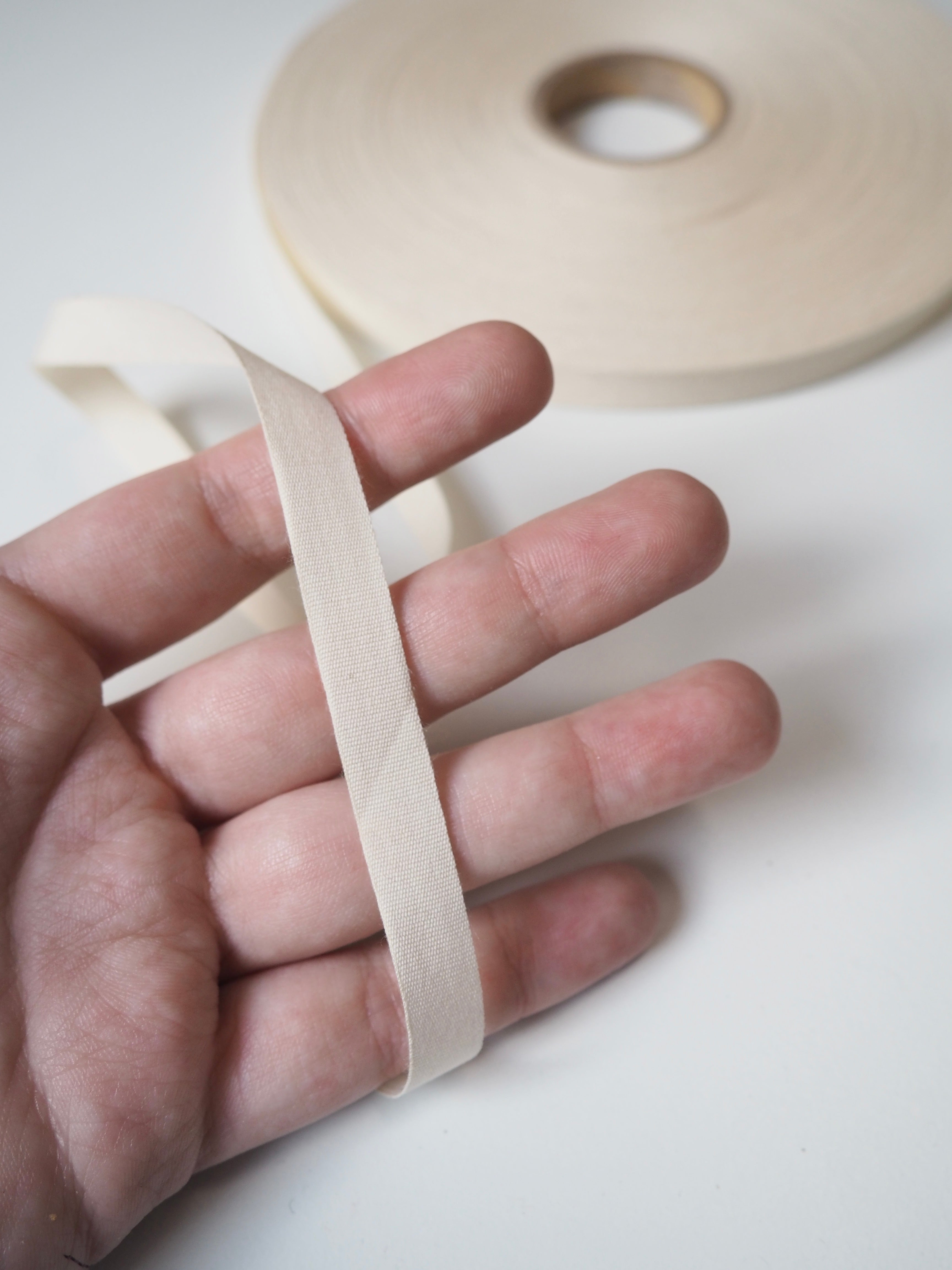 This ex-designer trim is a cotton tape. It's a lightweight cotton tape, that's soft and flexible. Would be perfect as straps for a dress, to bind seam, or as a drawstring!
