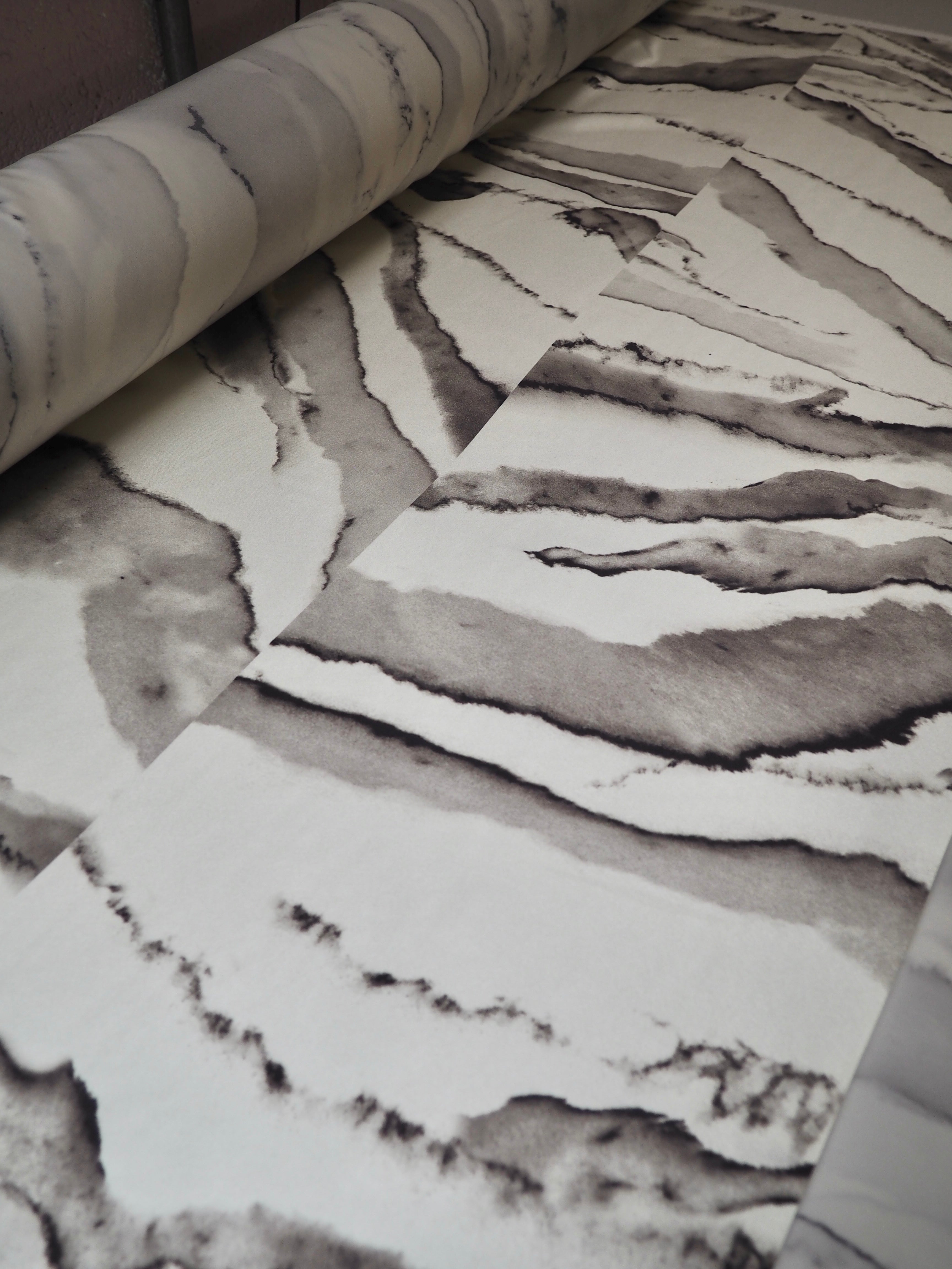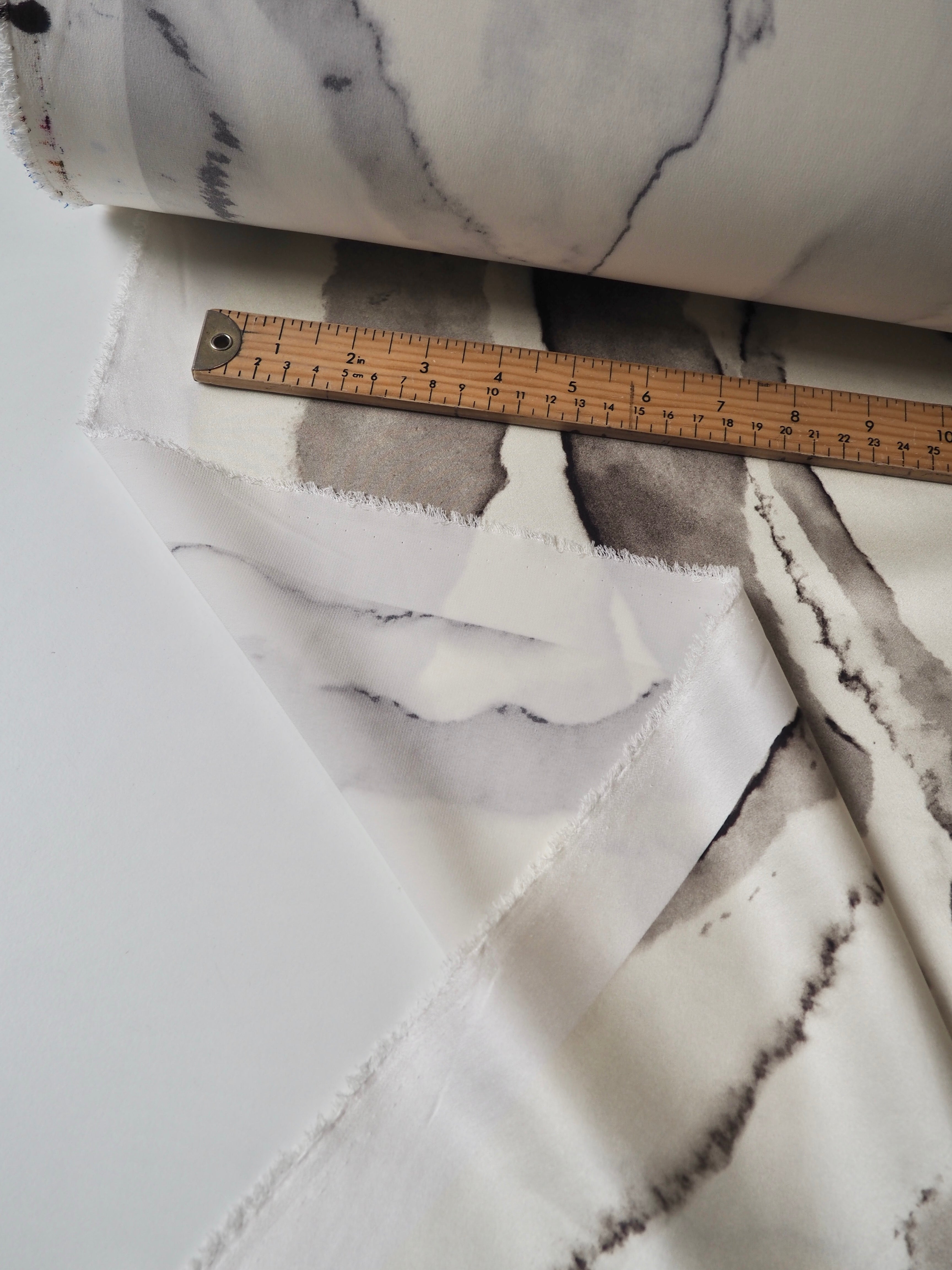 This ex-designer fabric is a silk satin. It's in a fluid marbled print. It's bespoke from a London designer. It's slinky, mostly opaque, and very soft. It has an incredible satin sheen and beautiful movement. Such a smooth and luxurious handle! It's medium weight and not as heavy as a duchess satin, but still heavier than a typical charmeuse. The perfect drapey silk for dresses or button up blouses! This cloth as slight breaks in the printing every few metres, pictures show this.