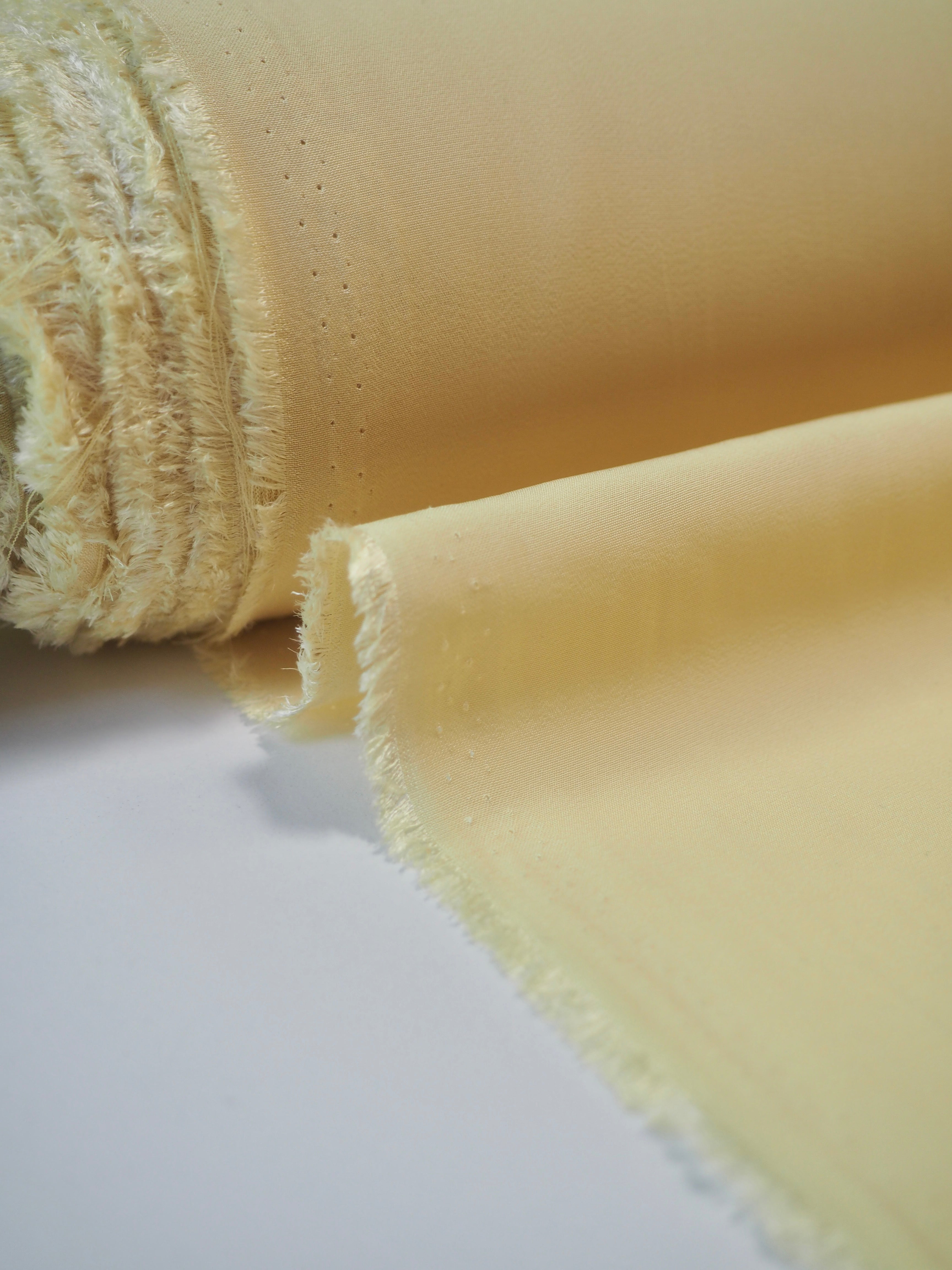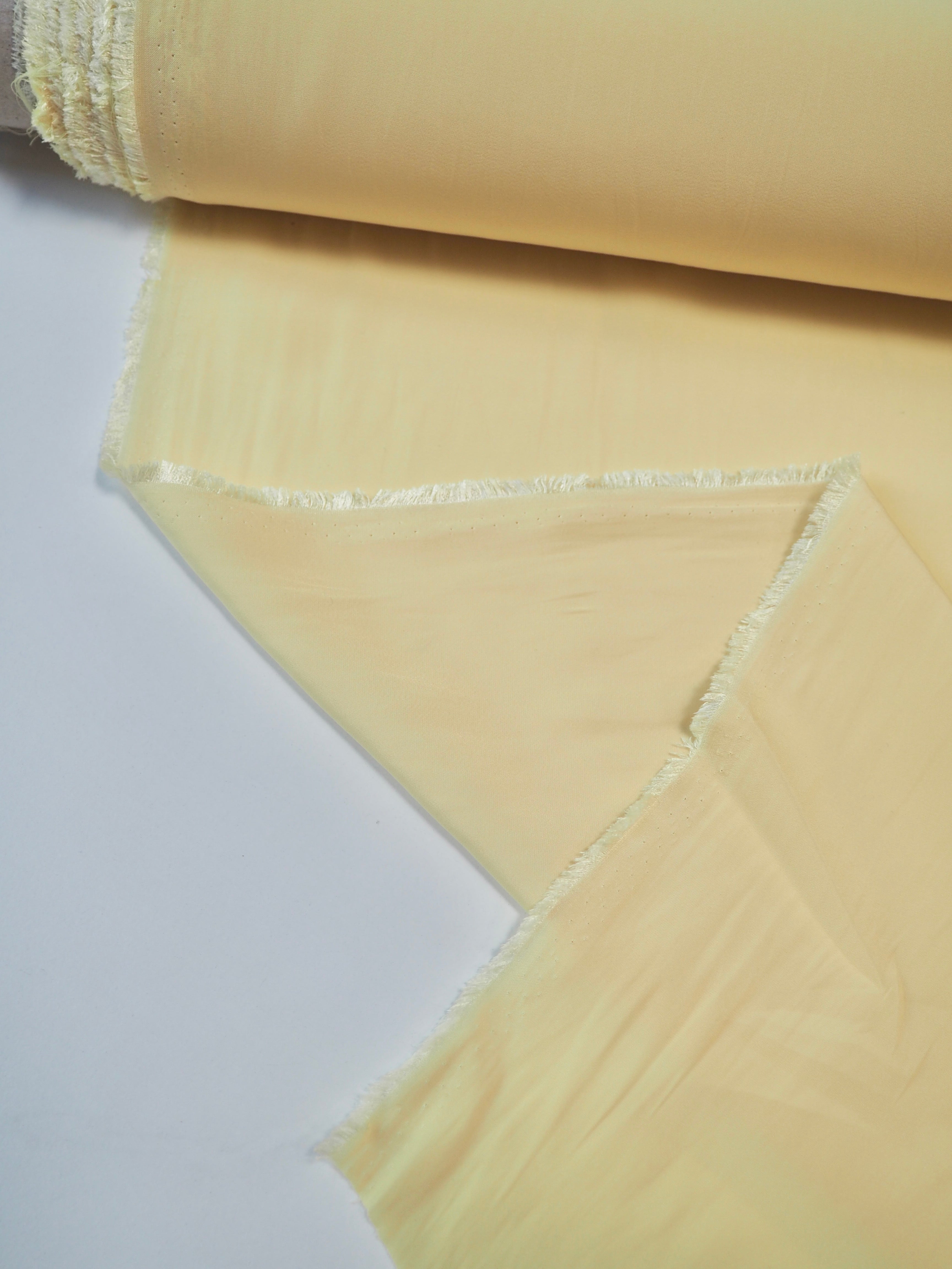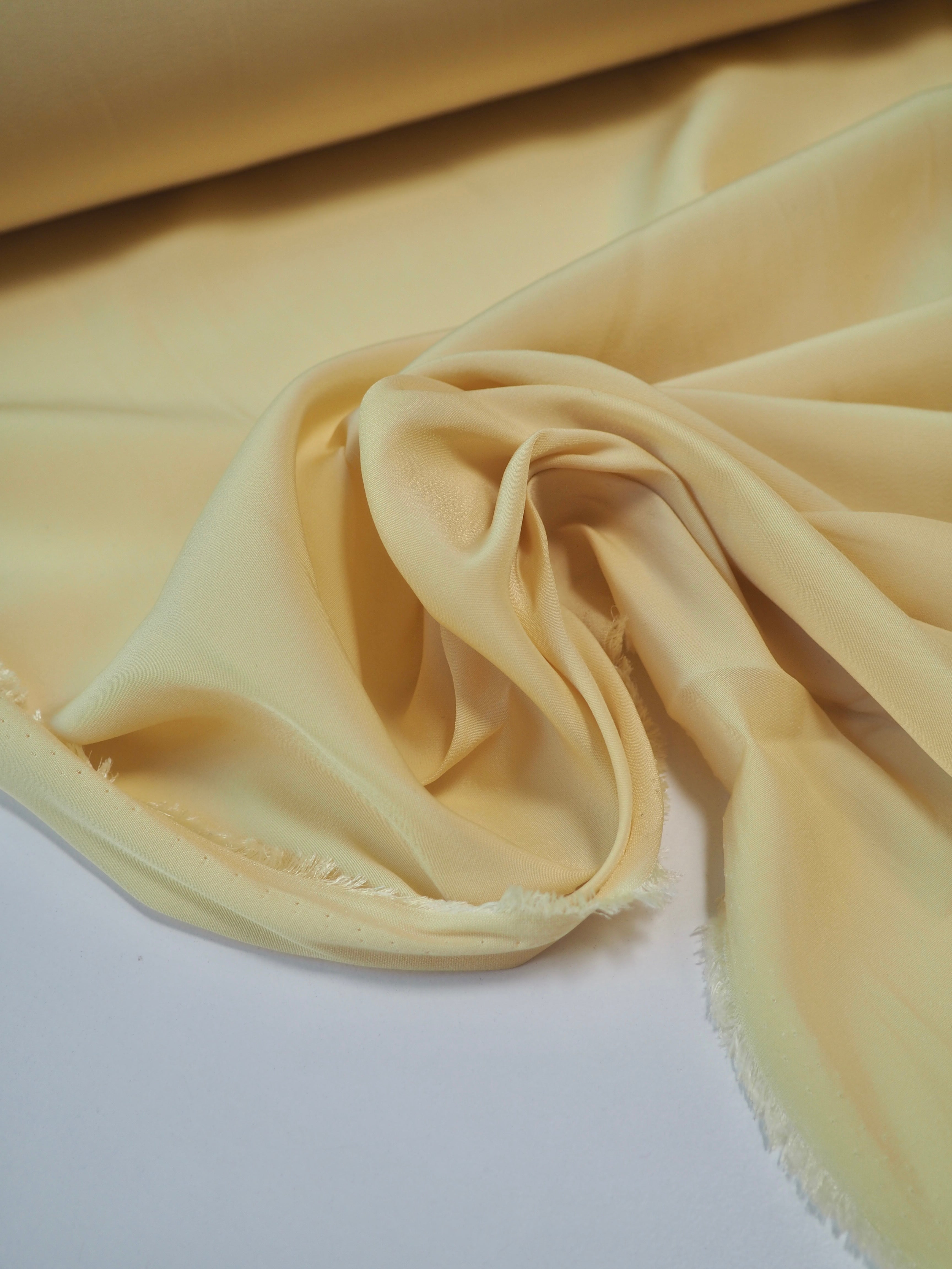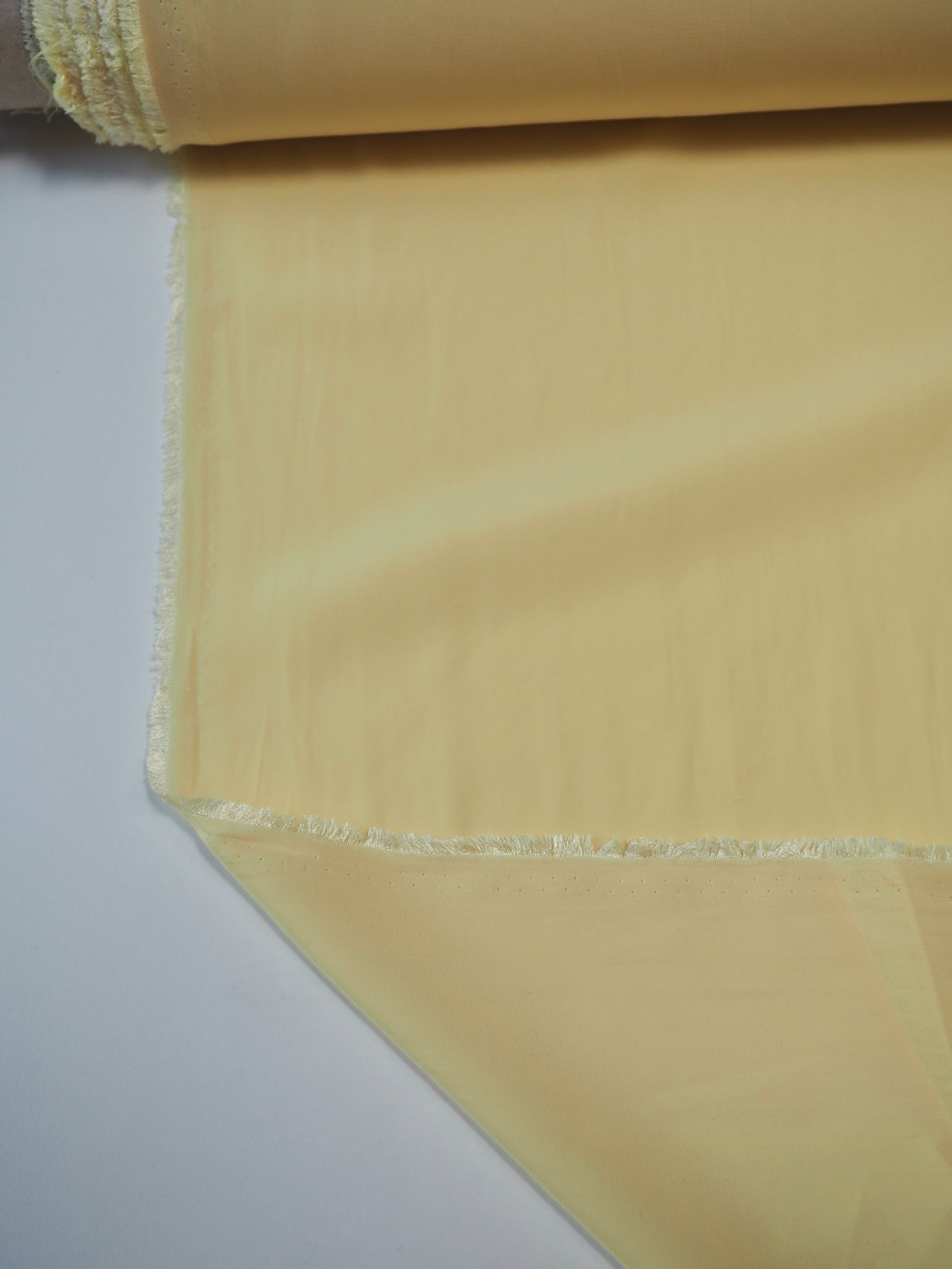 This ex-designer fabric is a viscose. It's a lovely custard yellow colour that is opaque. Light weight, slinky and super drapey. Beautiful handle typical of viscose, with a silky, smoother finish. Perfect for a button down, and great as a dress or skirt lining!