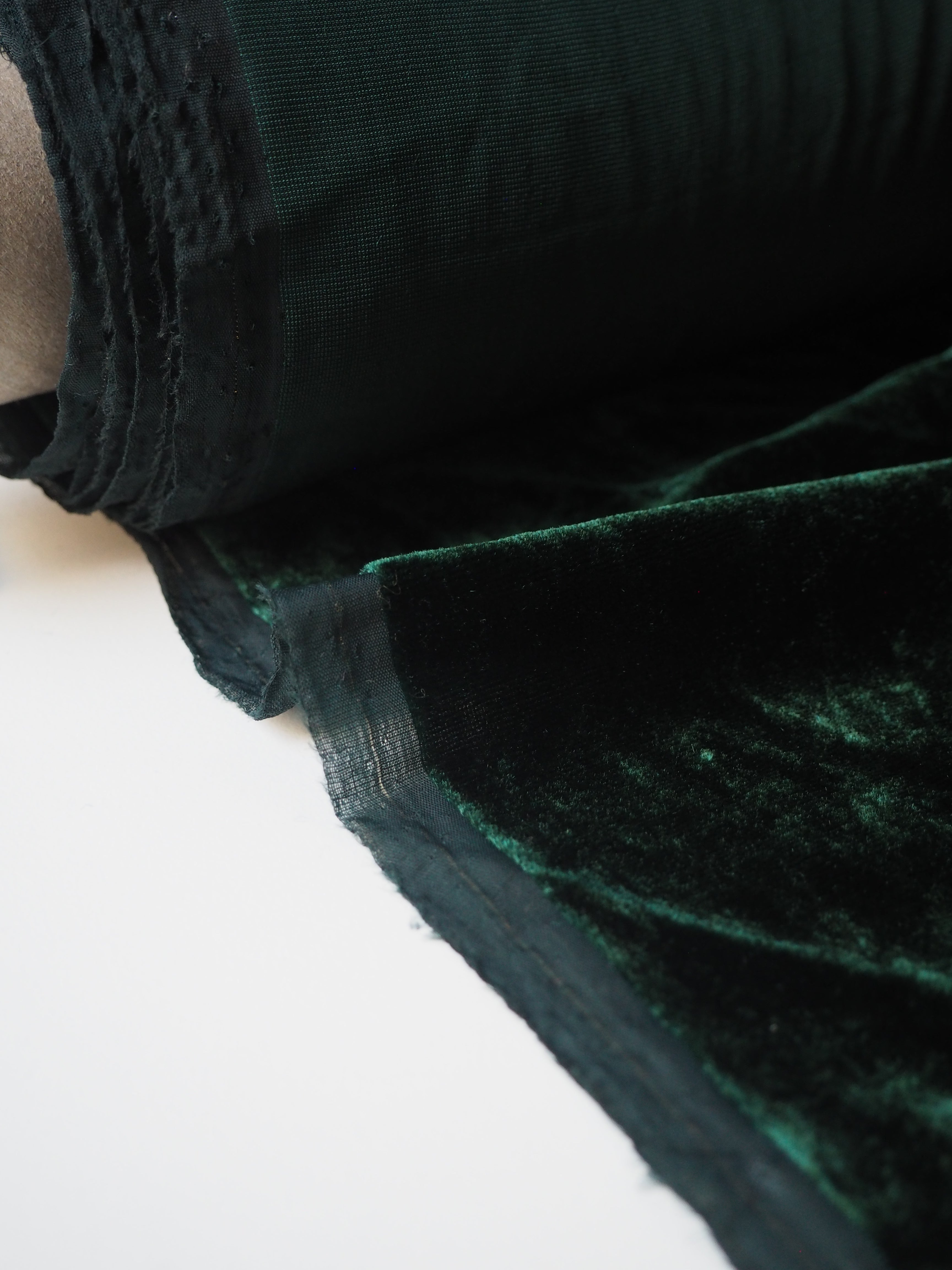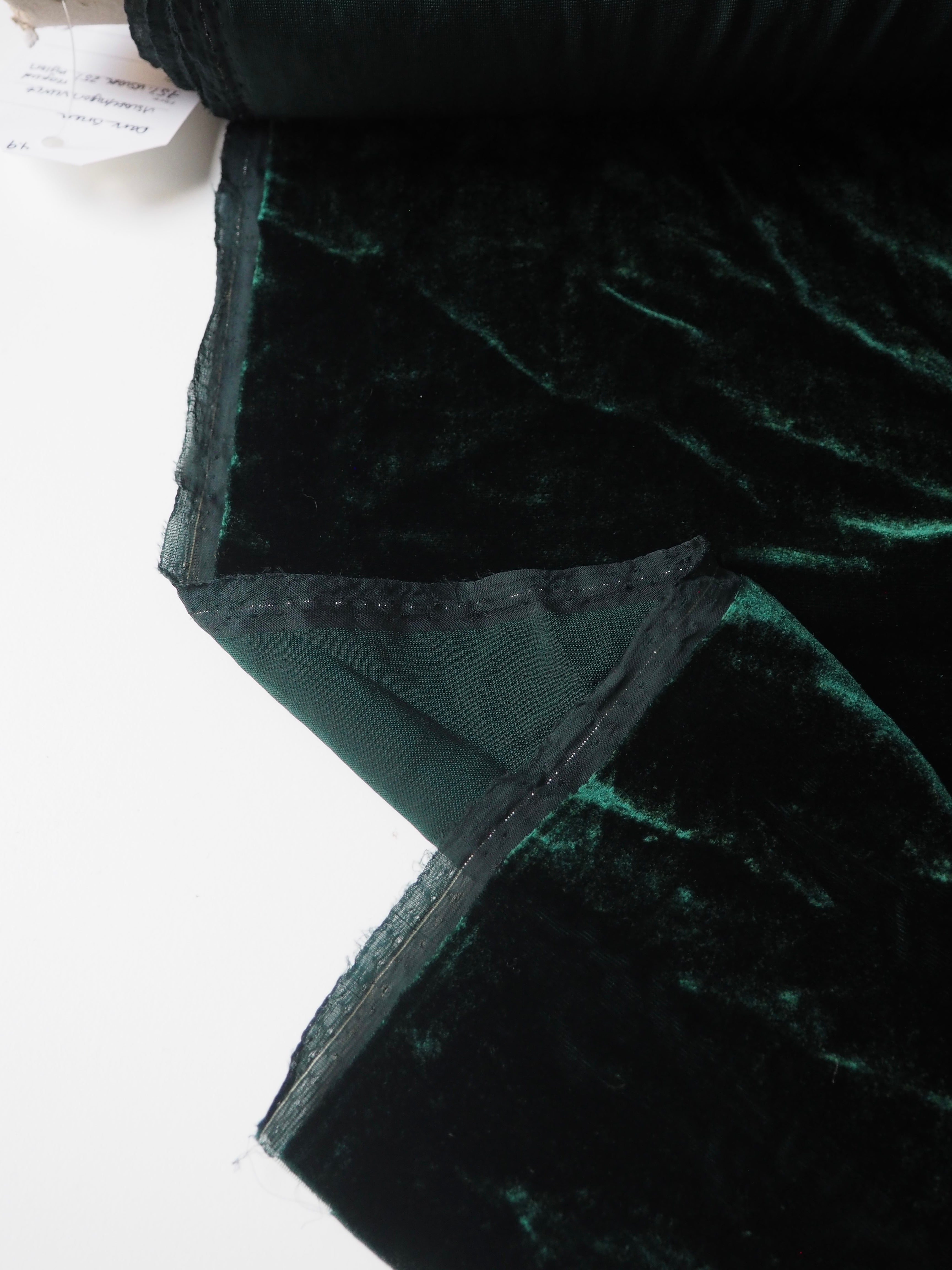 This ex-designer fabric is a sumptuous velvet. It's incredibly soft and luxurious. It has a slightly crushed finish, it came from the designer in a box, so the pile has slight pressure marks. This should revive with steam and brushing! It's opaque, with such a beautiful sheen. Has a light to medium pile that is wonderful to handle. Lightweight and with a beautiful drape and lovely movement. Perfect for a dress or even a blouse!