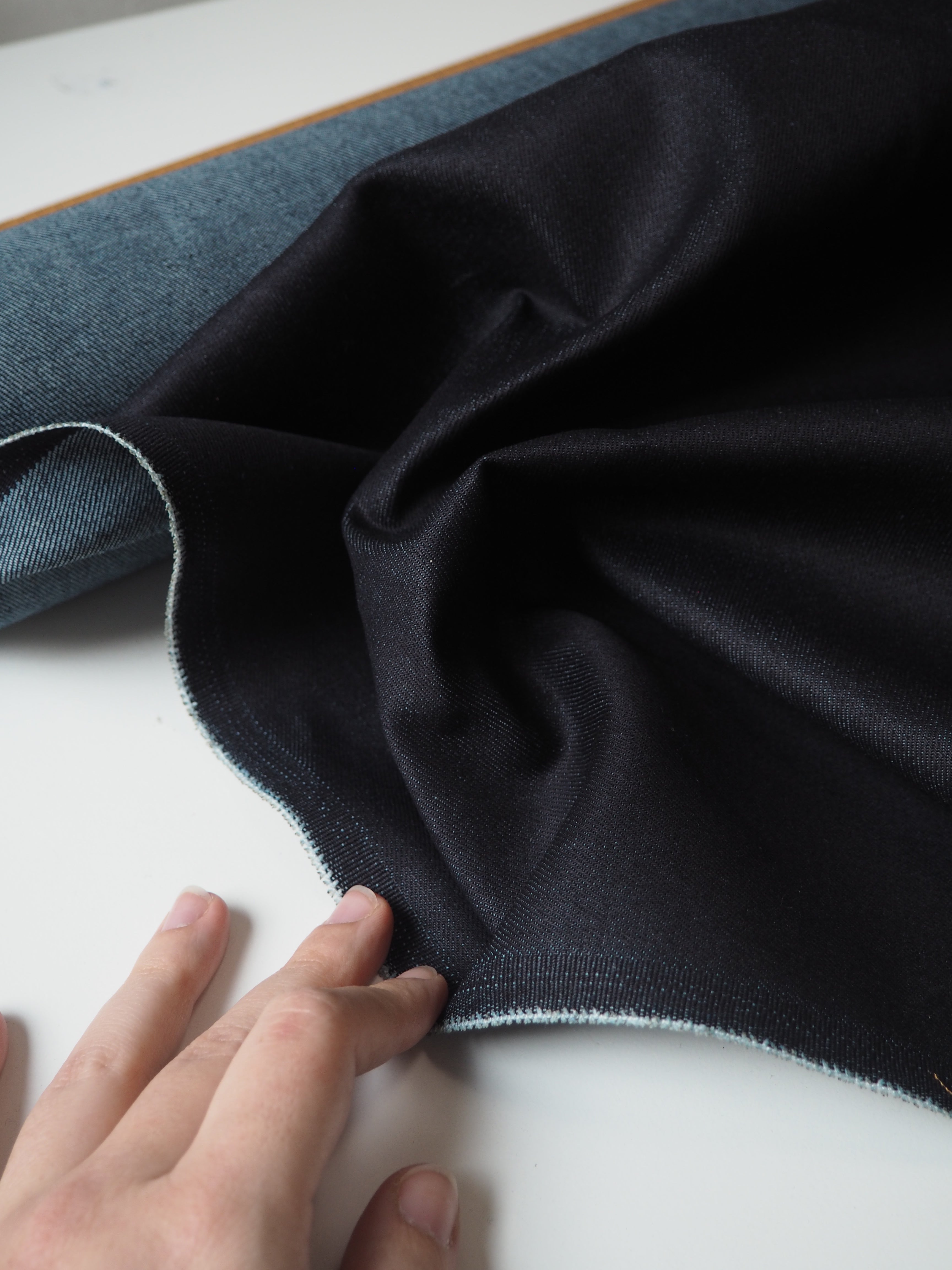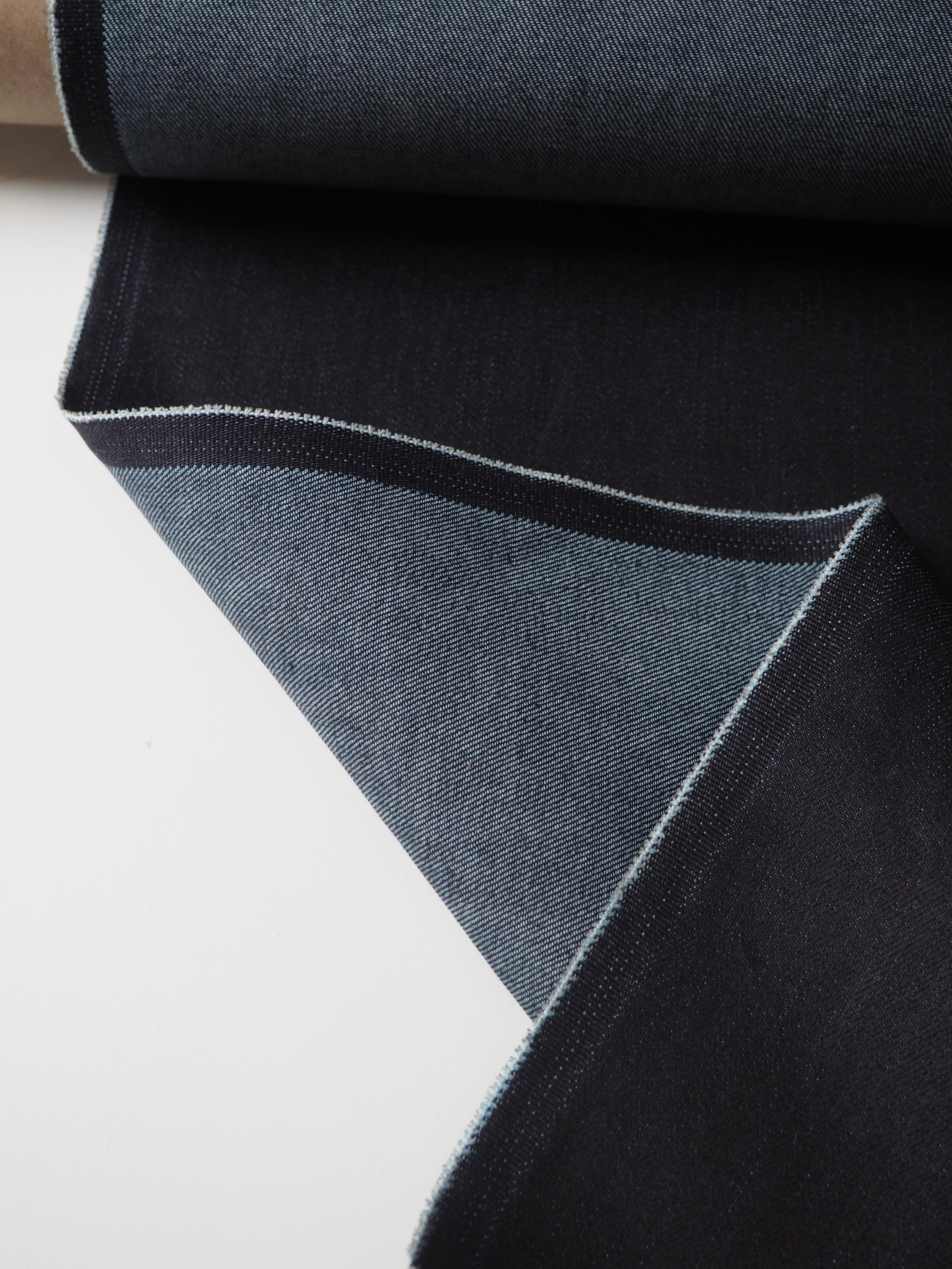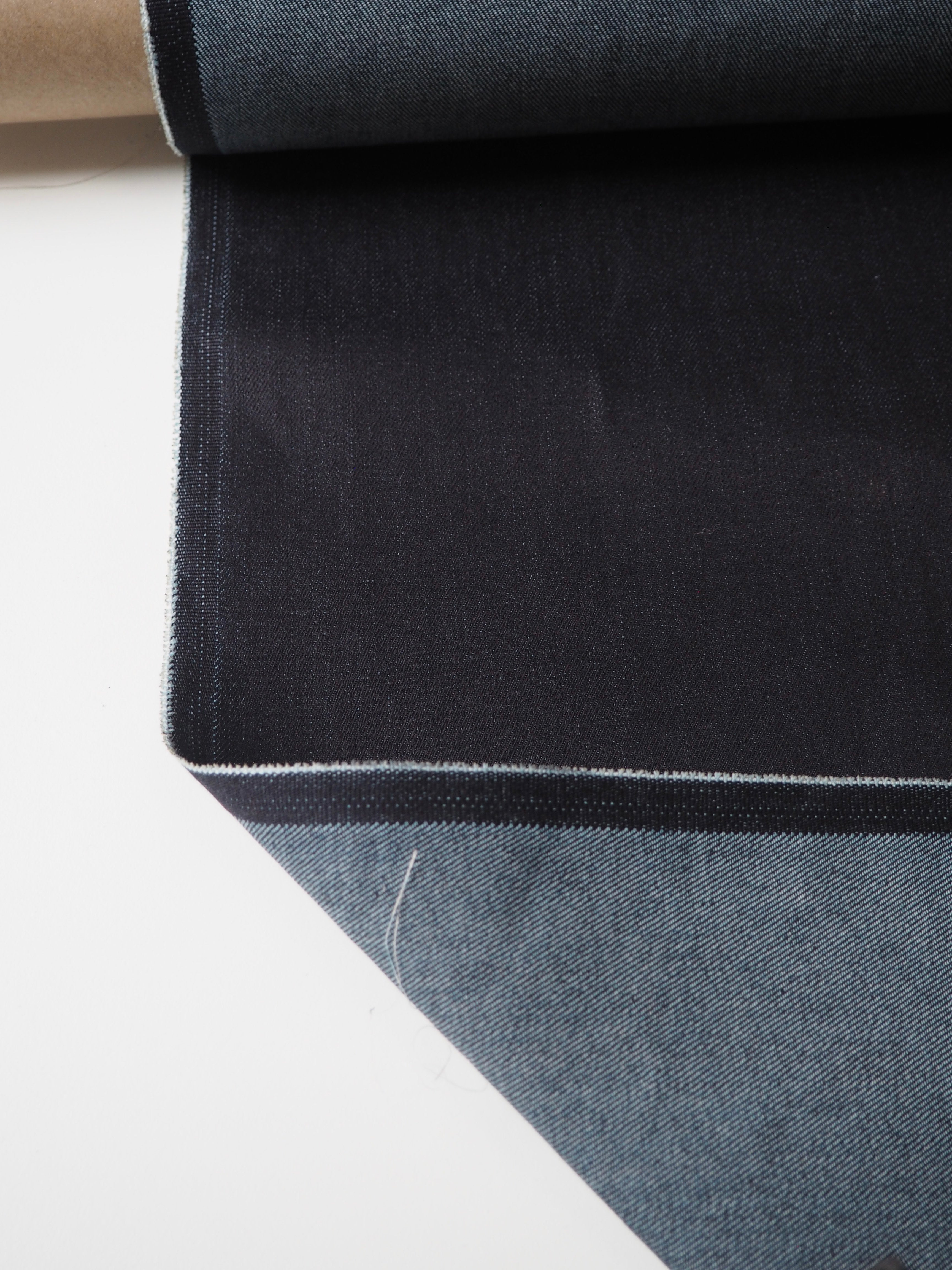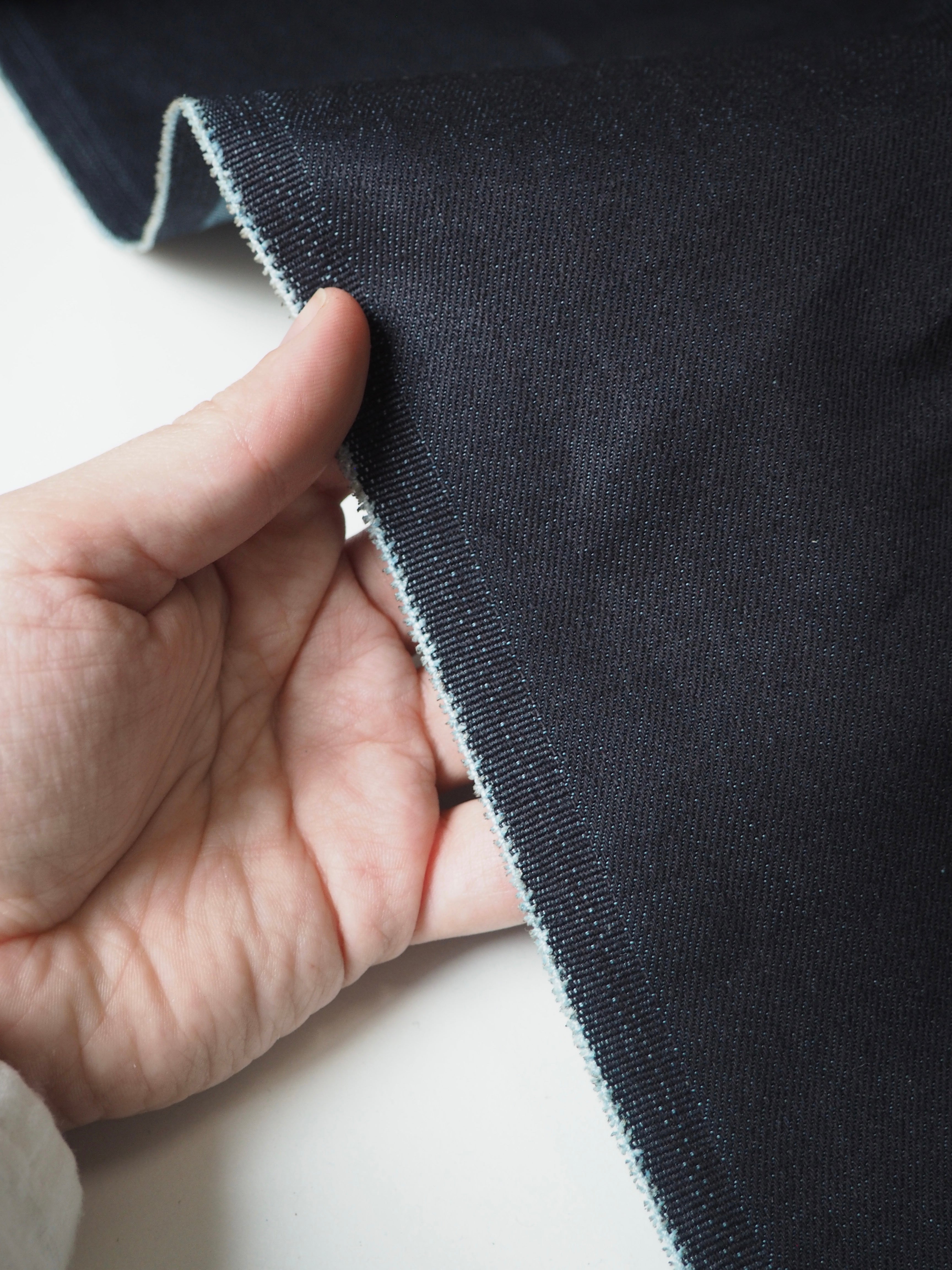 This ex-designer fabric is a cotton denim. In a dark blue wash, with a sturdy handle in a classic denim twill structure. Medium weight with a great amount of shape. Beautiful quality, and so soft and wearable! Has a smooth sateen finish. Would look great as a pair of our Everyday Jeans, or jacket!