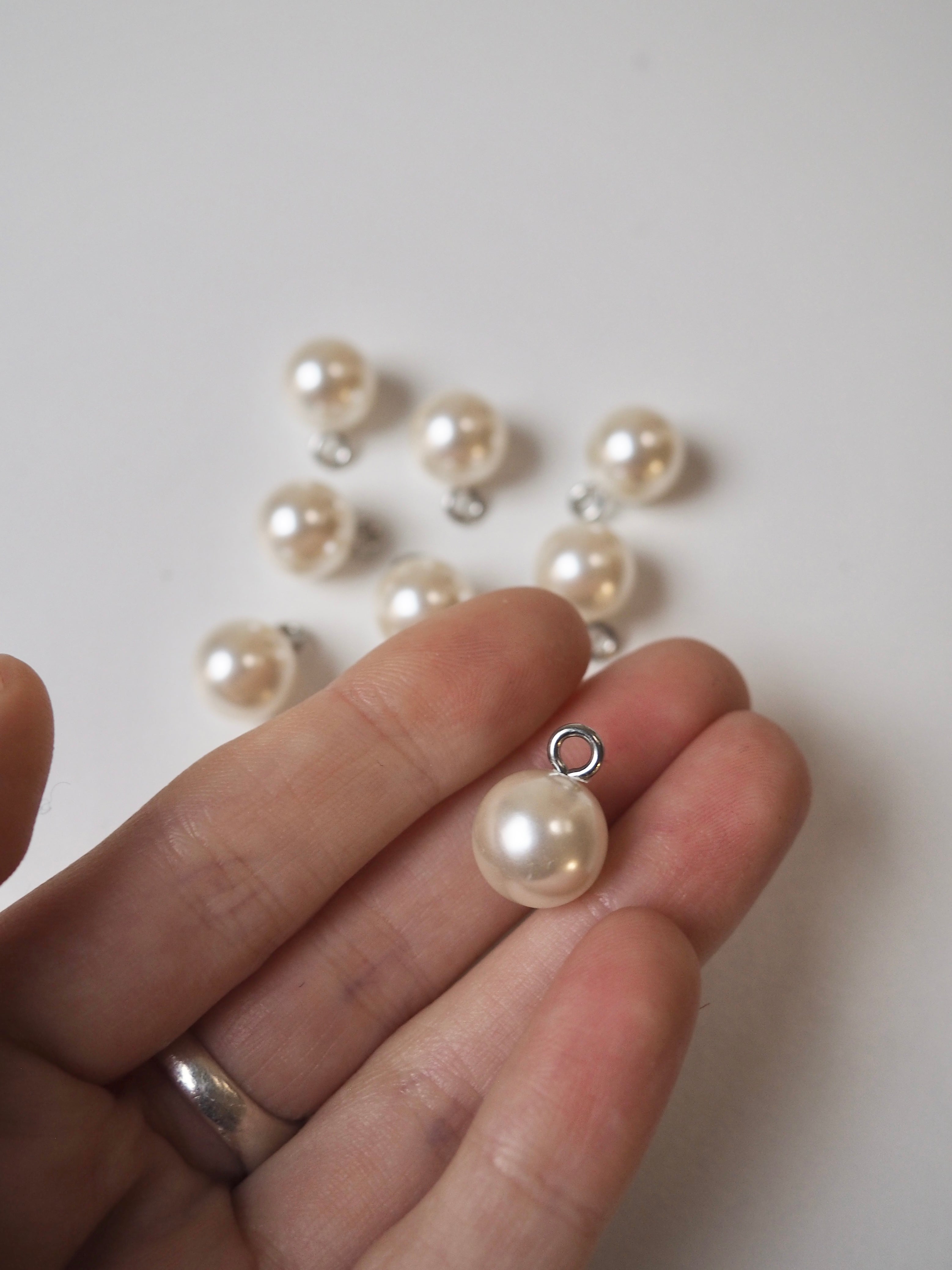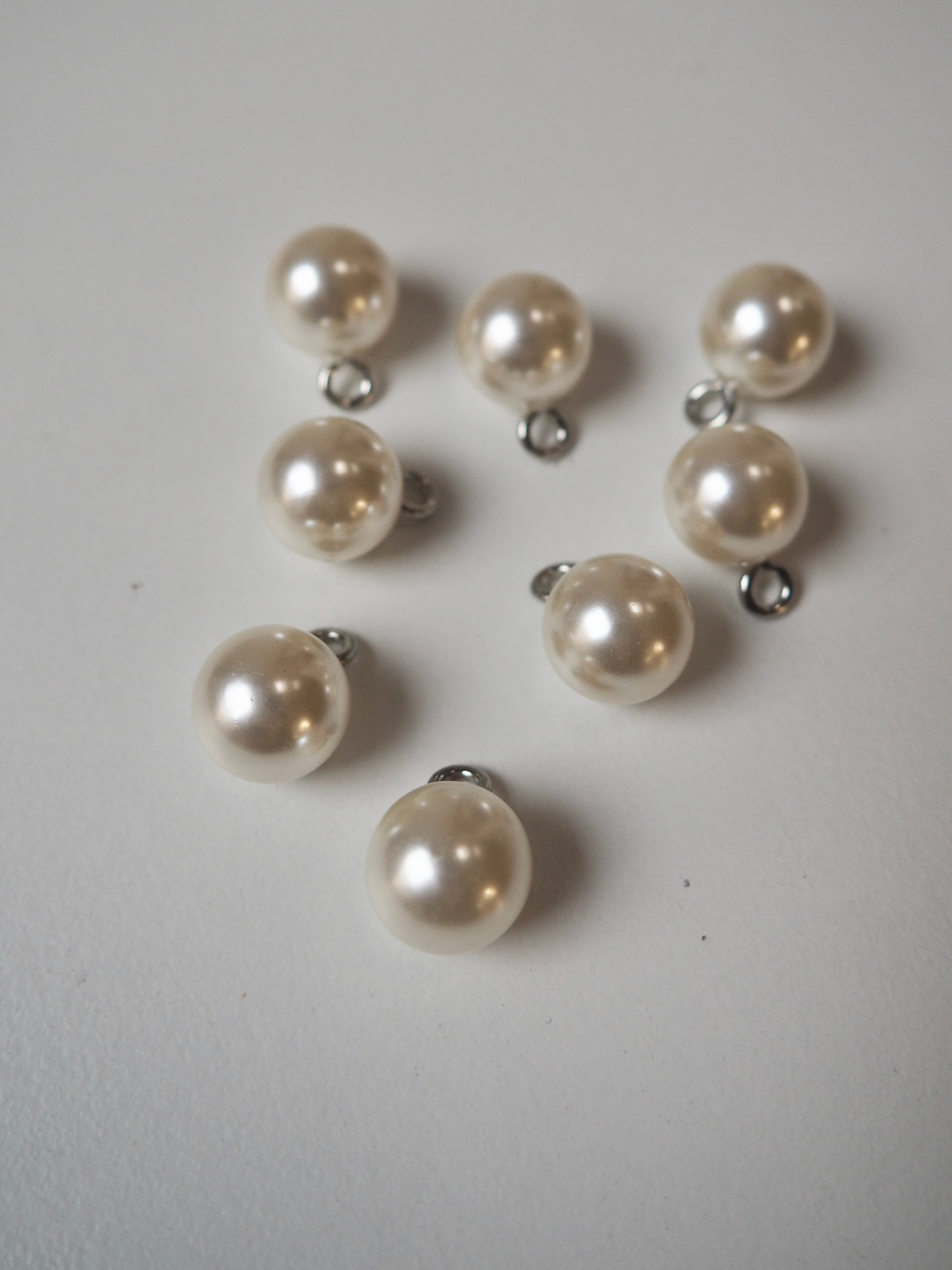 This ex-designer trim is a shank button. They are a faux plastic pearl in a creamy oyster colour that stand on a silver shank loop. They can be threaded onto a cord and would also work as either decorative or functional buttons. Would look great down the cuffs of a blouse, on shirts, cardigans and jackets.