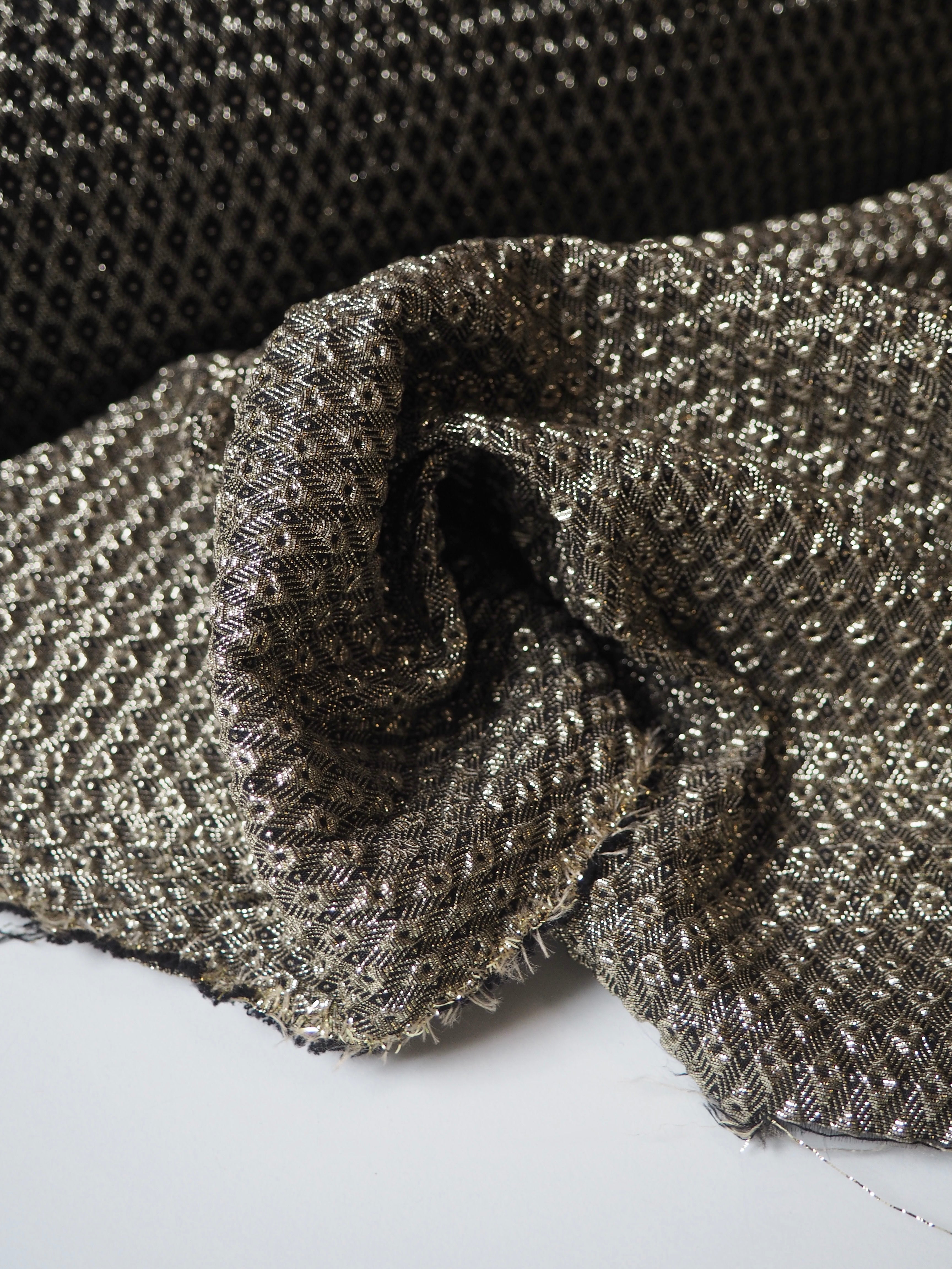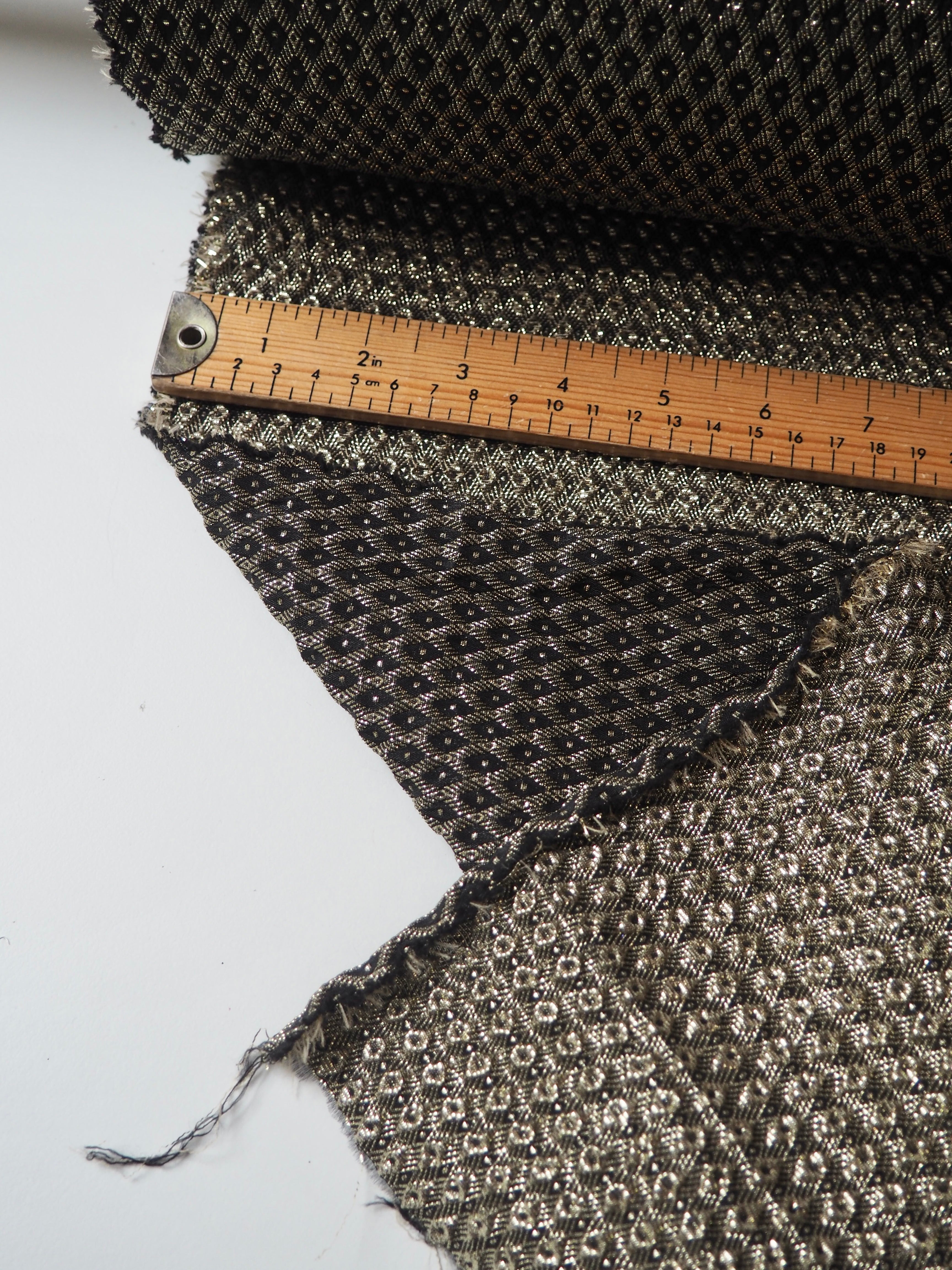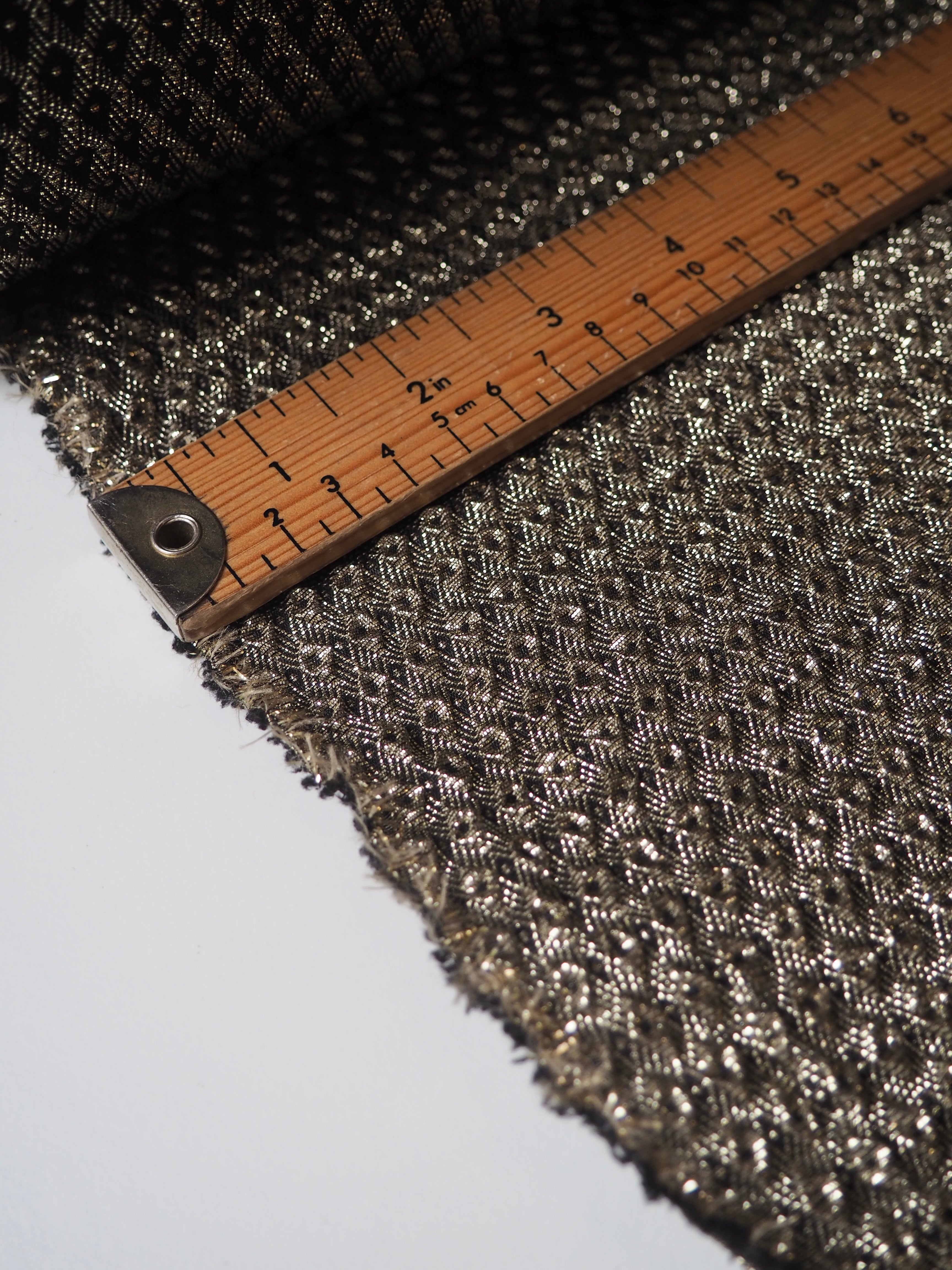 This ex-designer fabric is lovely cloqué. It is a black and gold cloth with a dotted weave on one side, and a diamond weave on the other. This makes it plush and gives it a quilted look. Lightweight, great structure to play with, and eye-catching with the metallic threads. So fun for a light jacket, waistcoat, or puffy dress or Everyday Top!