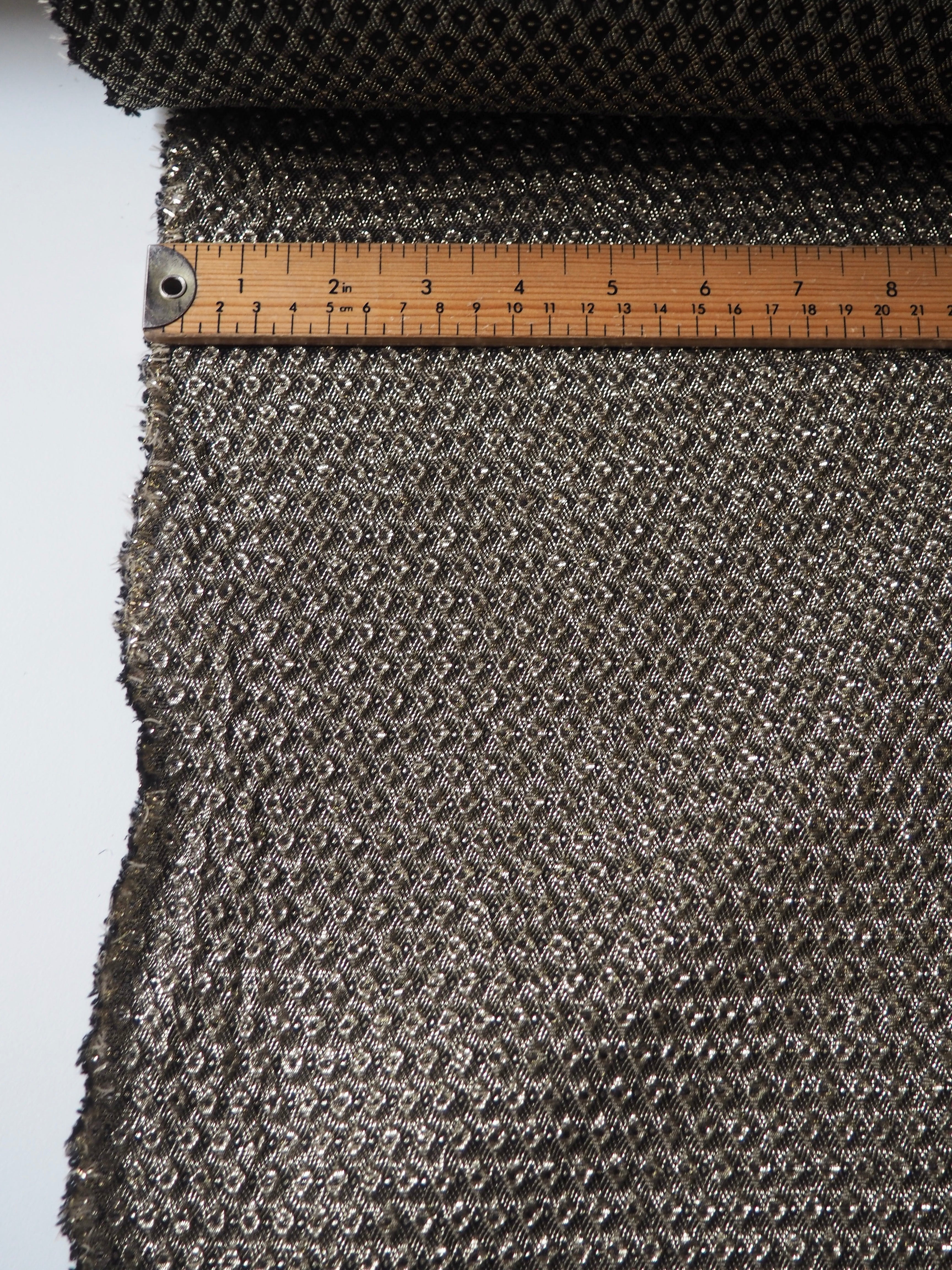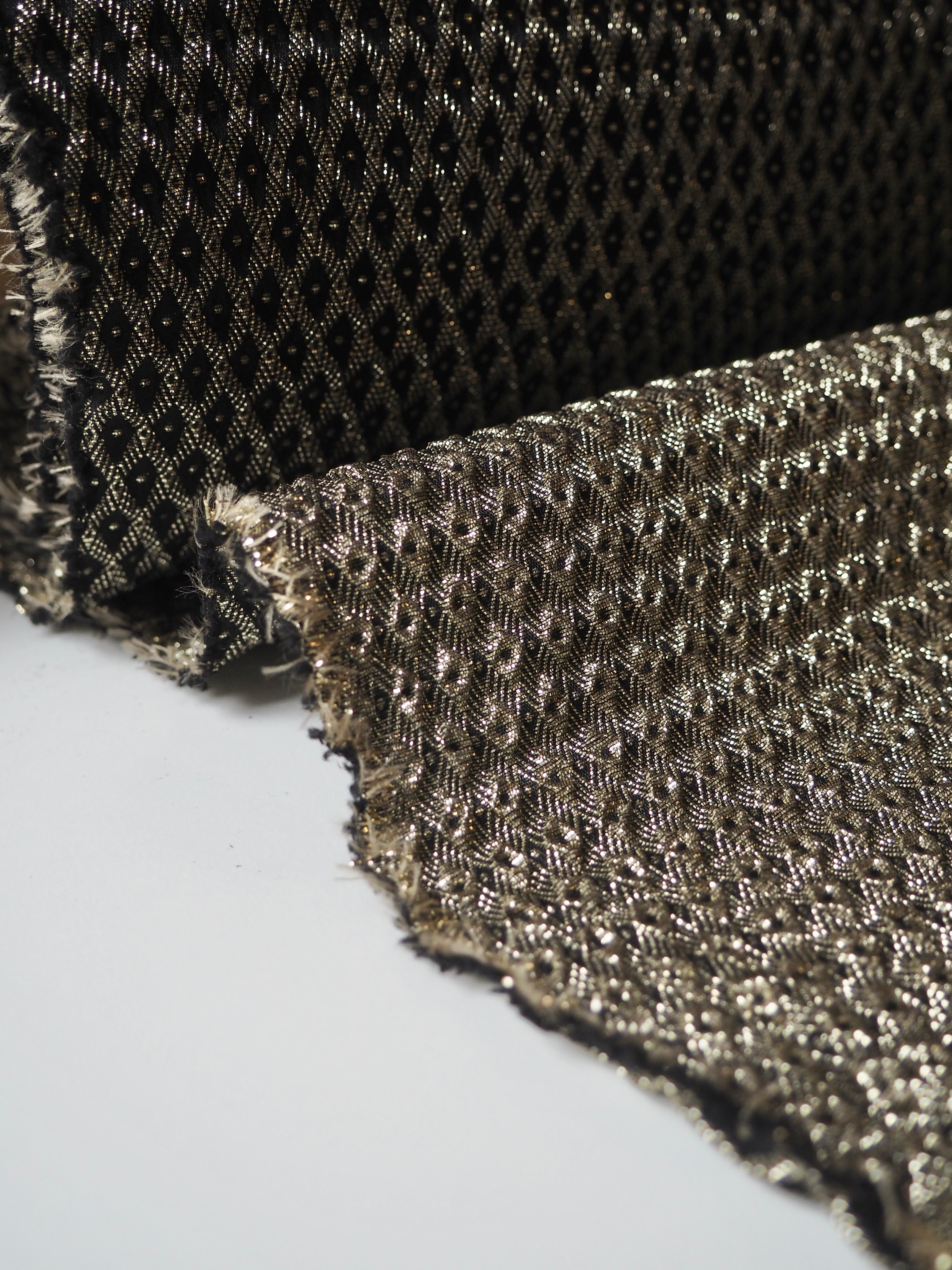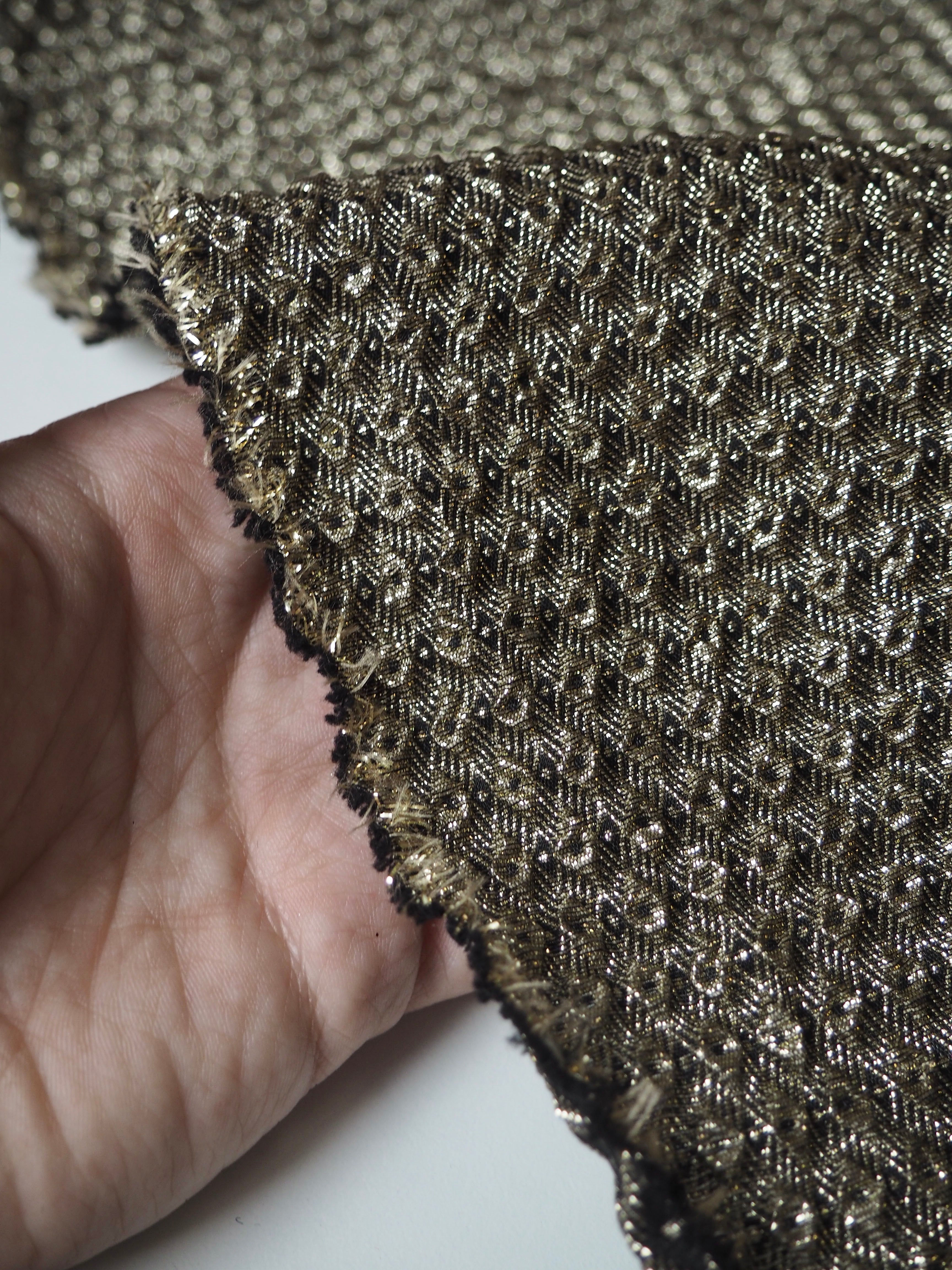 This ex-designer fabric is lovely cloqué. It is a black and gold cloth with a dotted weave on one side, and a diamond weave on the other. This makes it plush and gives it a quilted look. Lightweight, great structure to play with, and eye-catching with the metallic threads. So fun for a light jacket, waistcoat, or puffy dress or Everyday Top!