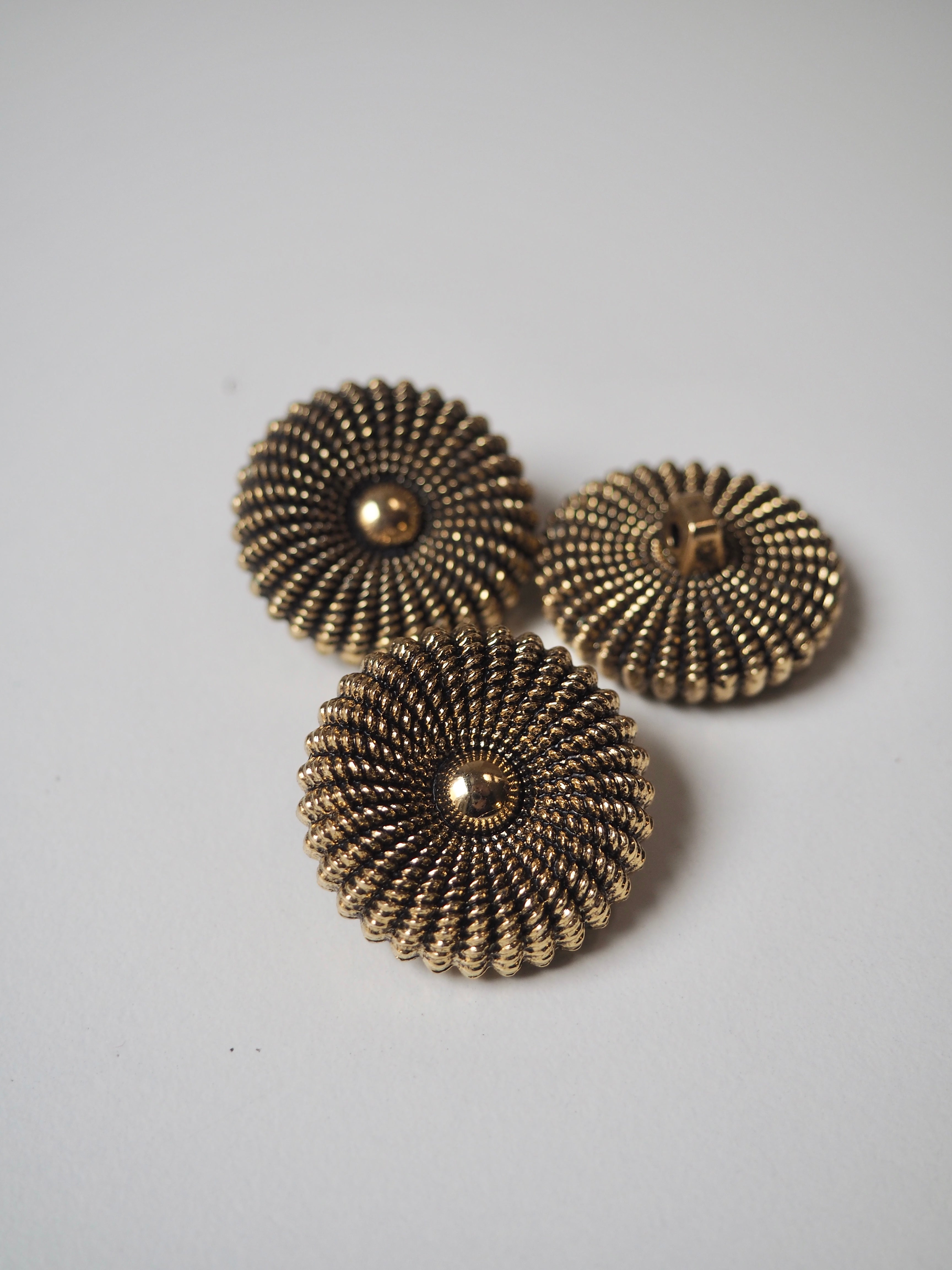 This ex-designer trim is a shank button. It is a vintage gold colour and is plastic imitating the look of a metal button but without the weight. Perfect size for coats and jackets.