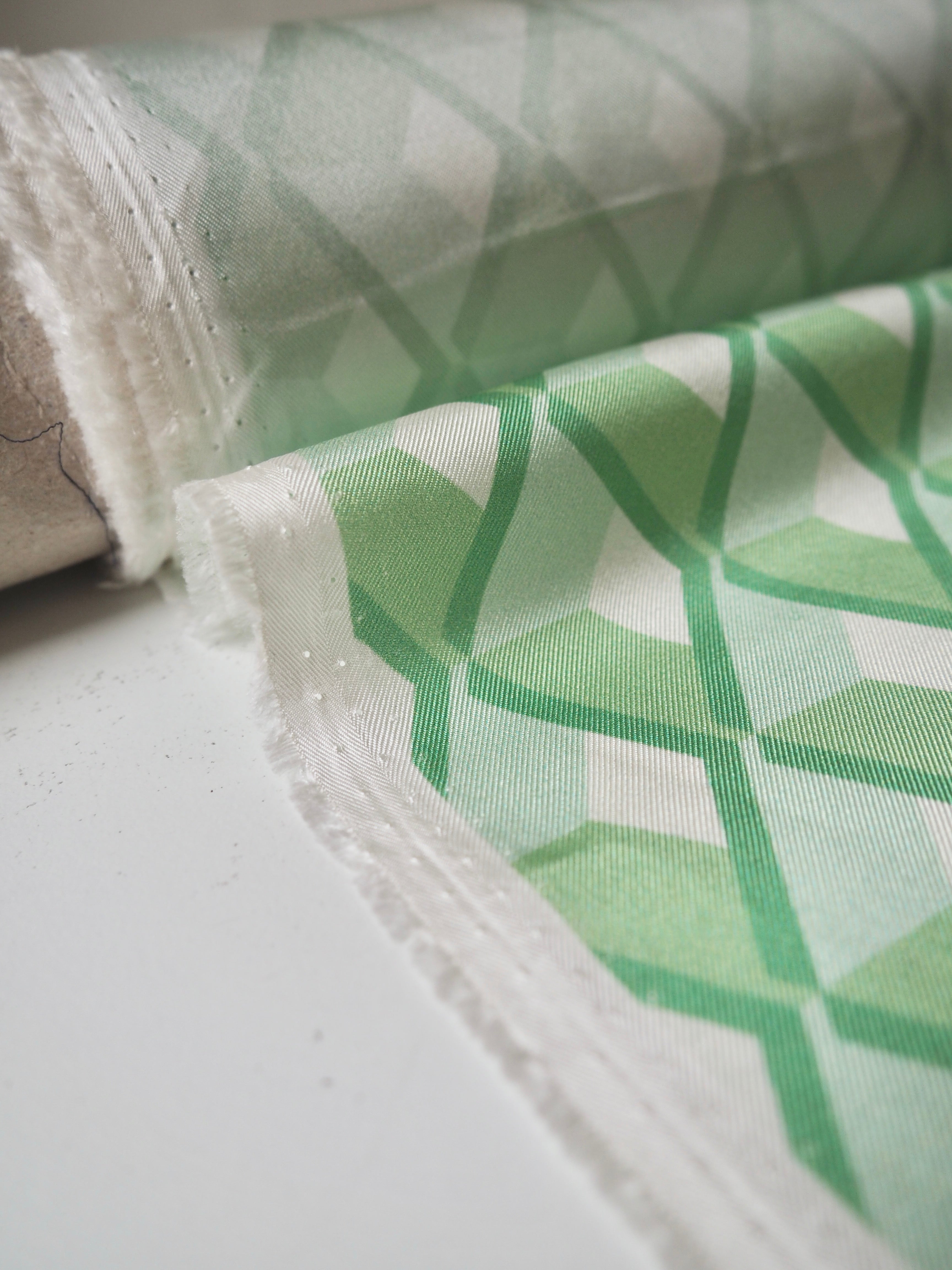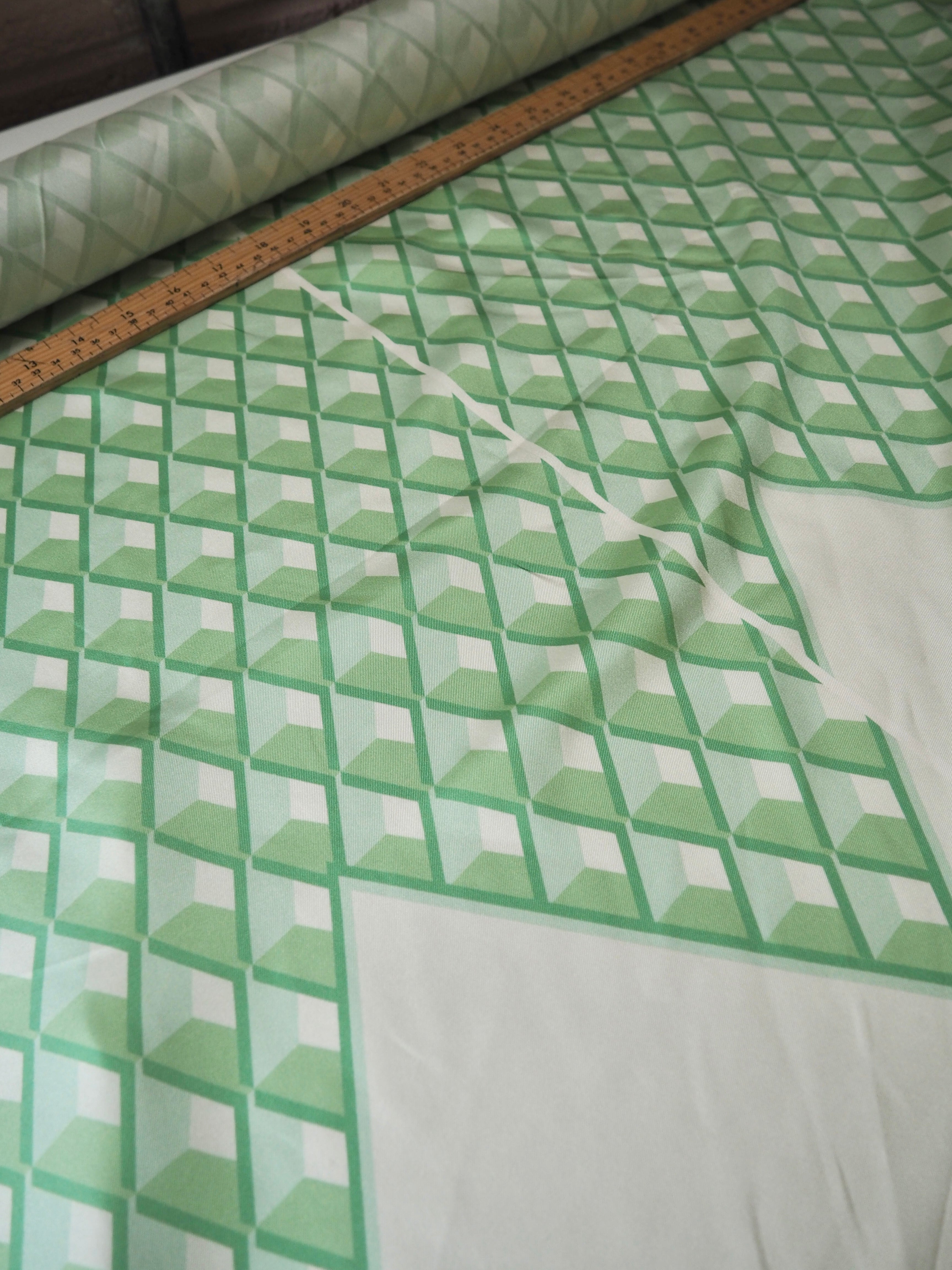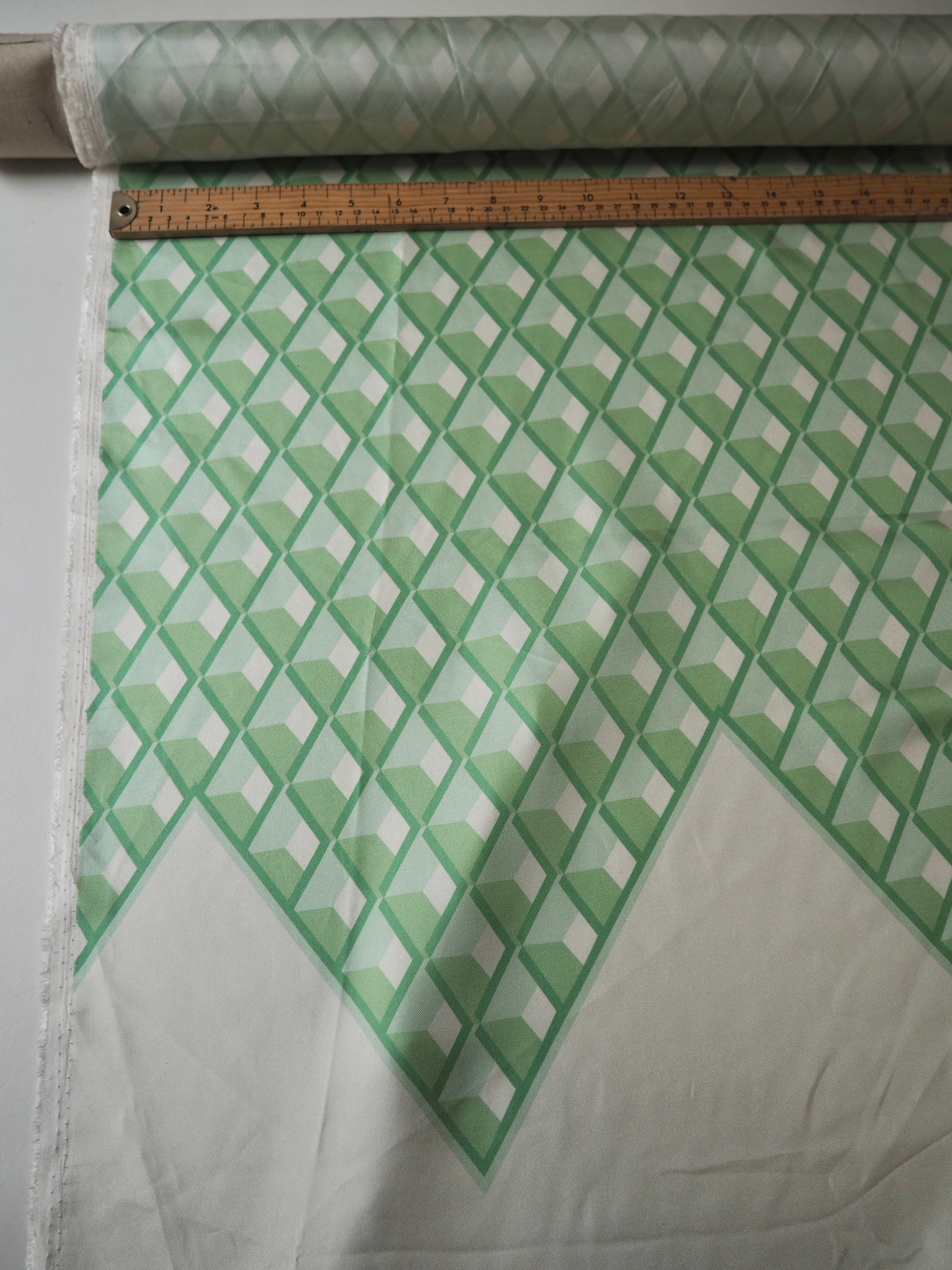 This ex-designer fabric is a silk twill panel. It's in a lovely green and white diamond print down the warp. It was likely made into long silk scarves, and the piece is 2.5m long, with two lines dividing the cloth into thirds. It's bespoke from a London designer. It's slinky, mostly opaque, and very soft. It has an incredible satin sheen and beautiful movement. The twill weave gives it a crisp, strong handle. The perfect drapey silk for blouses, or could use the lines to give direction down a dress!