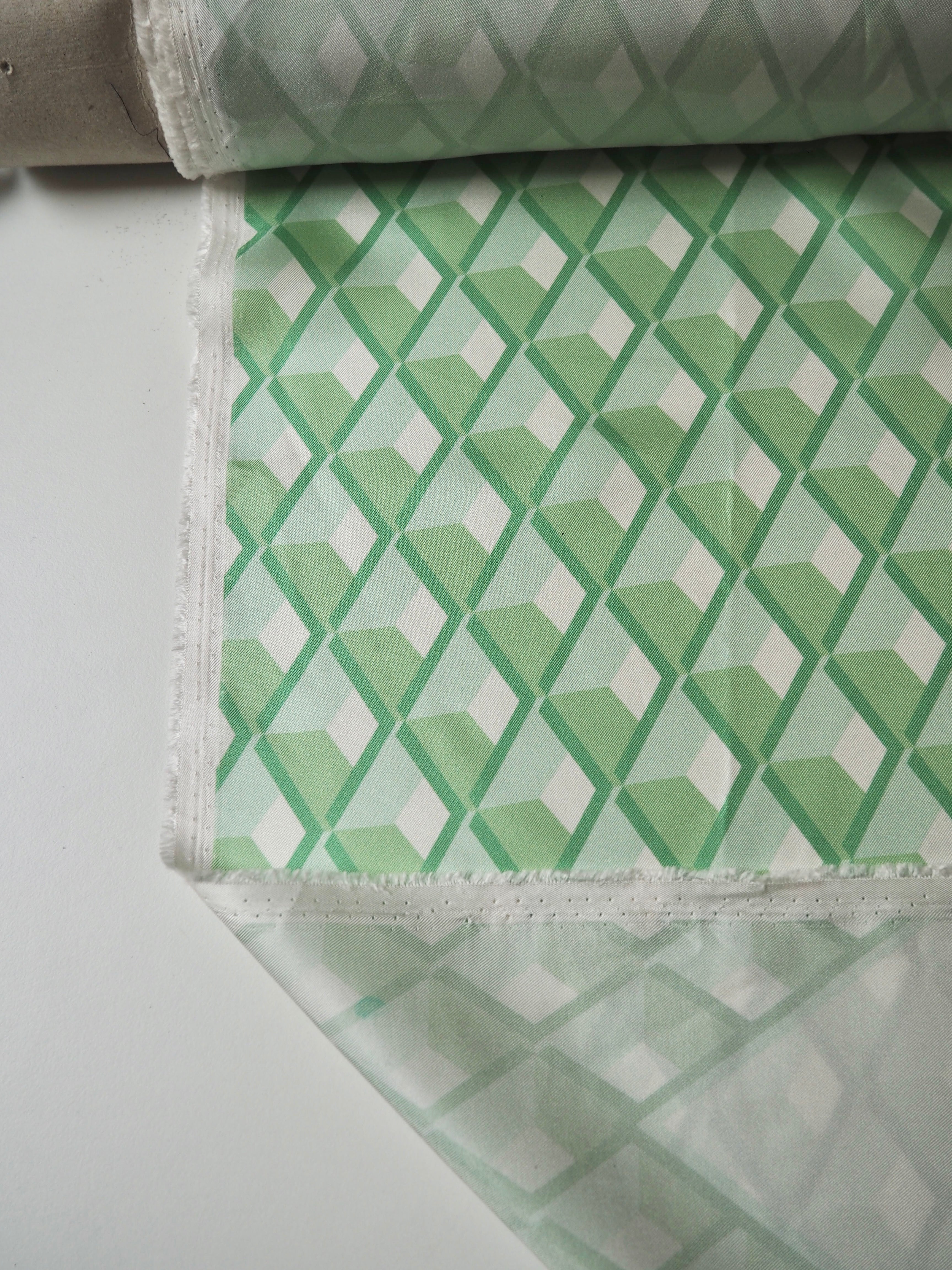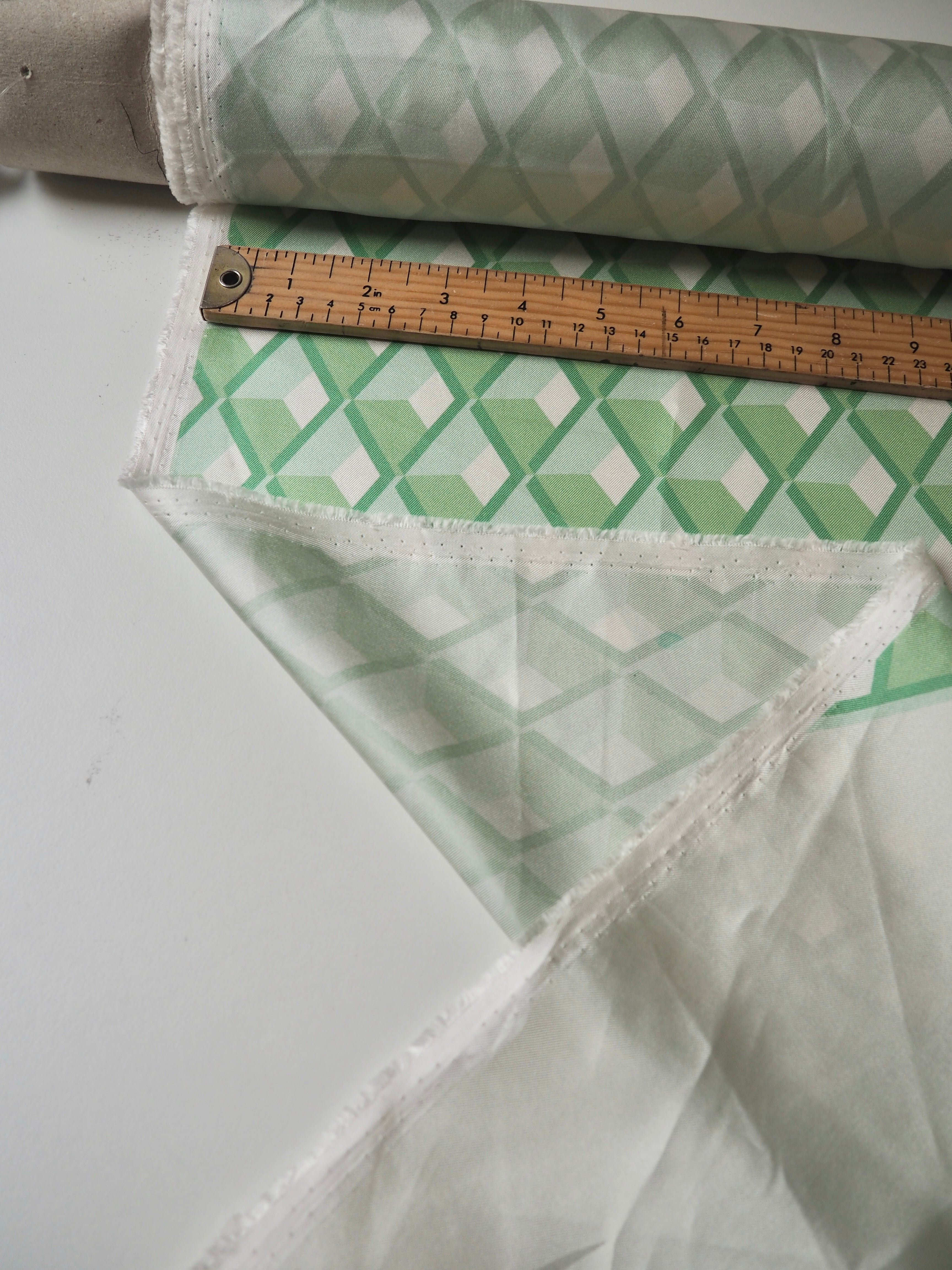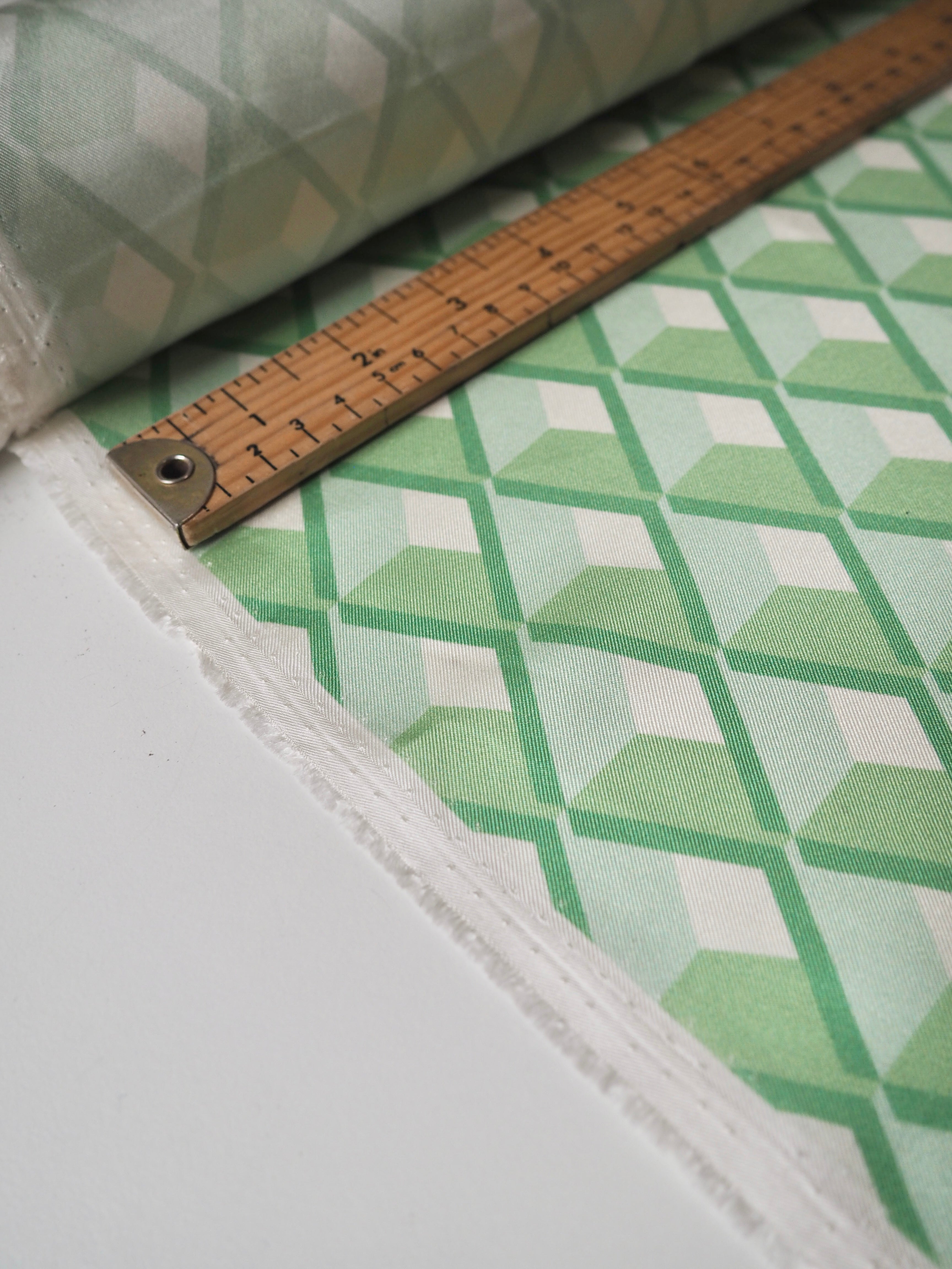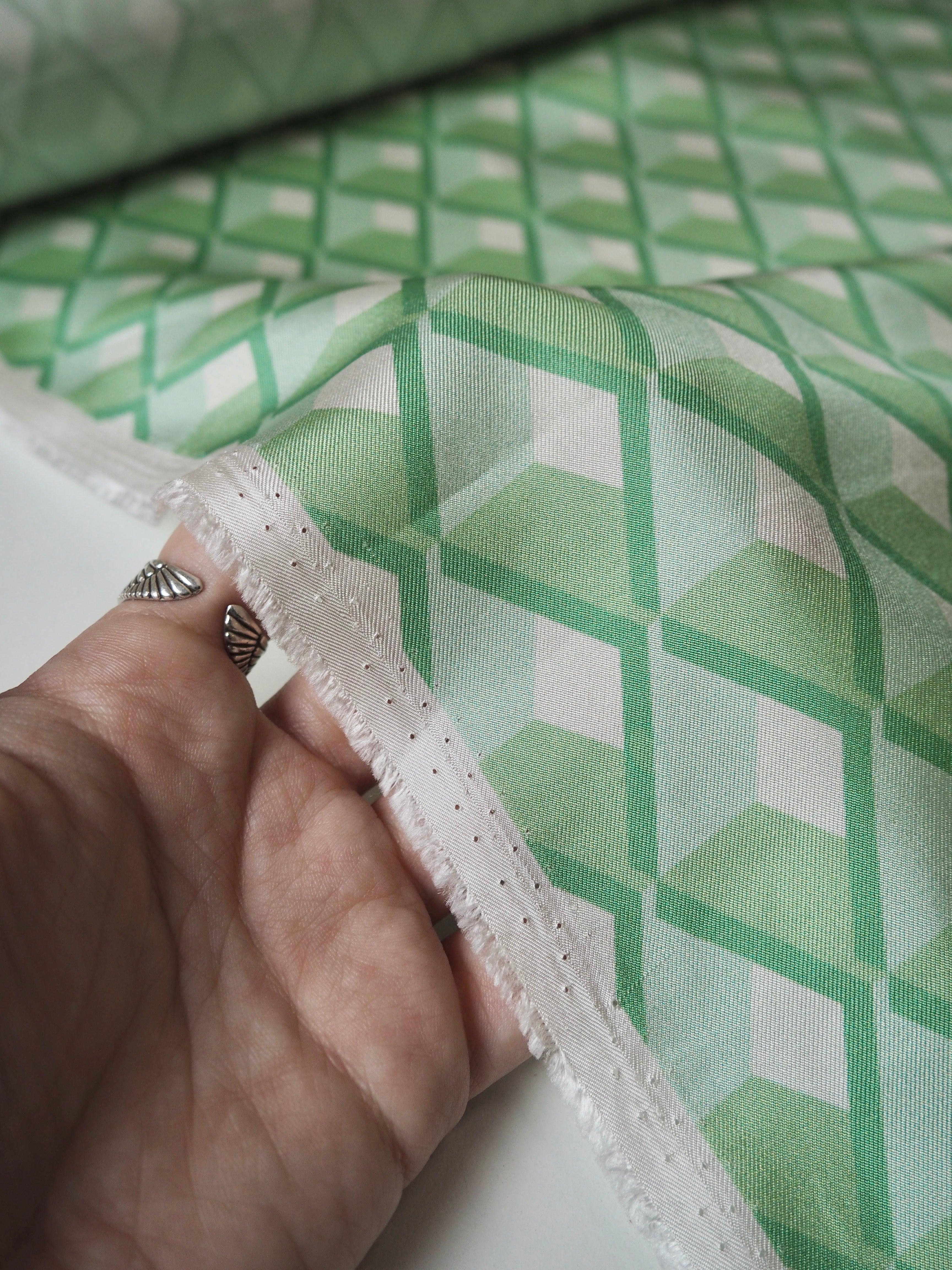 This ex-designer fabric is a silk twill panel. It's in a lovely green and white diamond print down the warp. It was likely made into long silk scarves, and the piece is 2.5m long, with two lines dividing the cloth into thirds. It's bespoke from a London designer. It's slinky, mostly opaque, and very soft. It has an incredible satin sheen and beautiful movement. The twill weave gives it a crisp, strong handle. The perfect drapey silk for blouses, or could use the lines to give direction down a dress!