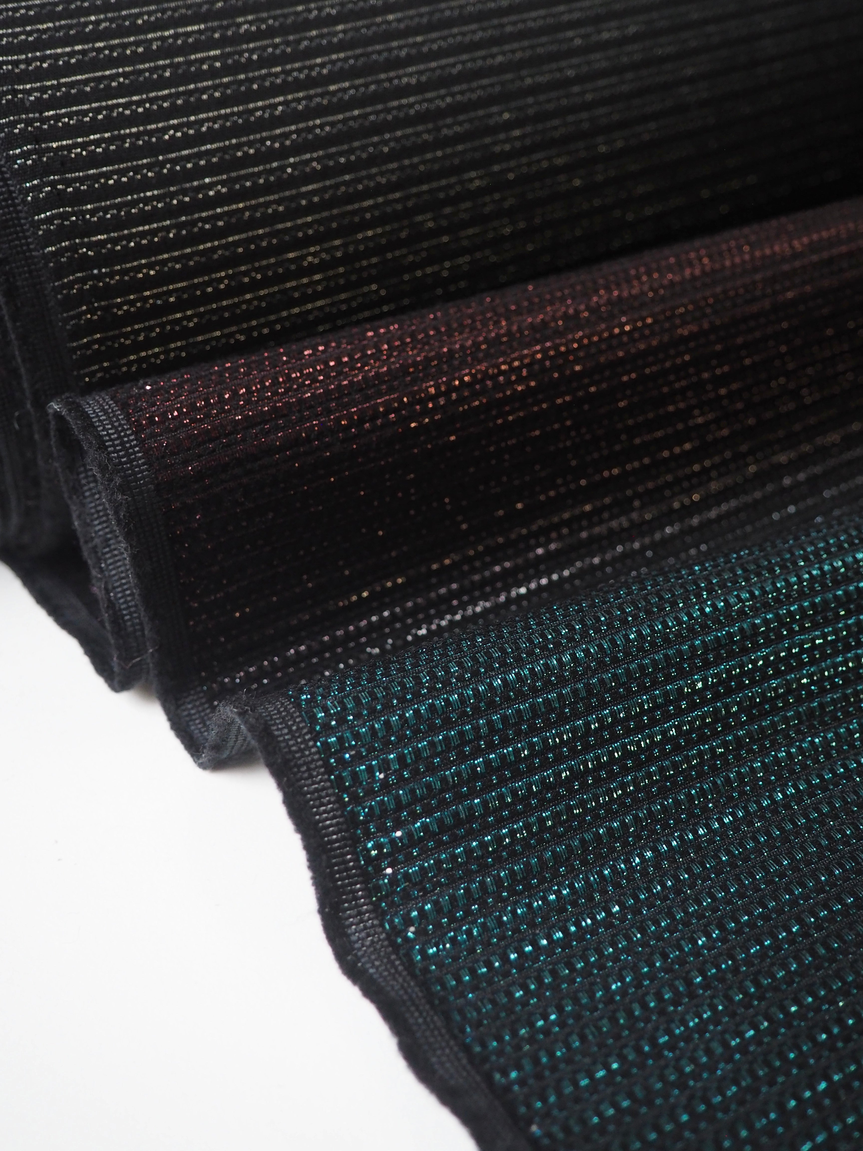 This ex-designer fabric is a jacquard. It's a wool and lurex jacquard, with green and pink ombre threads alternating across the black. It's sturdy, with a wool-y feel and beautiful sheen finish that catches the light quite well. Medium weight, and has lots of flexible structure. Opaque, looks so special! Perfect for a boxy cropped jacket or coat!