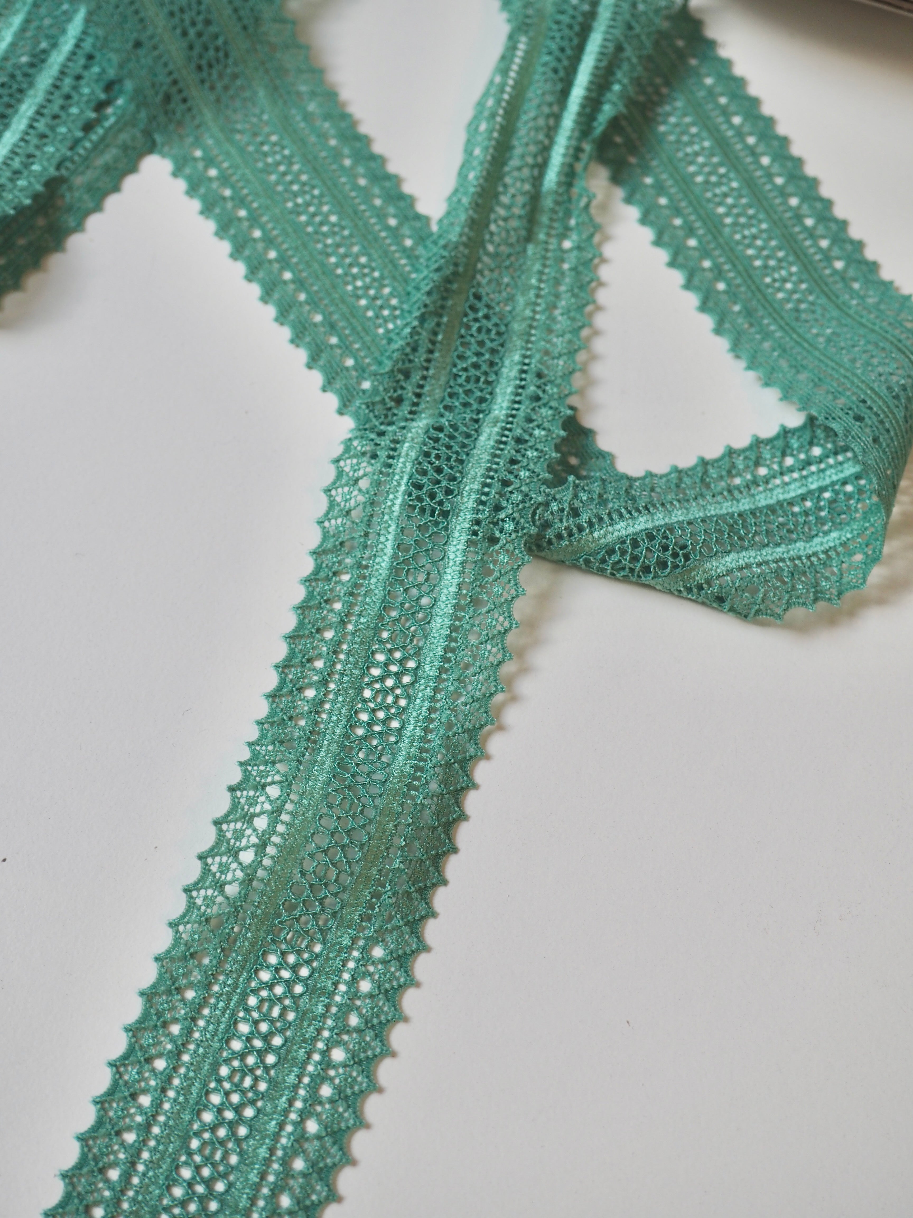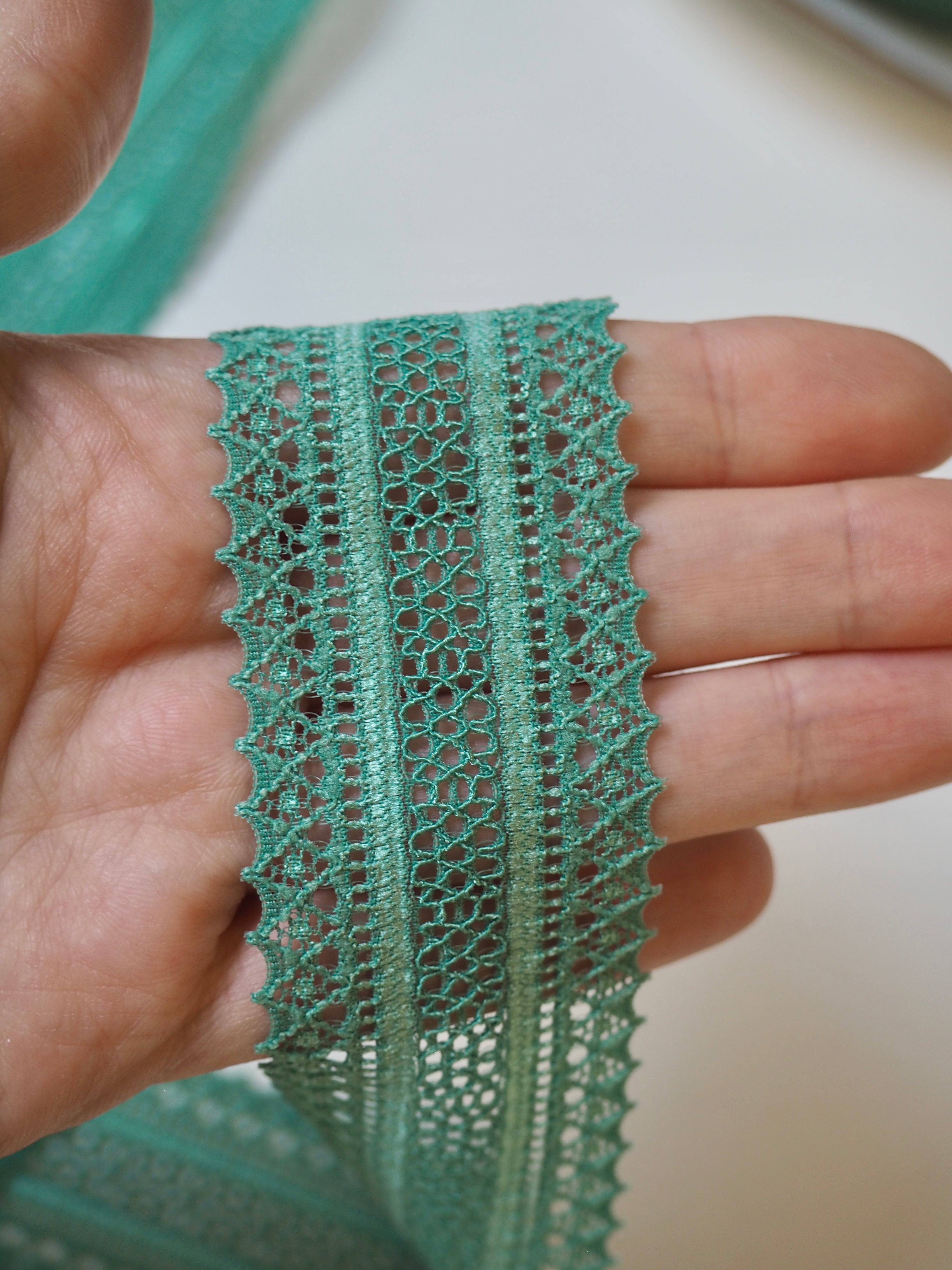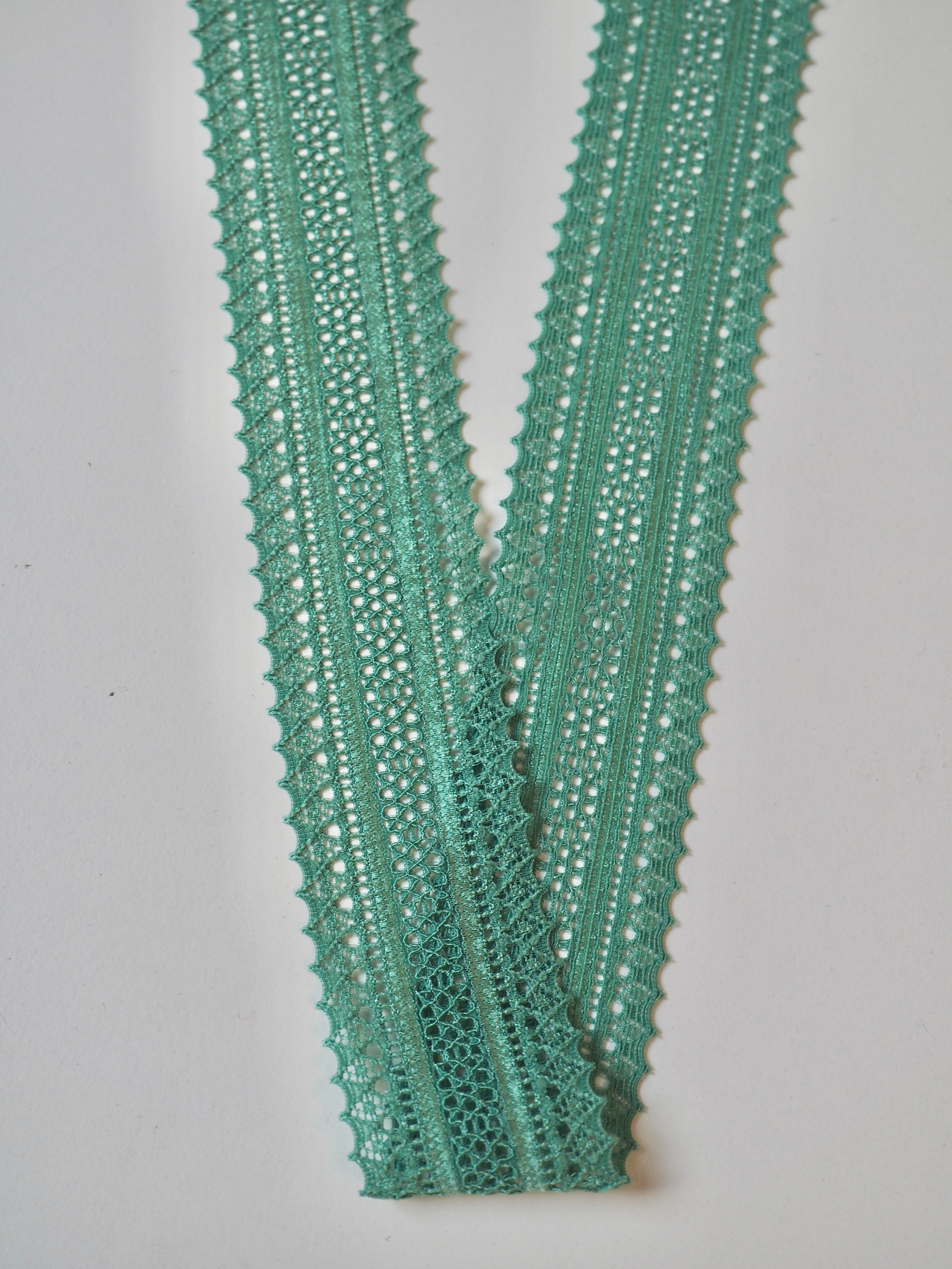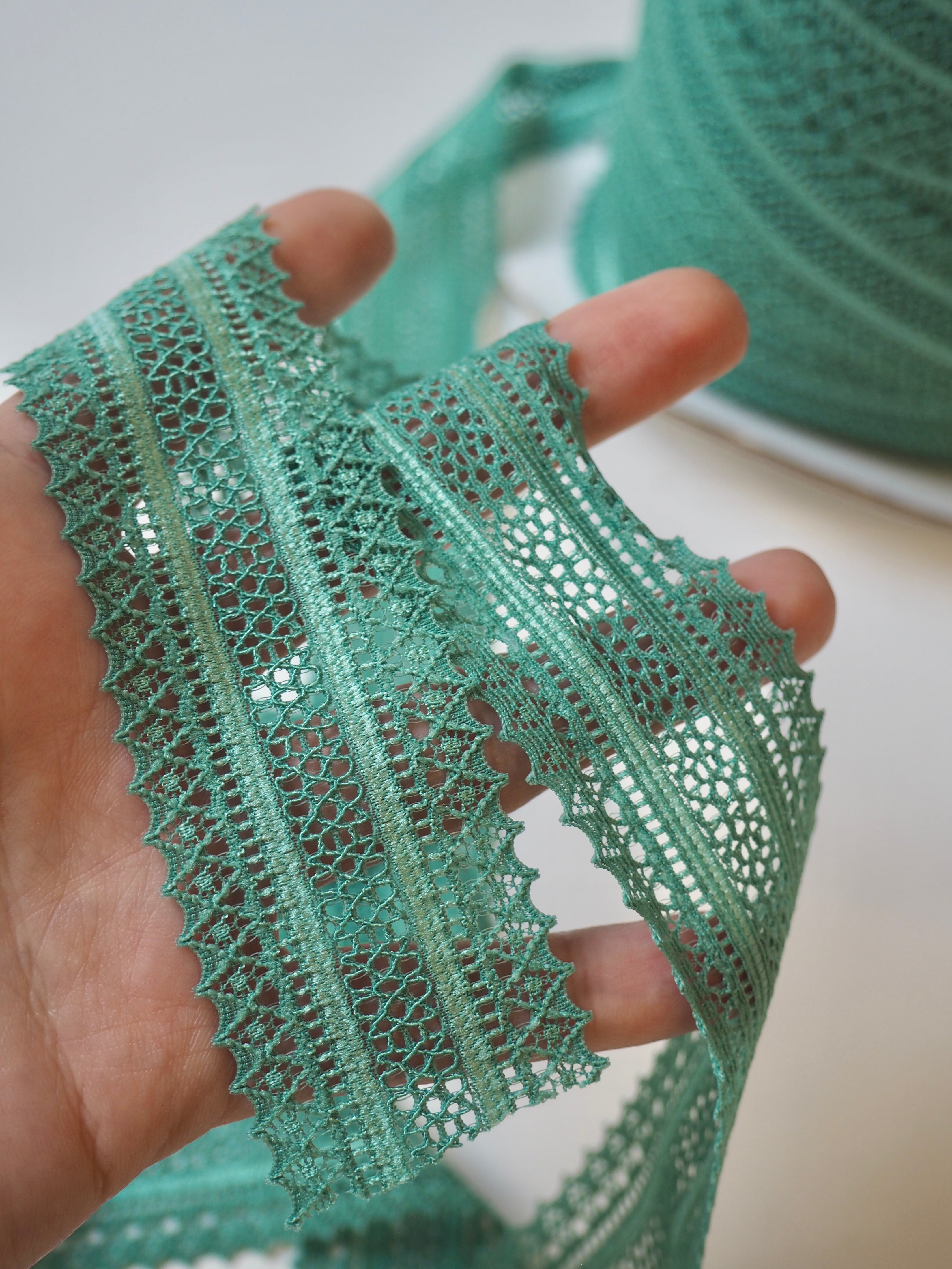 This ex-designer trim is a lace trim. It's top-quality from France. Has comfortable handle and is semi- sheer. Perfect for lingerie and bra making, but could also be used as trim on other garments and accessories!