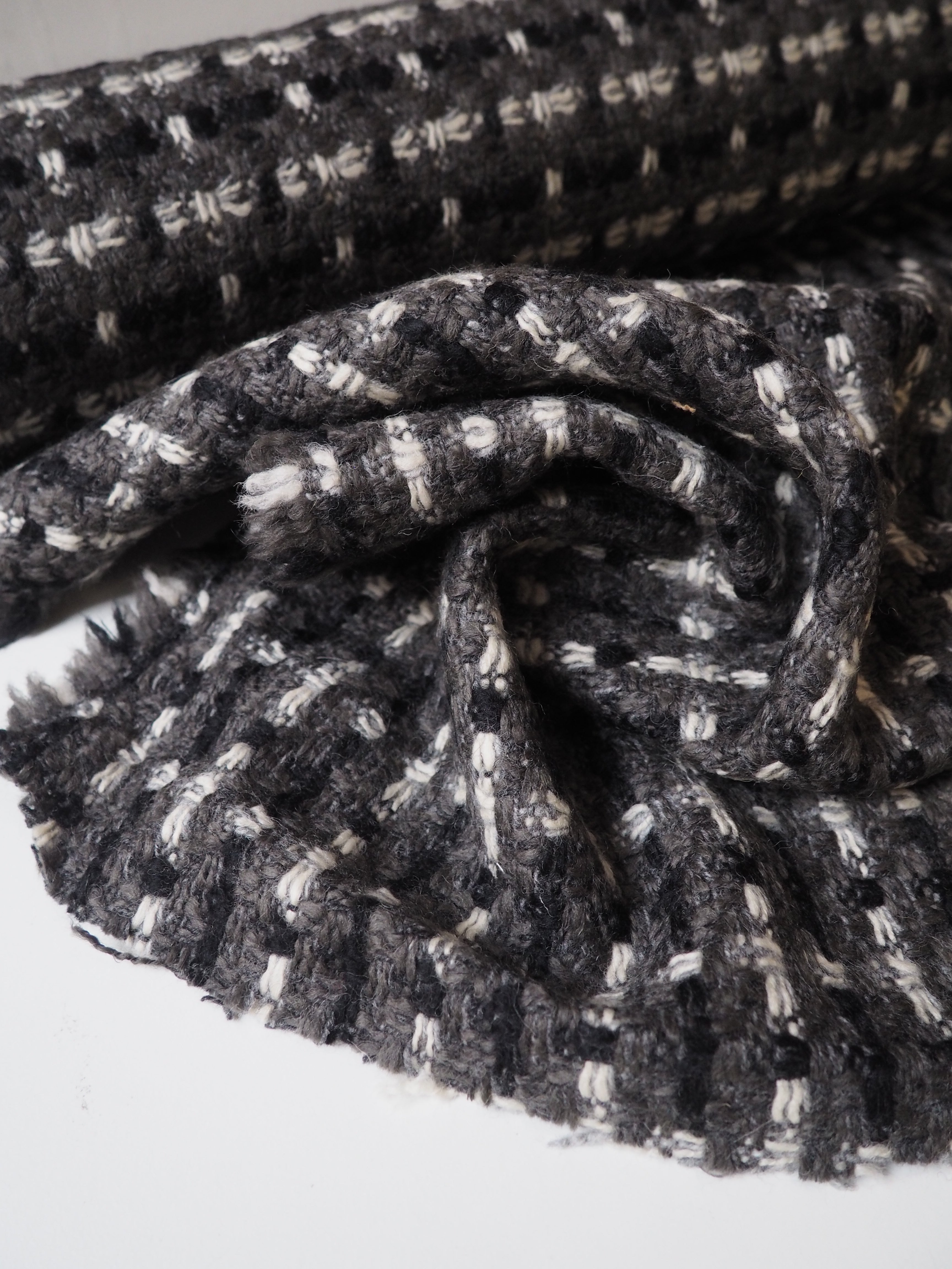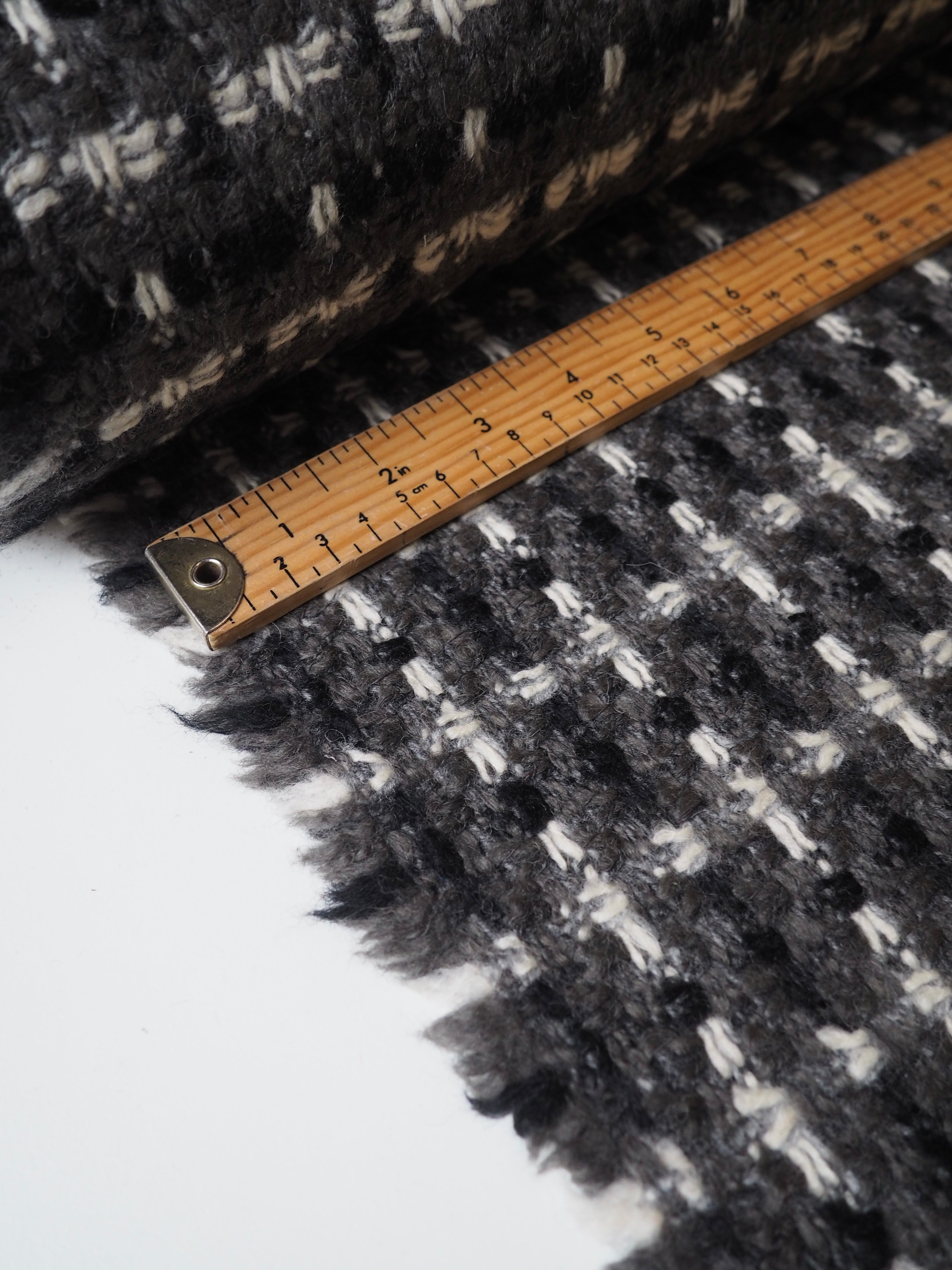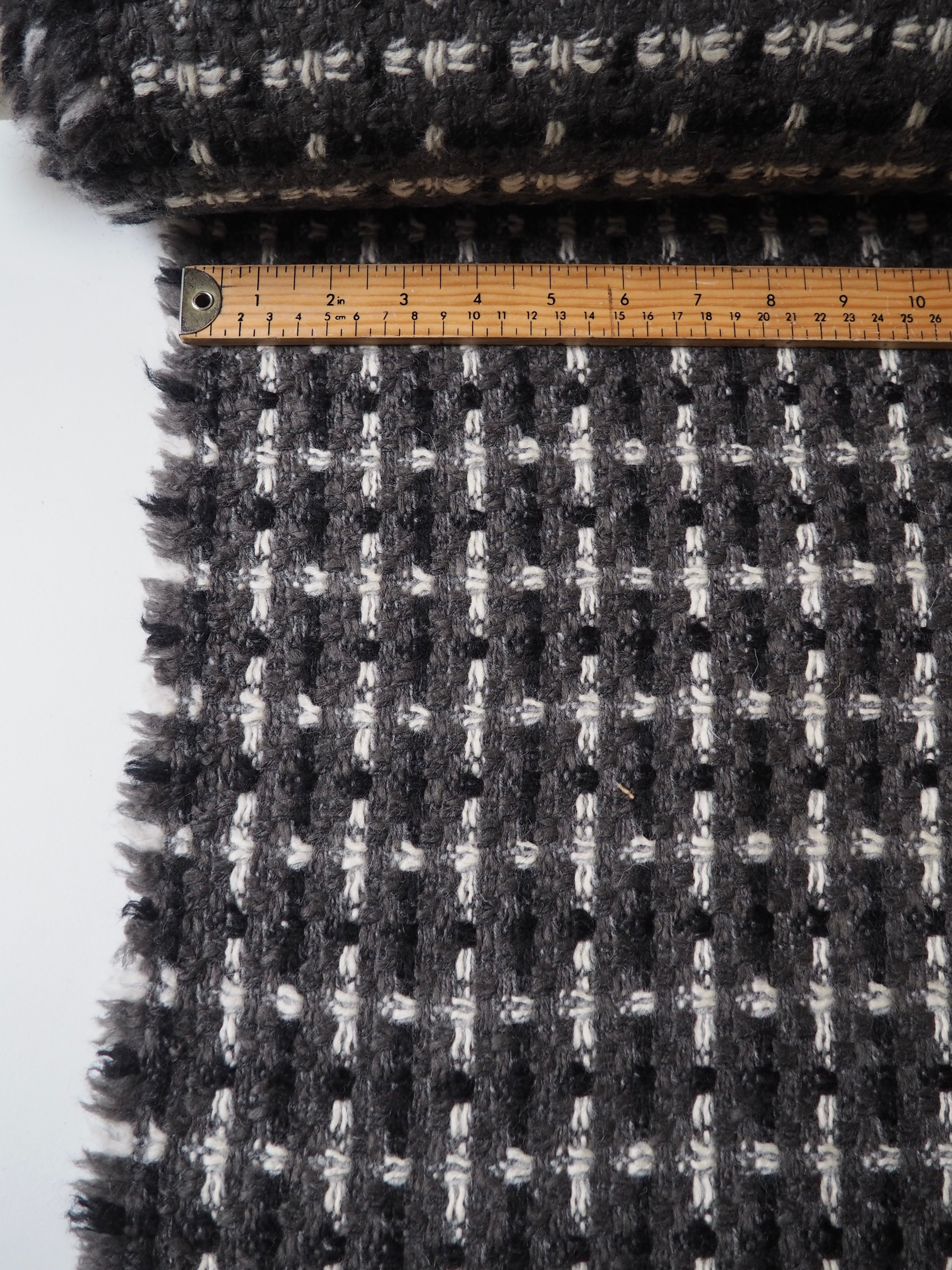 This ex-designer fabric is a tweed coating. It's a grey, white and black gridded weave. It's medium to heavy weight, with a denser weave. It has a thick, wool-y handle and sturdy texture. It's quite warm and has a gentle structure. Perfect for a coat, jacket, or even home wares!