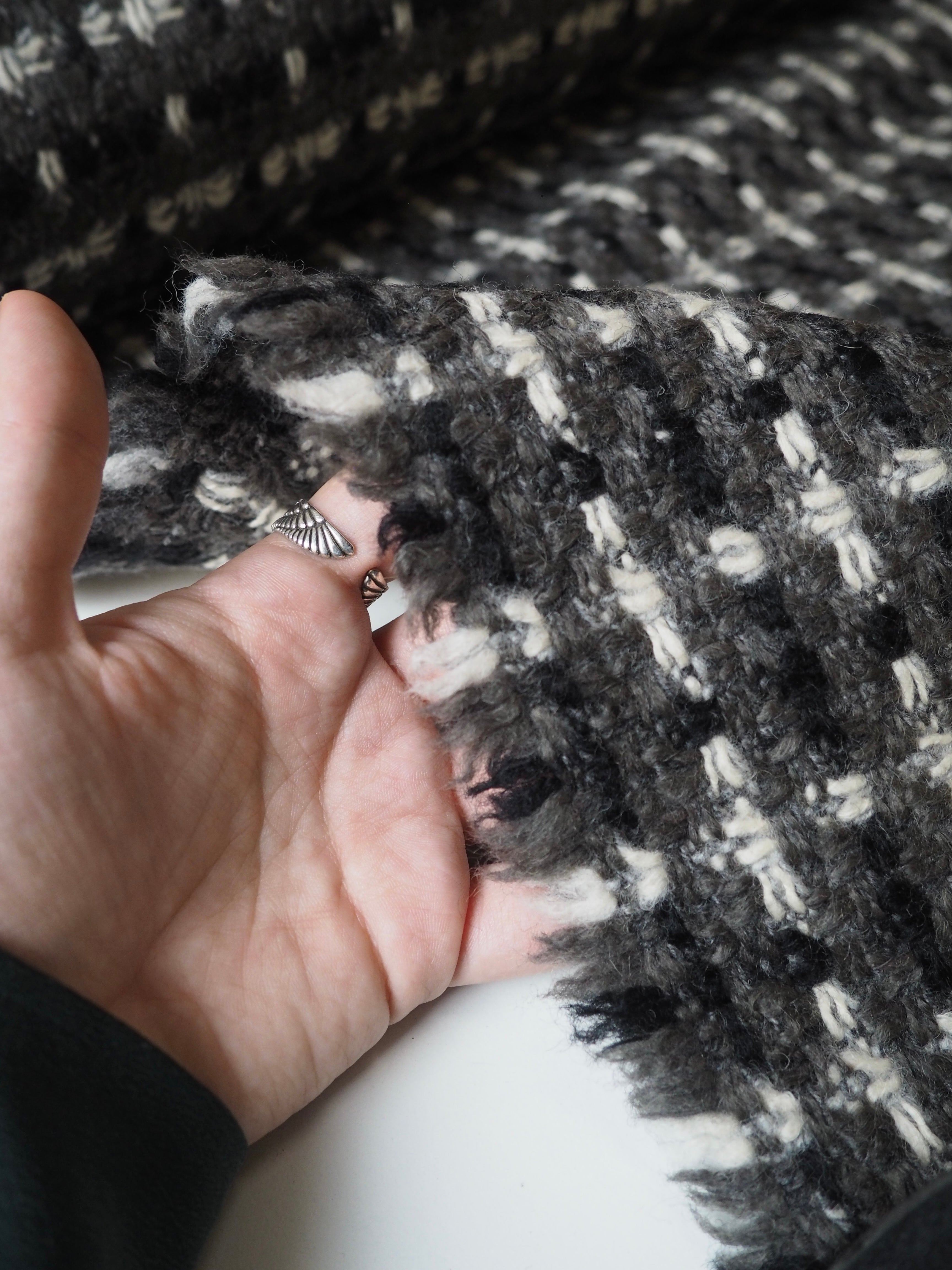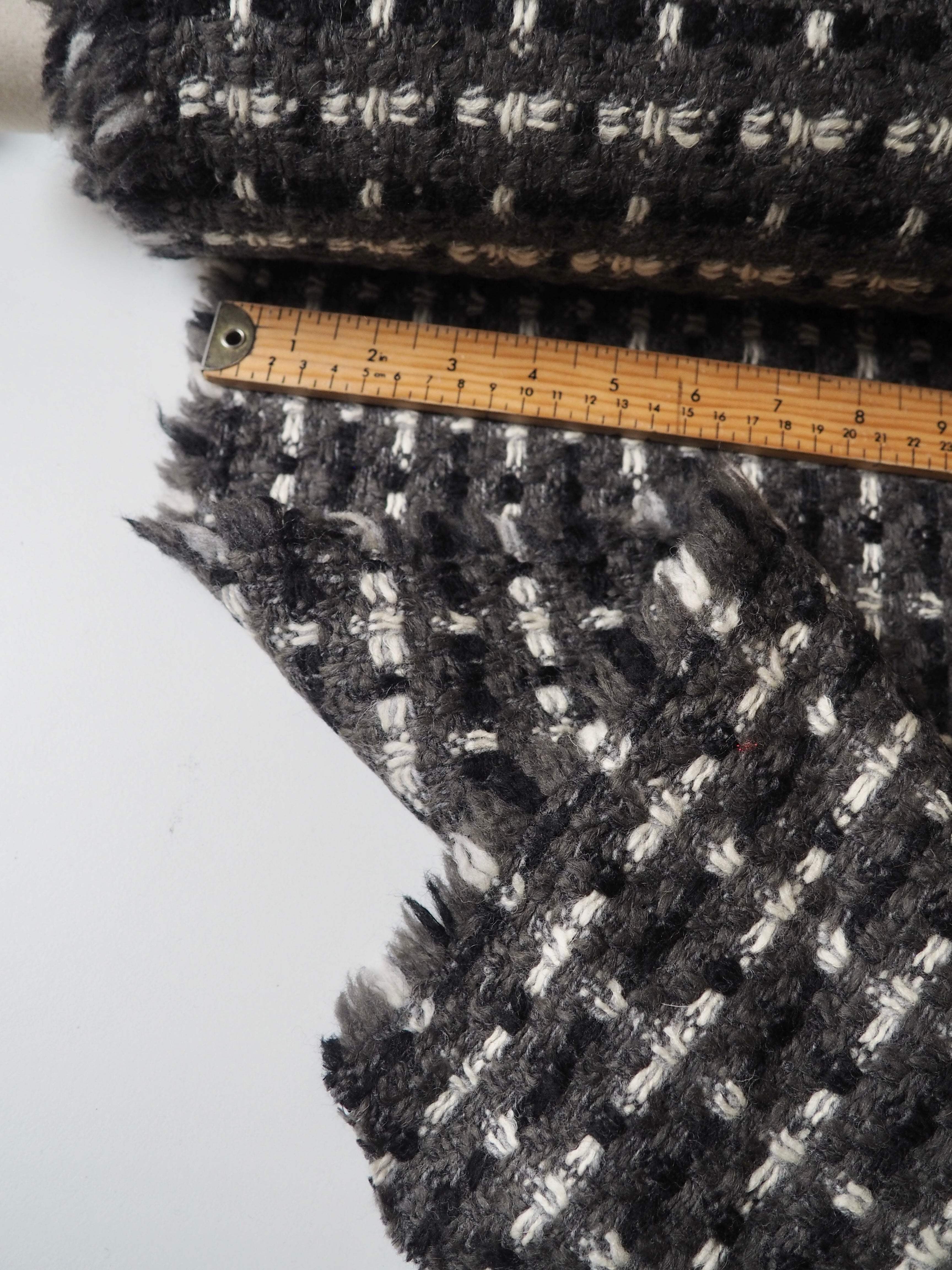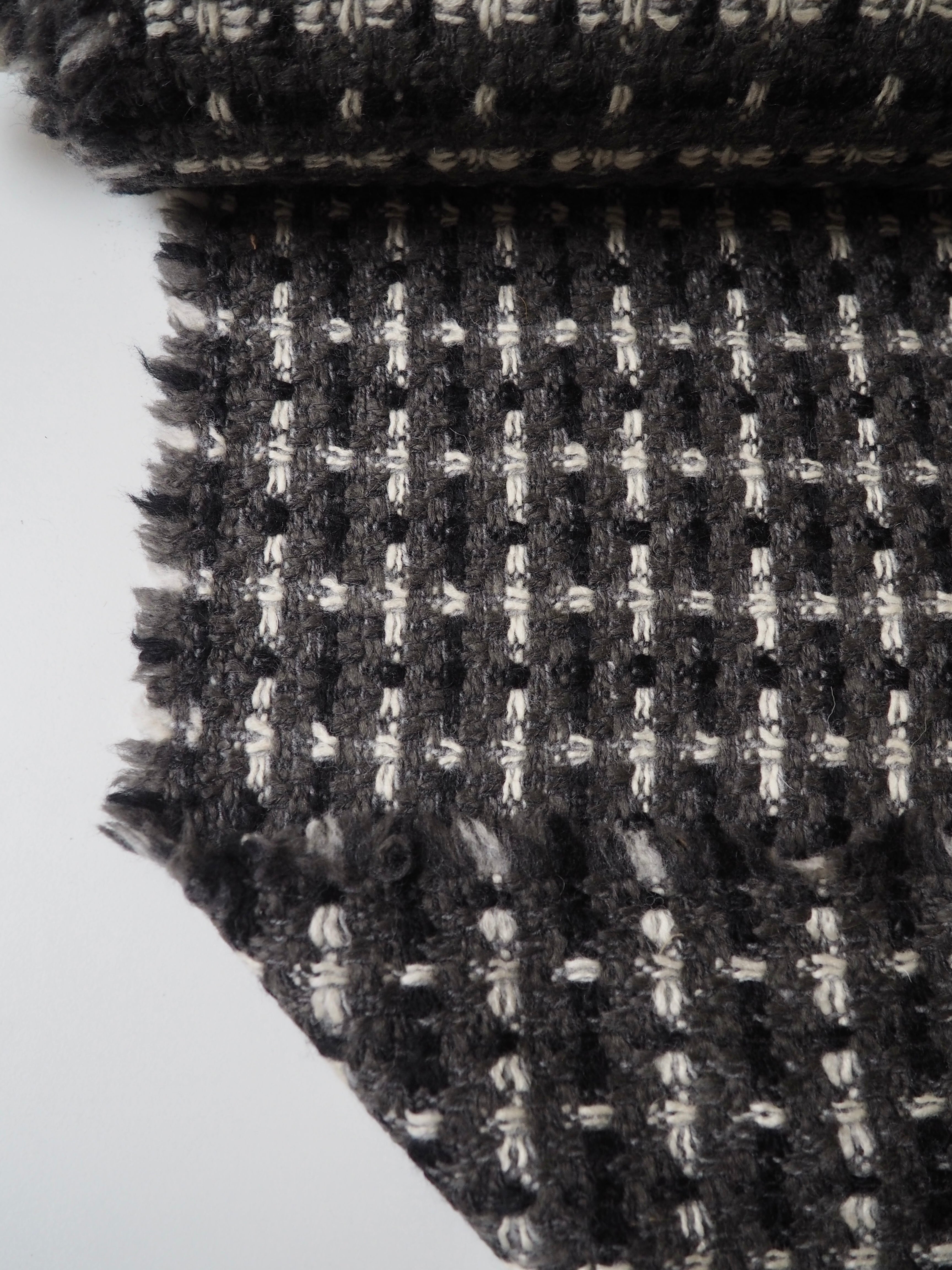 This ex-designer fabric is a tweed coating. It's a grey, white and black gridded weave. It's medium to heavy weight, with a denser weave. It has a thick, wool-y handle and sturdy texture. It's quite warm and has a gentle structure. Perfect for a coat, jacket, or even home wares!