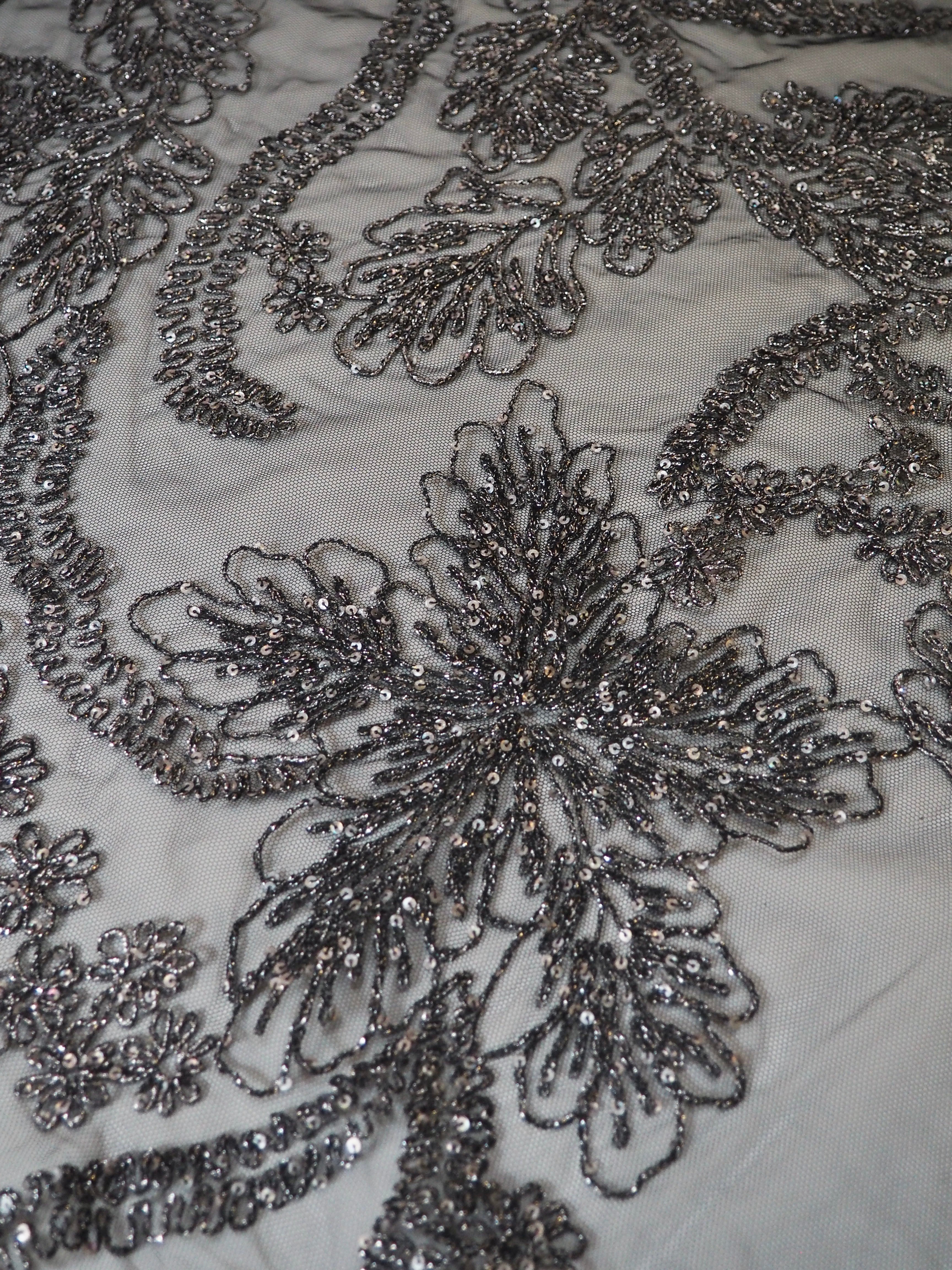 This ex-designer fabric is a gorgeous tulle. Gunmetal lurex and sequin trim is embroidered into vine and garland-like designs on this black tulle in medium coverage. Has a soft handle, lovely movement, and a gentle structure. Lightweight and semi-sheer. The cloth could be cut out and reapplied, or be used as is for lingerie, evening wear, or an exquisite dress or top!