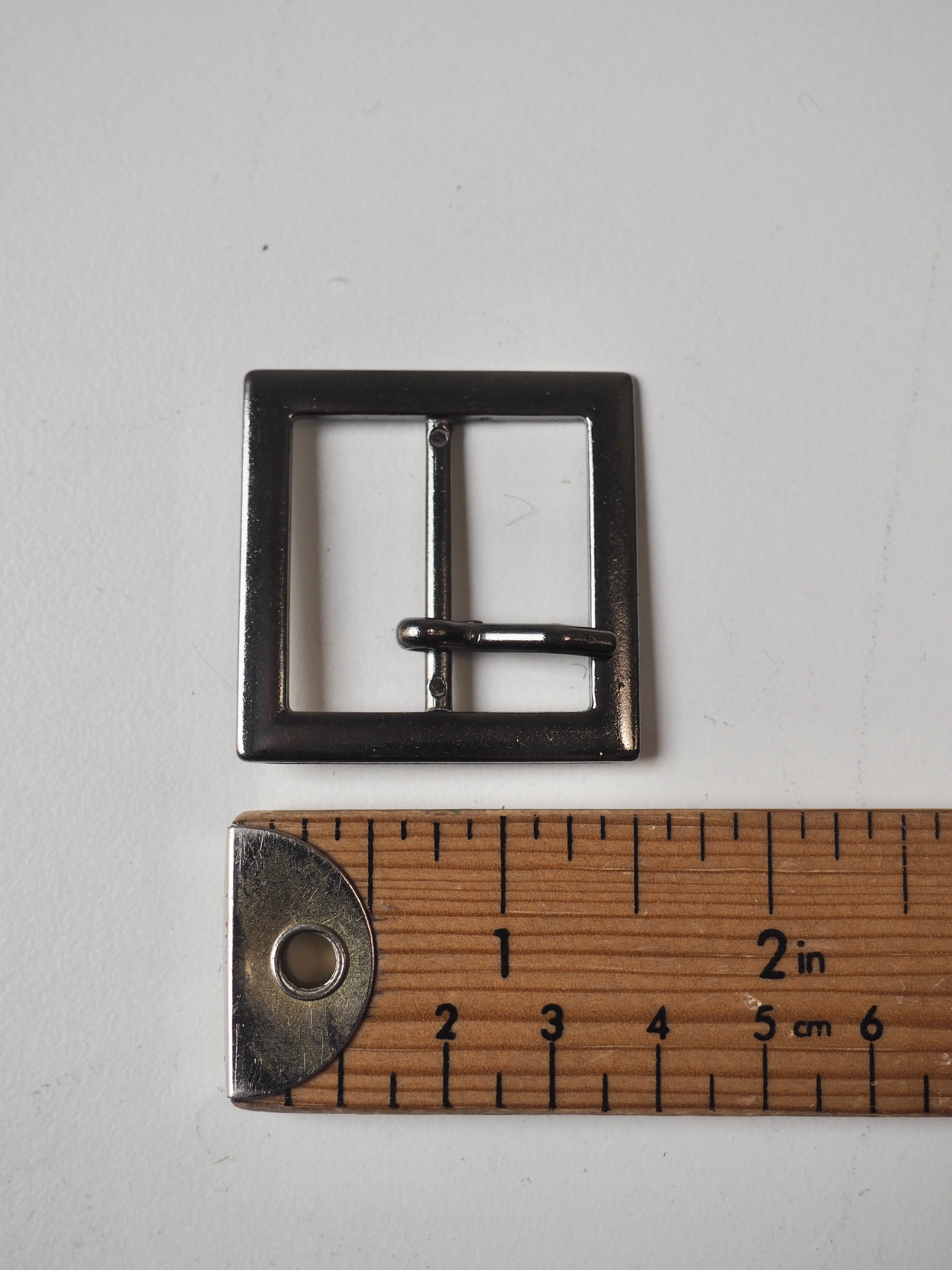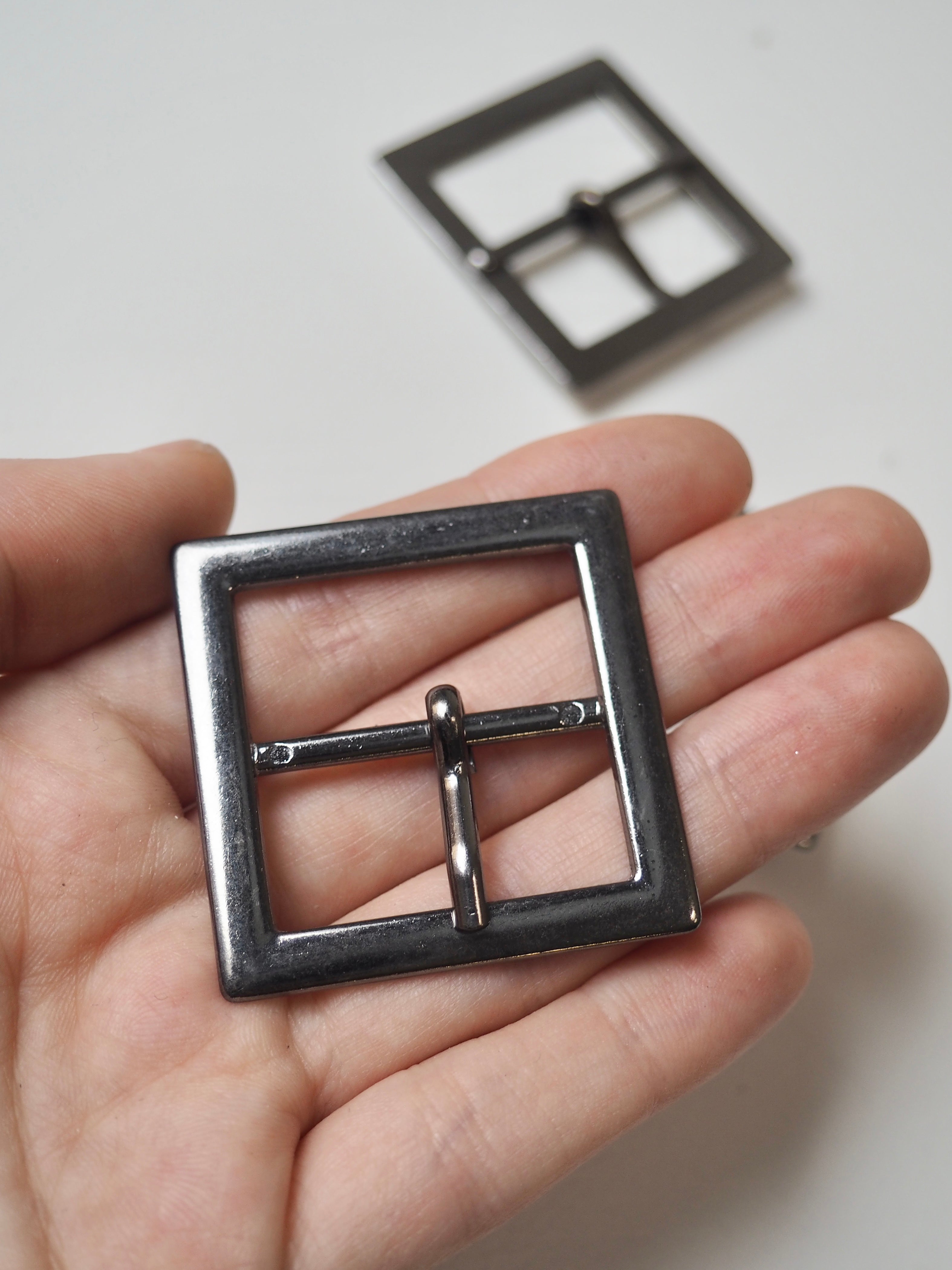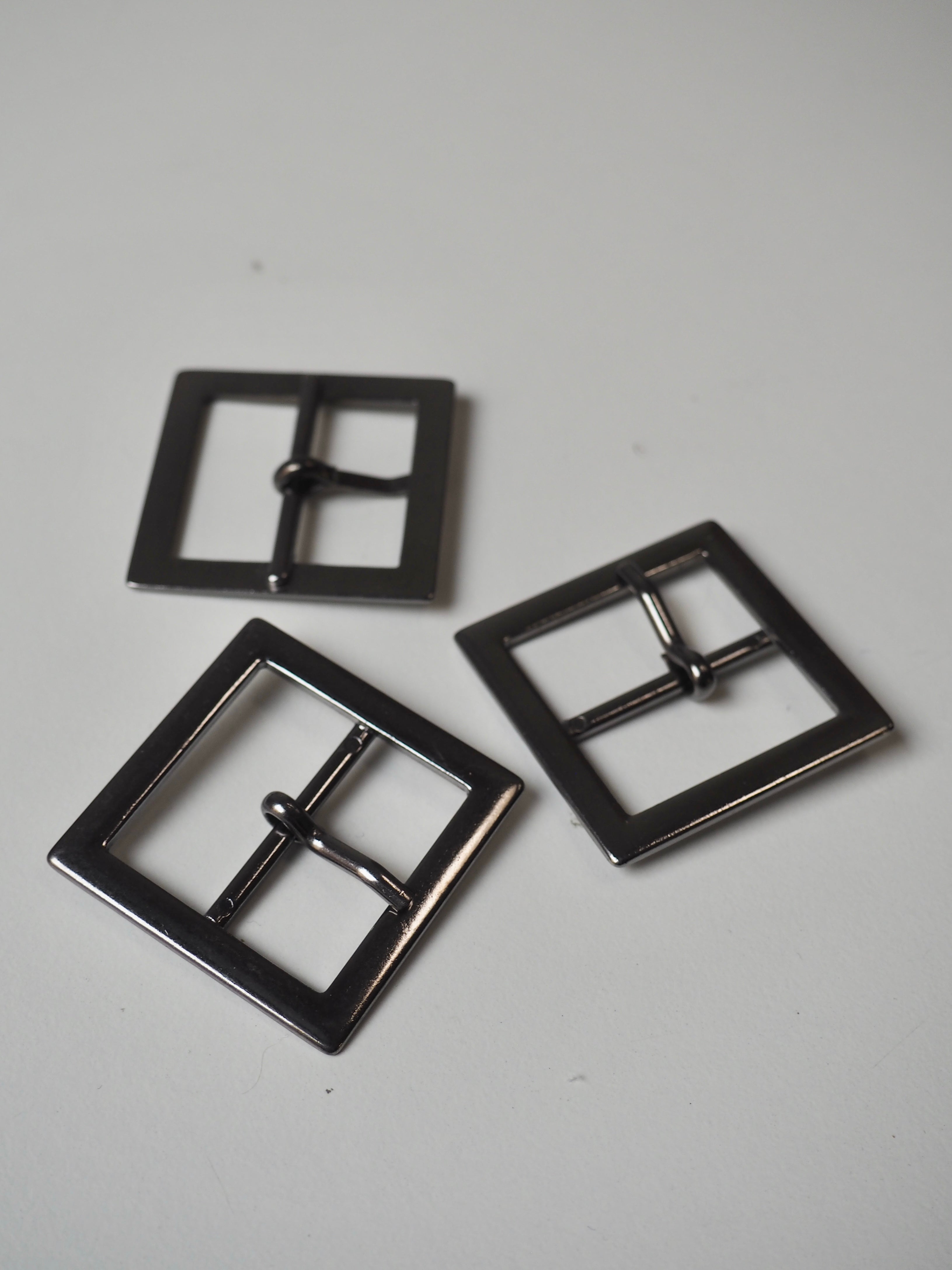 This ex-designer hardware is a buckle. They are perfect for adding to garments or accessories. They have a sliding prong on the central bar and are medium weight and have a slightly shiny finish.
