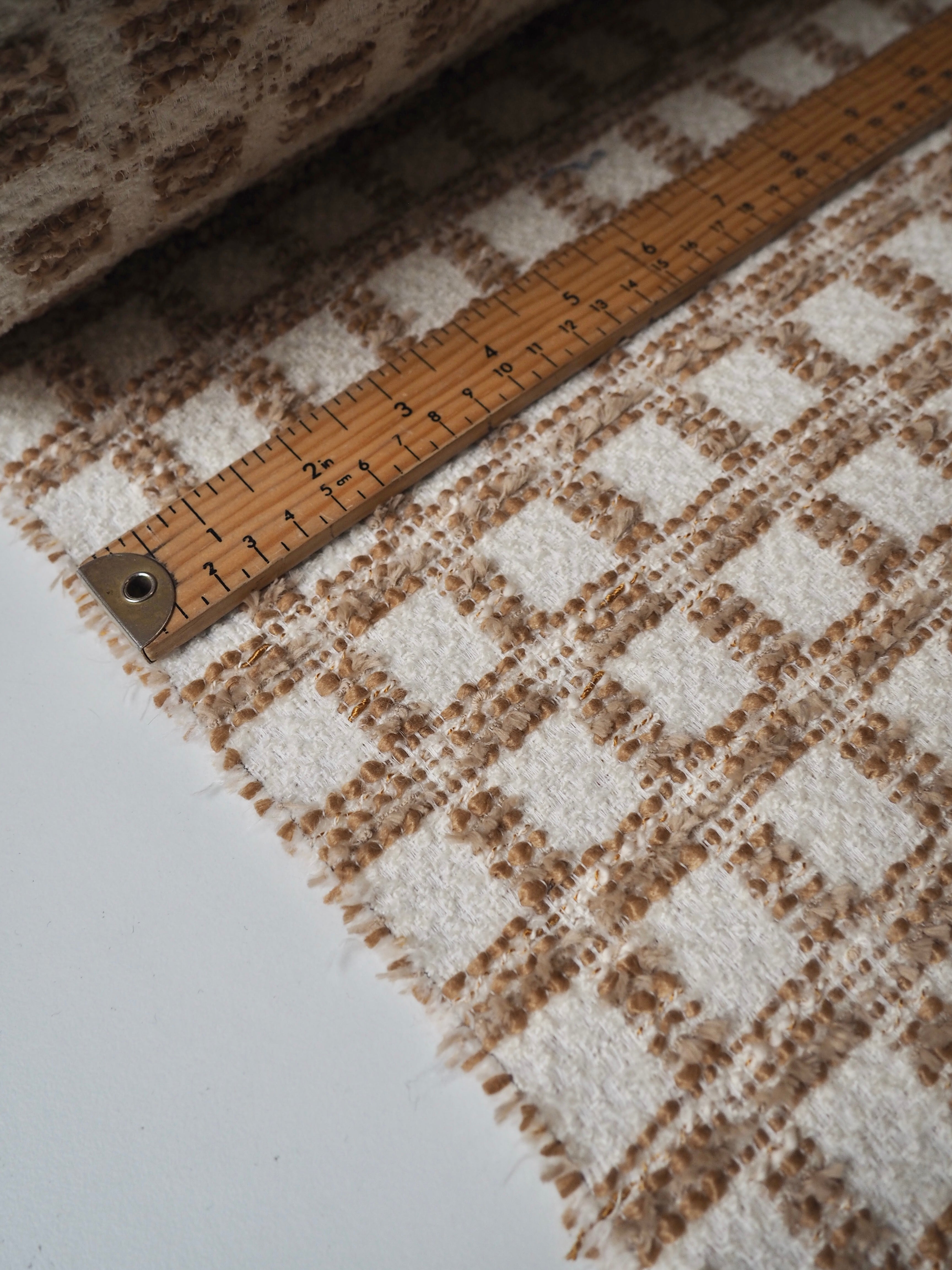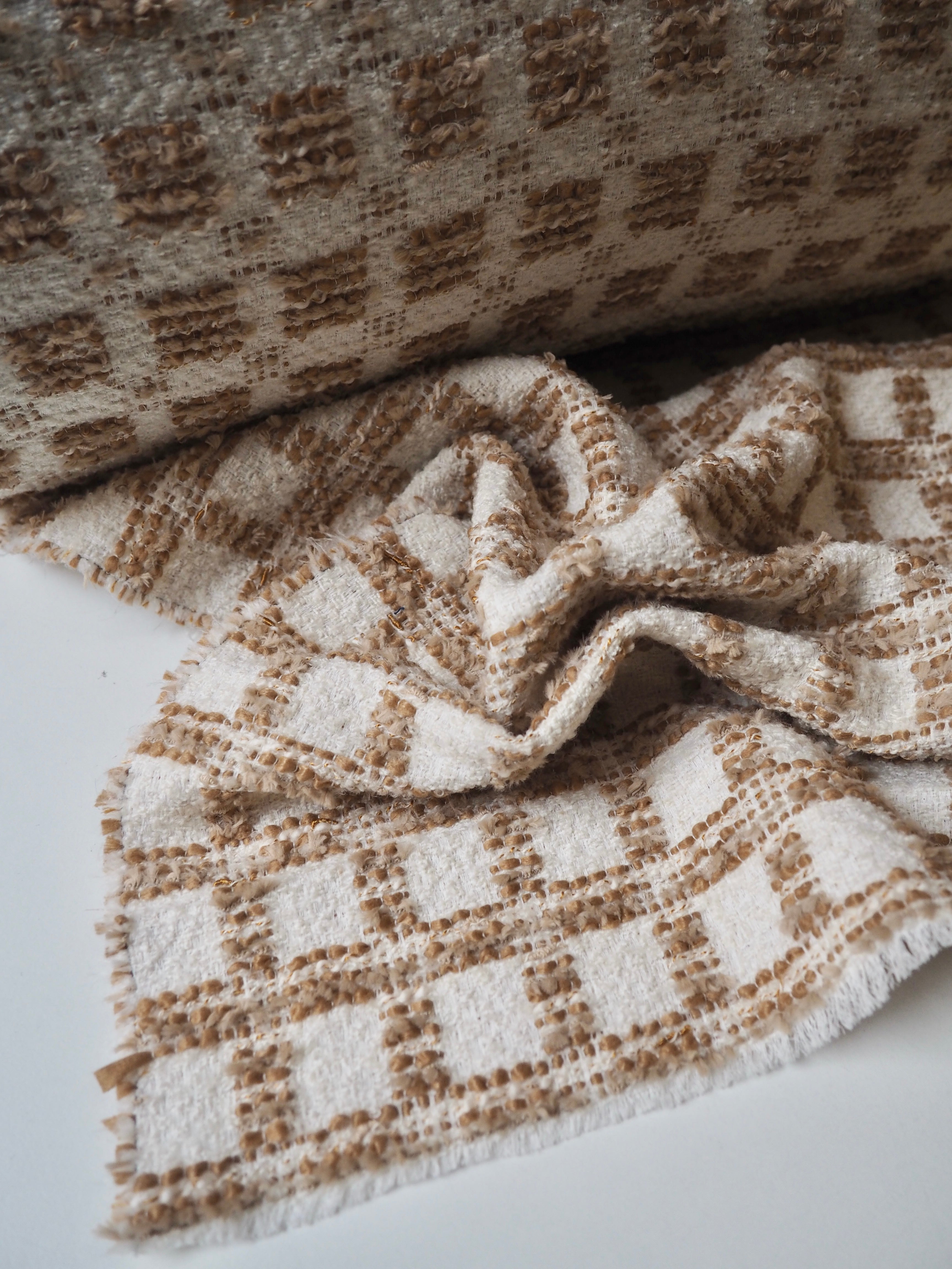 This ex-designer fabric is a bouclé coating. It's an ivory and brown check, with a soft handle and quite plush texture. It's lighter weight for a coating, and has a great texture. It's quite warm and has a soft drape. Perfect for a coat, jacket, or cushions!