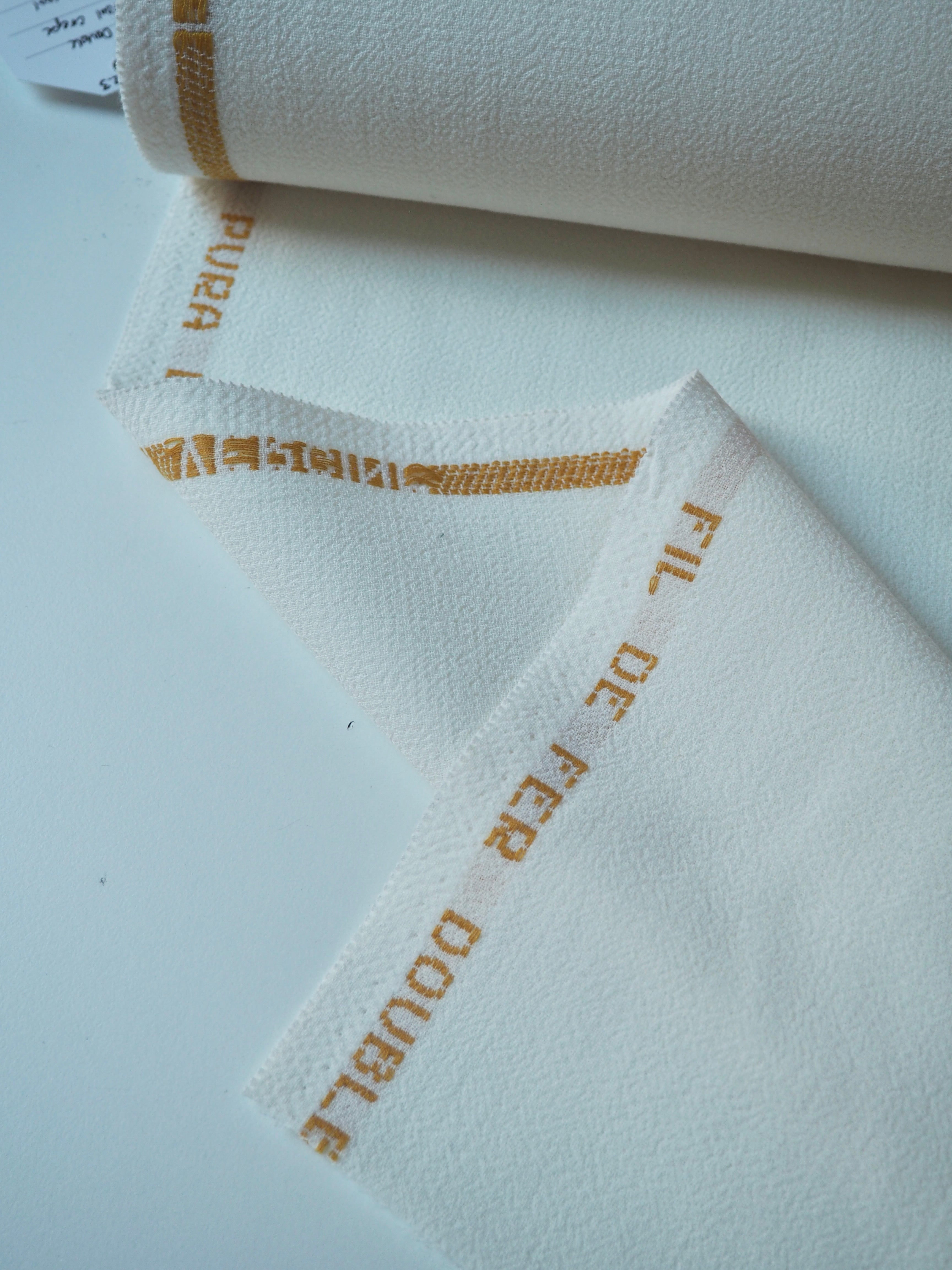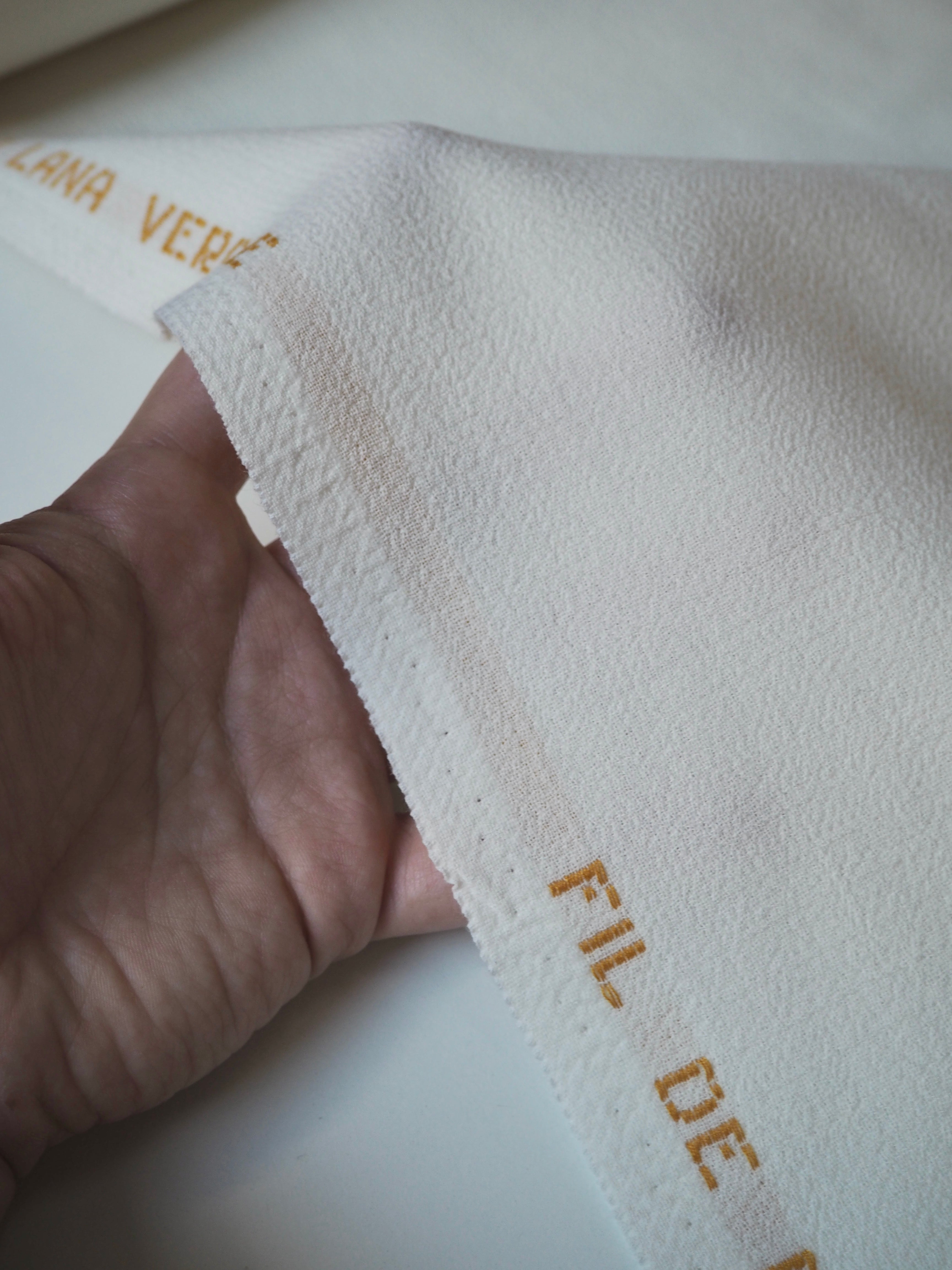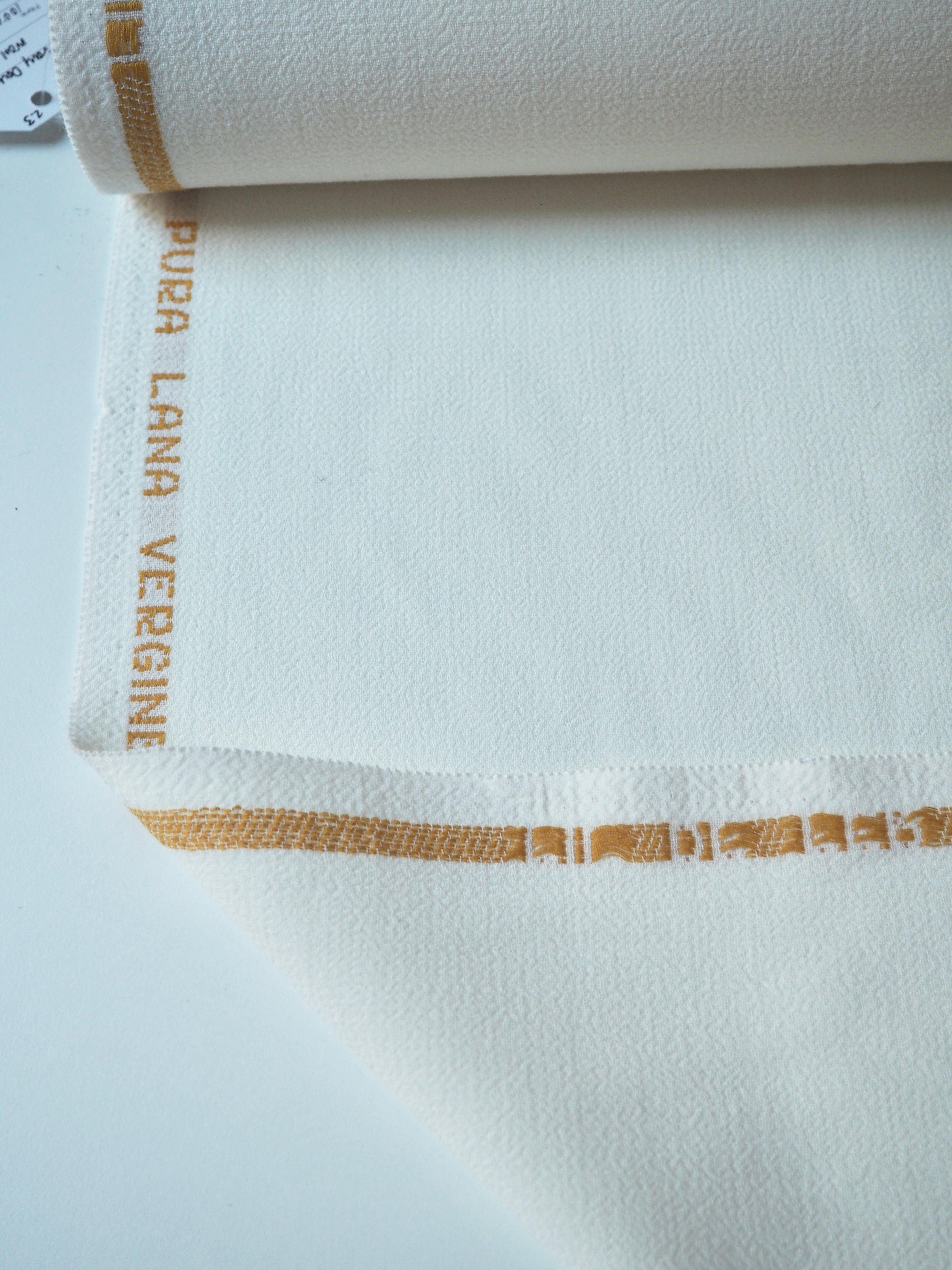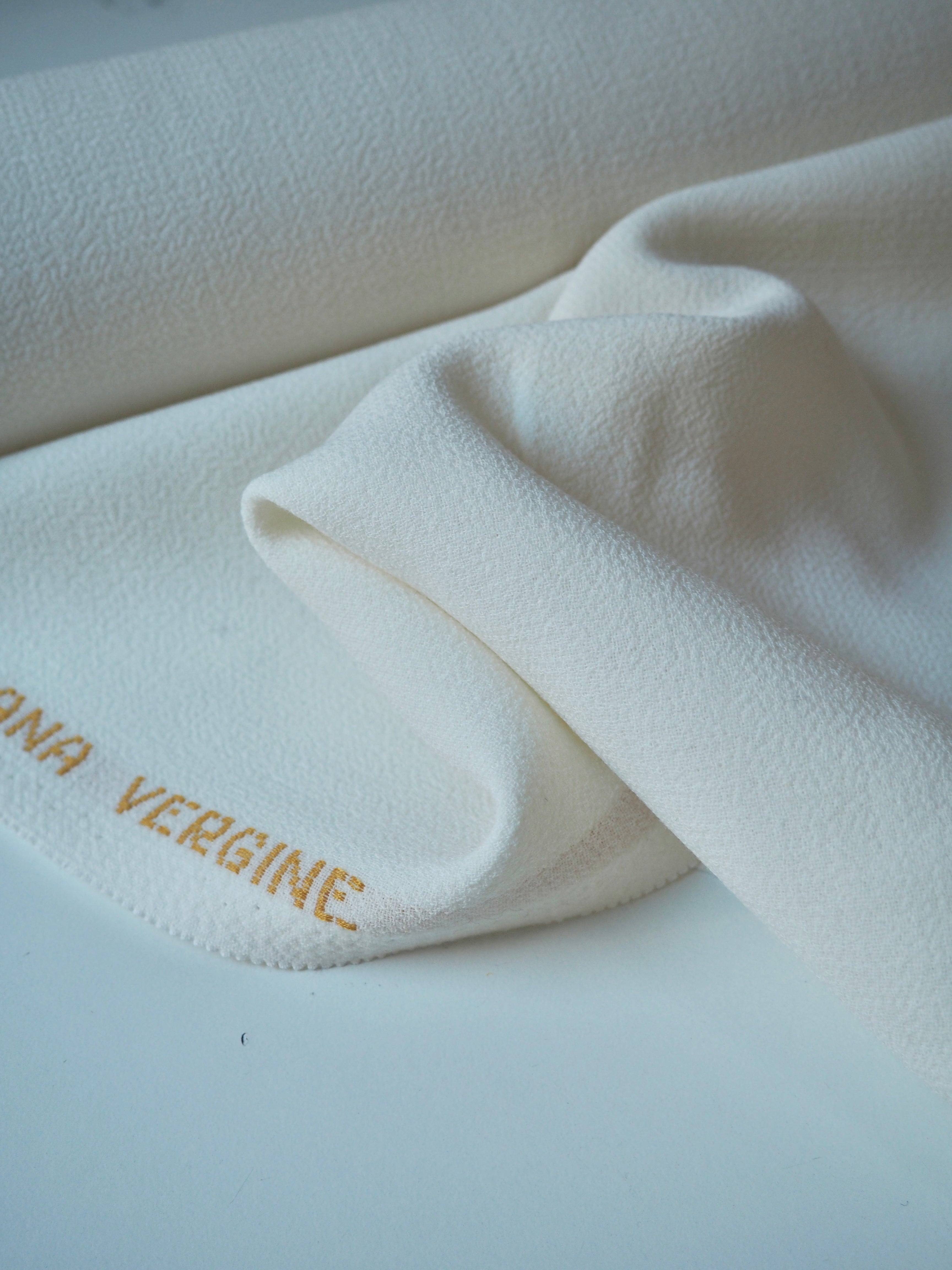 This ex-designer fabric is a wool crepe. It's a double-faced cloth with a sturdy but comfortable weave. It's made of pure wool and feels and looks so luxurious! It has a soft structure and really lovely soft, plush crepe handle. Medium weight, and perfect for tailoring projects. Flexible and has a wonderful drape that makes it so easy to work with! The perfect cloth for a lifetime blazer for all seasons, and wide leg trousers, or would make an incredible bridal look!