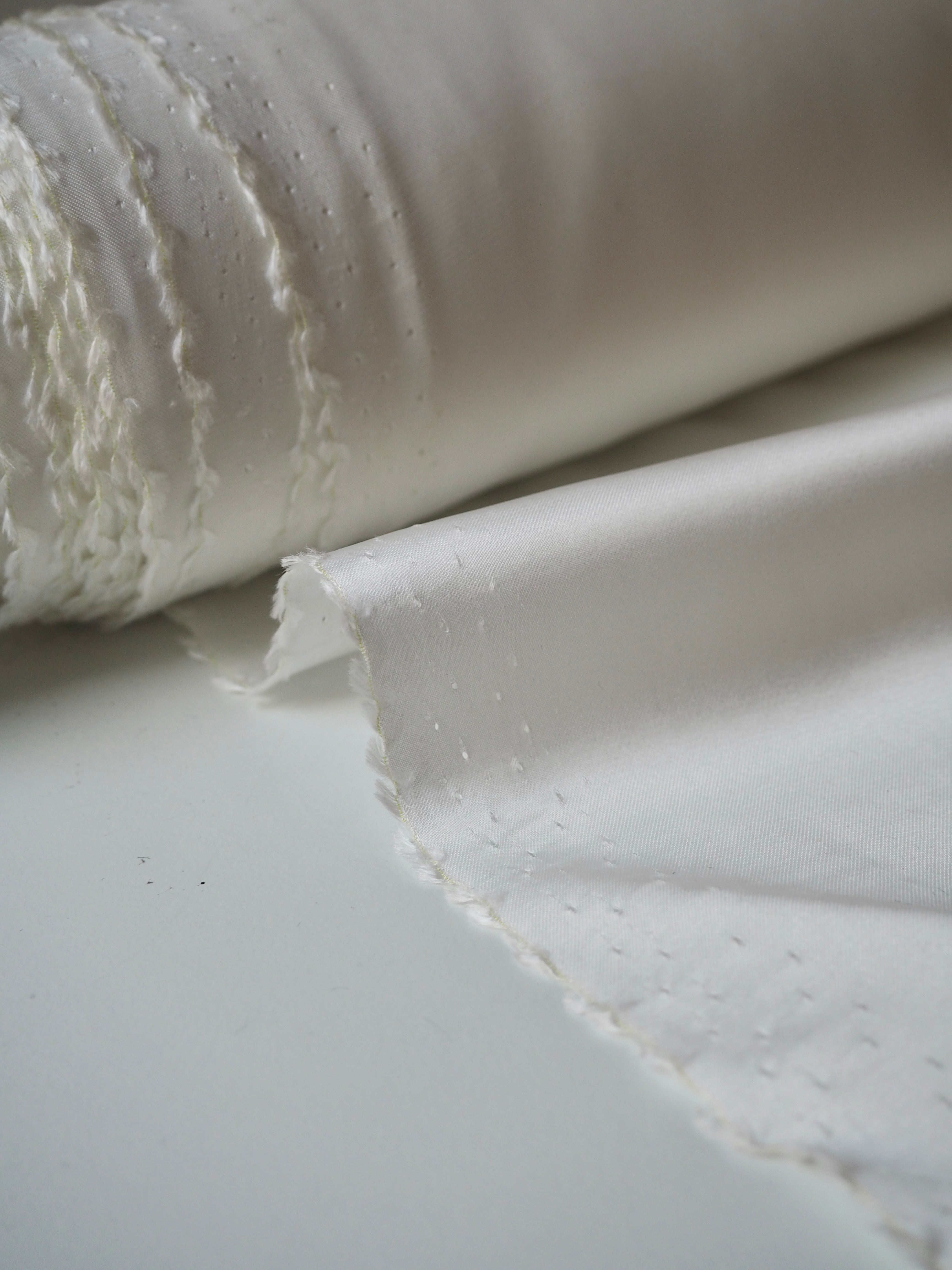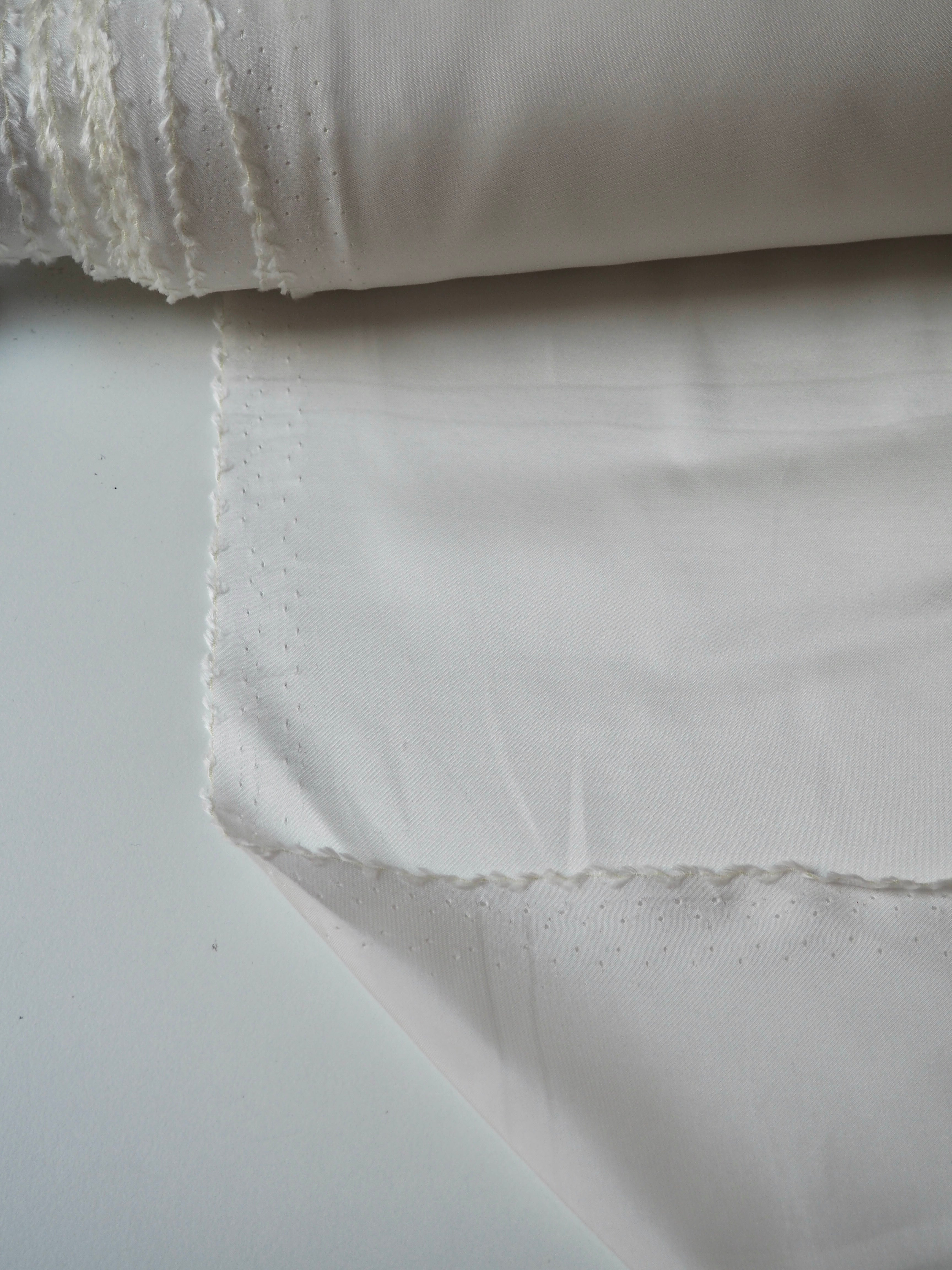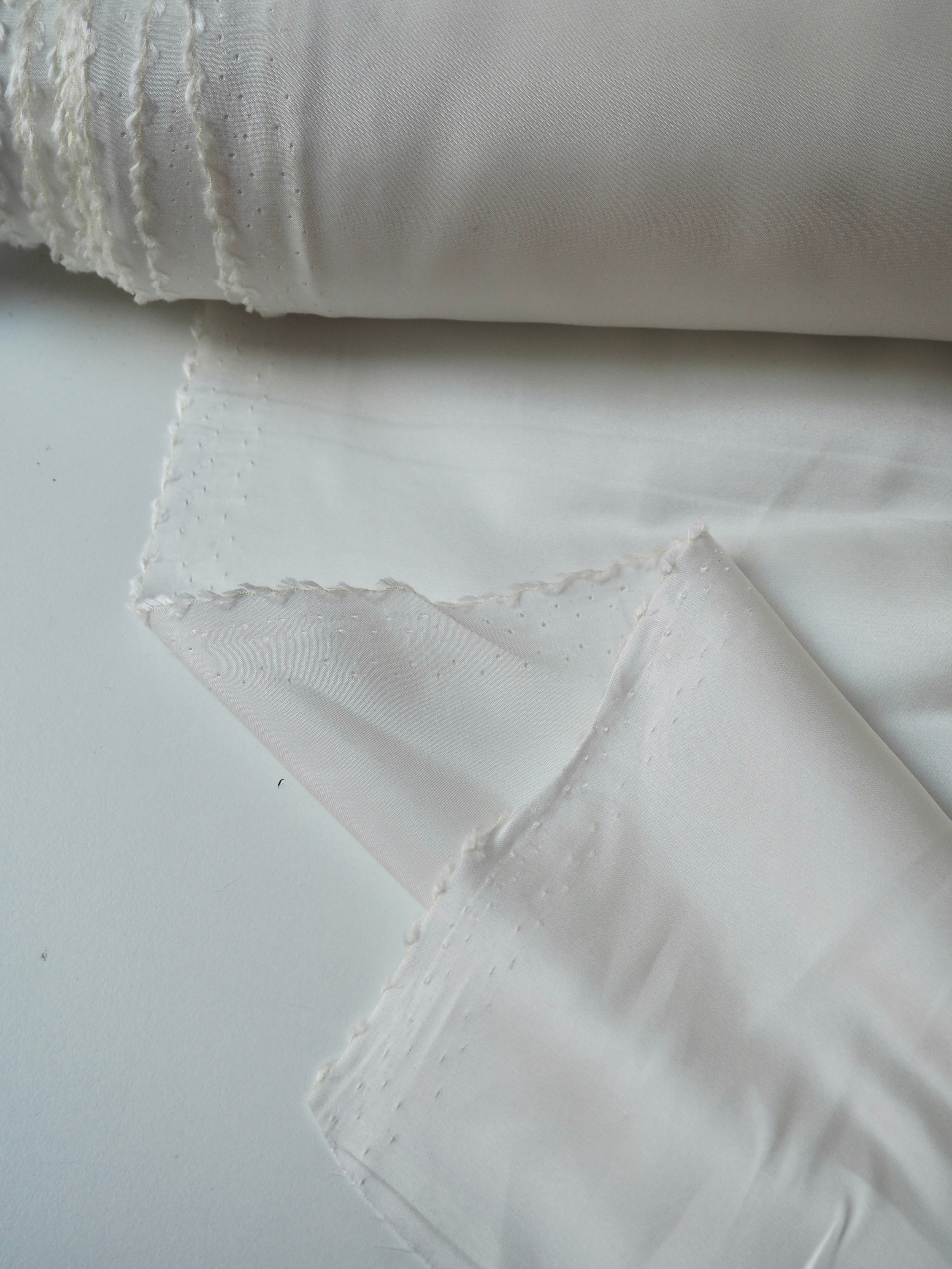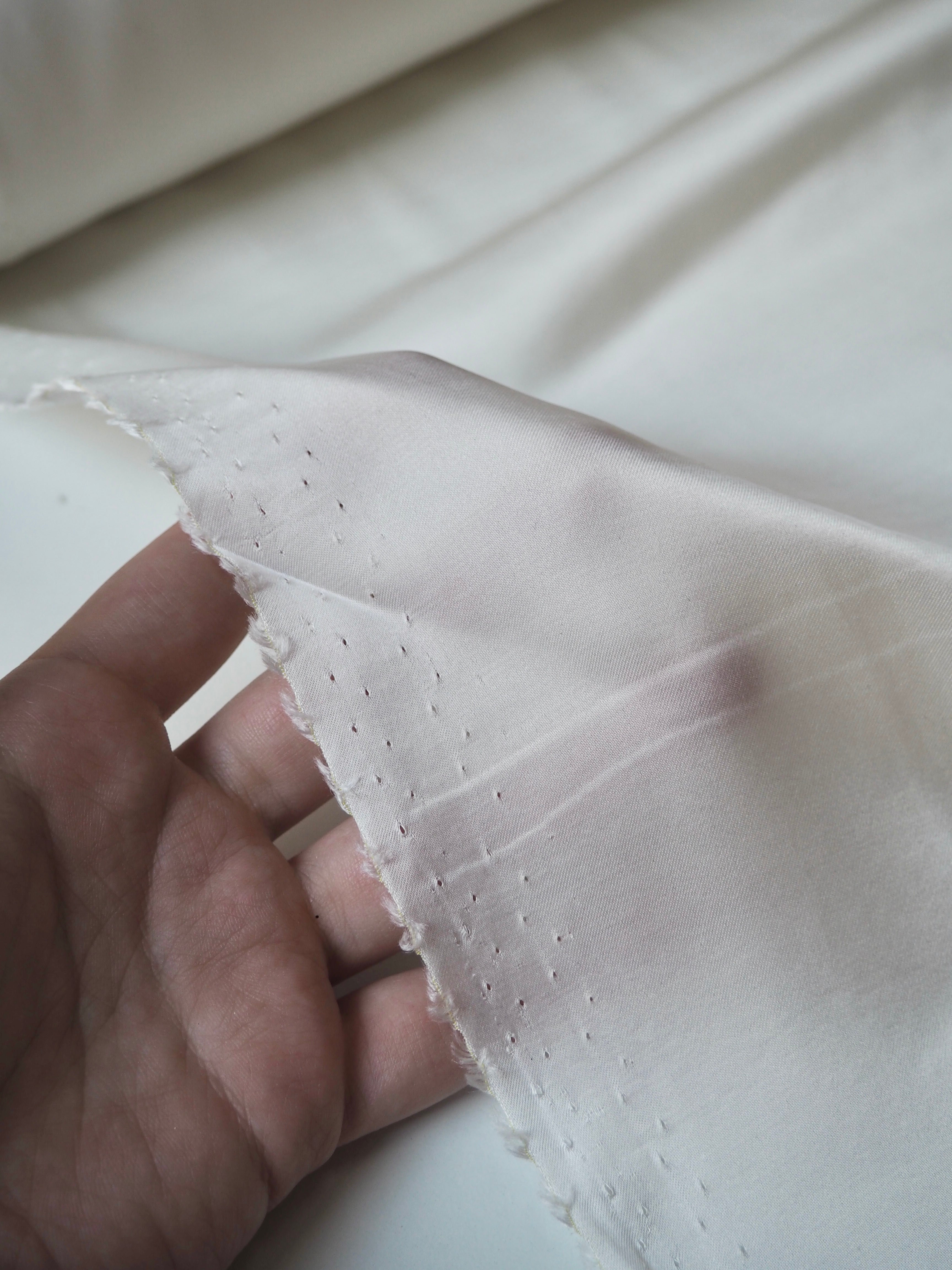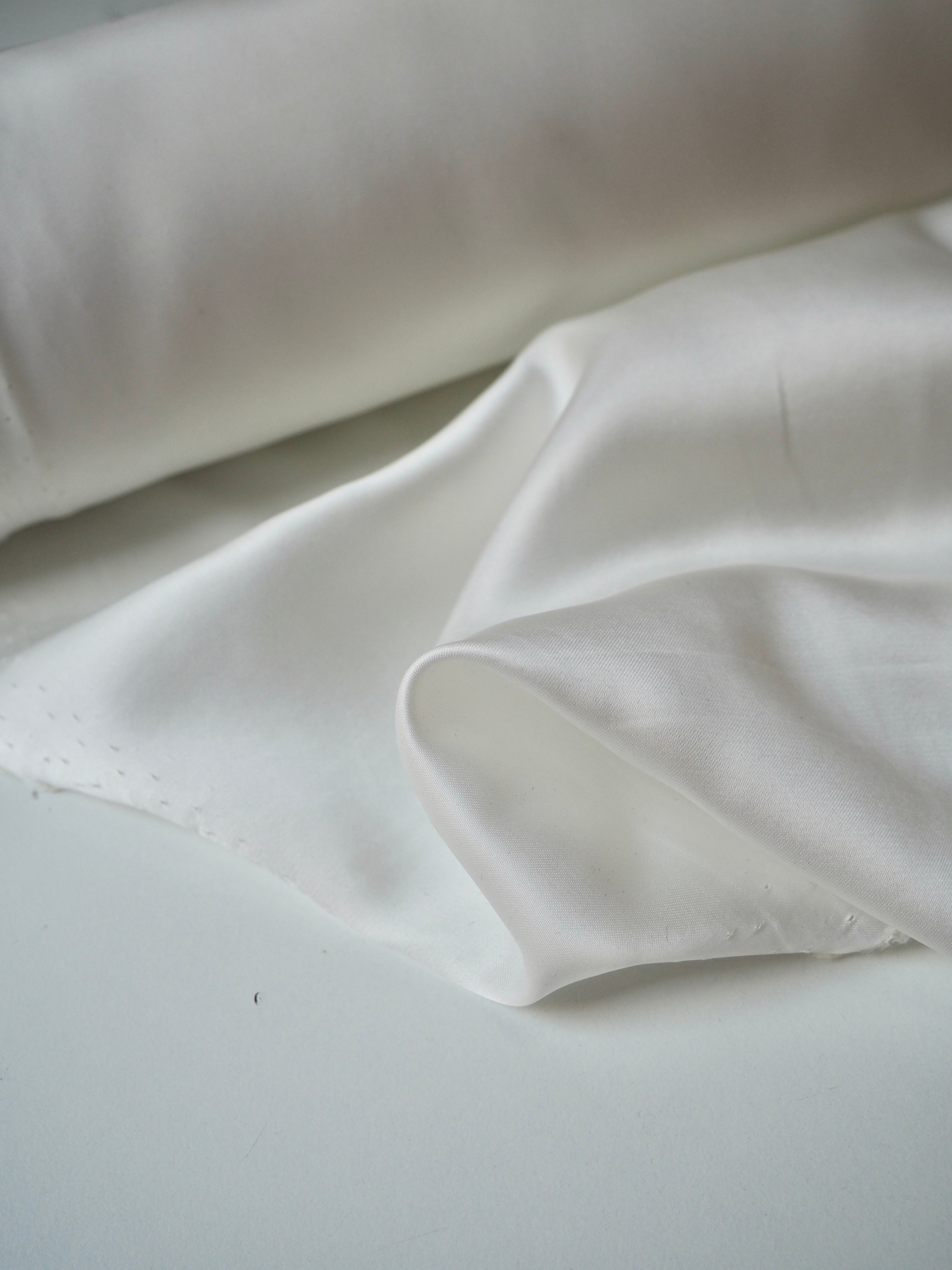 This ex-designer fabric is a satin. It's in a whiter ivory shade, with a lighter weight. It has a very smooth handle, slinky feel, and great movement and drape. Has a lovely satin sheen on the topside, with a smooth reverse. Has a lovely handle, and is mostly opaque. Perfect for tops or for bridal!