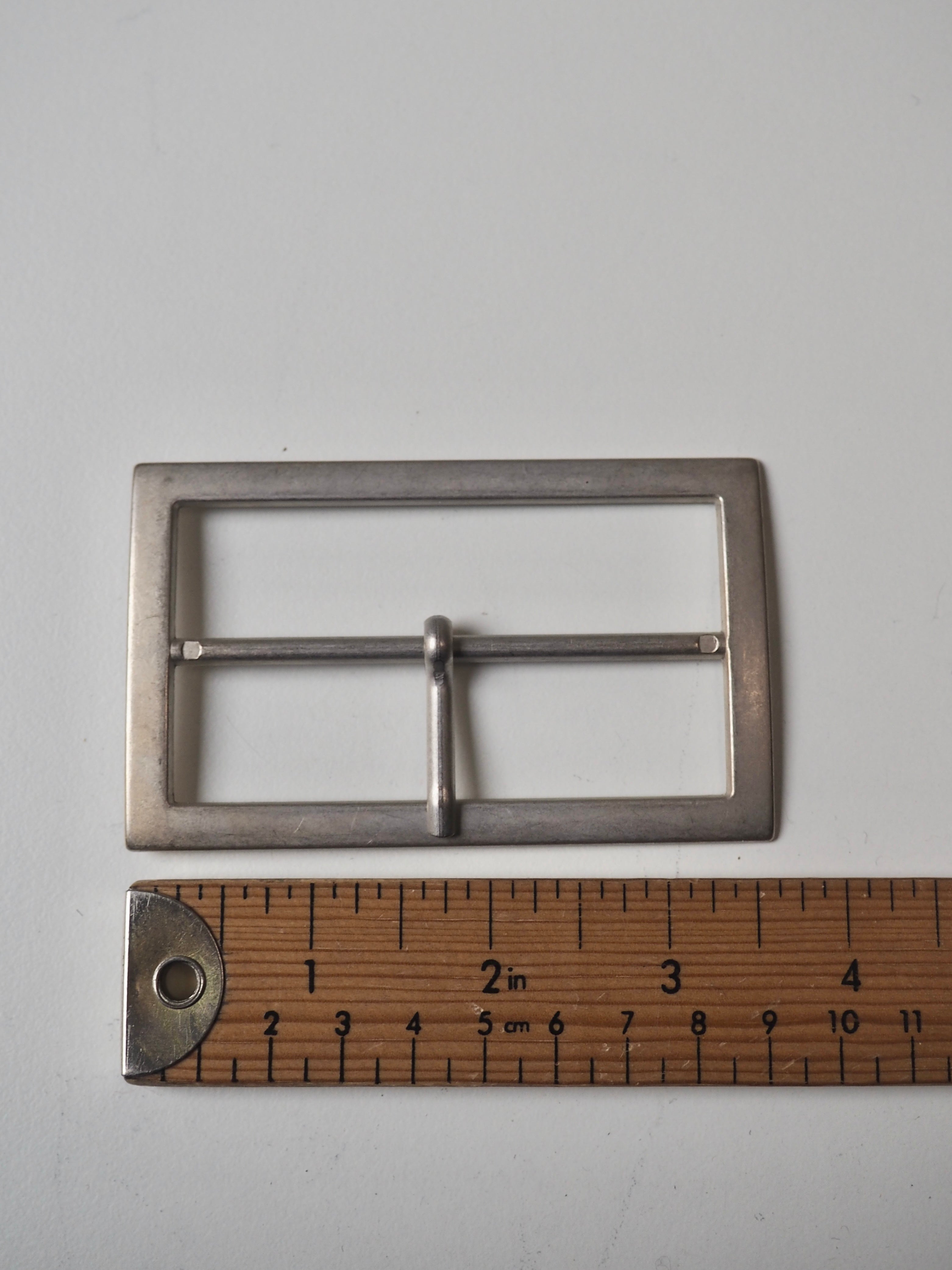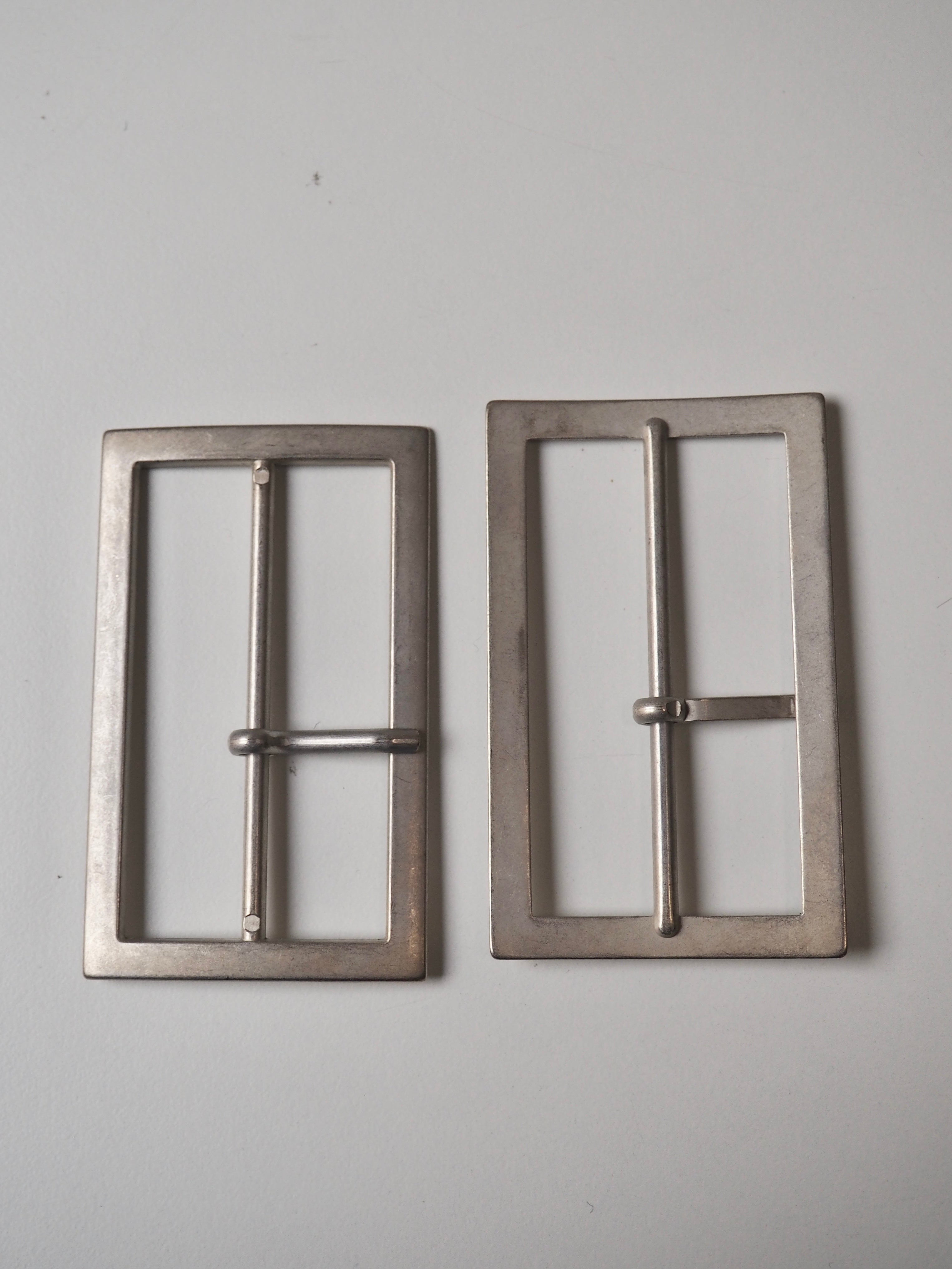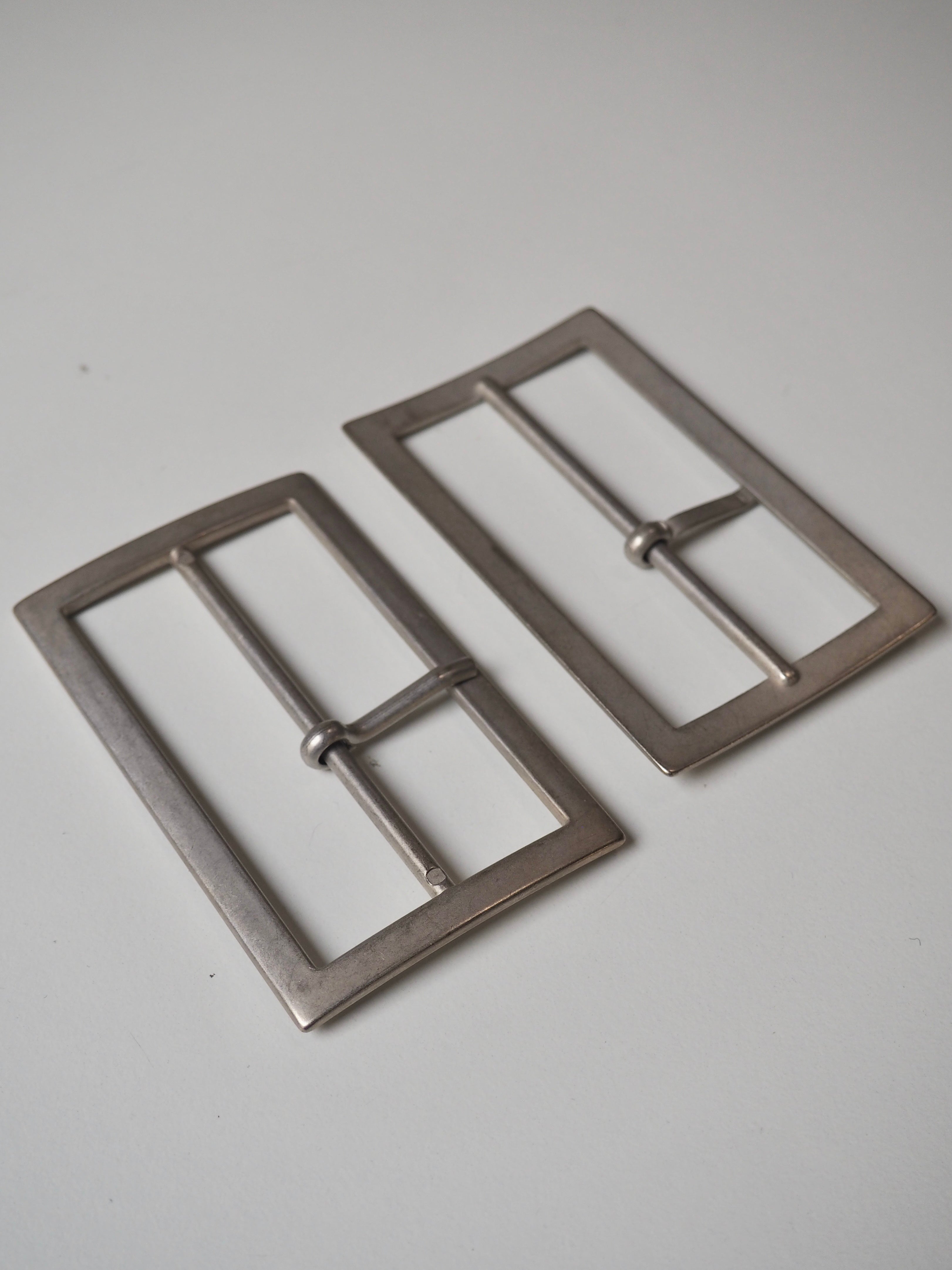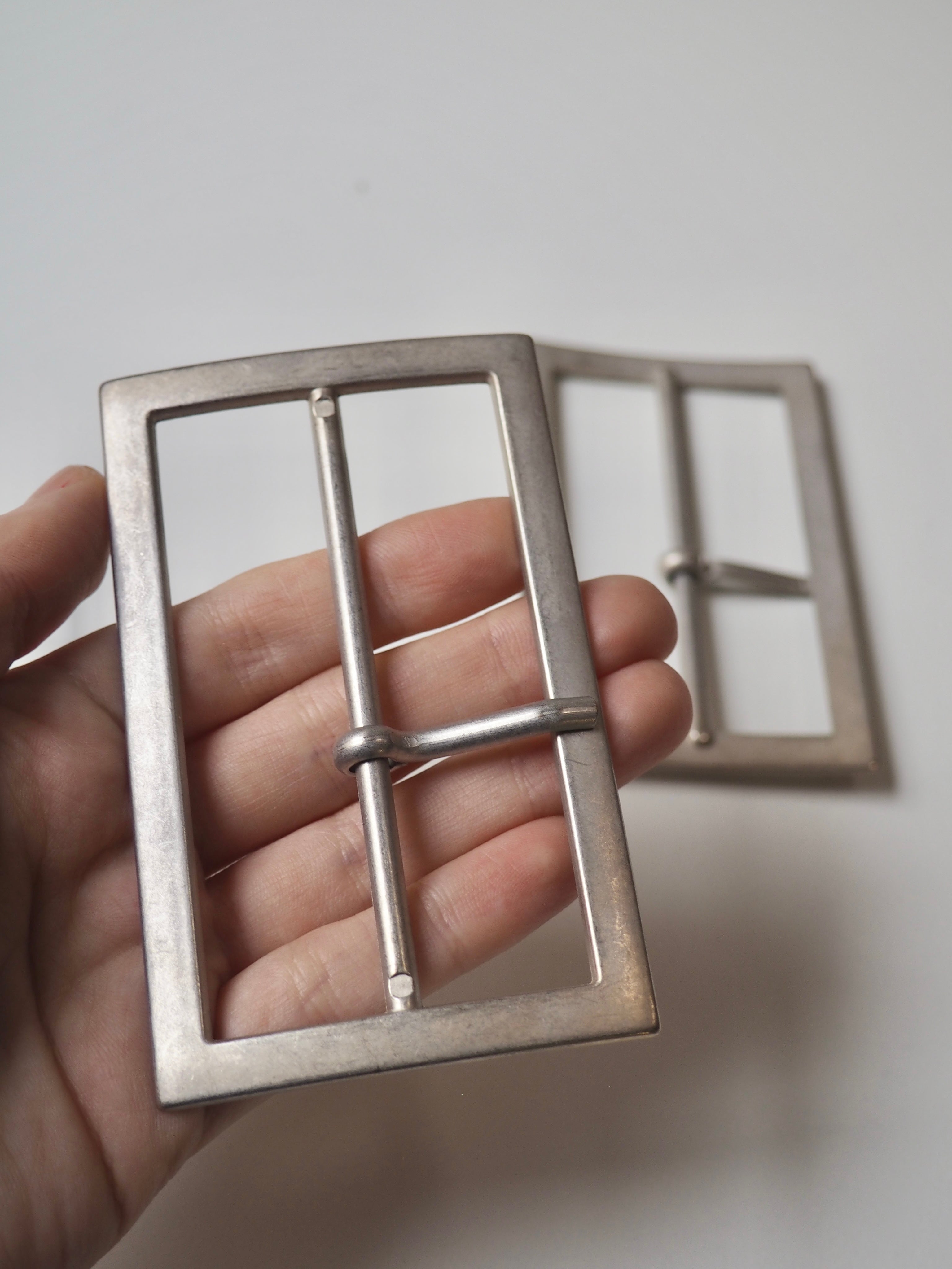 This ex-designer hardware is a buckle. These silver buckles are perfect for adding to garments or accessories. They have a slightly shiny antique like finish, with a sliding arm.