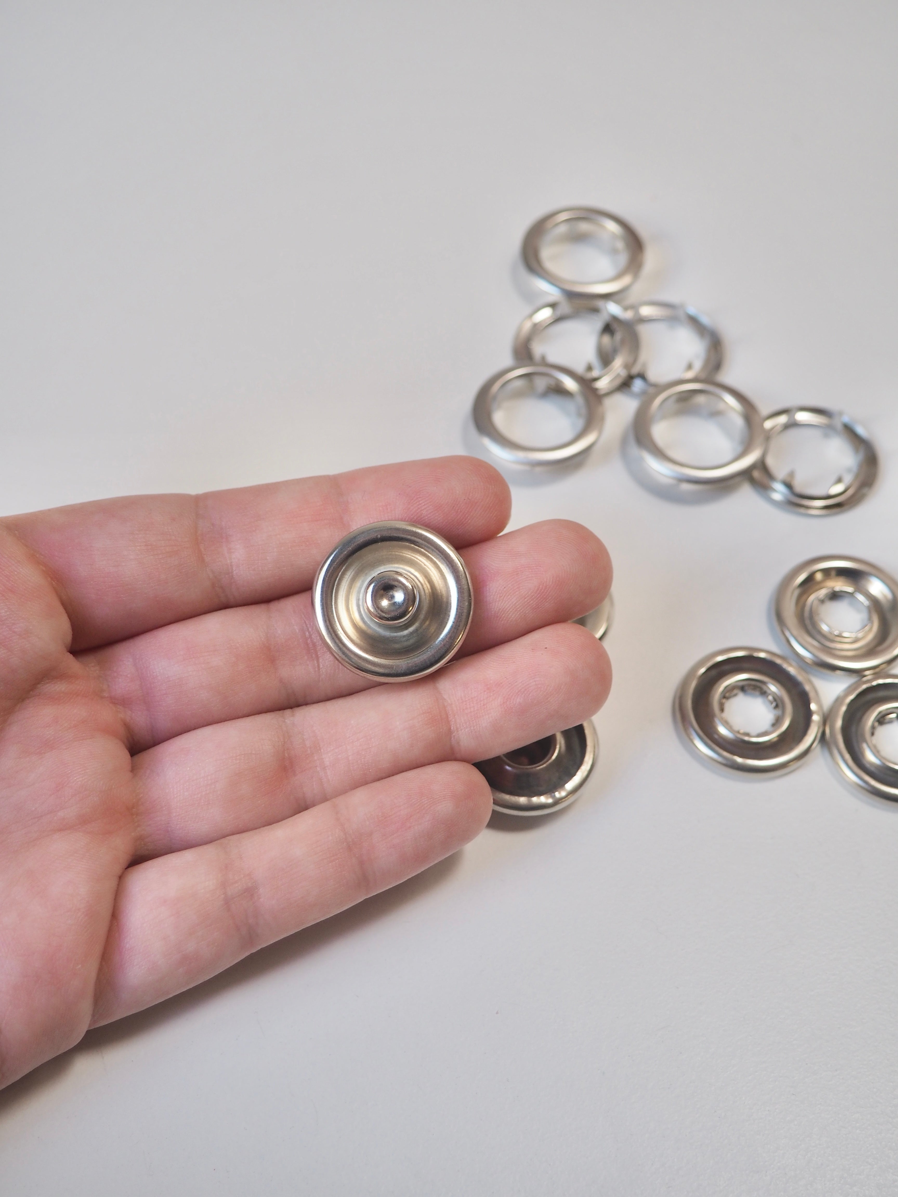 This ex-designer hardware is a press stud set. These press studs, also known as poppers or snaps, are all silver. They usually require die set/machine for the right size, but these kind with prongs can usually be attached with a hammer and the right precision. Ideal for coats and jackets but could also be used in bag making!