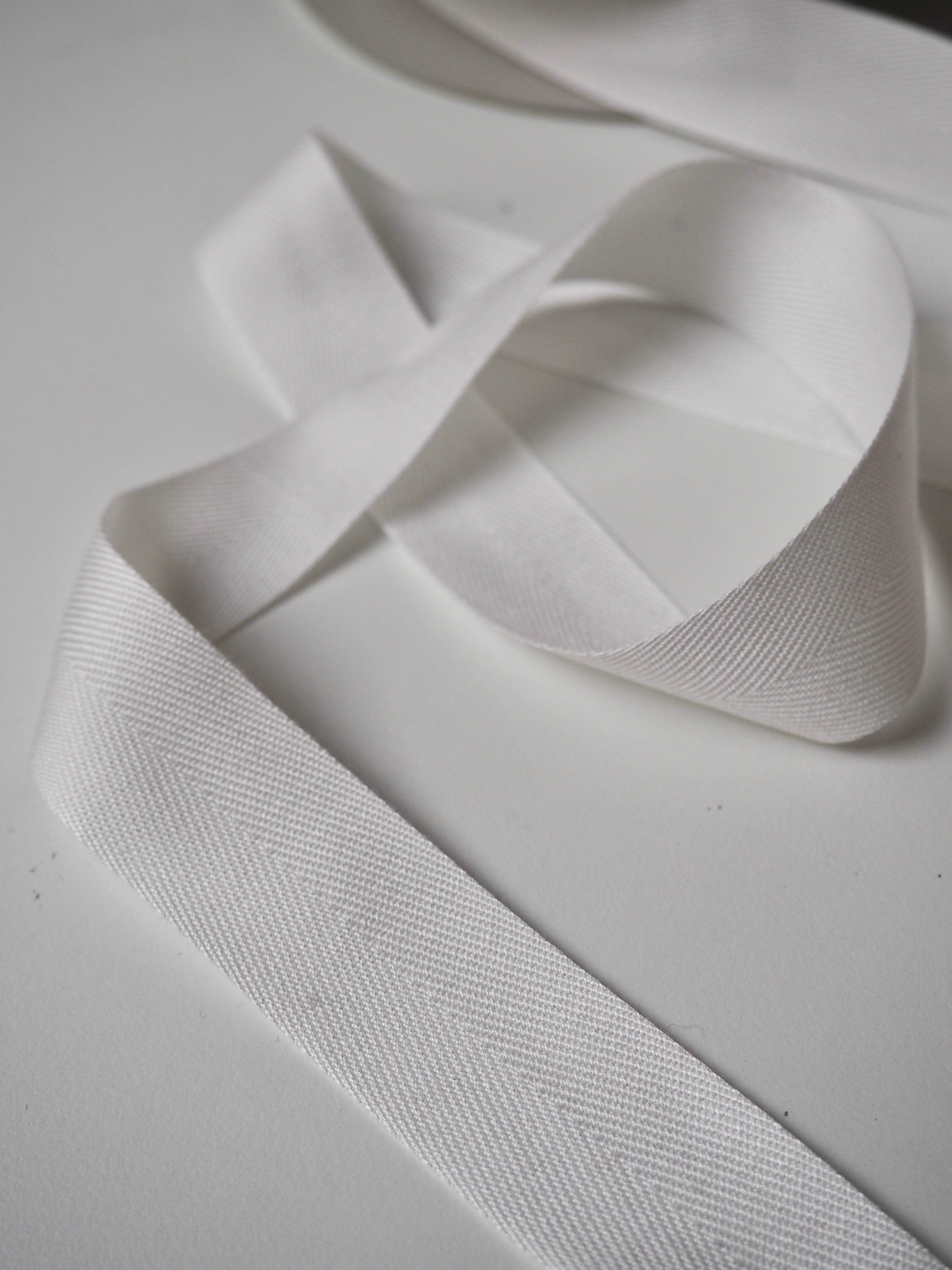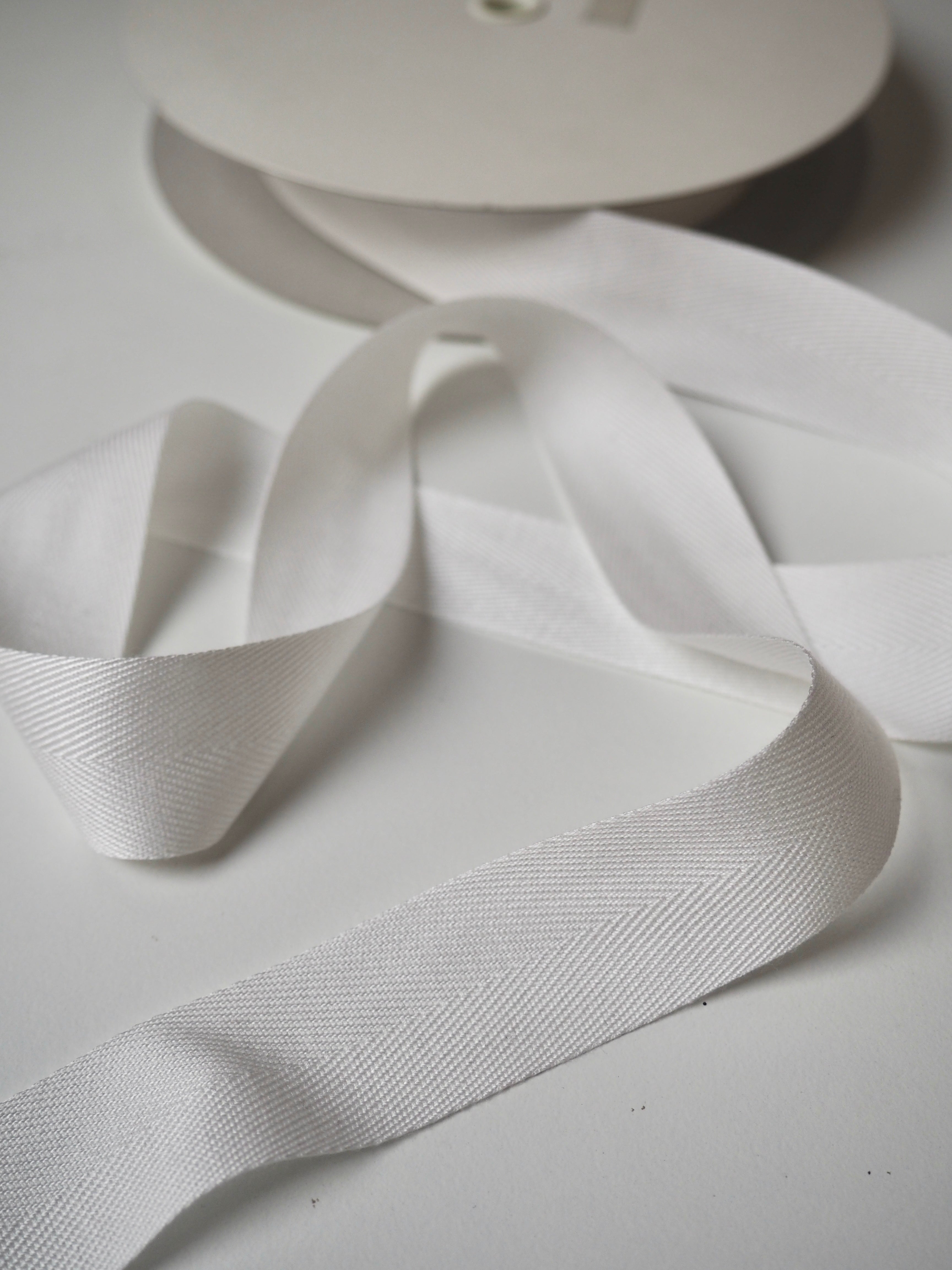 This ex-designer trim is a herringbone tape. It has a herringbone weave and is quite sturdy. Soft and lovely texture with a sateen finish. Great for ties, drawstrings, and finishing off projects!