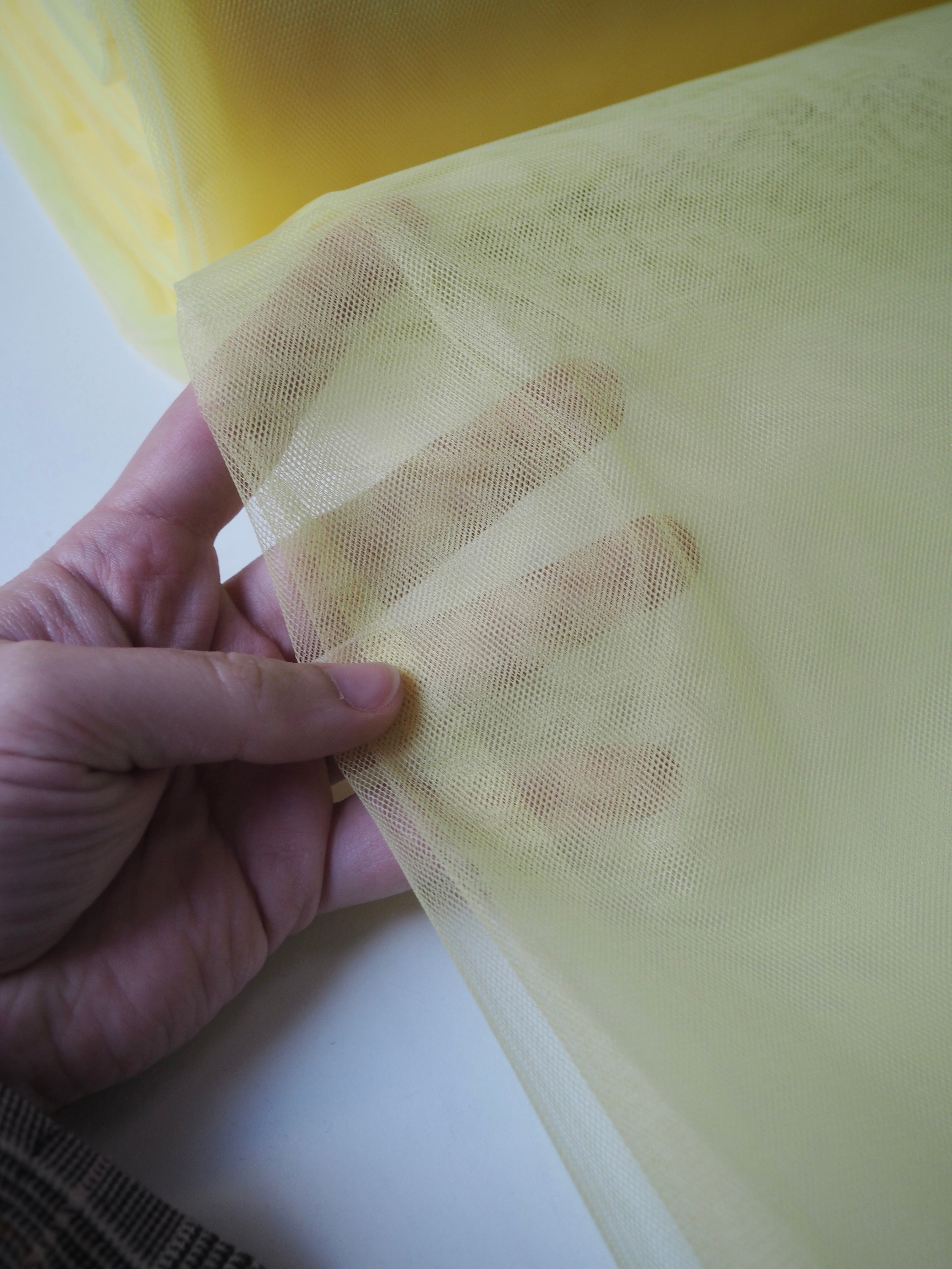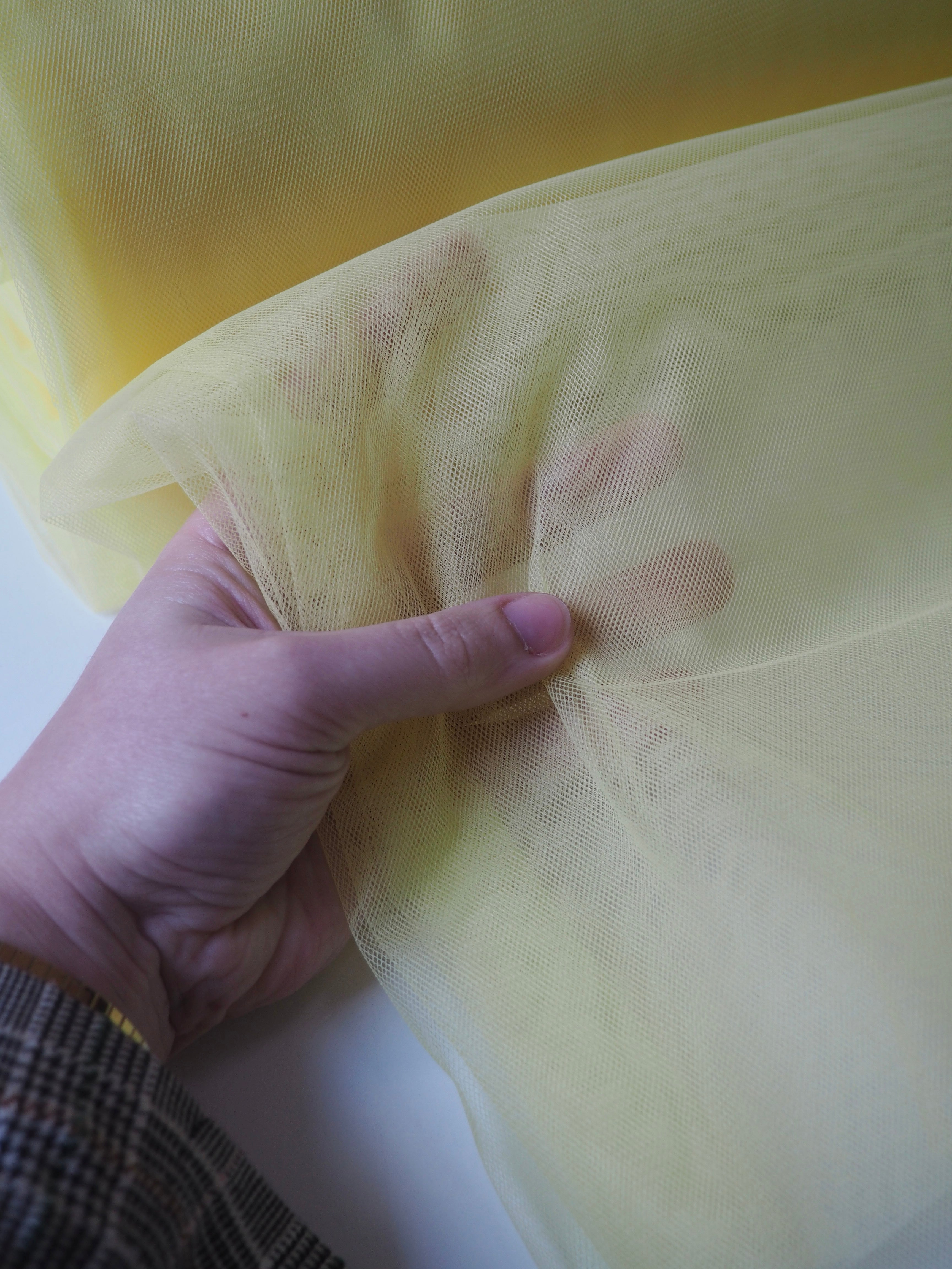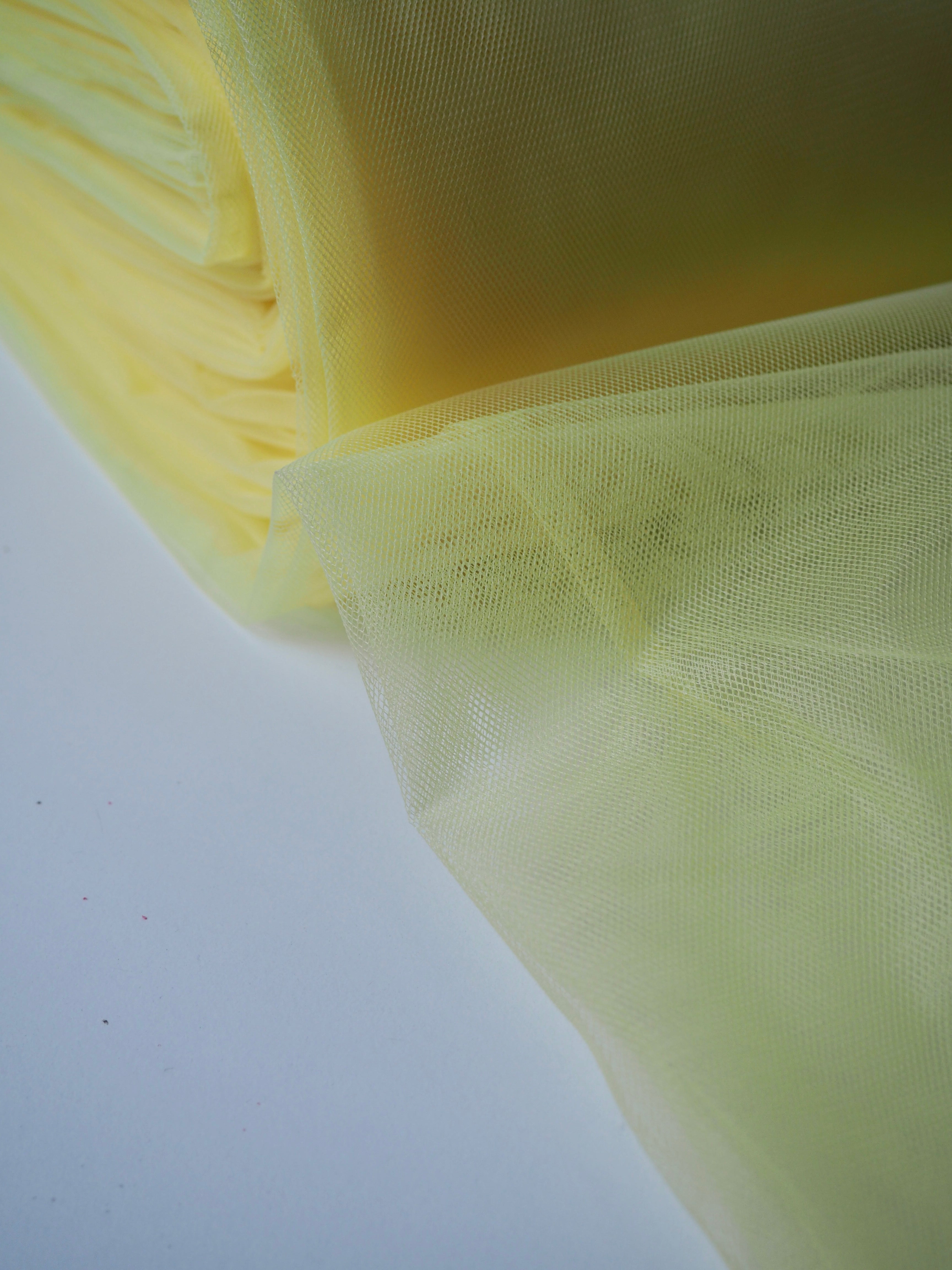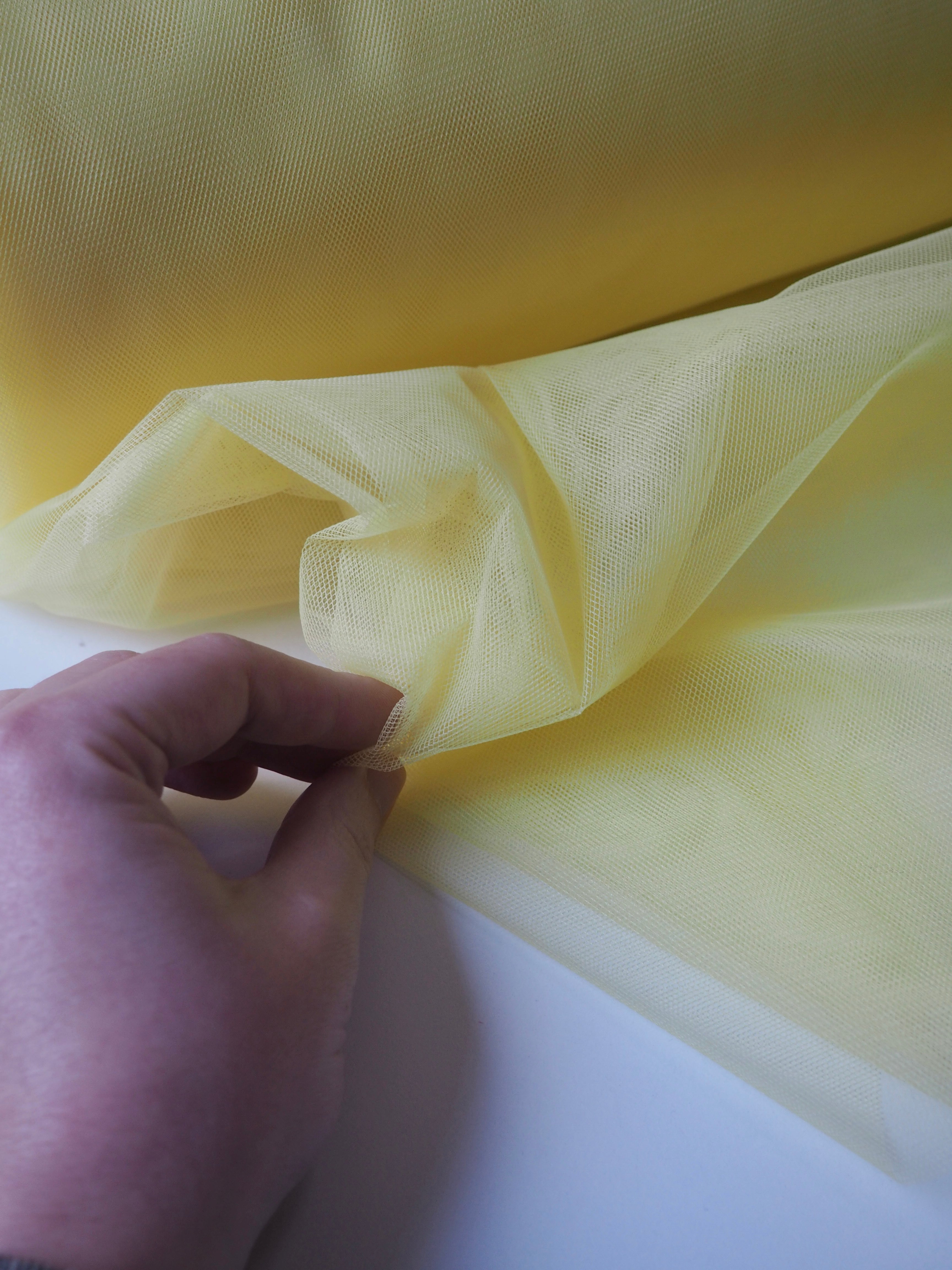 This ex-designer fabric is an extra wide tulle. It has a medium rigidity, with a dense but soft, structured handle. Woven from a network of tiny interconnecting hexagons which gives it the characteristic net like appearance. Lightweight with a crisp drape. Perfect for underskirts, crafting, and technical projects!