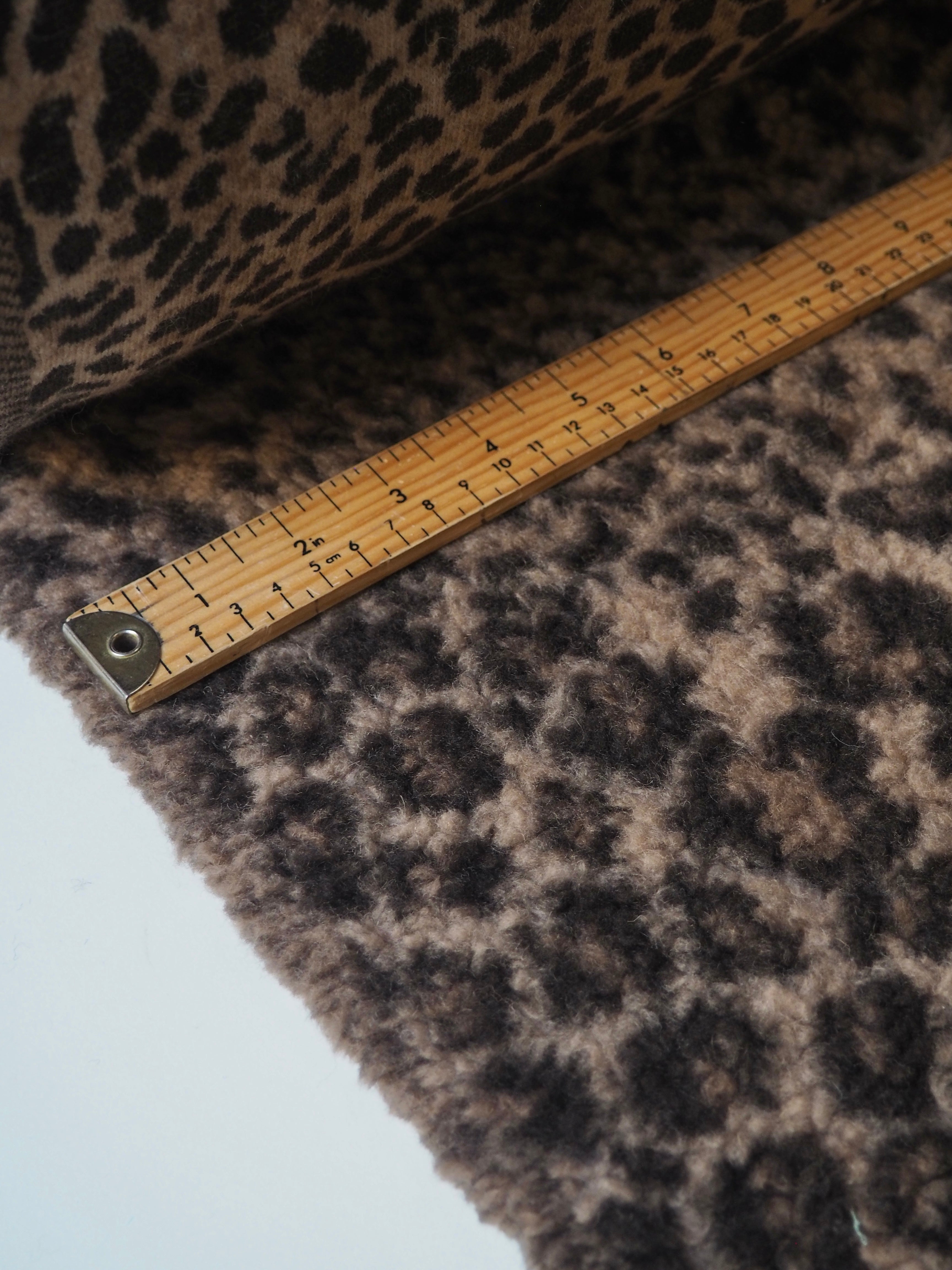 This ex-designer fabric is a faux shearling. It's a fun and bold leopard print faux shearling on a knit backing. It has a 1cm pile, and about 10% stretch. It's such a statement cloth! Medium weight, with a nice pile that's so warm and cozy. Super soft and lovely against the skin! It's perfect for lining or self fabrics, in coats, waistcoats, mittens, and accessories!