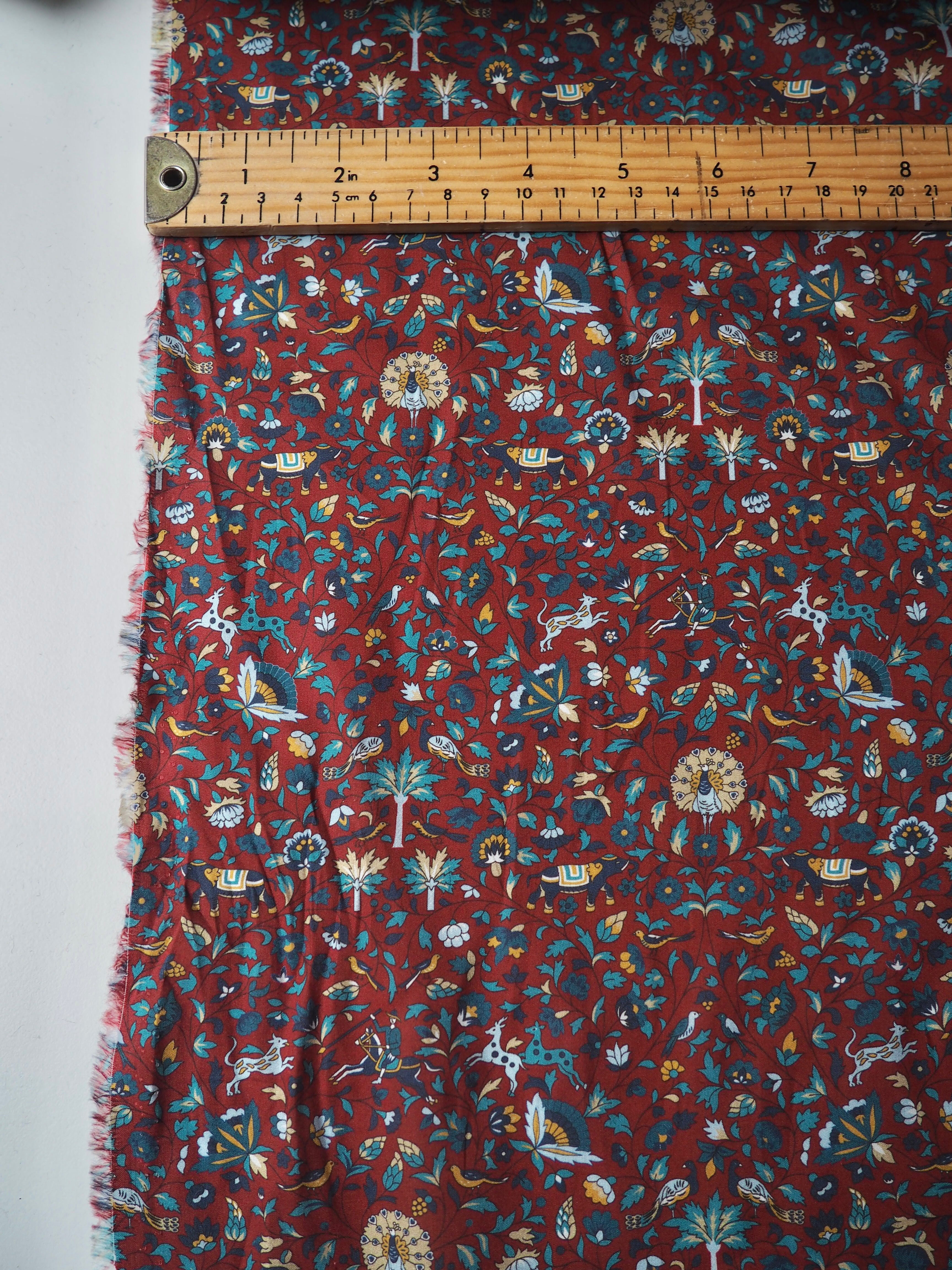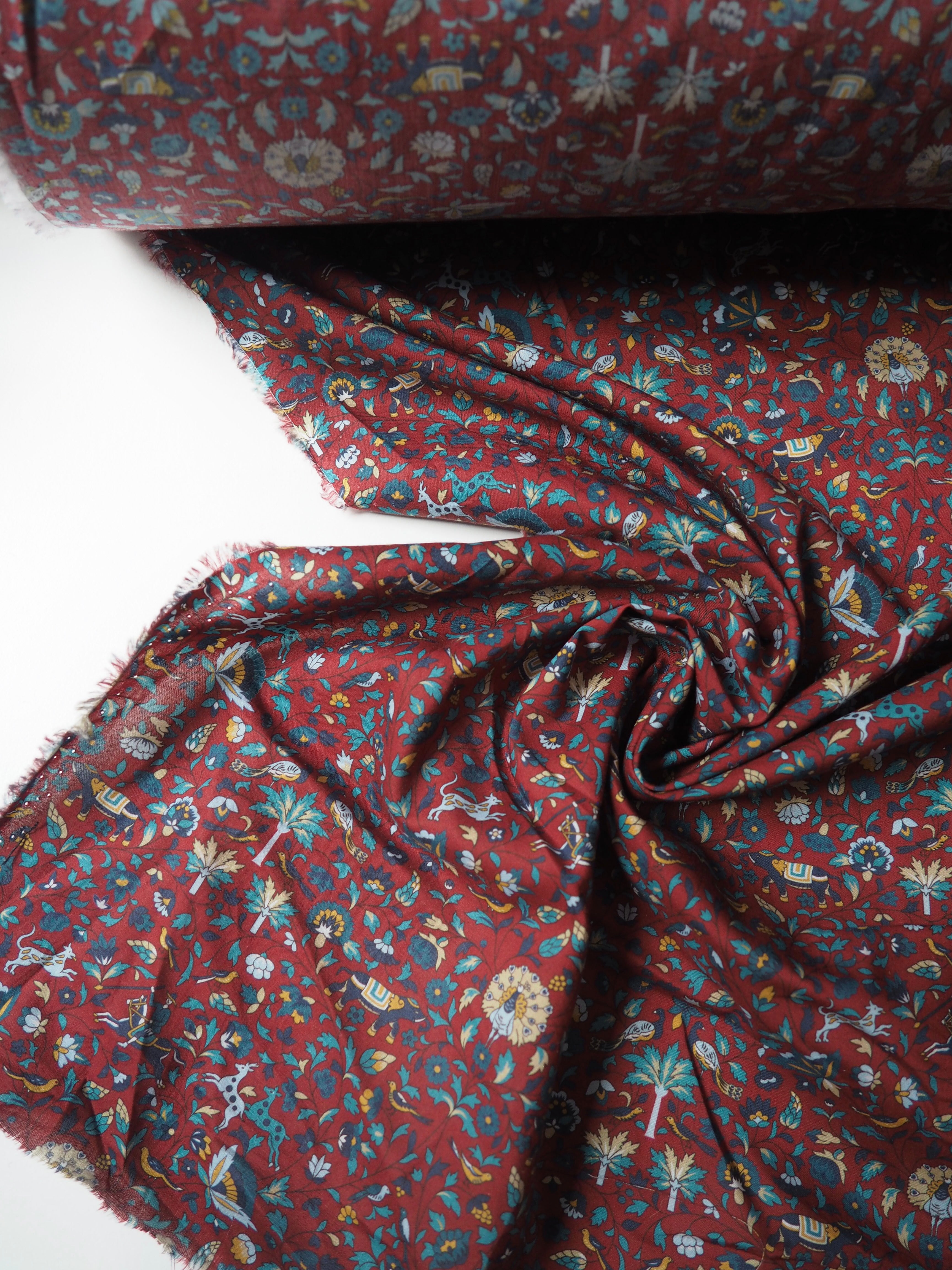 This ex-designer fabric is a classic Liberty Tana Lawn. It's in a classic burgundy Imran print of elephants, peacocks, and leaves. A top-quality Liberty cotton, and super lightweight! Soft with a lovely drape and slight crispness. Has a wonderful cotton handle. Mostly opaque but lets a little light in. We would love to see it in a blouse or even for quilting!