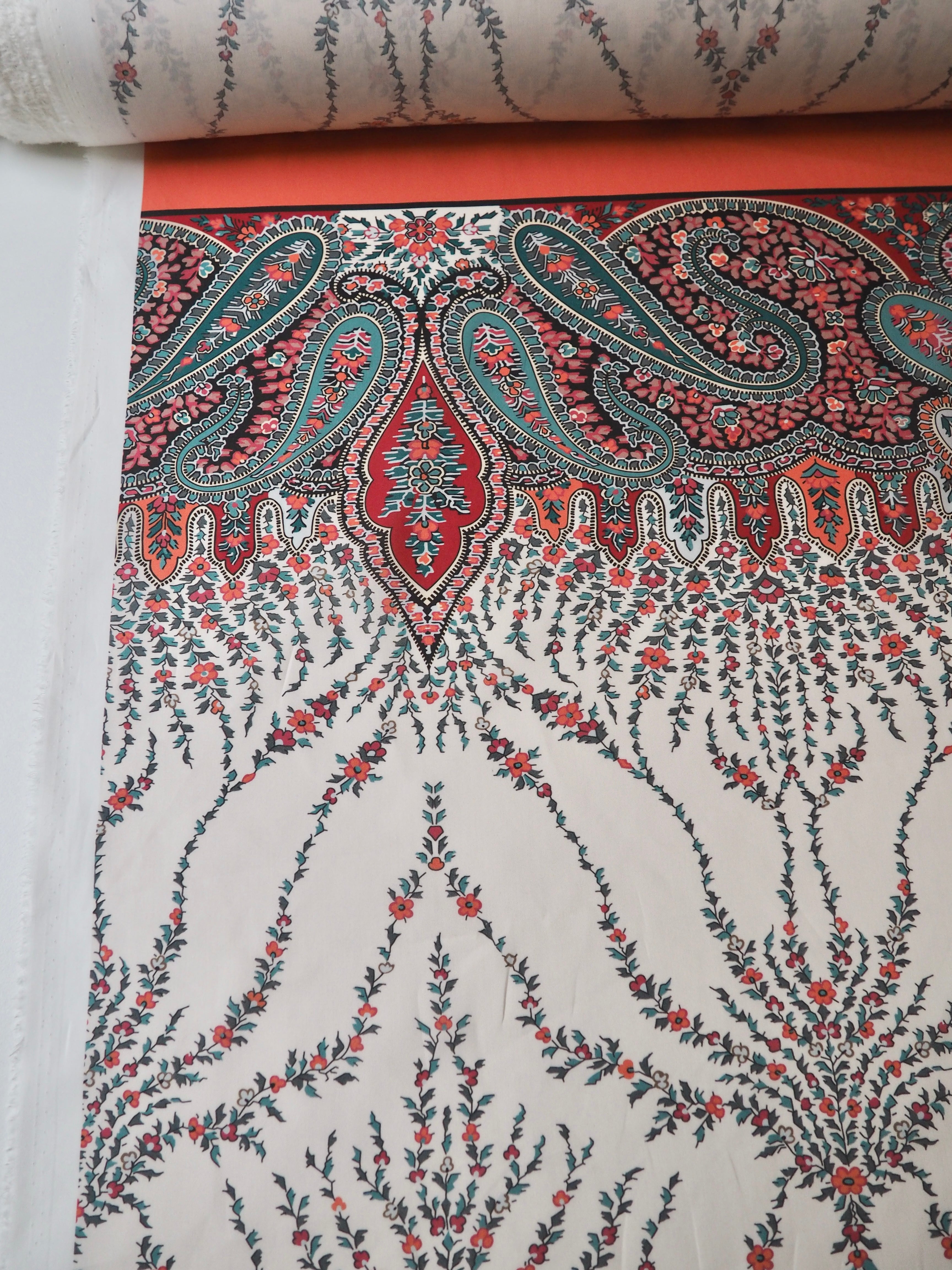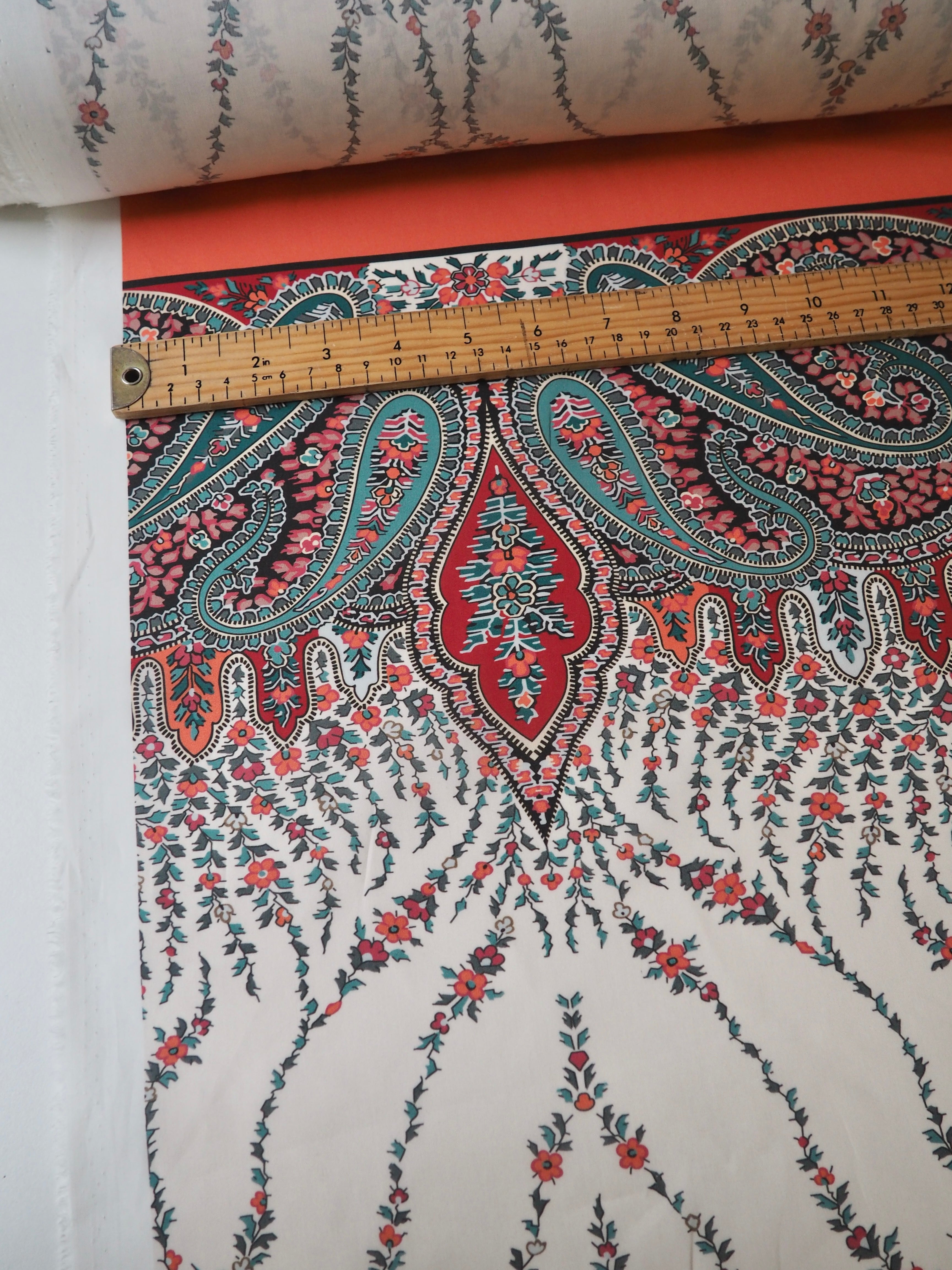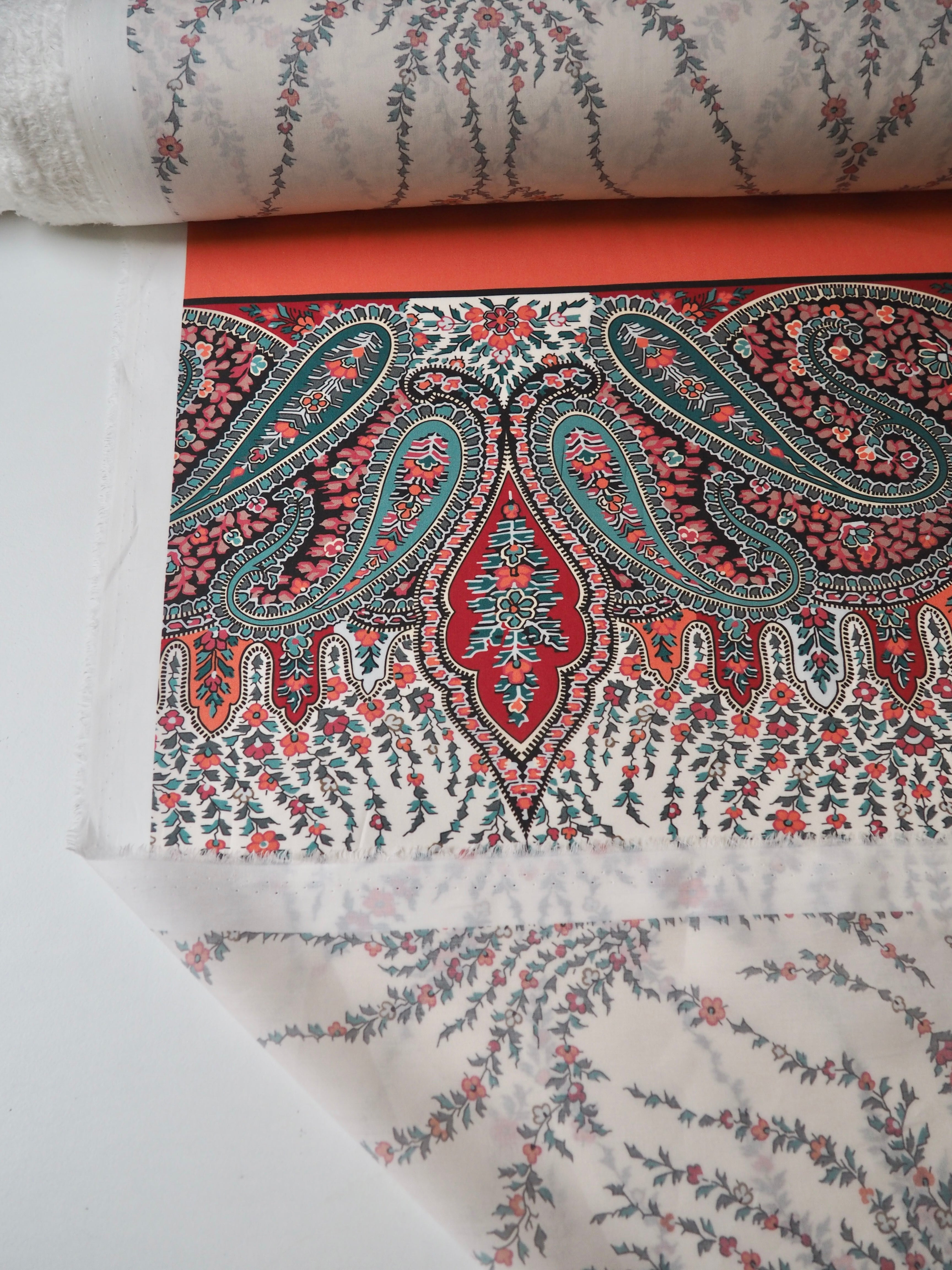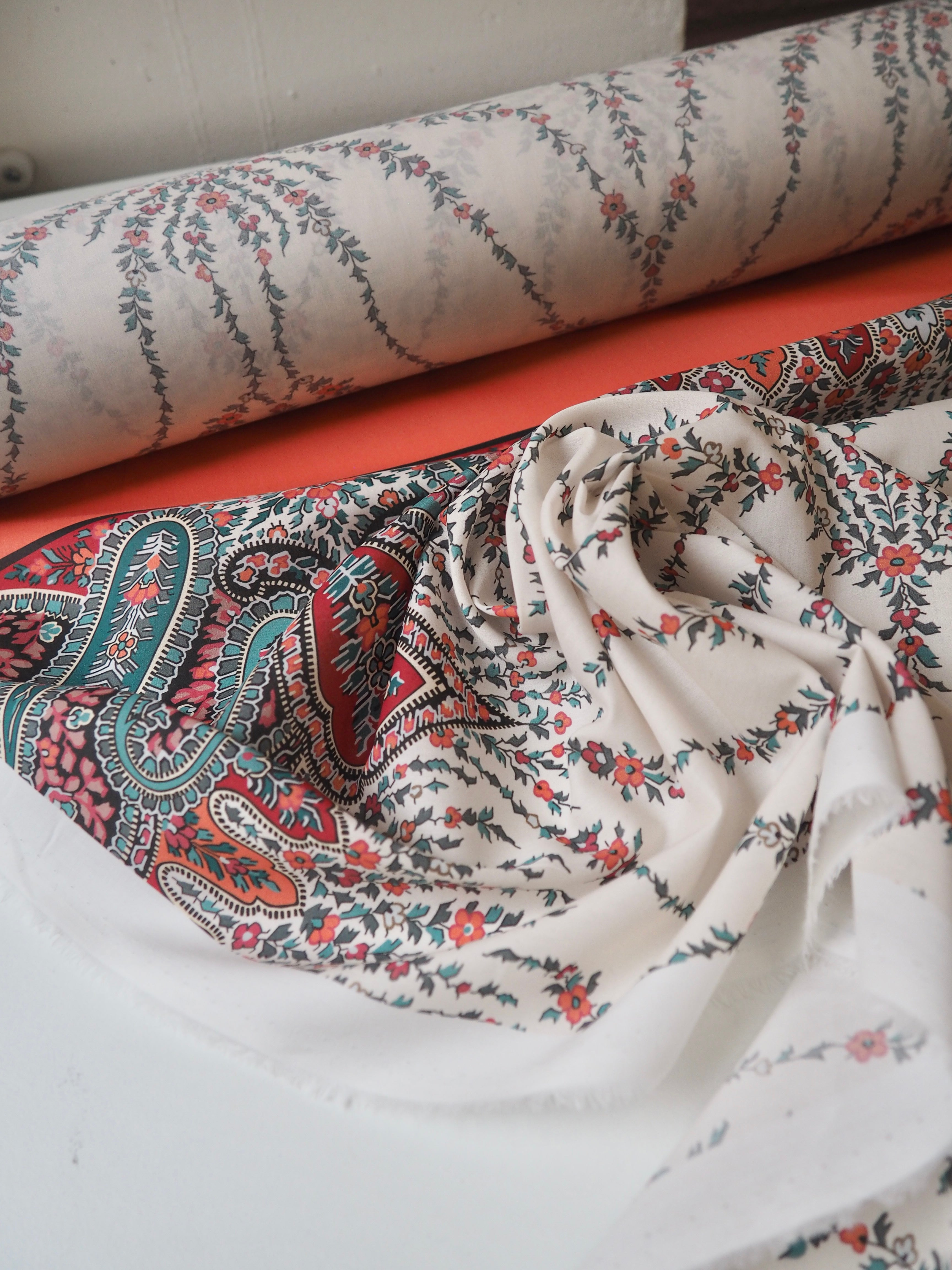 This ex-designer fabric is a classic Liberty Tana Lawn. It's a unique printed panel in a 1.25m repeat, with a vibrant border on one end. It's in a lovely open garland-like print. A top-quality Liberty cotton, and super lightweight! Soft with a lovely drape and slight crispness. Has a wonderful cotton handle. Mostly opaque but lets a little light in. We would love to see it in a blouse or even for quilting!