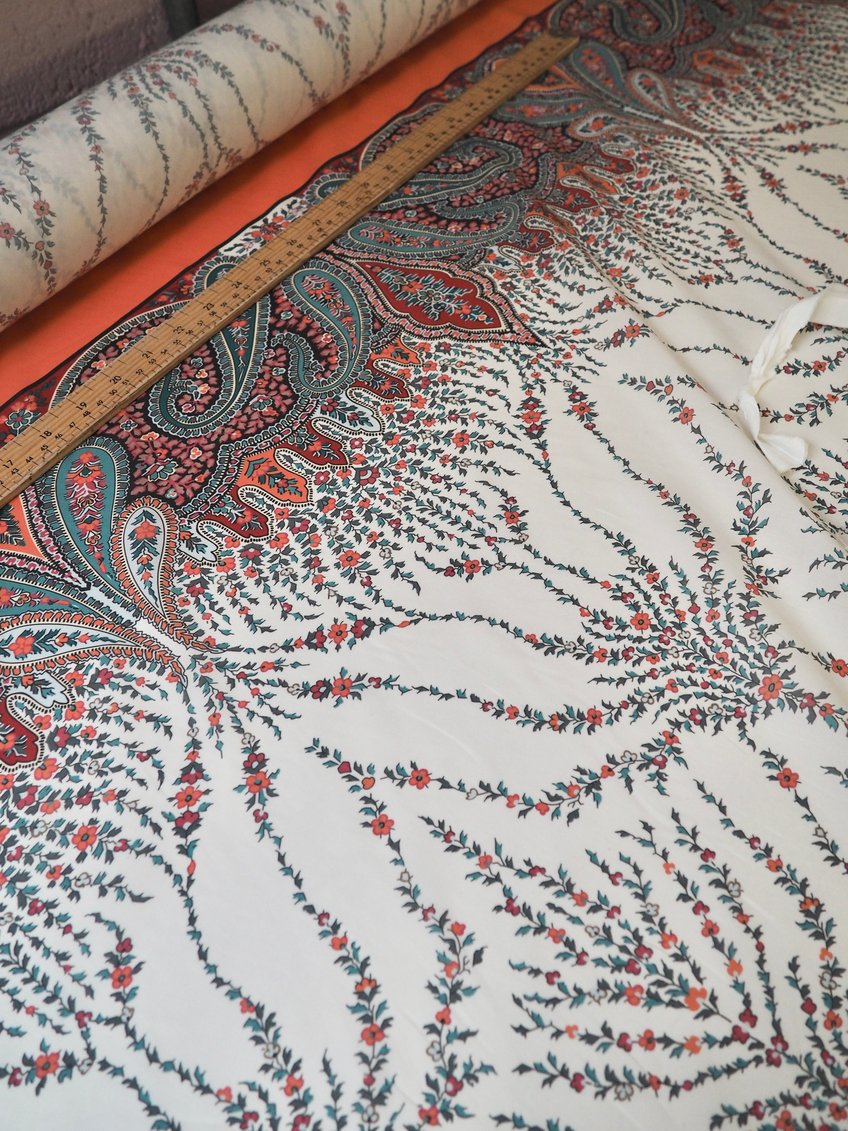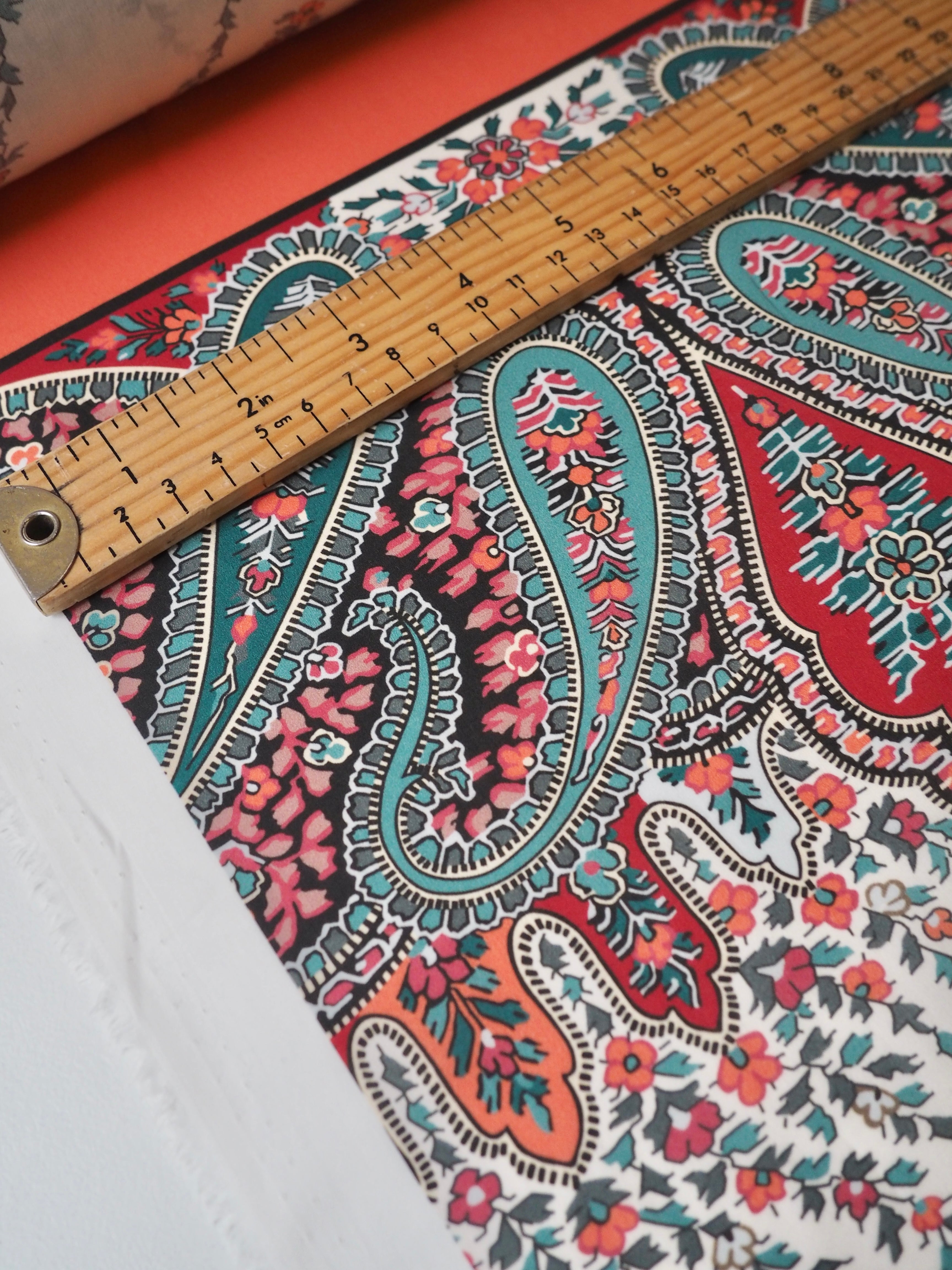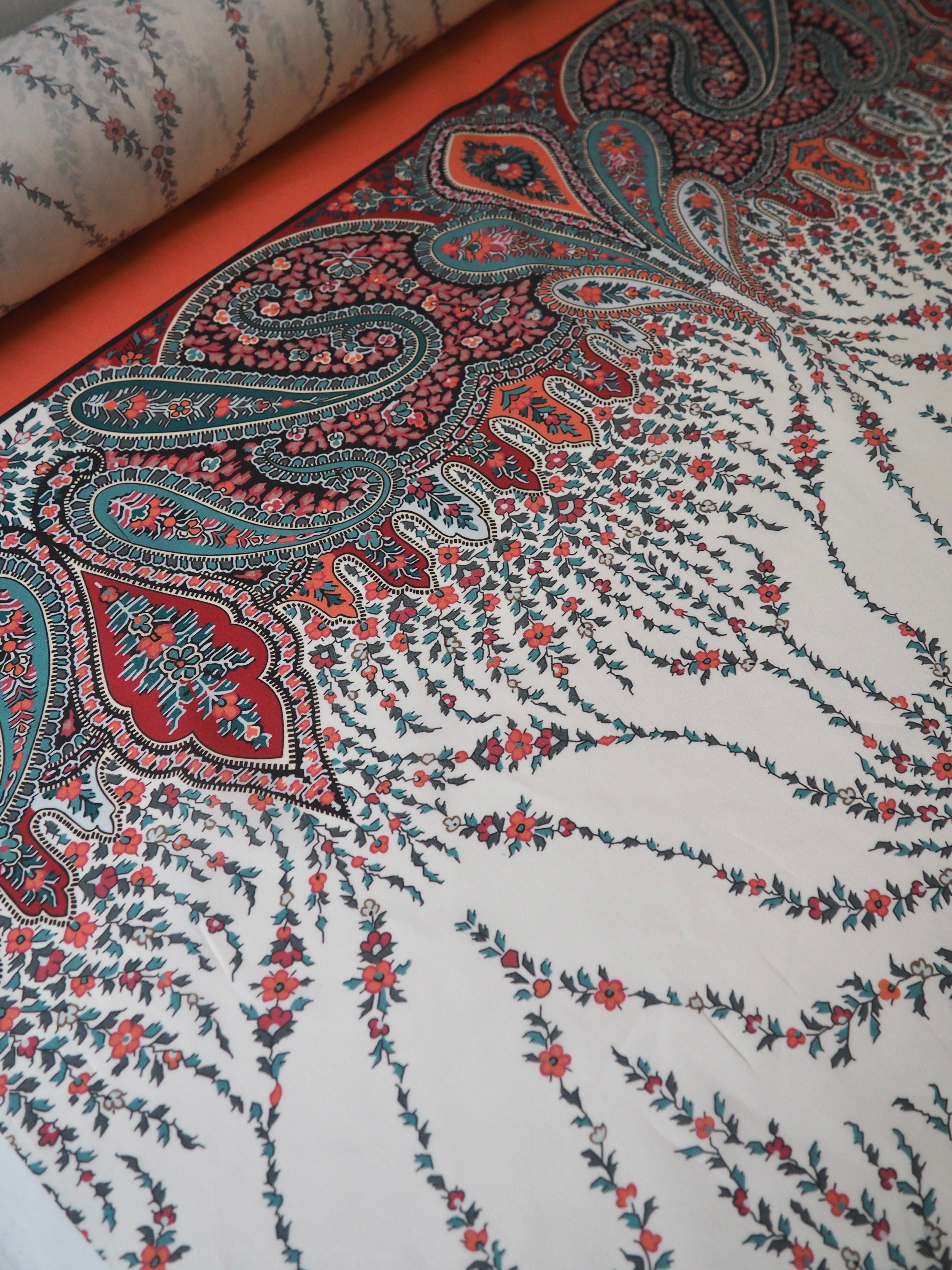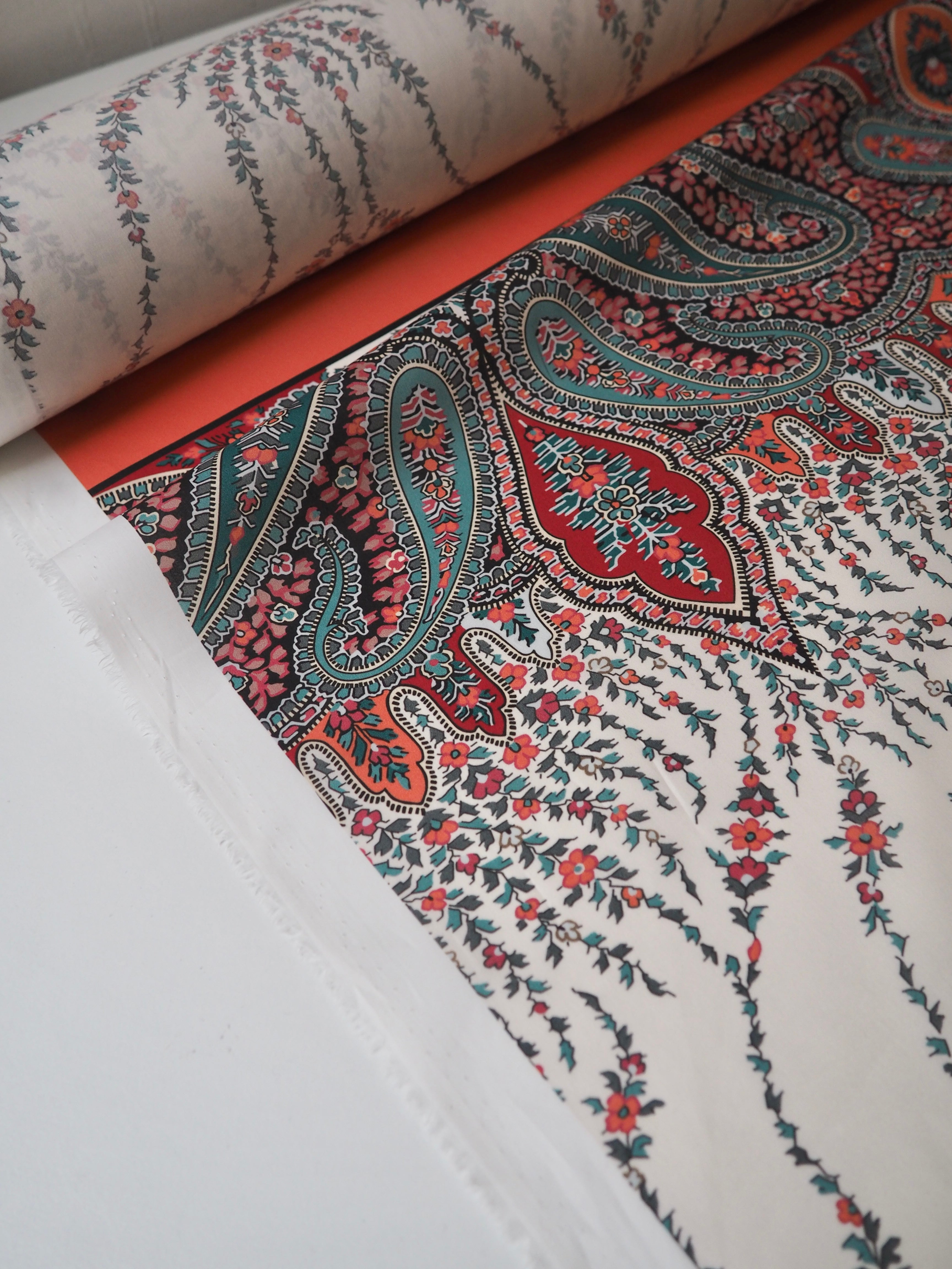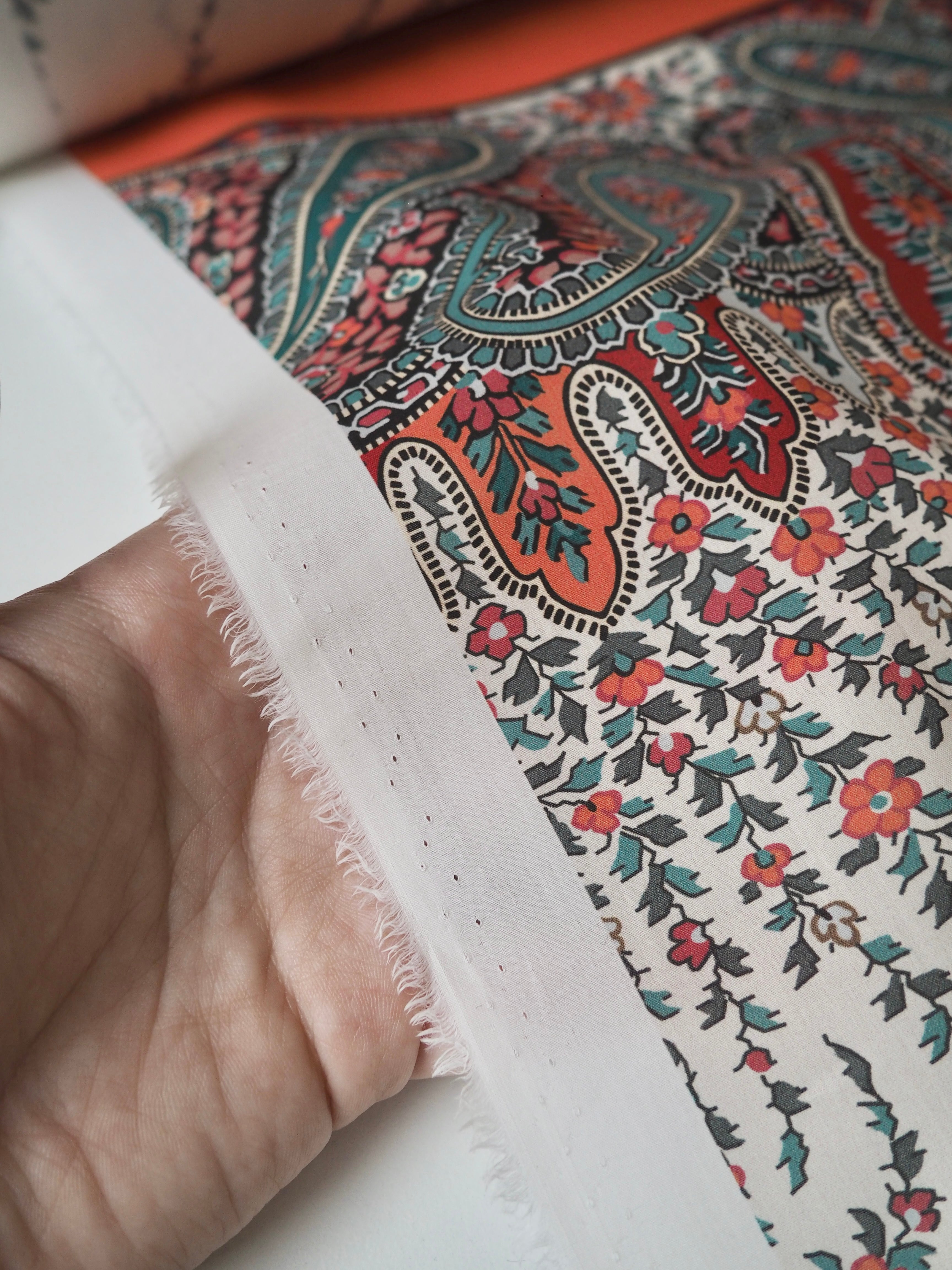 This ex-designer fabric is a classic Liberty Tana Lawn. It's a unique printed panel in a 1.25m repeat, with a vibrant border on one end. It's in a lovely open garland-like print. A top-quality Liberty cotton, and super lightweight! Soft with a lovely drape and slight crispness. Has a wonderful cotton handle. Mostly opaque but lets a little light in. We would love to see it in a blouse or even for quilting!