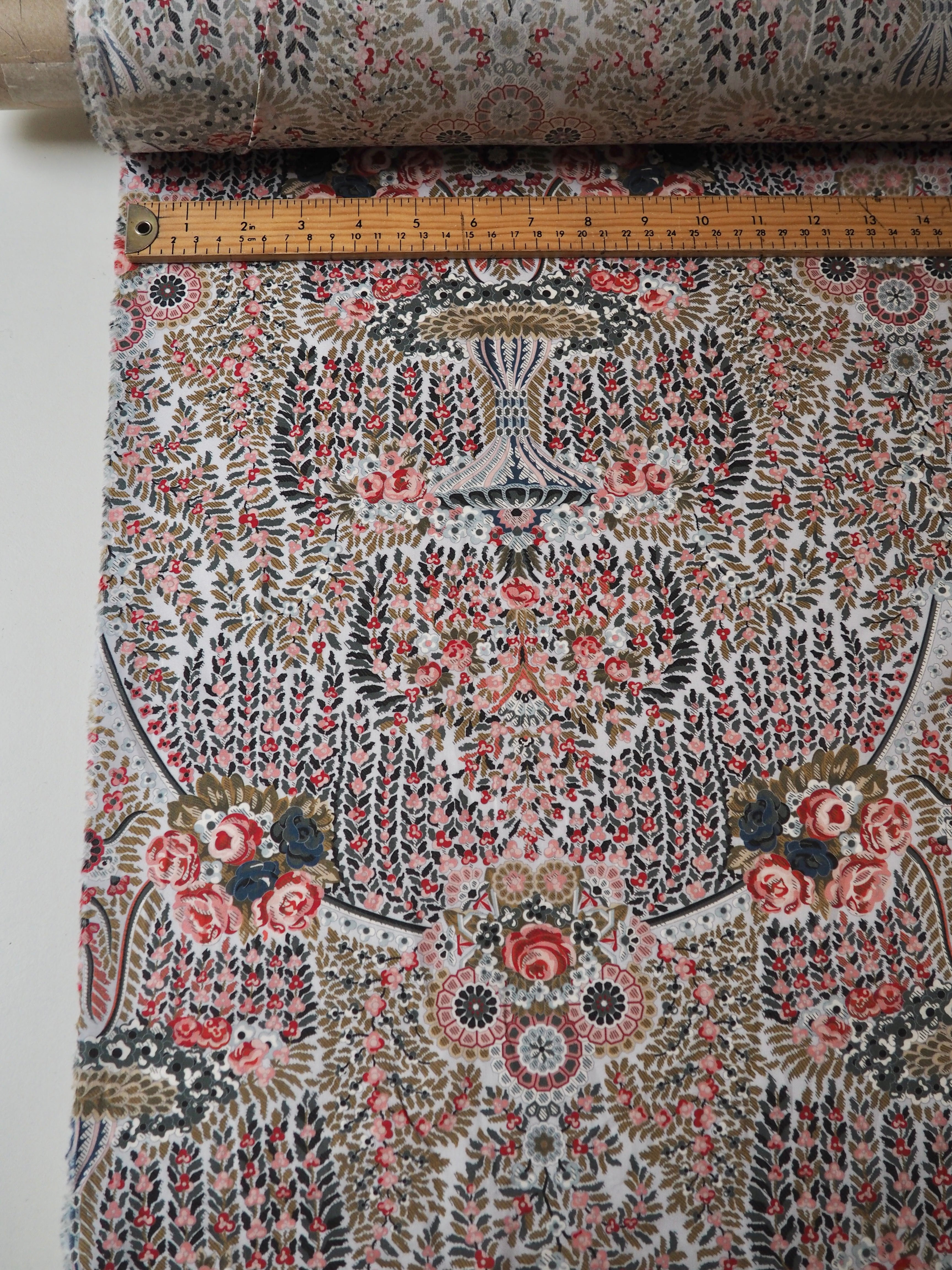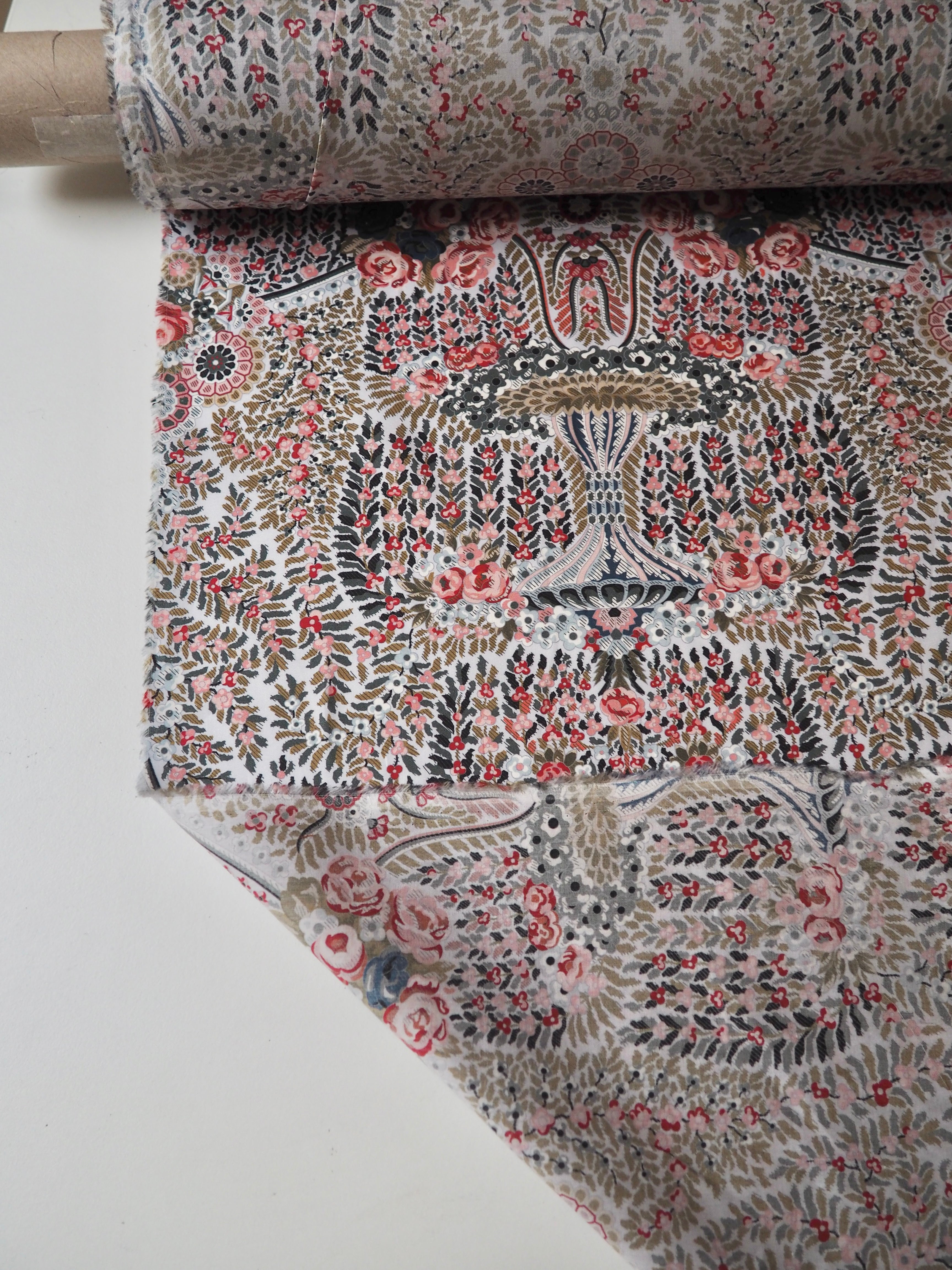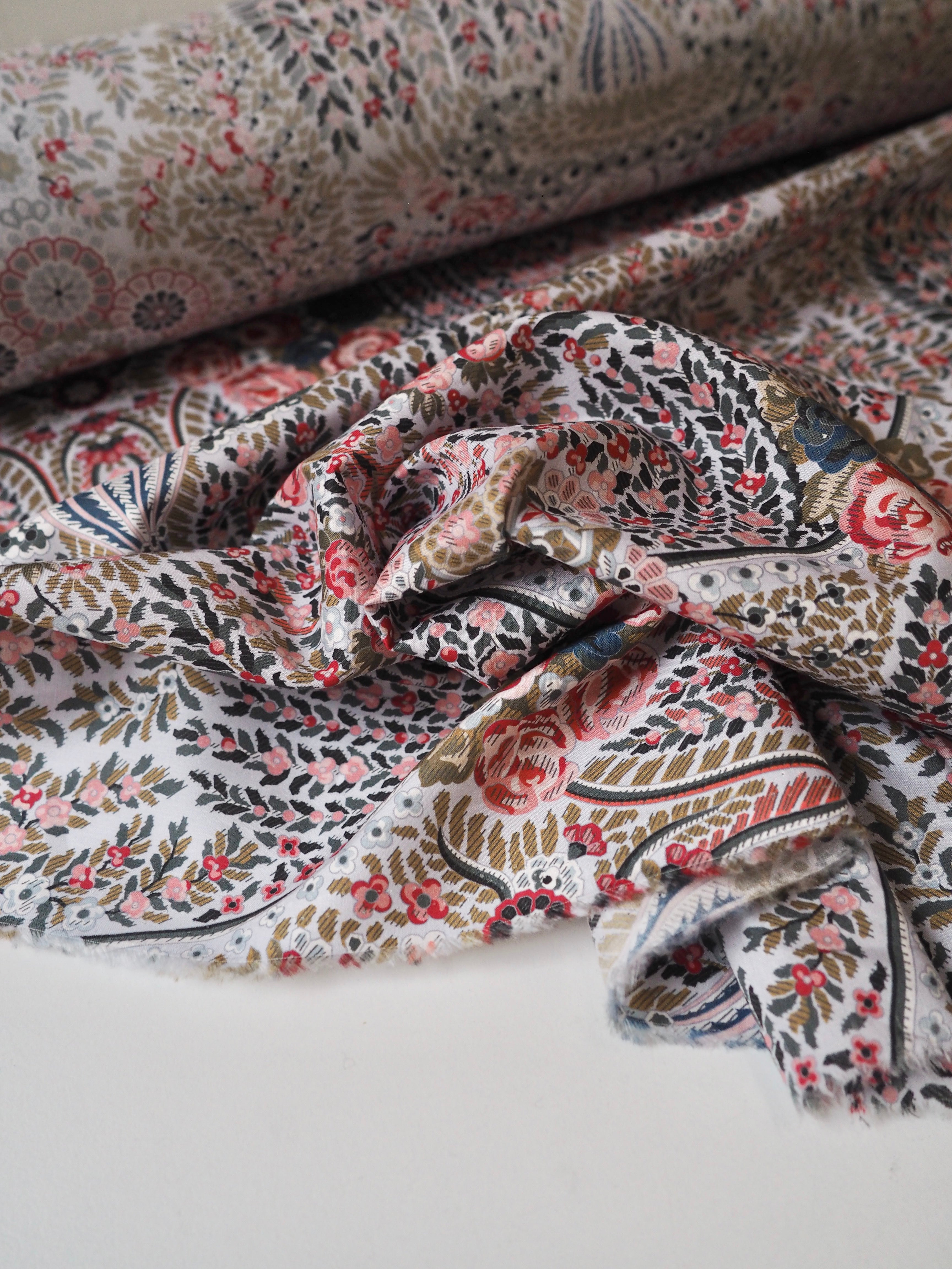 This ex-designer fabric is a classic Liberty Tana Lawn. It's in lovely garland and fountain-like print that is very detailed and interesting. A top-quality Liberty cotton, and super lightweight! Soft with a lovely drape and slight crispness. Has a wonderful cotton handle. Mostly opaque but lets a little light in. We would love to see it in a blouse or even for quilting!