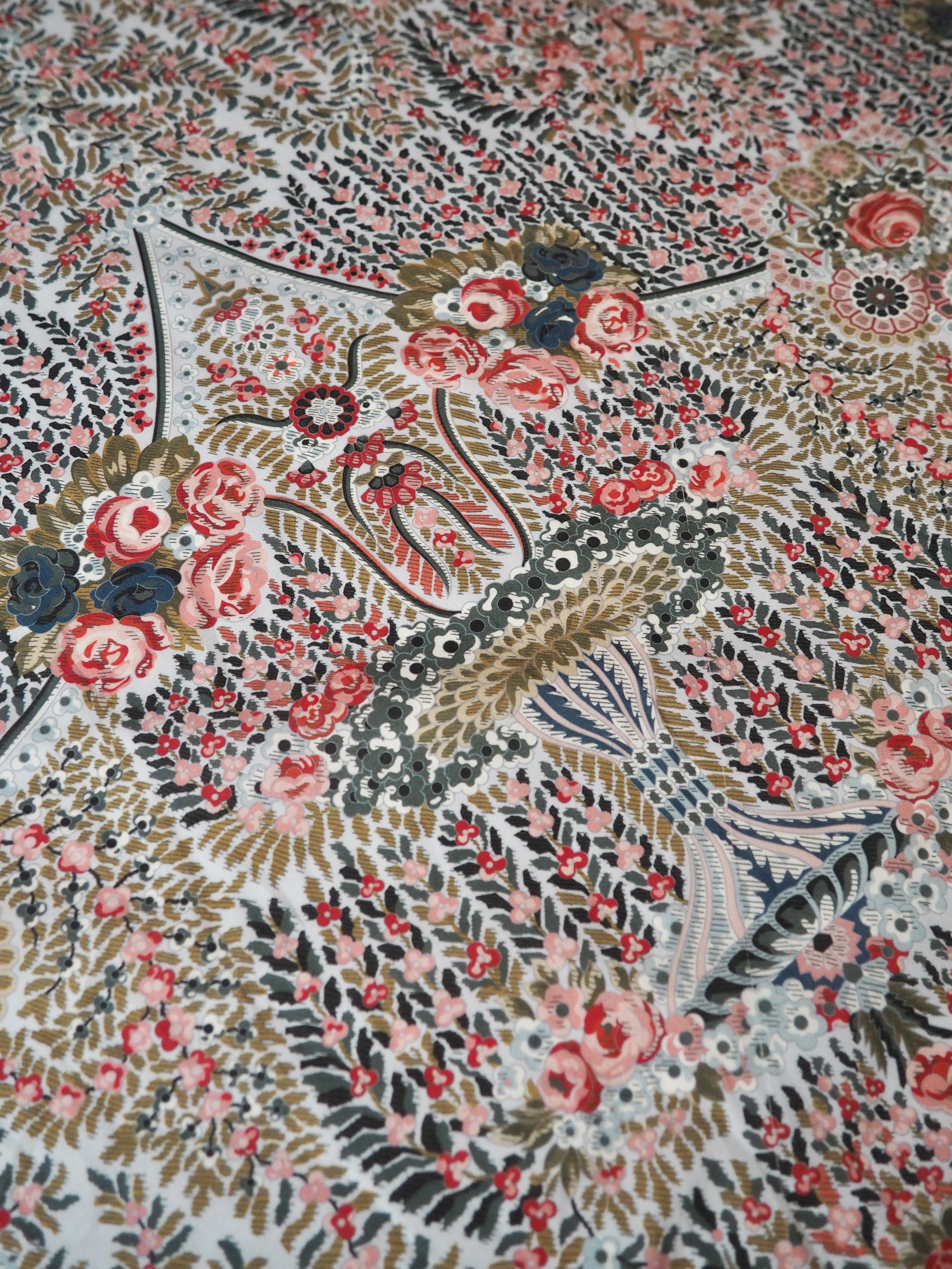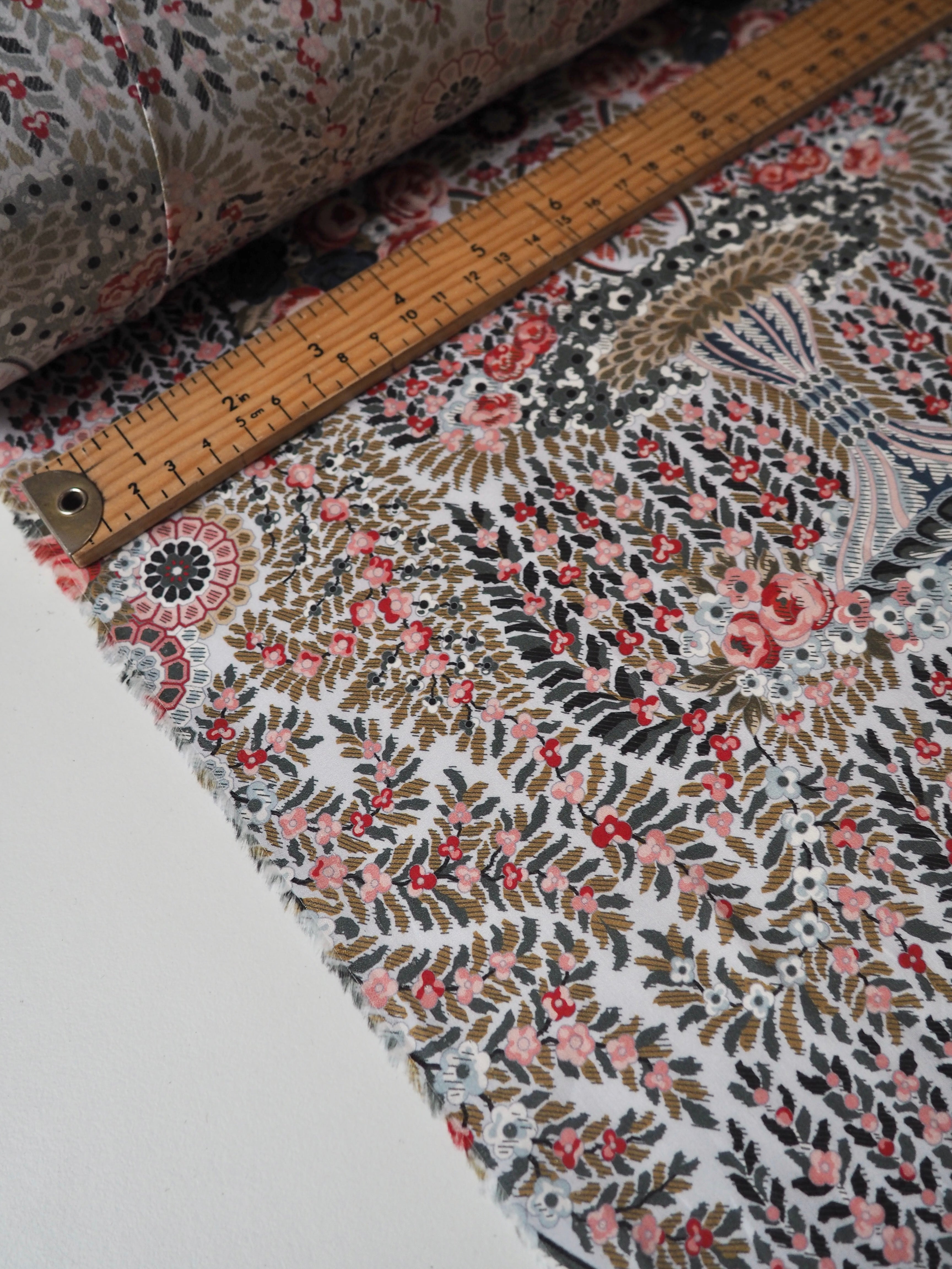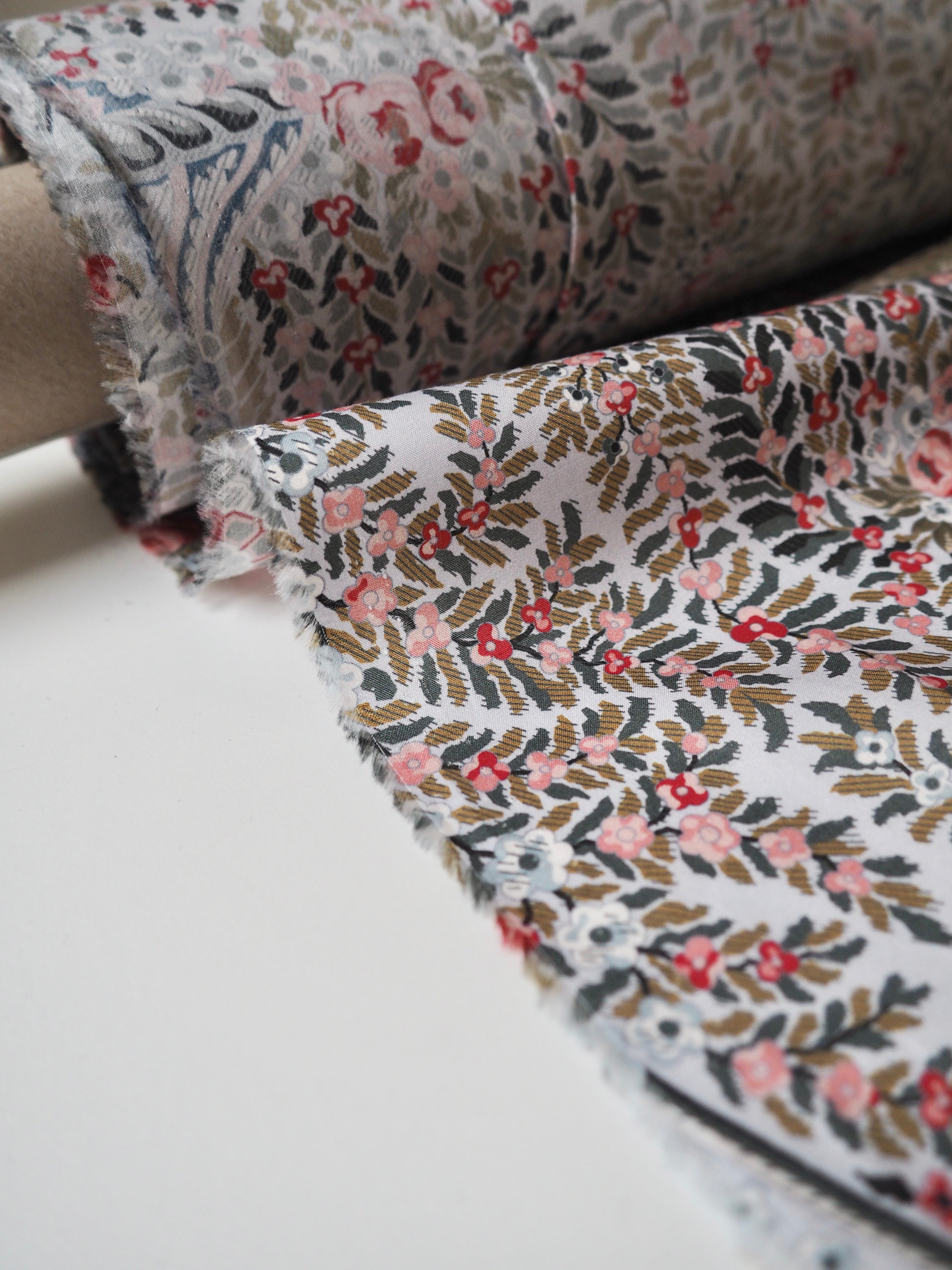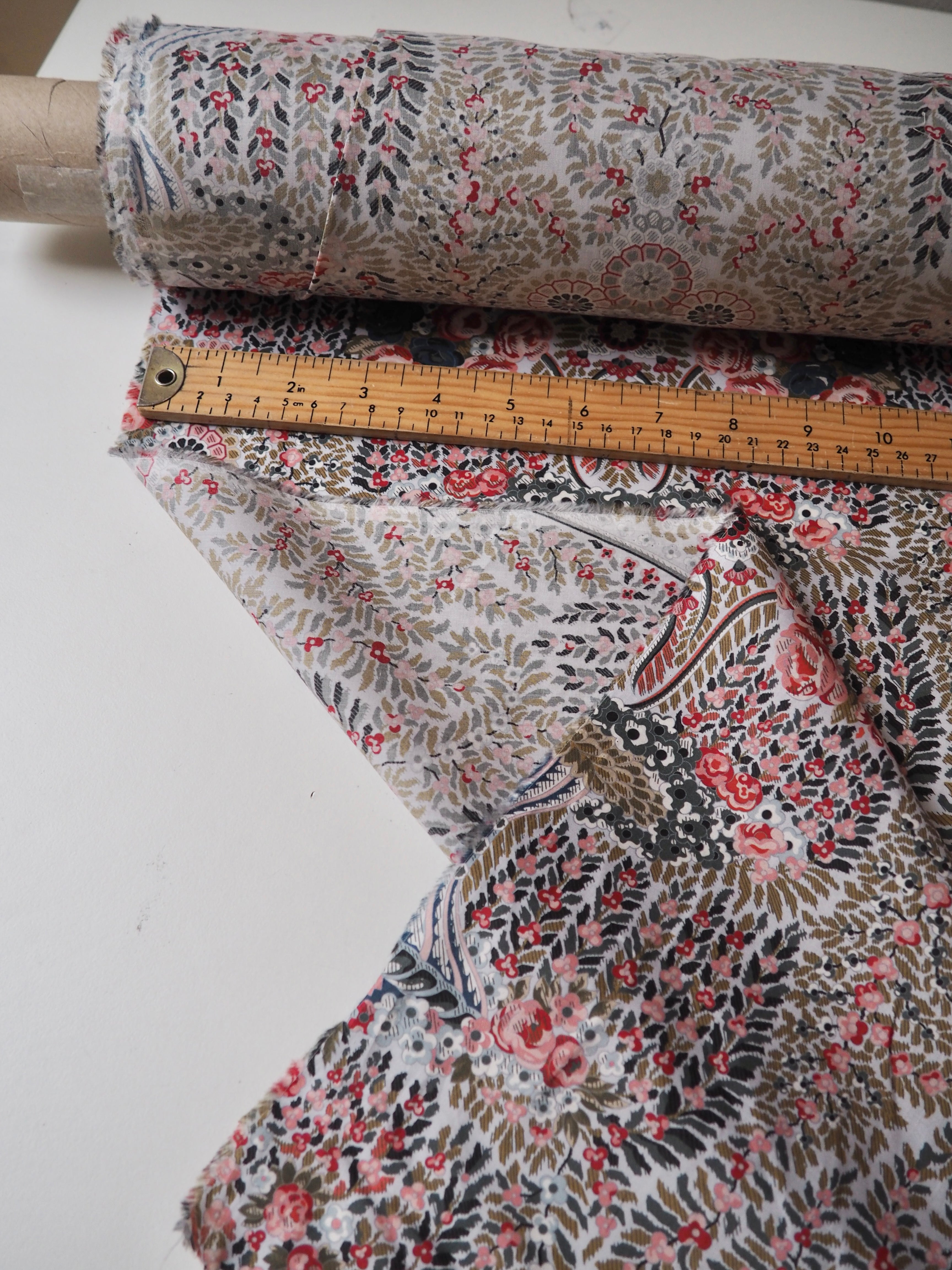 This ex-designer fabric is a classic Liberty Tana Lawn. It's in lovely garland and fountain-like print that is very detailed and interesting. A top-quality Liberty cotton, and super lightweight! Soft with a lovely drape and slight crispness. Has a wonderful cotton handle. Mostly opaque but lets a little light in. We would love to see it in a blouse or even for quilting!