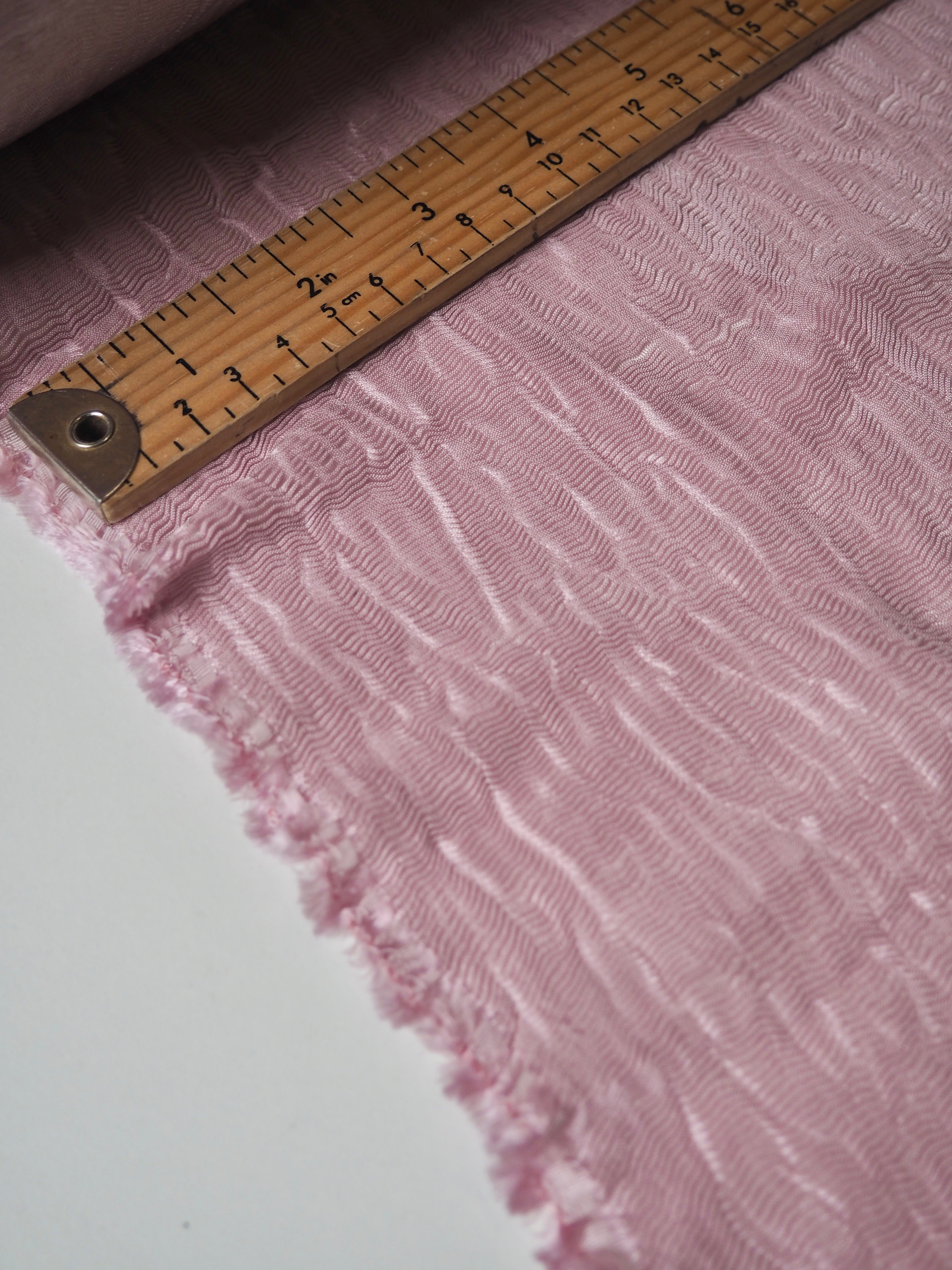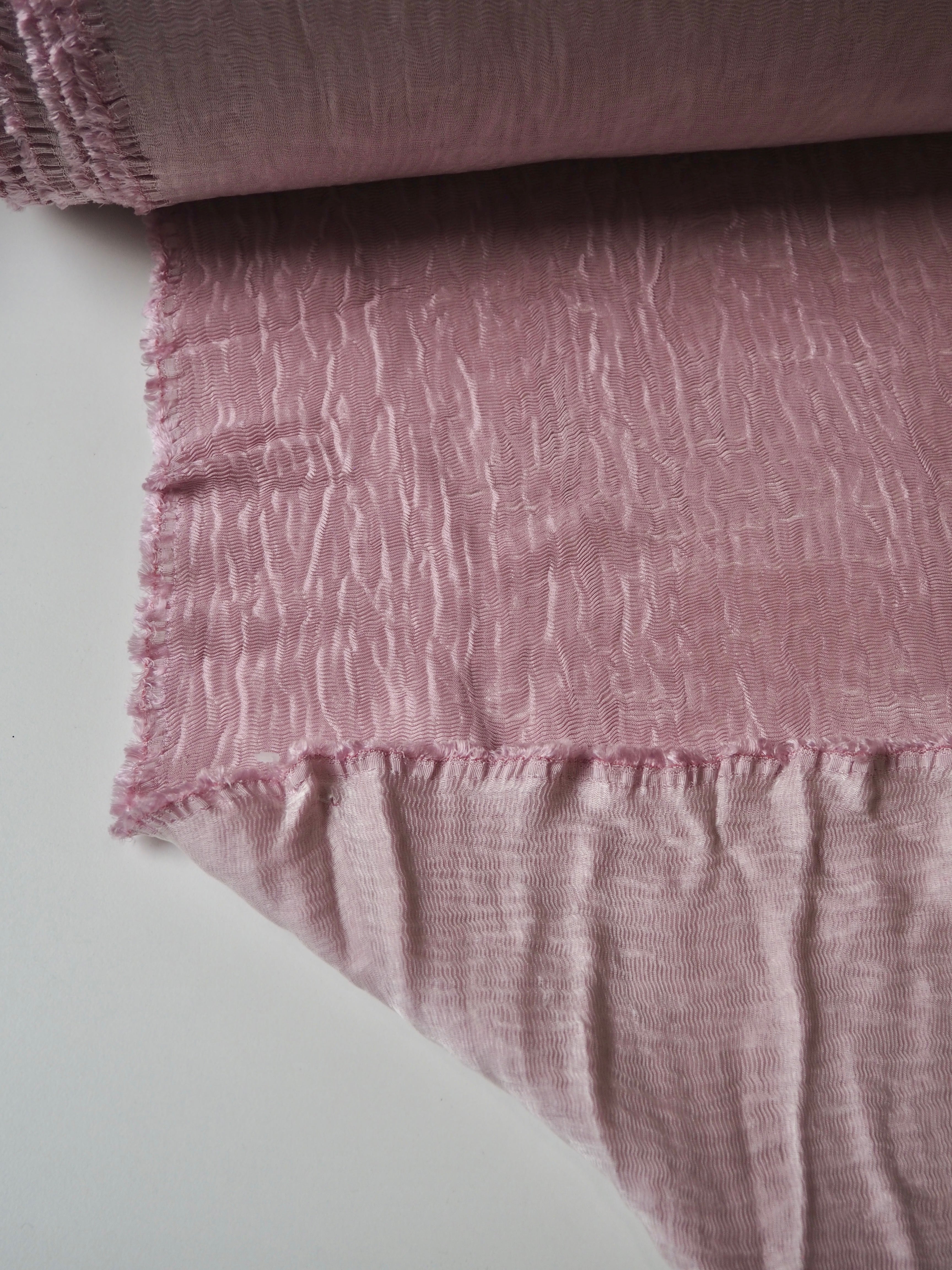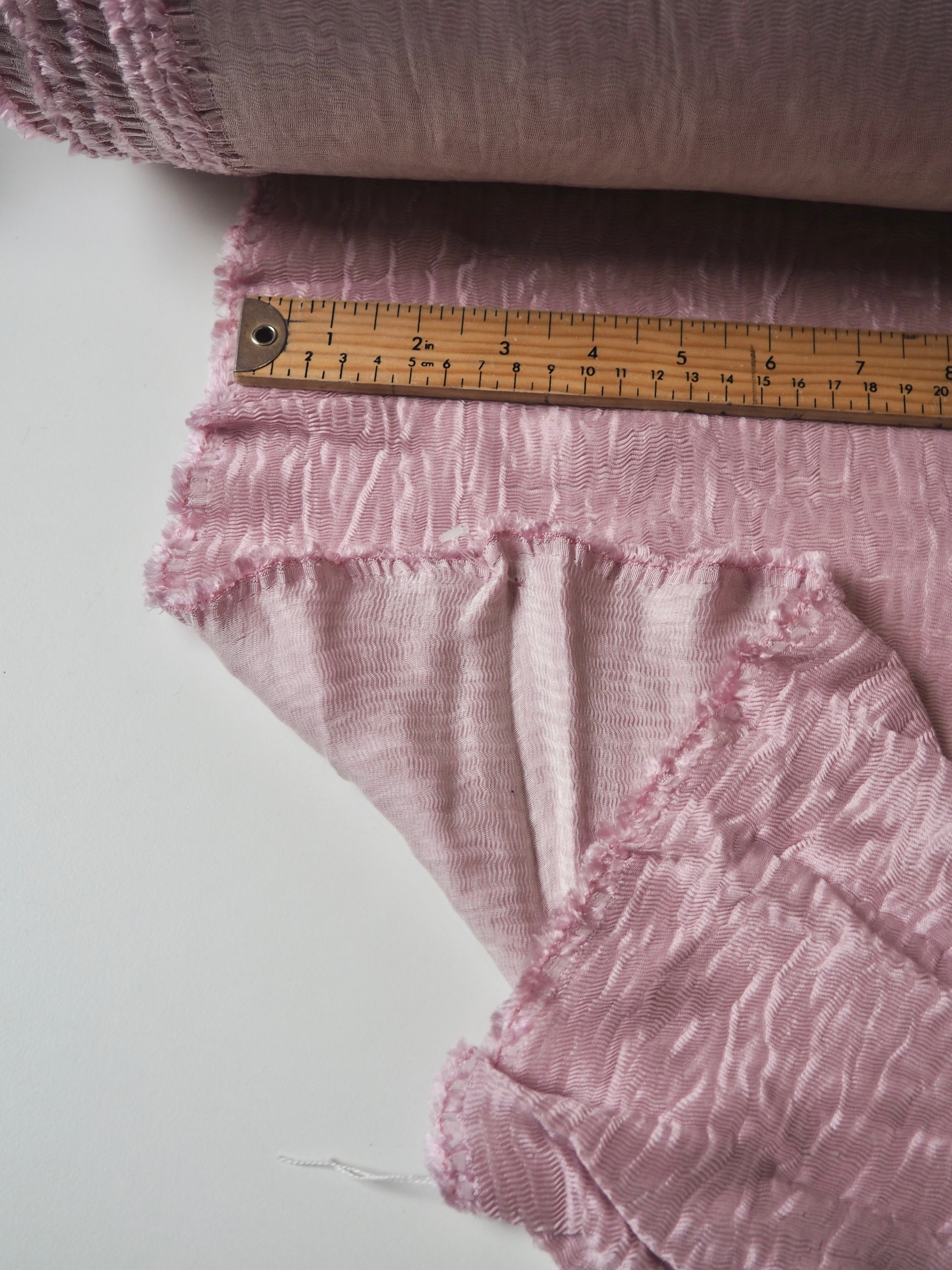 This ex-designer fabric is a unique cloqué. It has a plissé pleated topside, with a flat but super slinky and smooth reverse. It has about 15% stretch length ways. It's made of bamboo cupro, which gives it a very smooth and slightly washed handle, and would make such figure hugging and beautifully swishy projects! It's light to medium weight, opaque, and has a great natural bounce from the pleating. Such a lovely and special cloth! Can't wait to see some lovely tops and skirts!