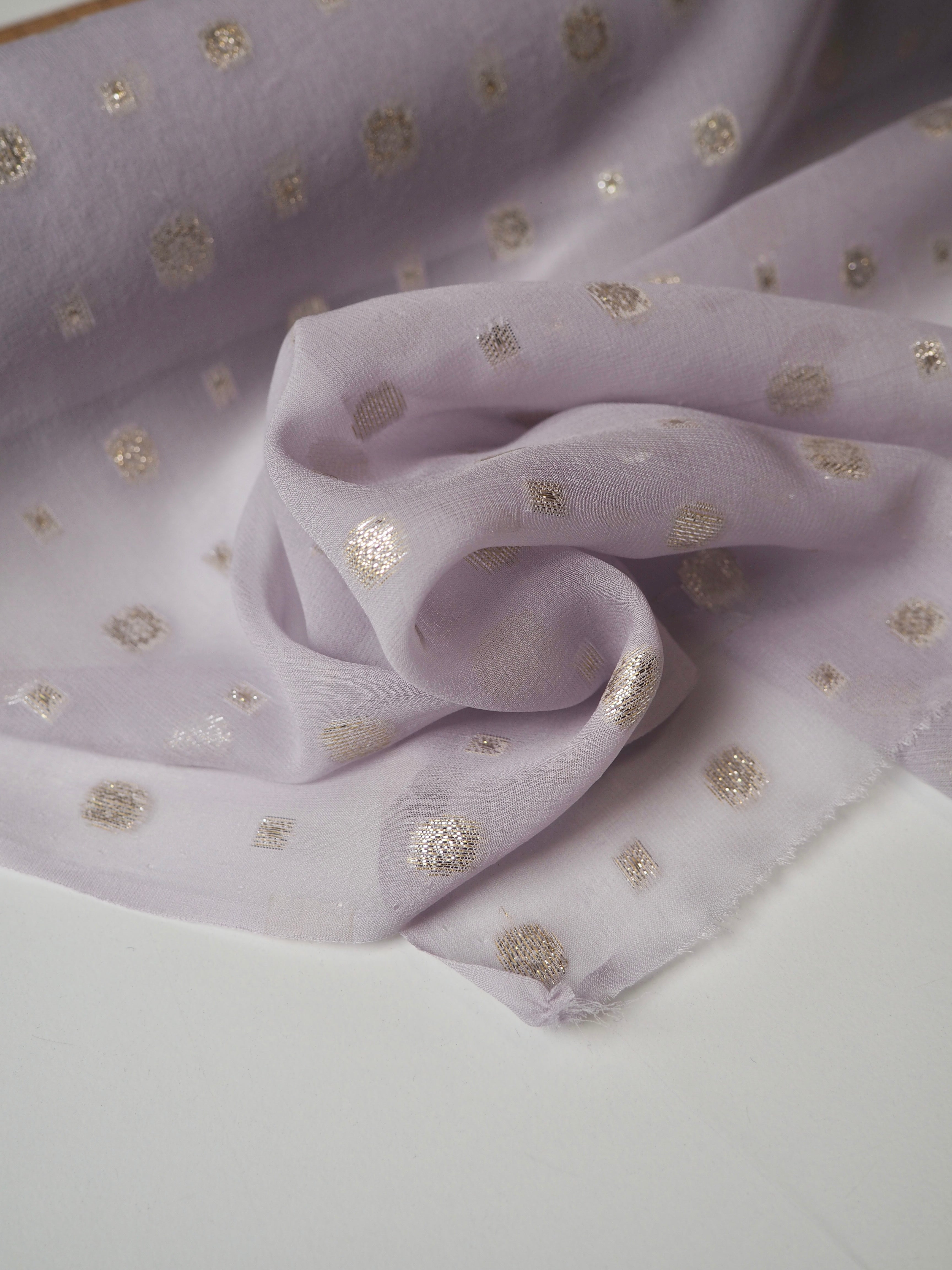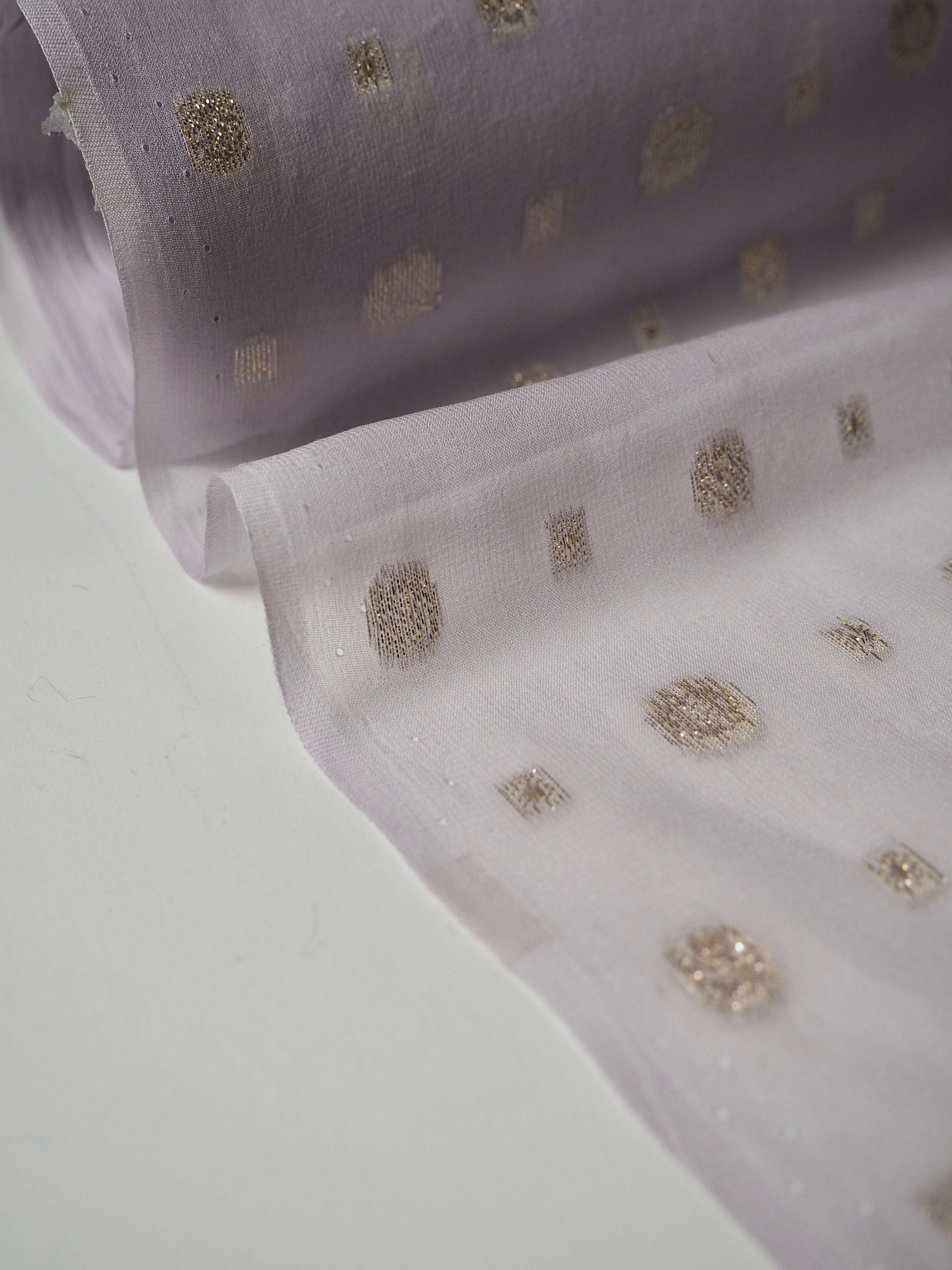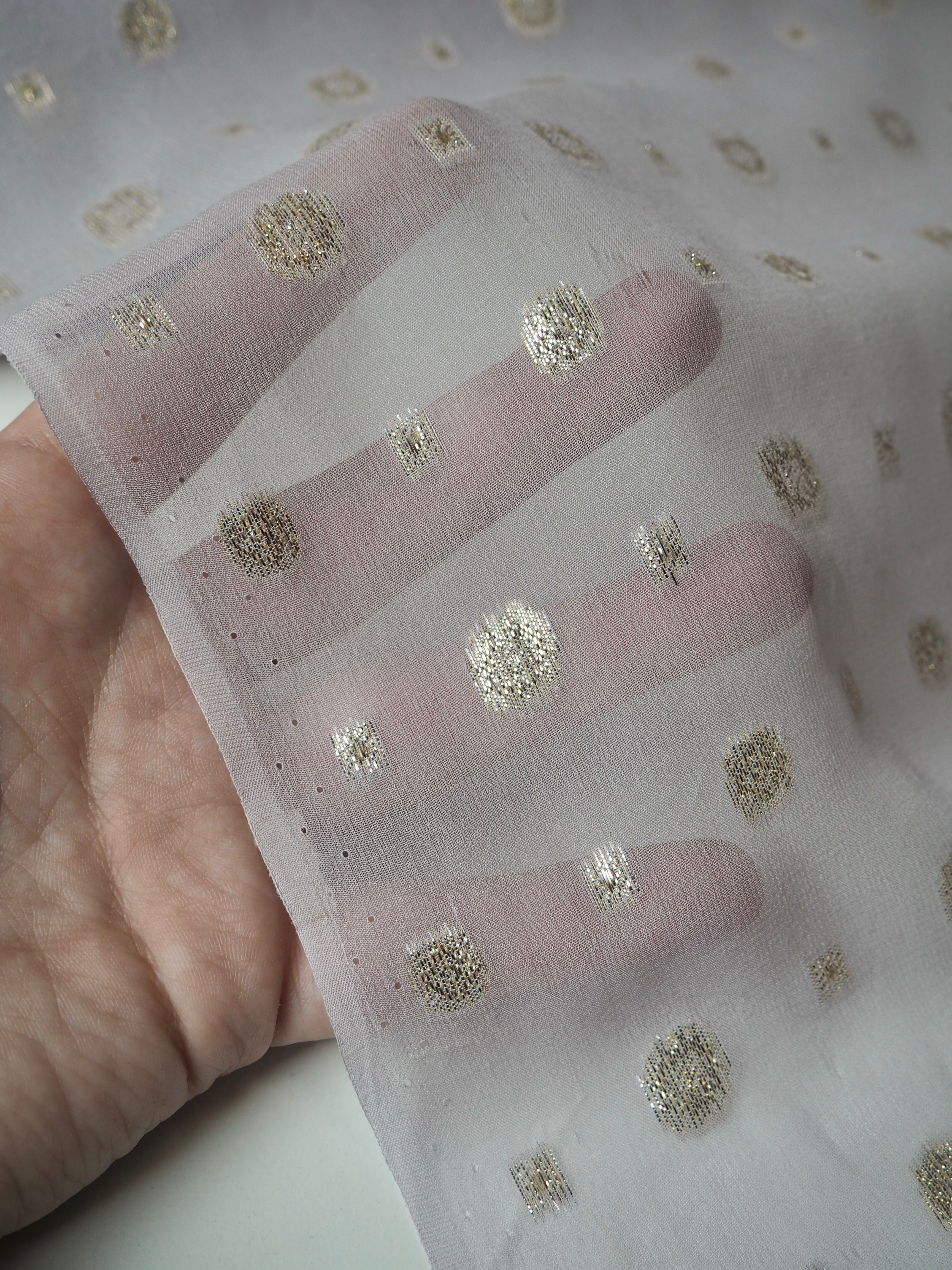 This ex-designer fabric is a lovely silk chiffon. In a lilac colour, with gold and silver metallic threads dotting across in a jacquard weave. It's very sheer, with incredible movement, and catches the light so well! Has a great silky handle with a subtle crepe-like texture. Super light and airy, ideal for scarves, or using for a floaty top or dress!