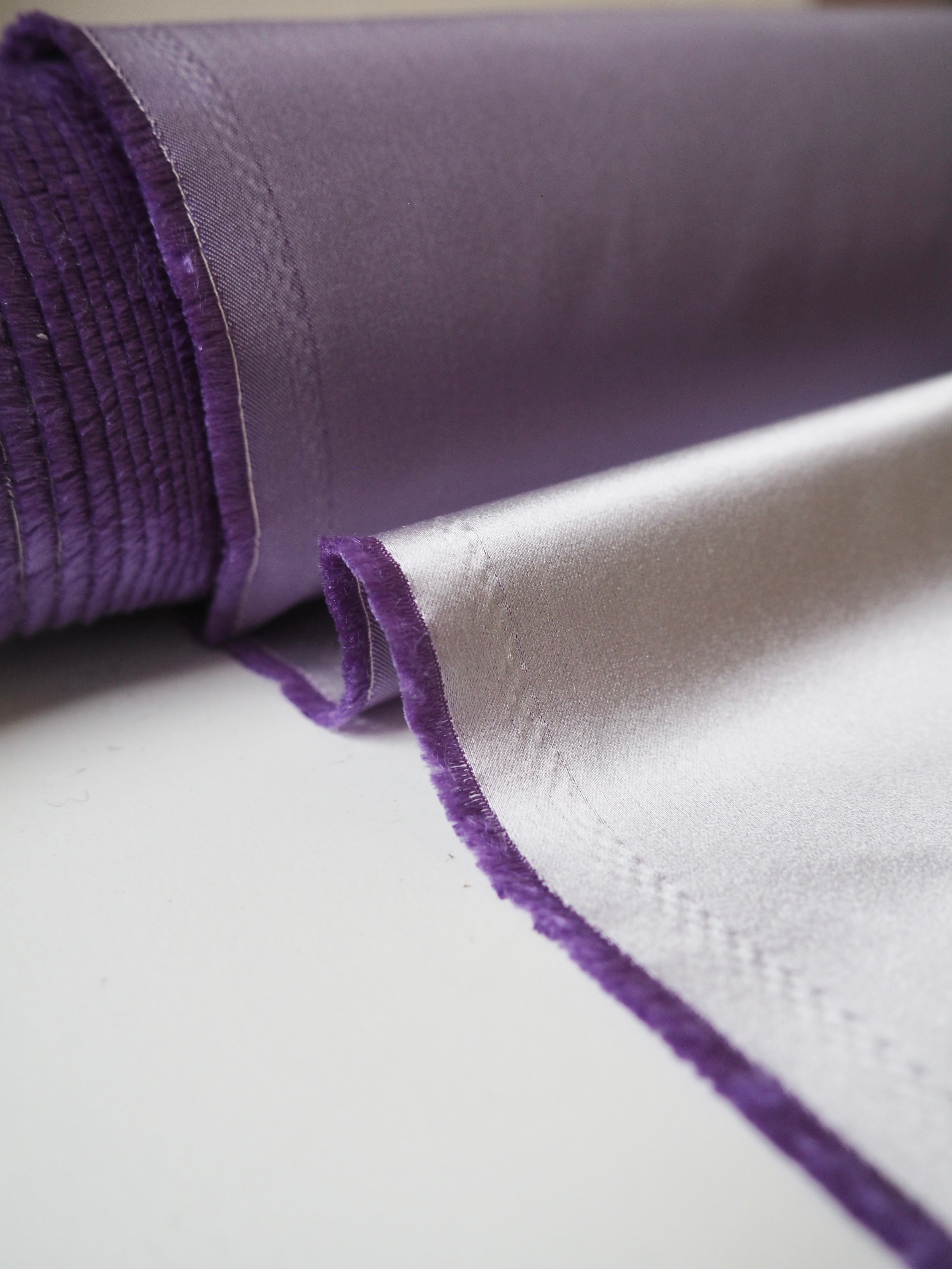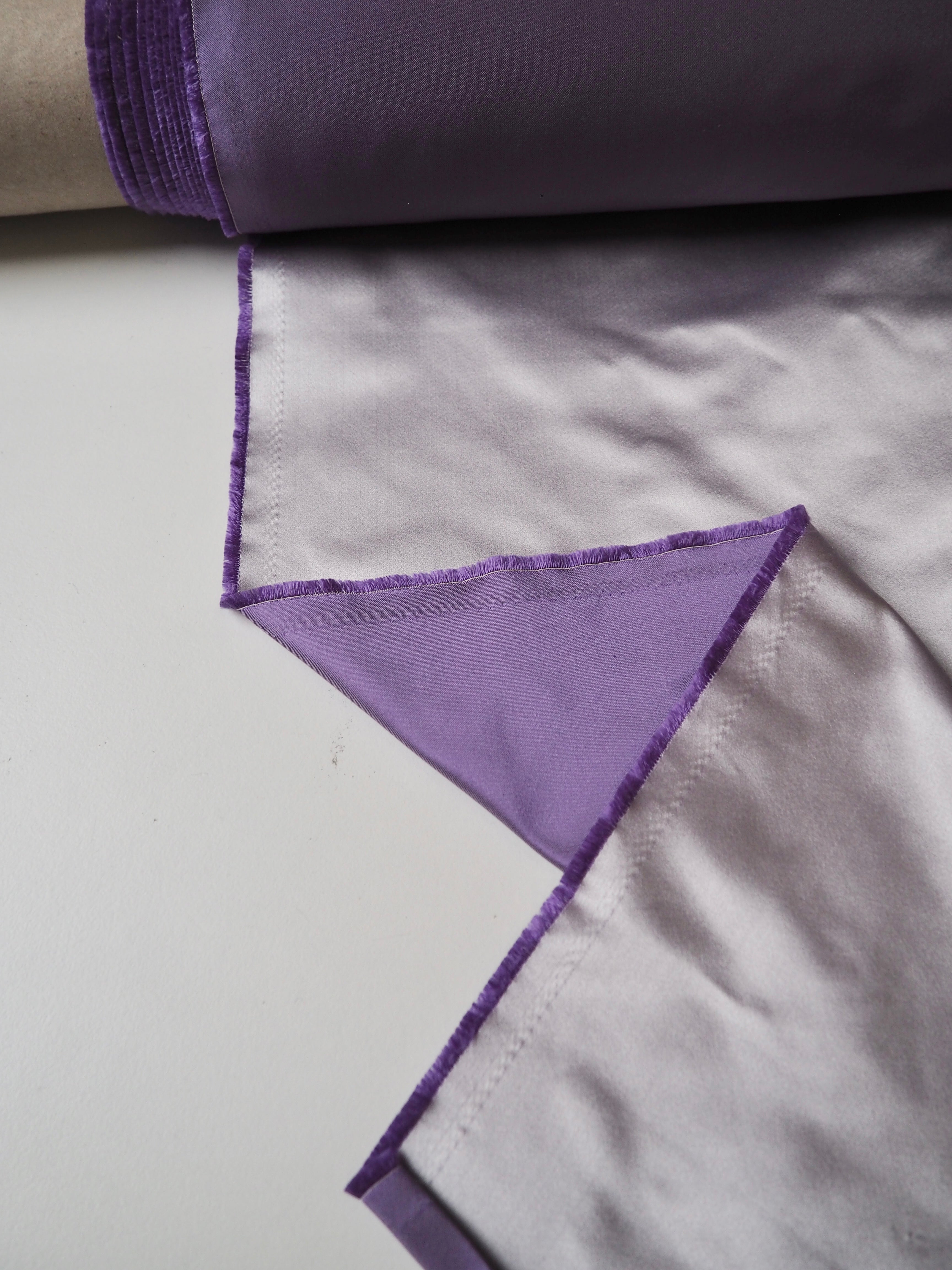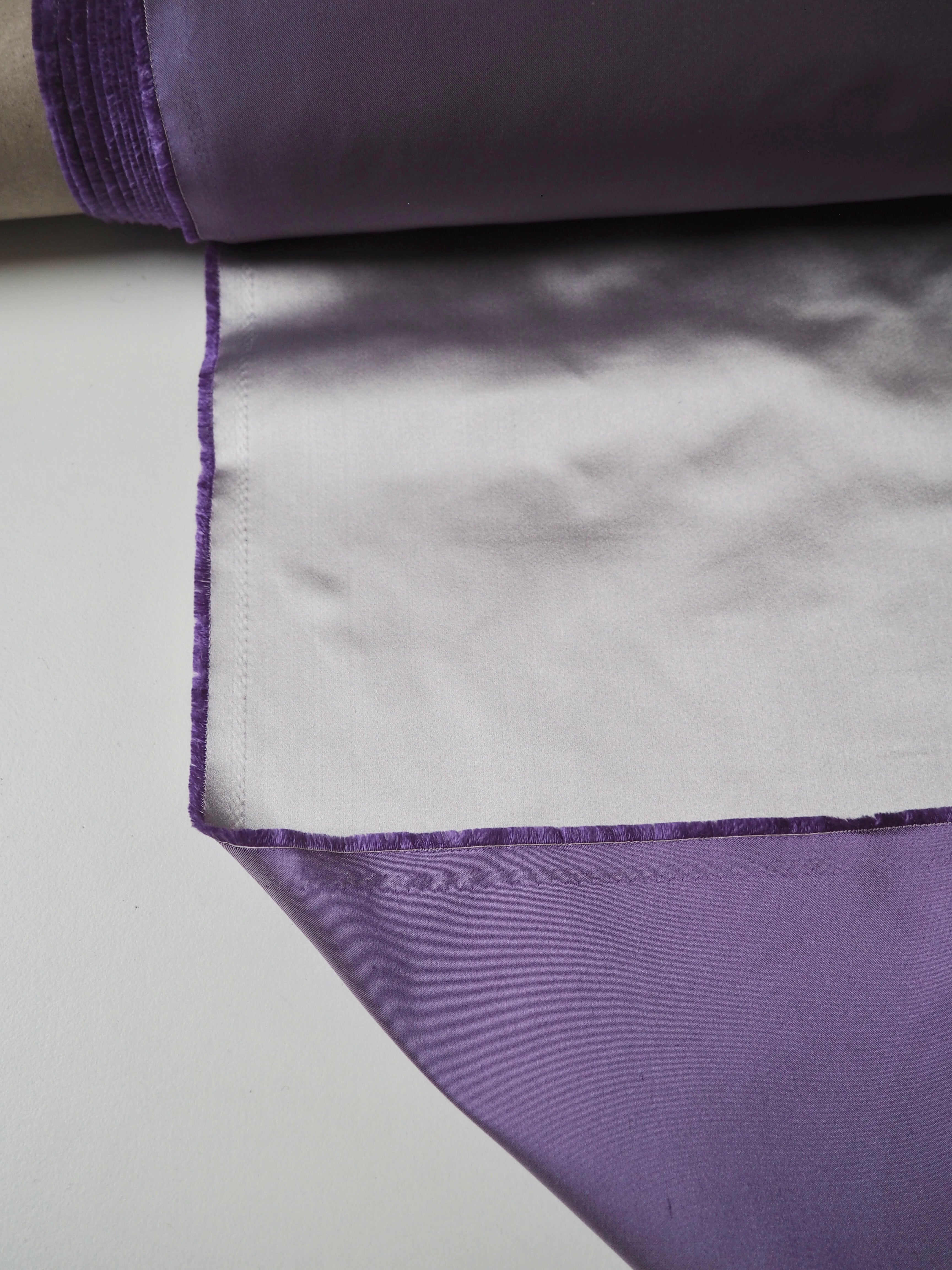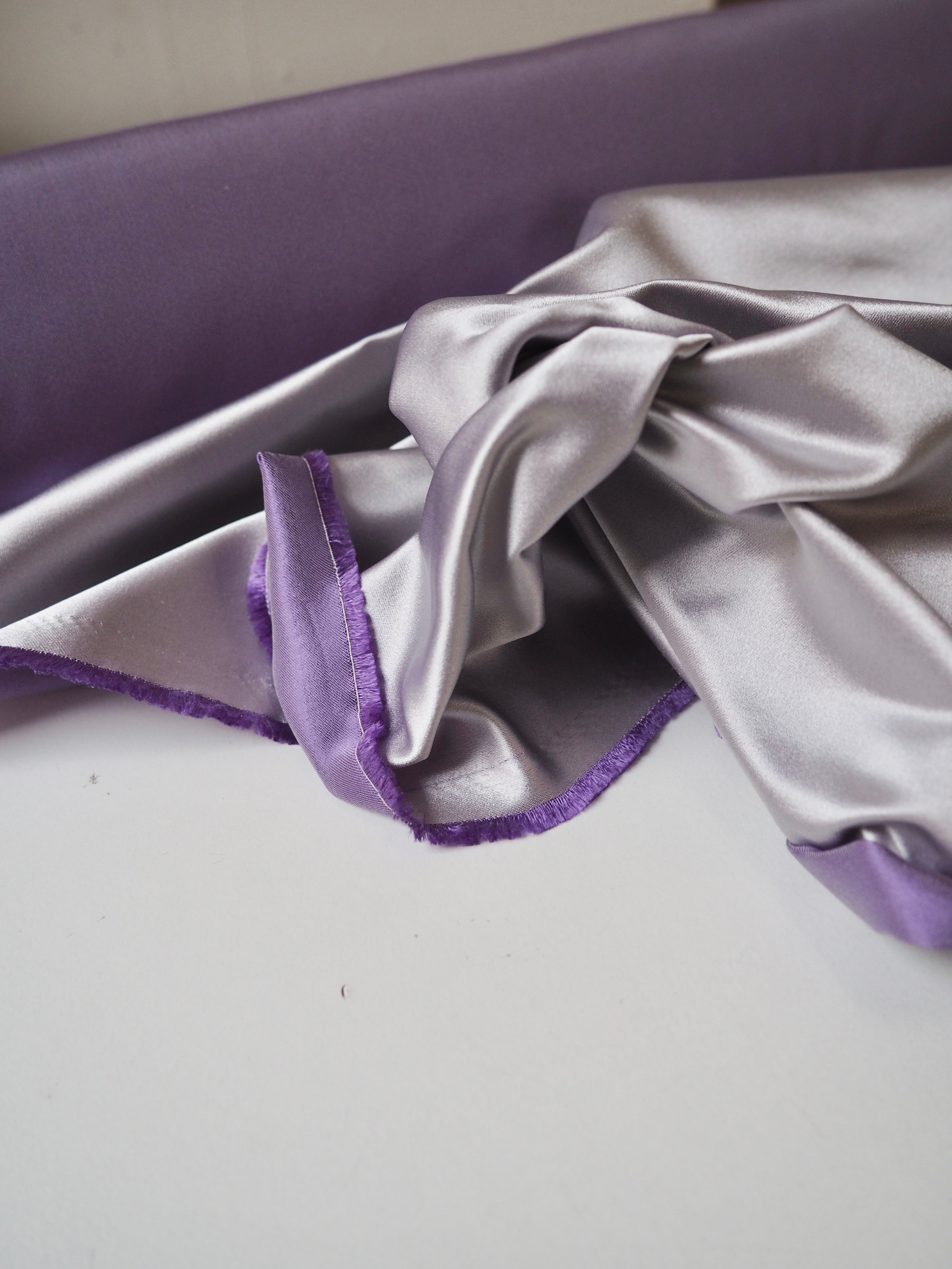 This ex-designer fabric is a gorgeous satin. It's an incredibly beautiful duchess satin, with a rich sheen lustre in lilac on the right side and a less shiny finish in a rich medium purple on the reverse. Light to medium weight with an amazing gentle structure, and the loveliest soft but silky, luxurious handle. Very sturdy and comfortable to work with. We see fitted tops or an- A-line skirt!