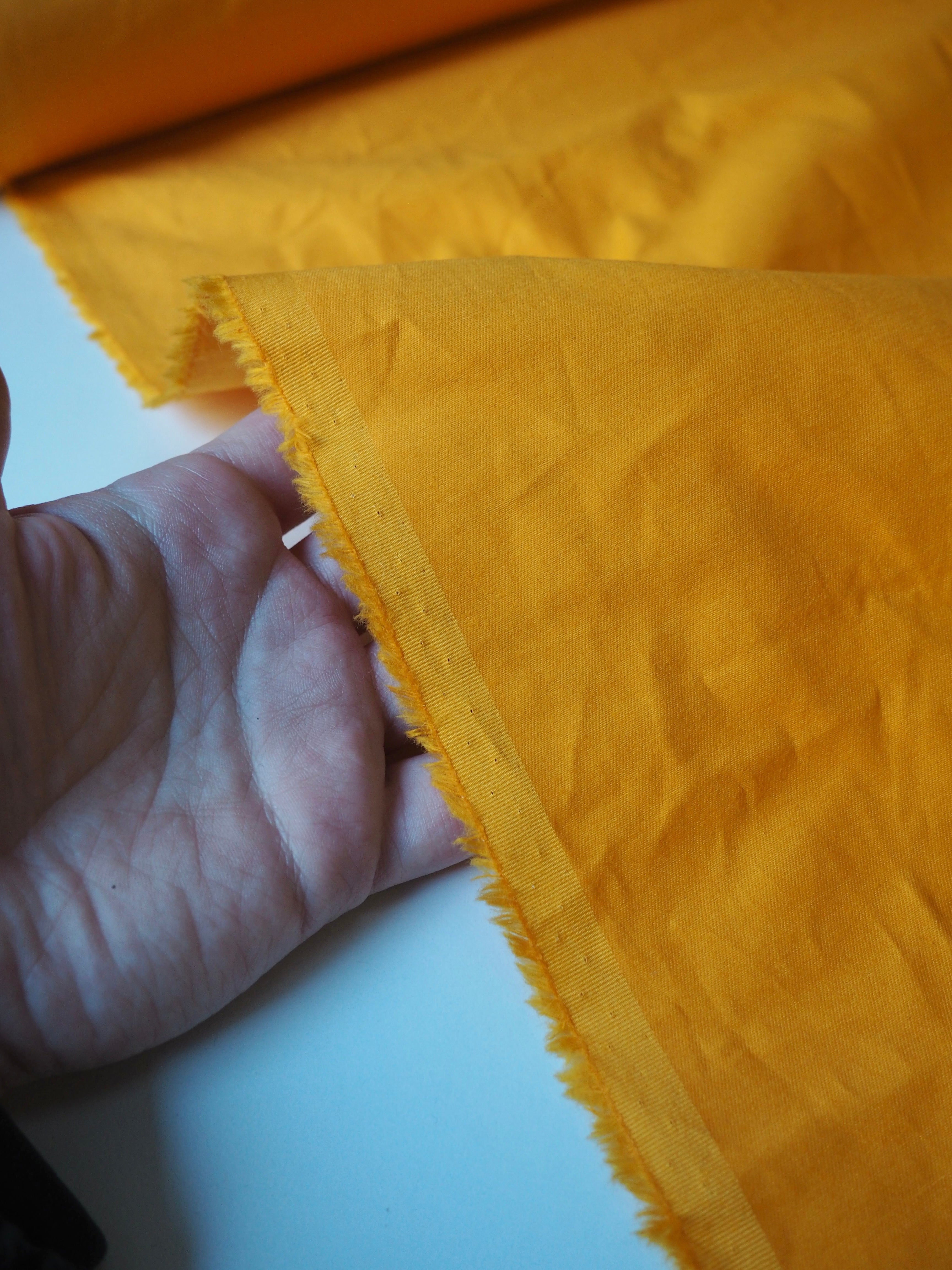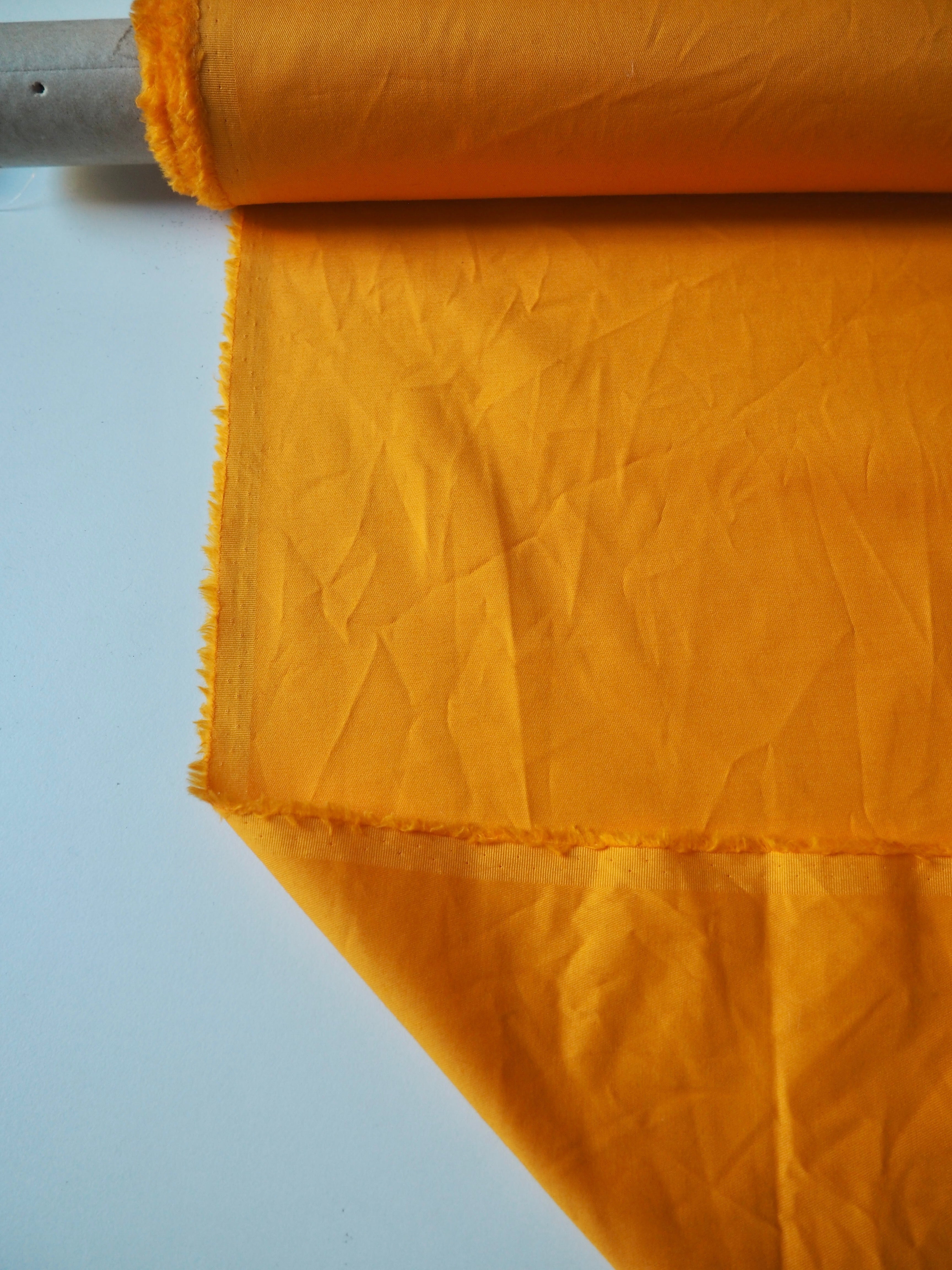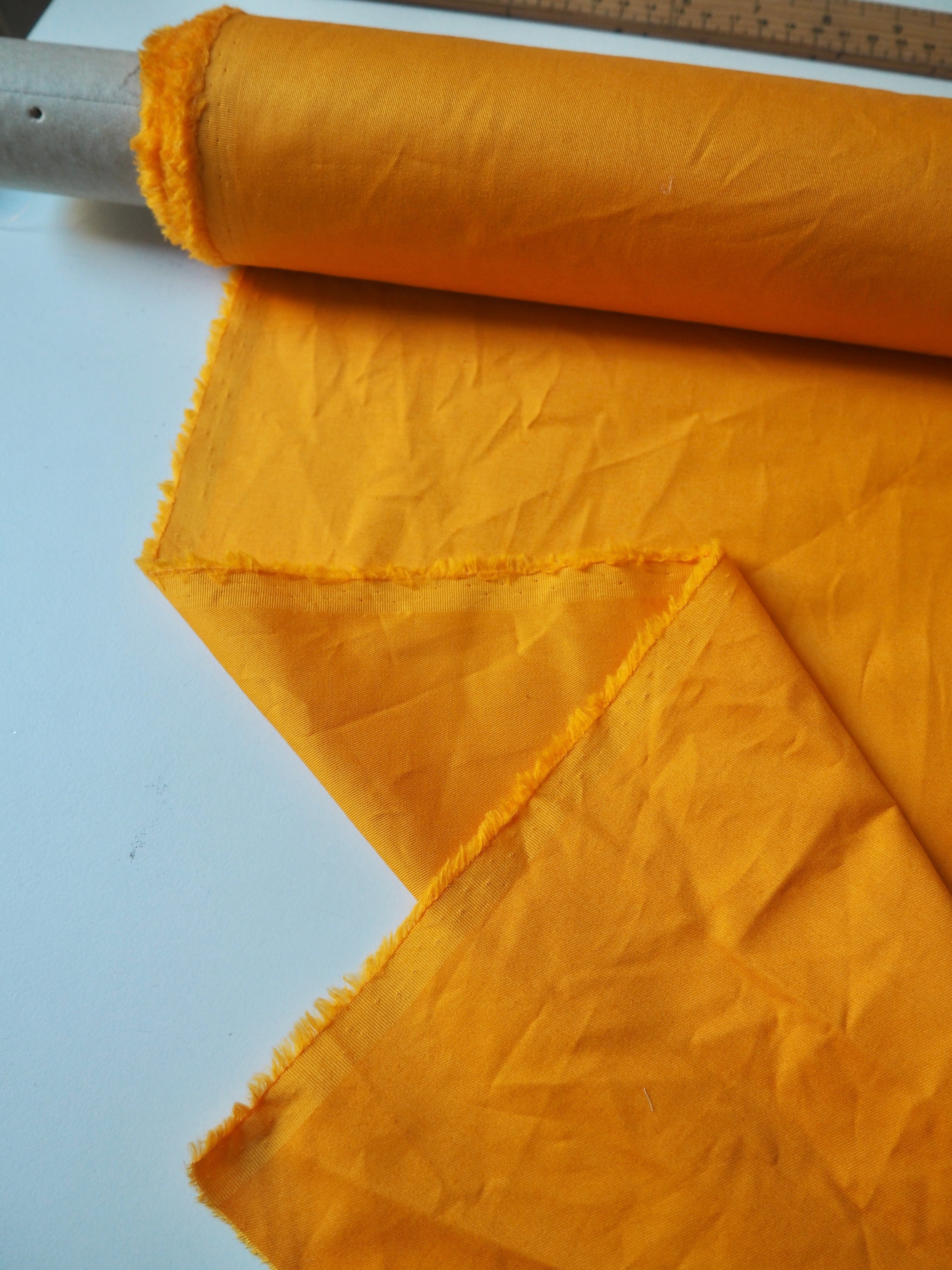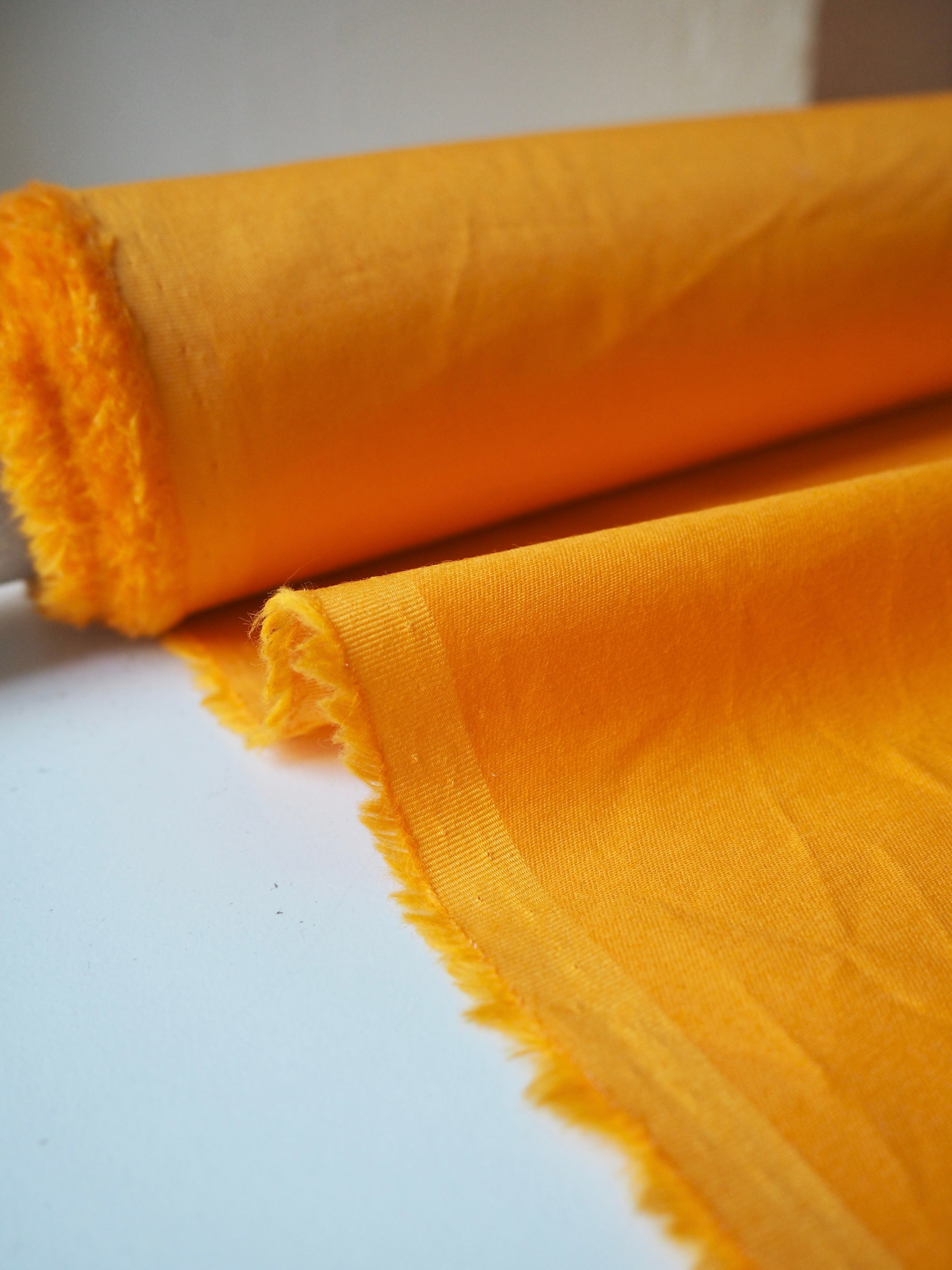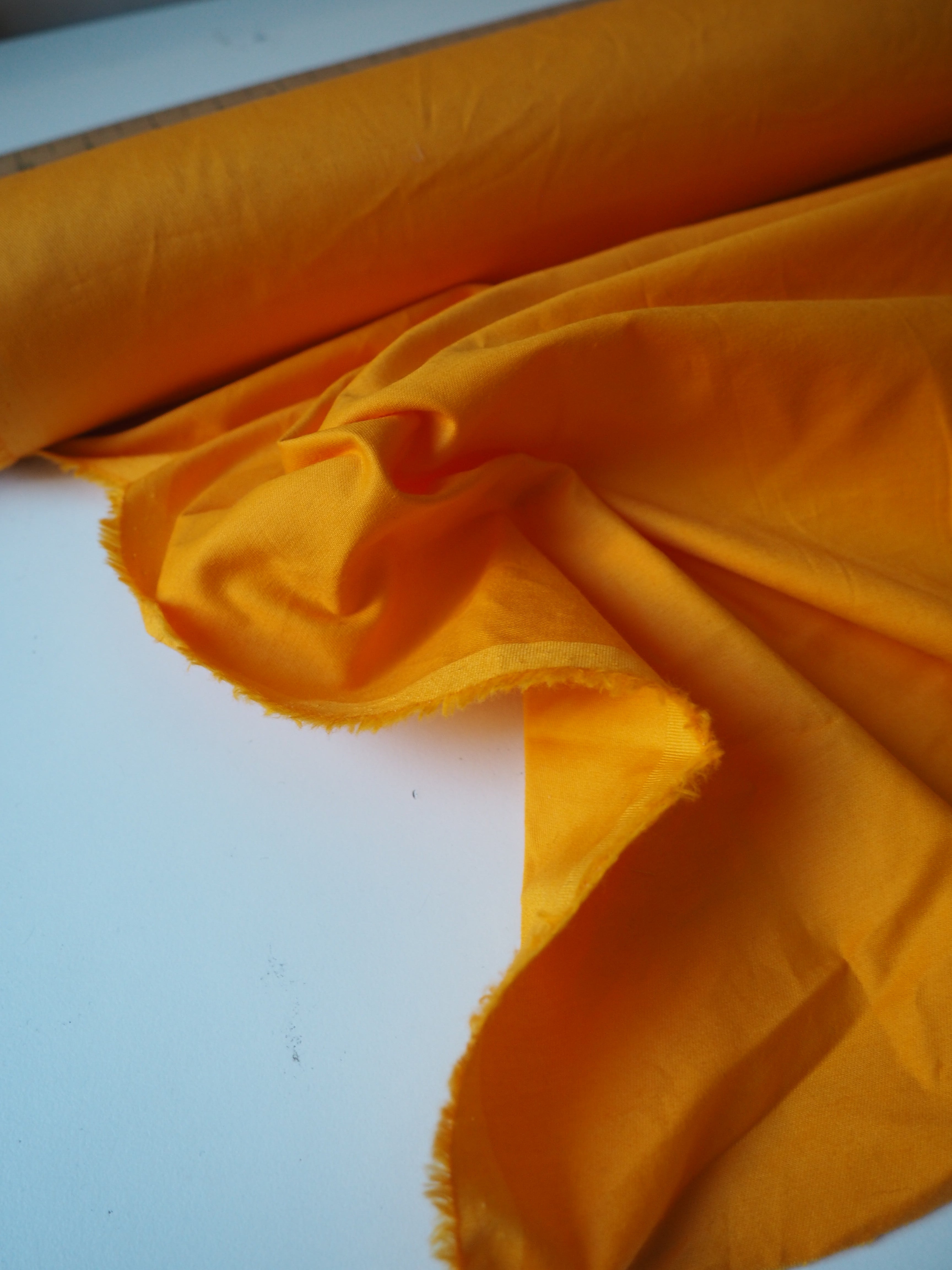 This ex-designer fabric is a soft cotton twill. It's in a mango orangey yellow shade. Lightweight with a gentle structure and subtle twill weave. Has a medium sateen sheen and slight stretch, about 10%. Beautiful handle and wonderful quality for a variety of projects. Perfect for a Lunar Jacket and hard-wearing staples!