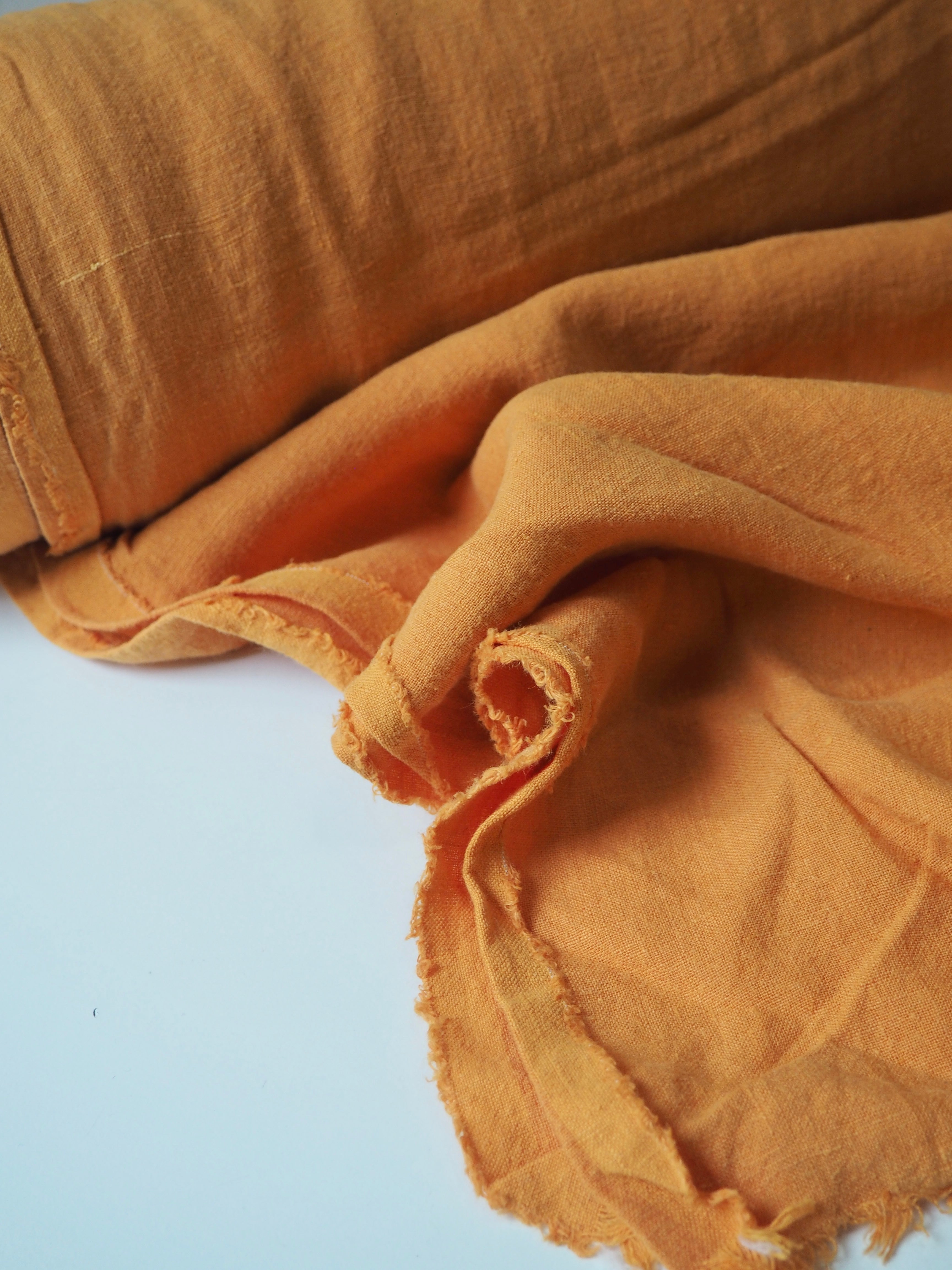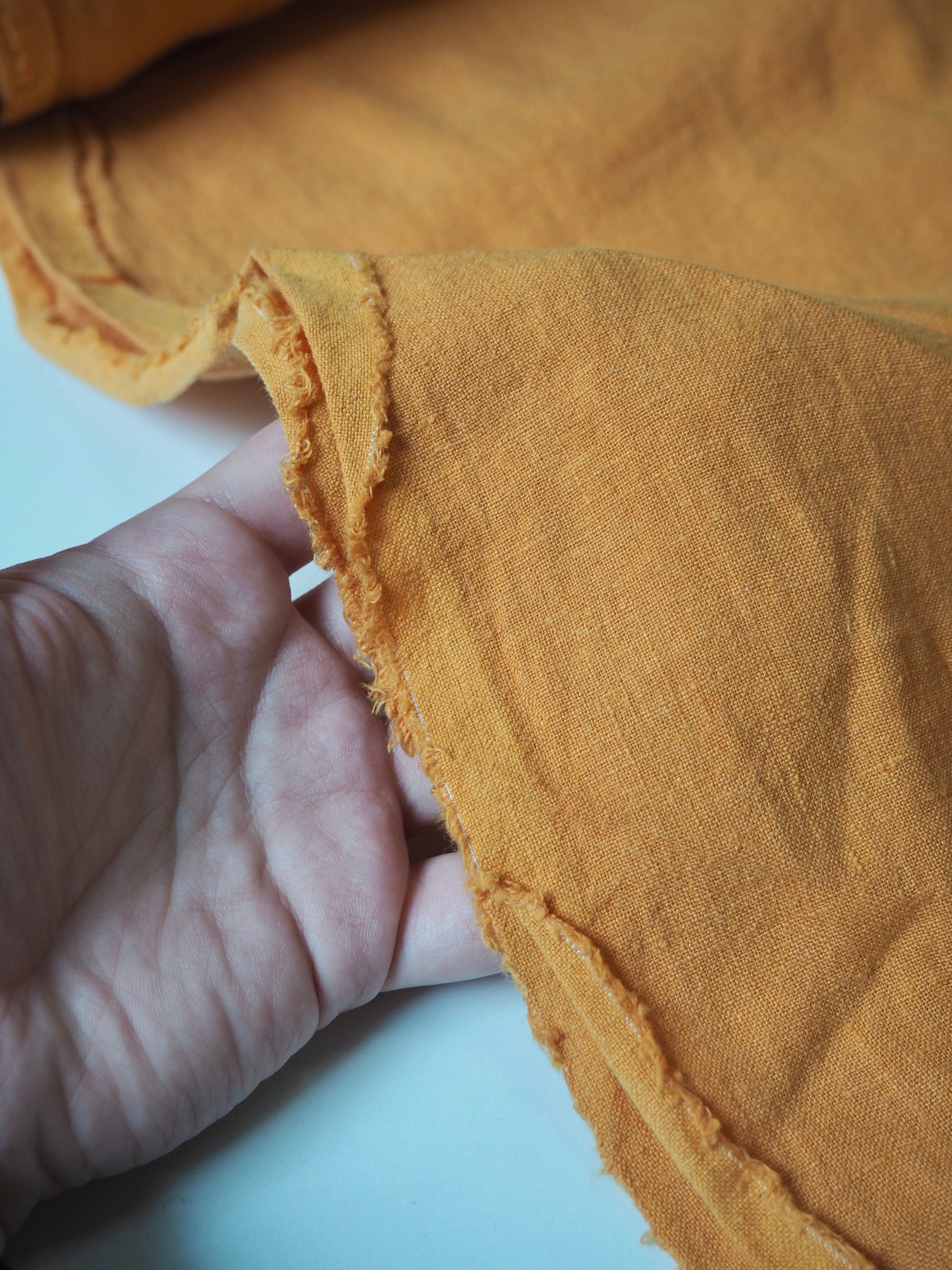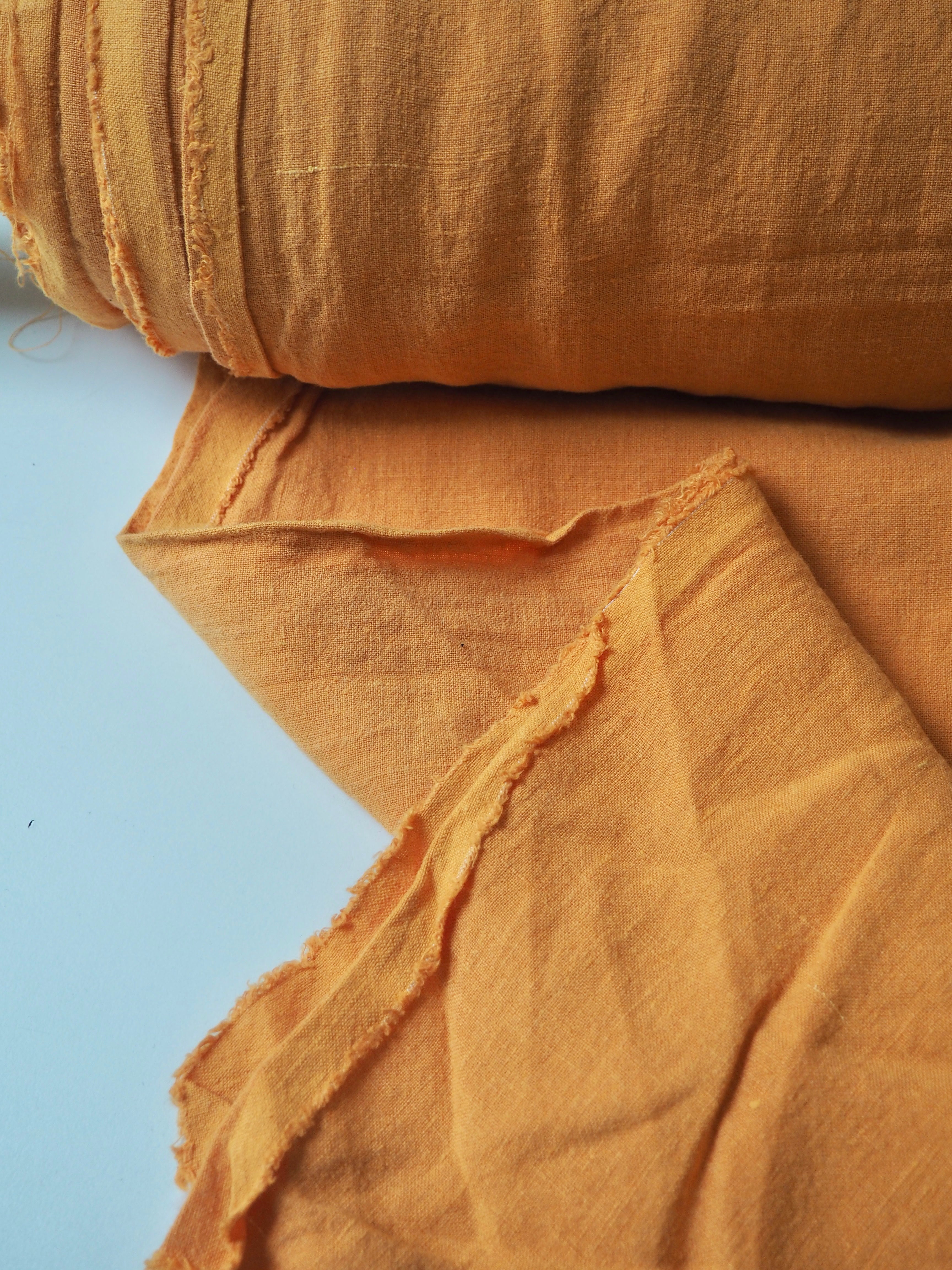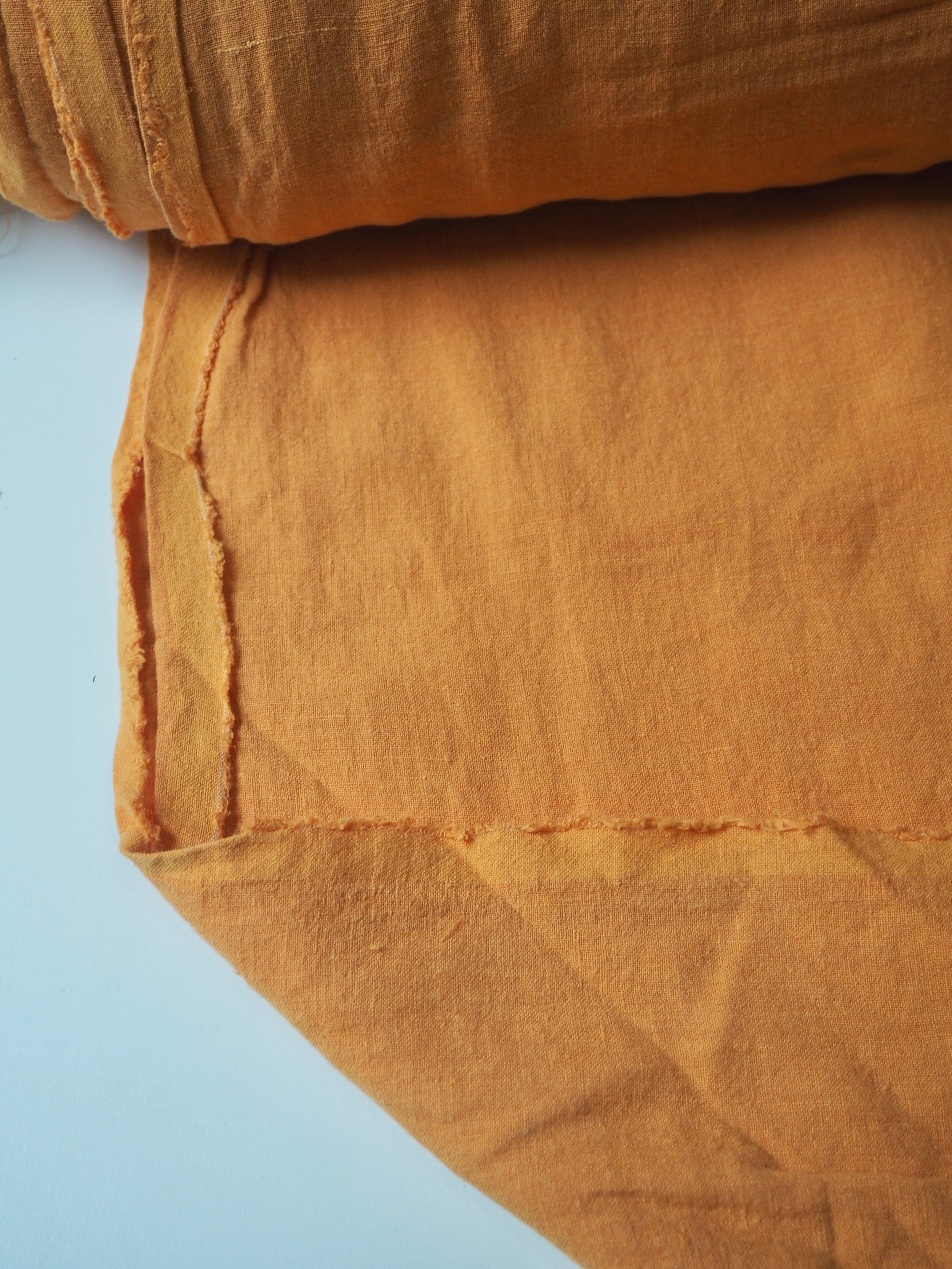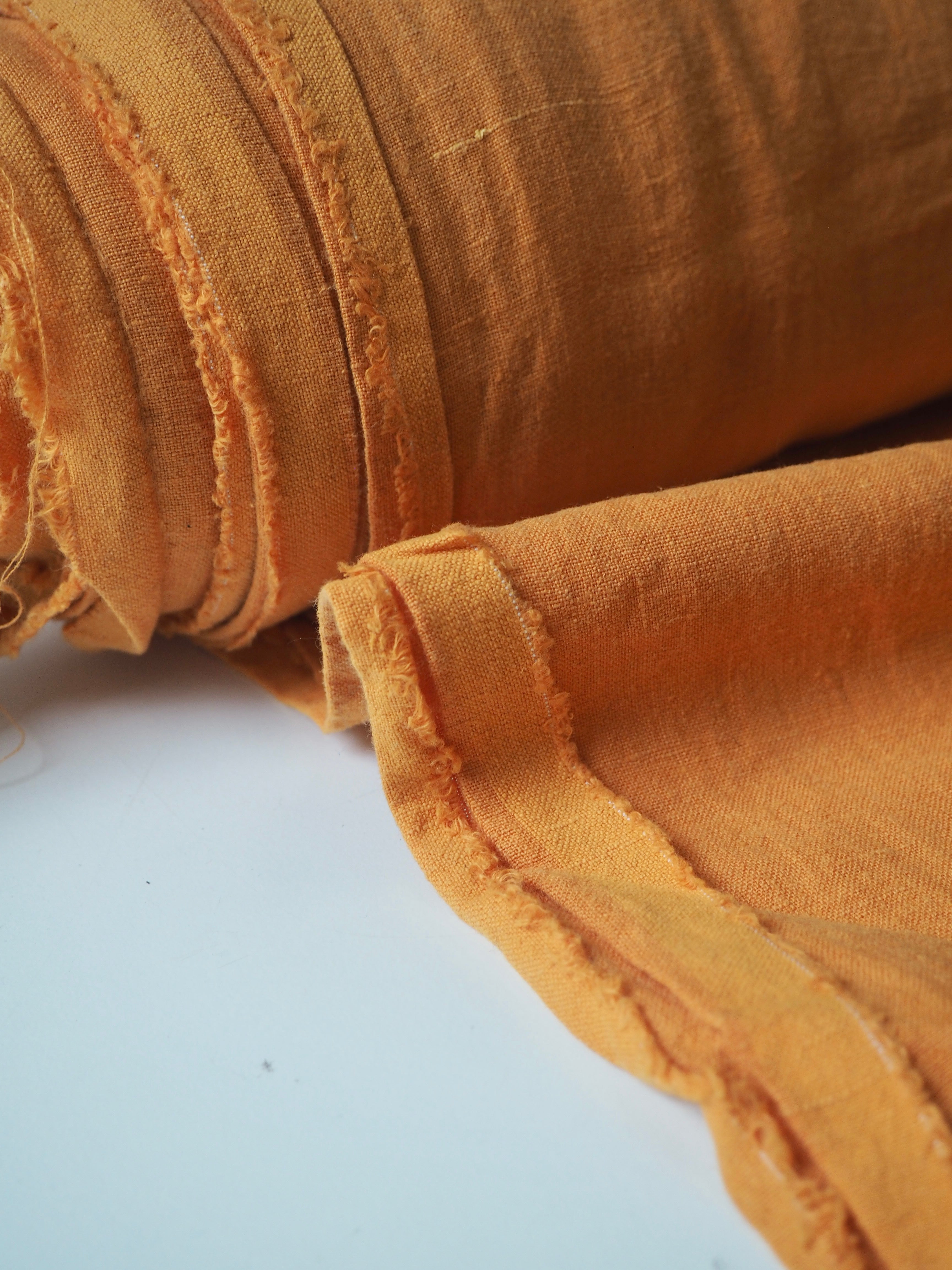 This ex-designer fabric is a lovely linen. It's a marigold orange colourway. It has a soft and gentle linen weave with a typical linen texture, and a brilliant handle that's so wearable. Lightweight with a gentle structured drape, and fully opaque. From popular London-based brand Beyond Nine. Lovely for a bias dress of skirt, summer tops or Everyday Trousers!
