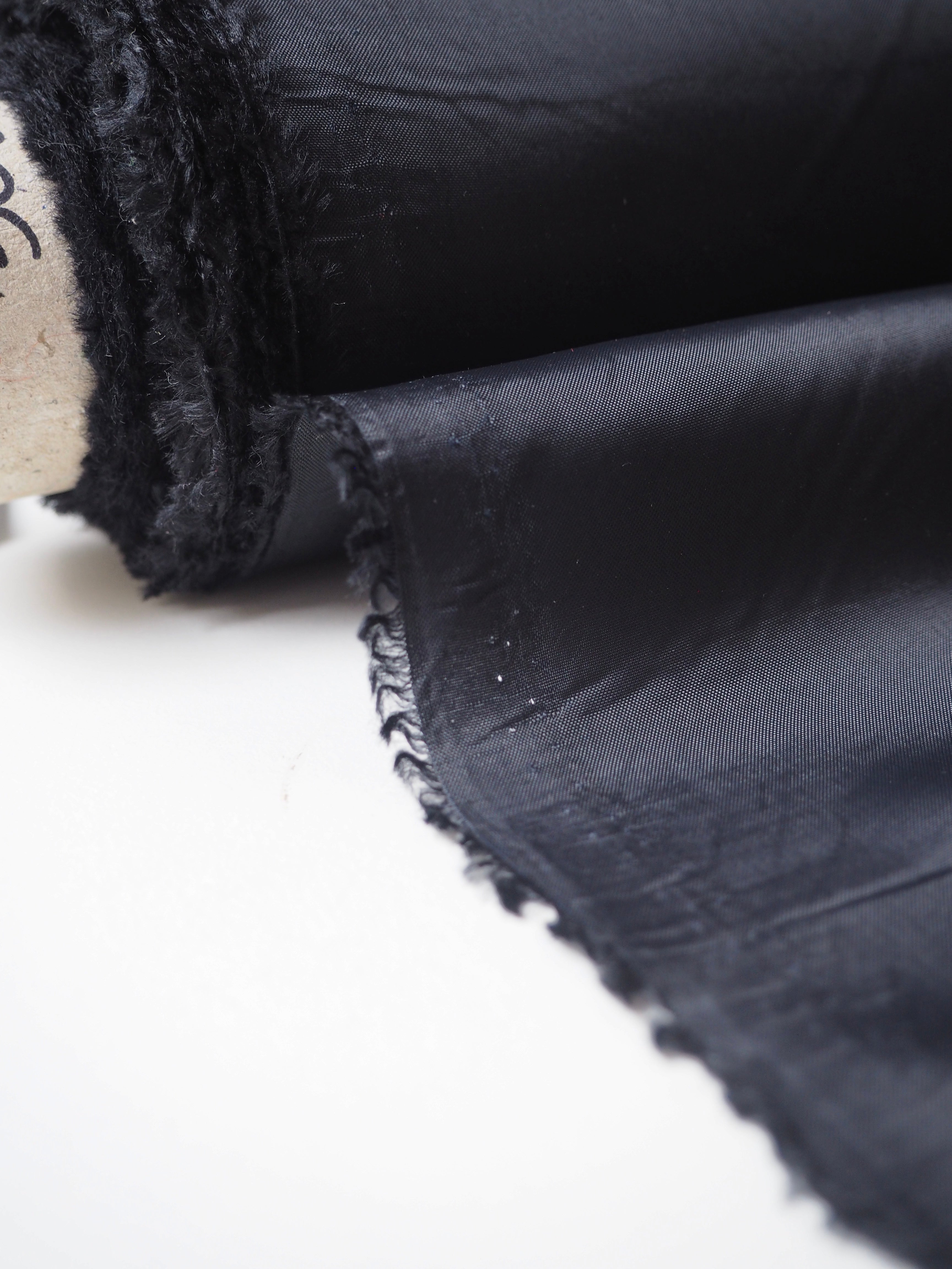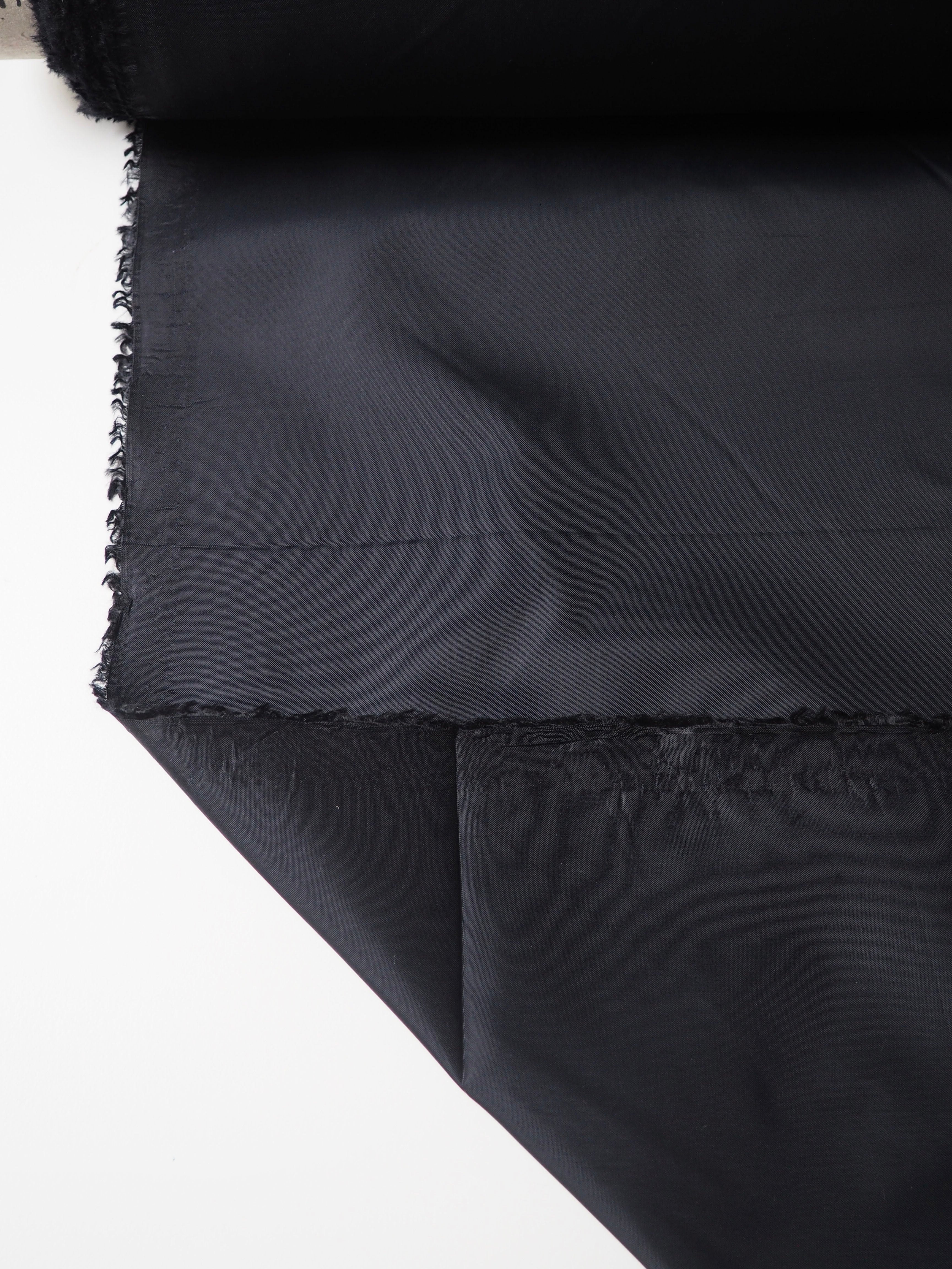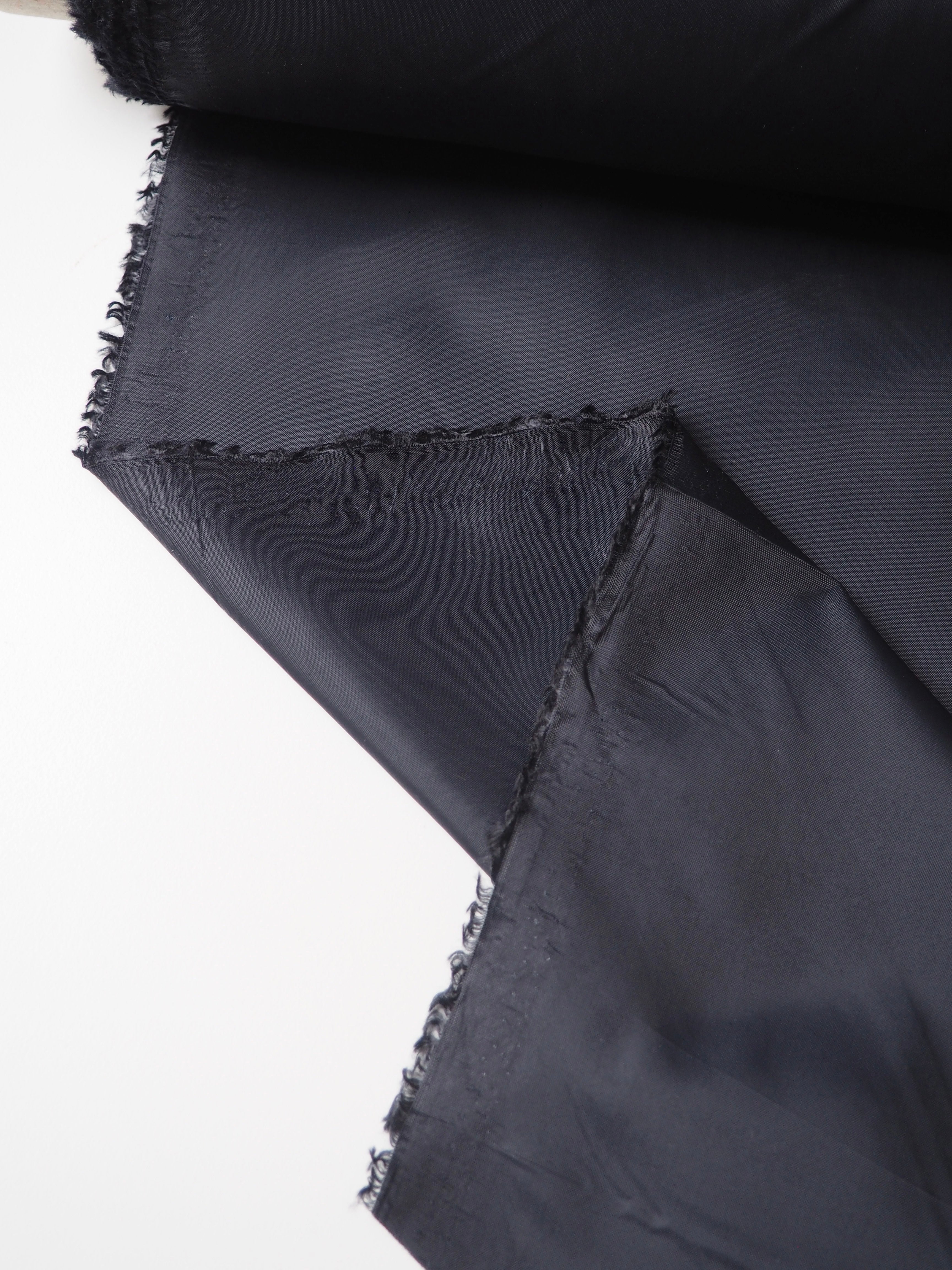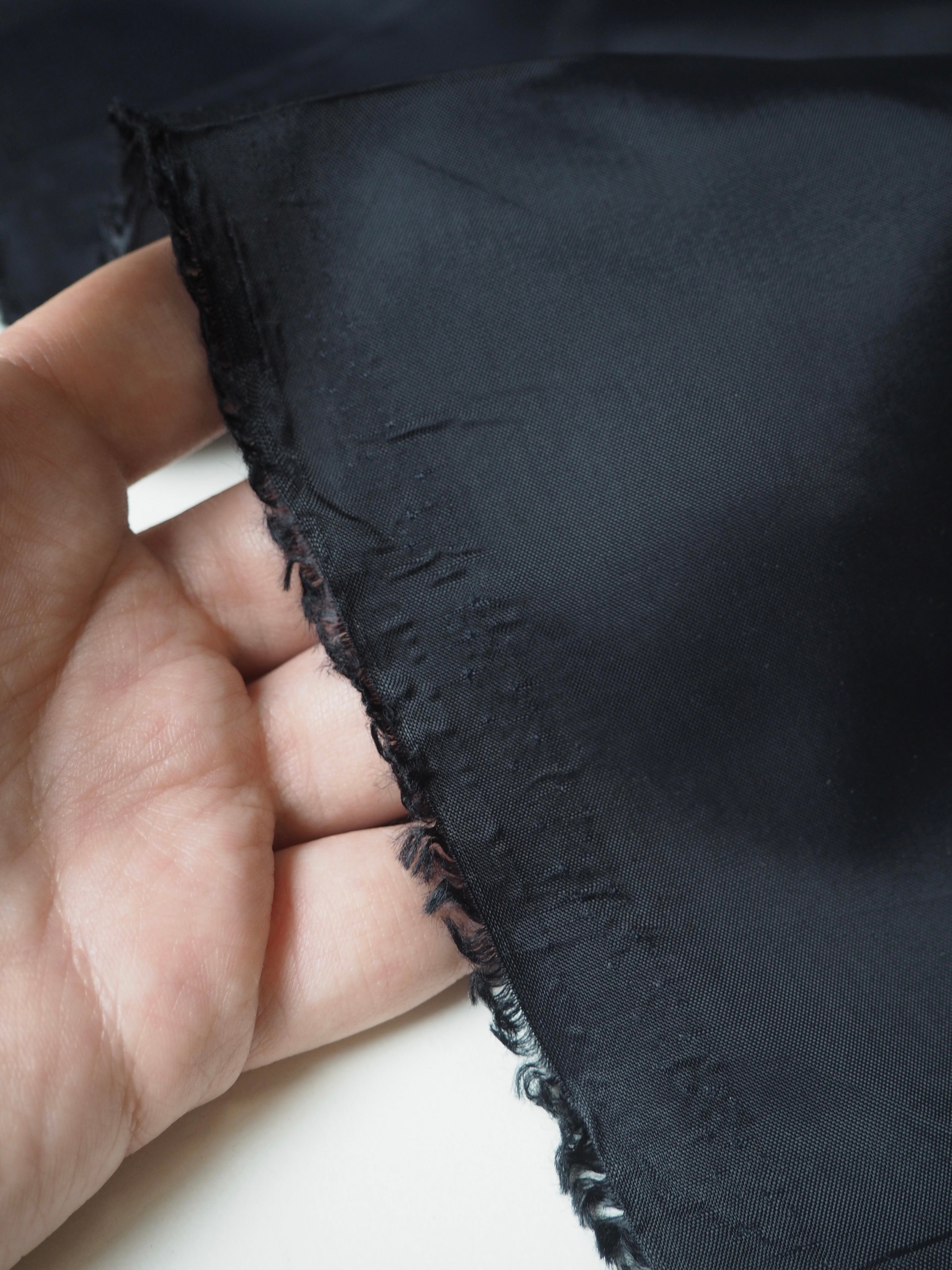 This ex-designer fabric is a smooth nylon. It has a medium sheen, with a crisp handle and super smooth finish. Has a nice, light structure, is opaque, and is super lightweight. Great for bags and technical jackets, or as a lining!