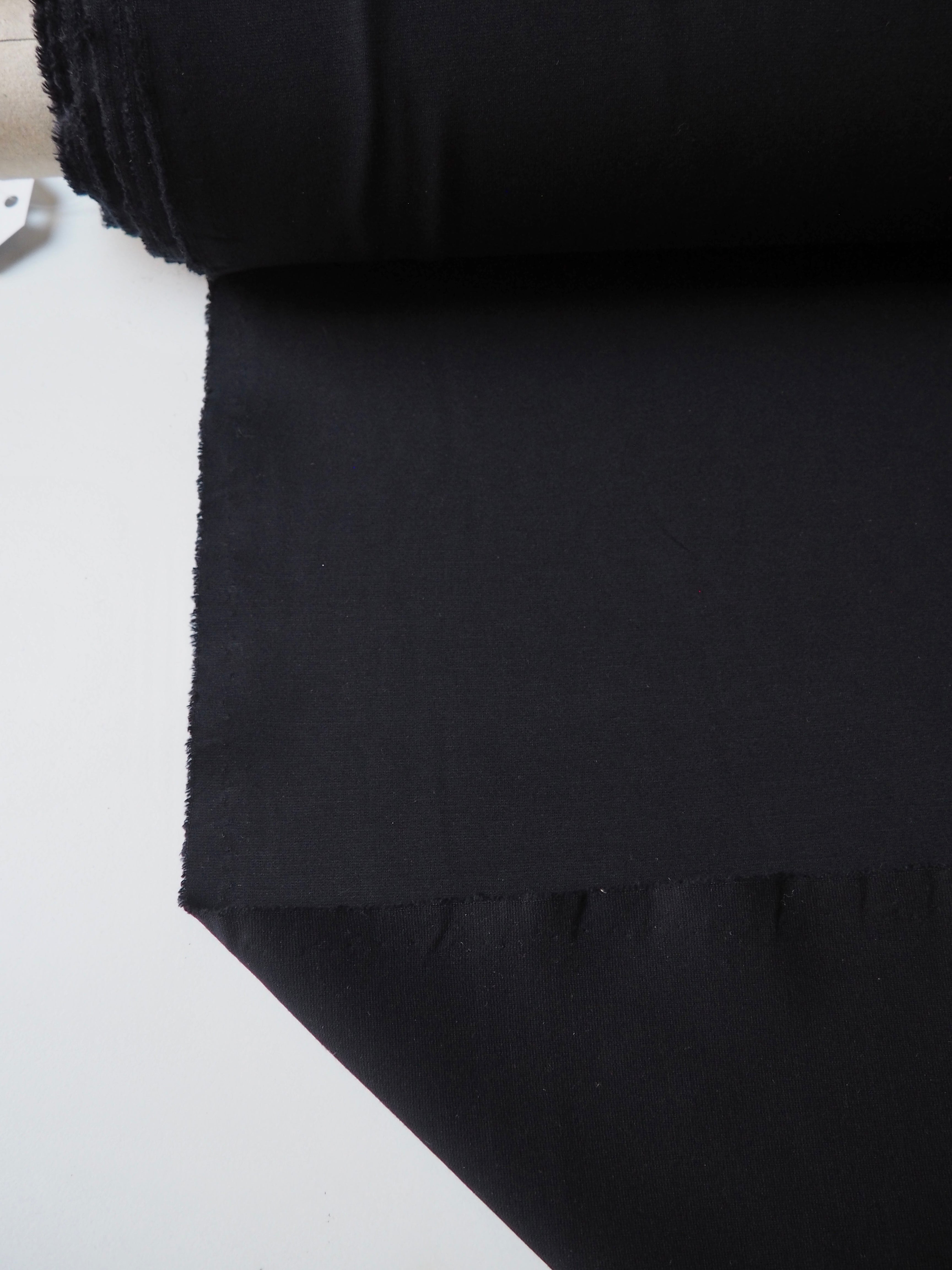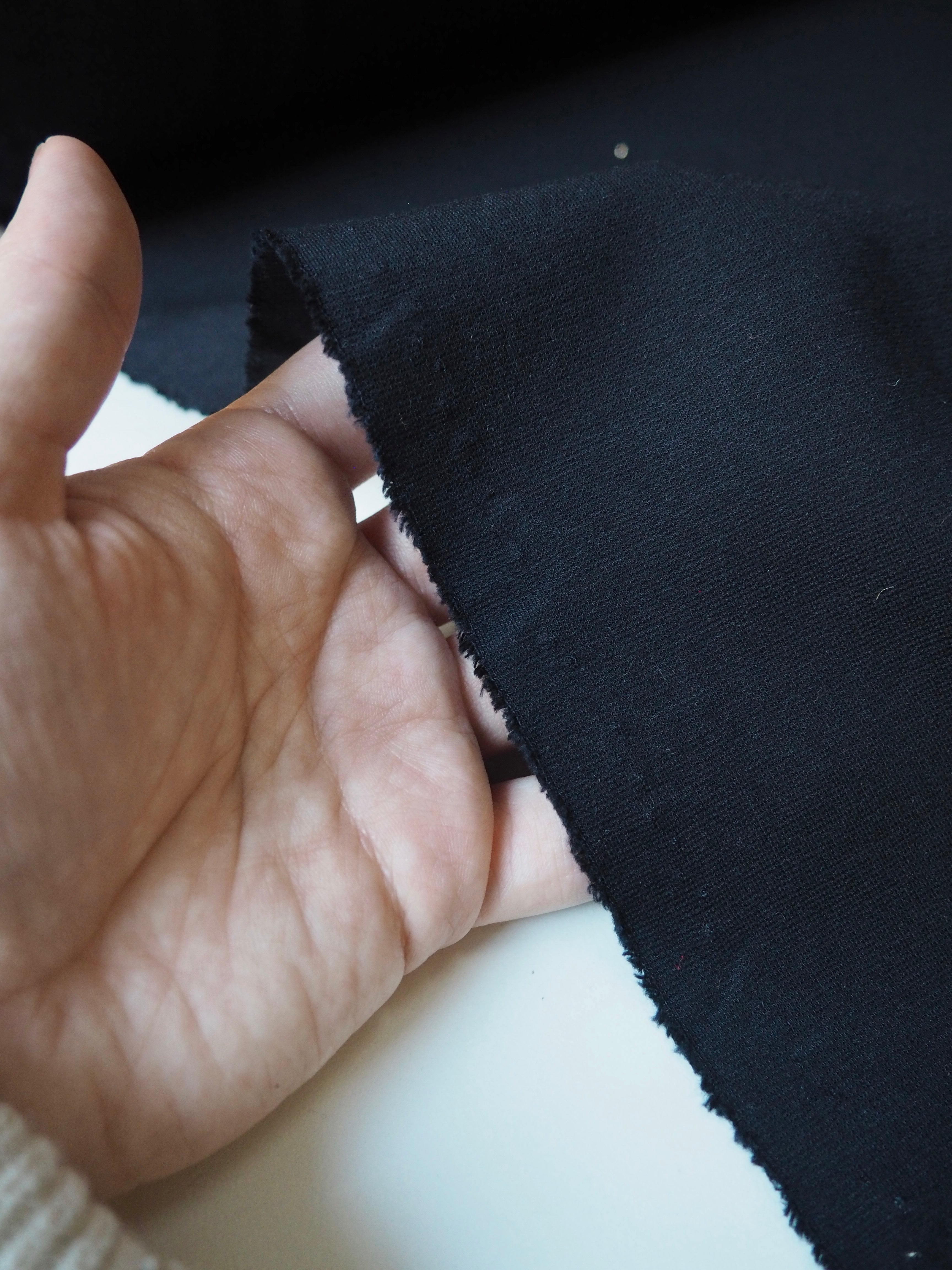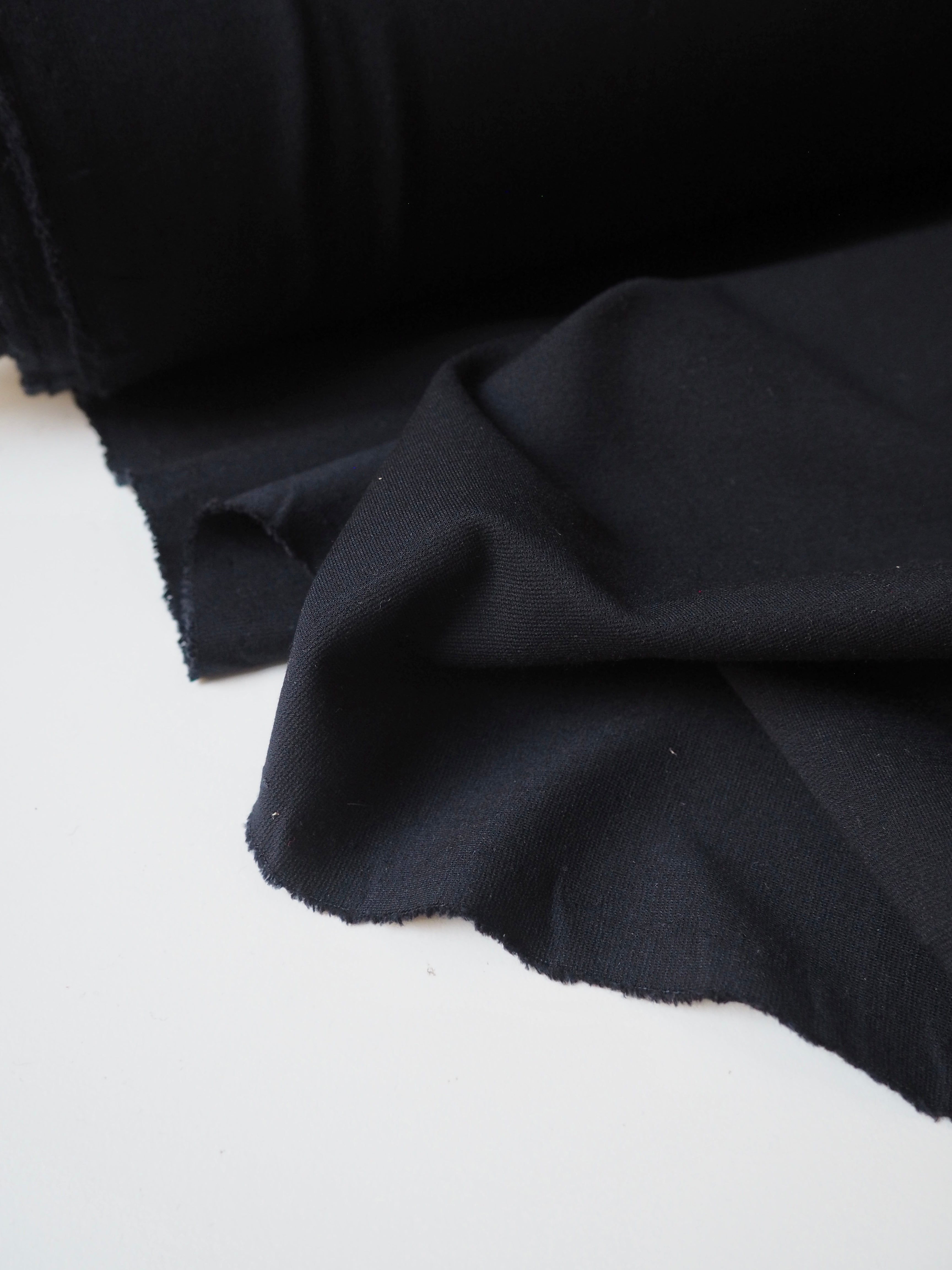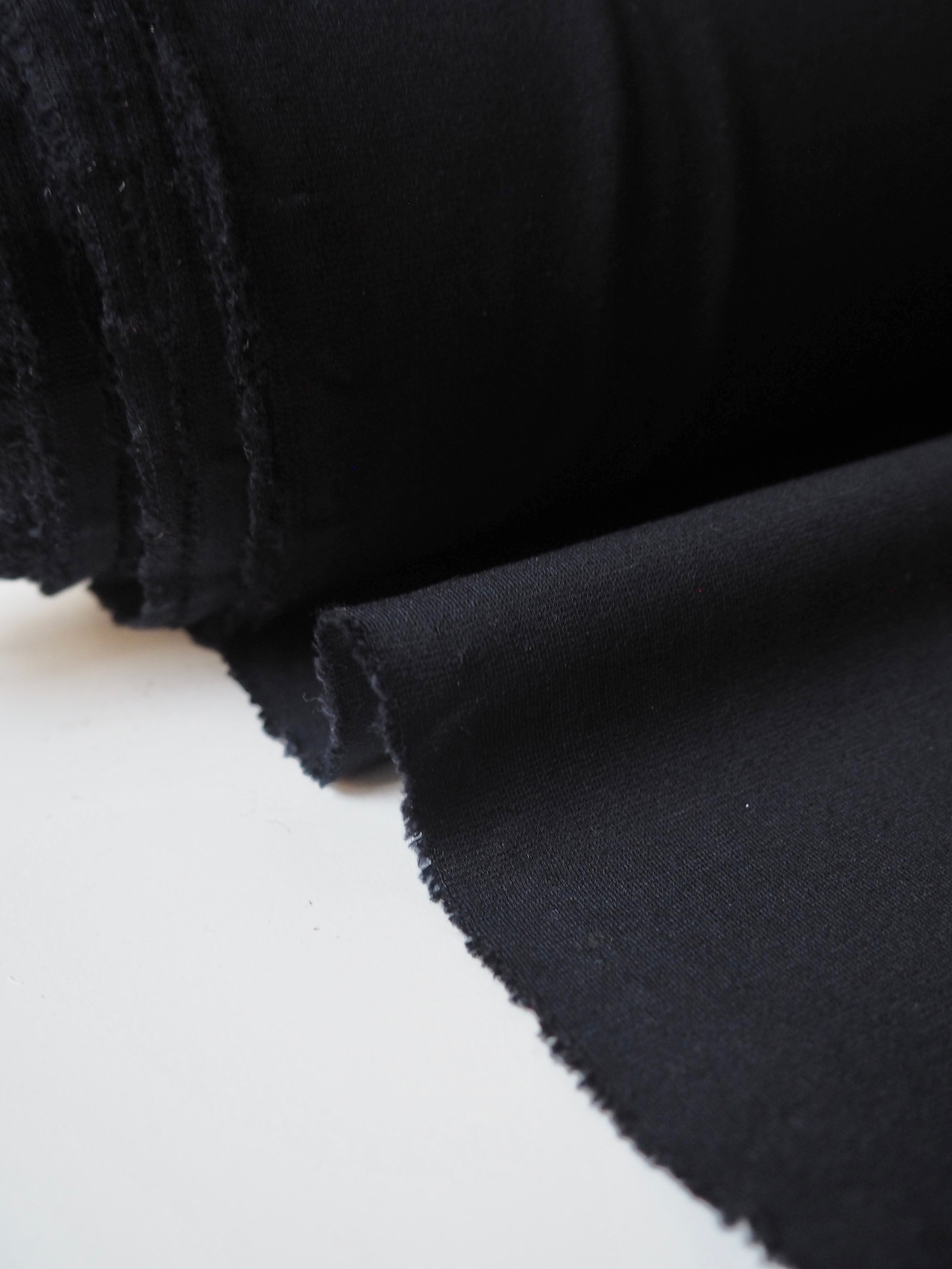 This ex-designer fabric is a jersey. Ponte di Roma is a double interlock jersey with a medium weight. It's quite dense, and has a great structure to play with. It has a very soft and lovely handle. Has a good 40% stretch both ways, and great recovery. Perfect for staple pieces!