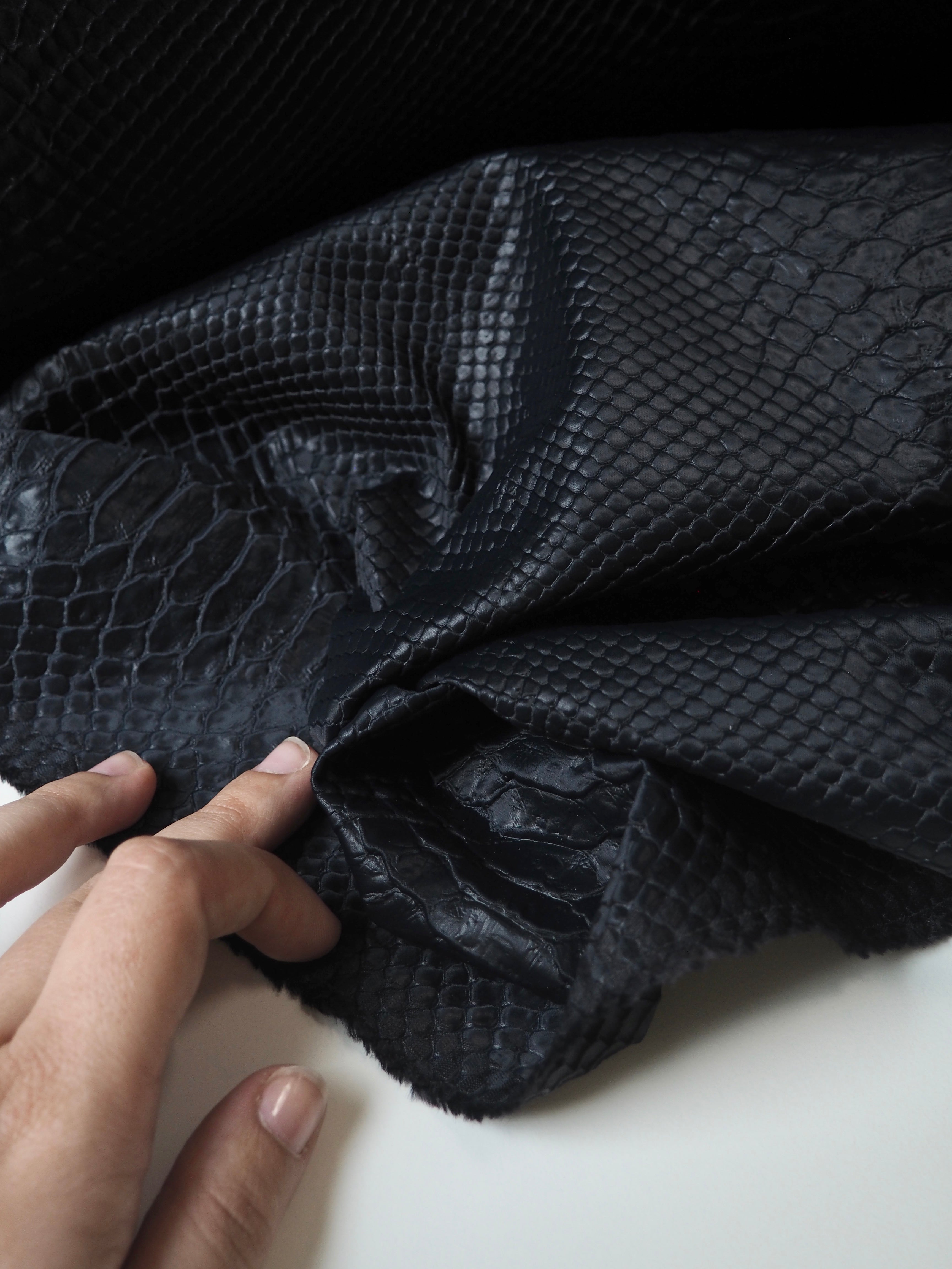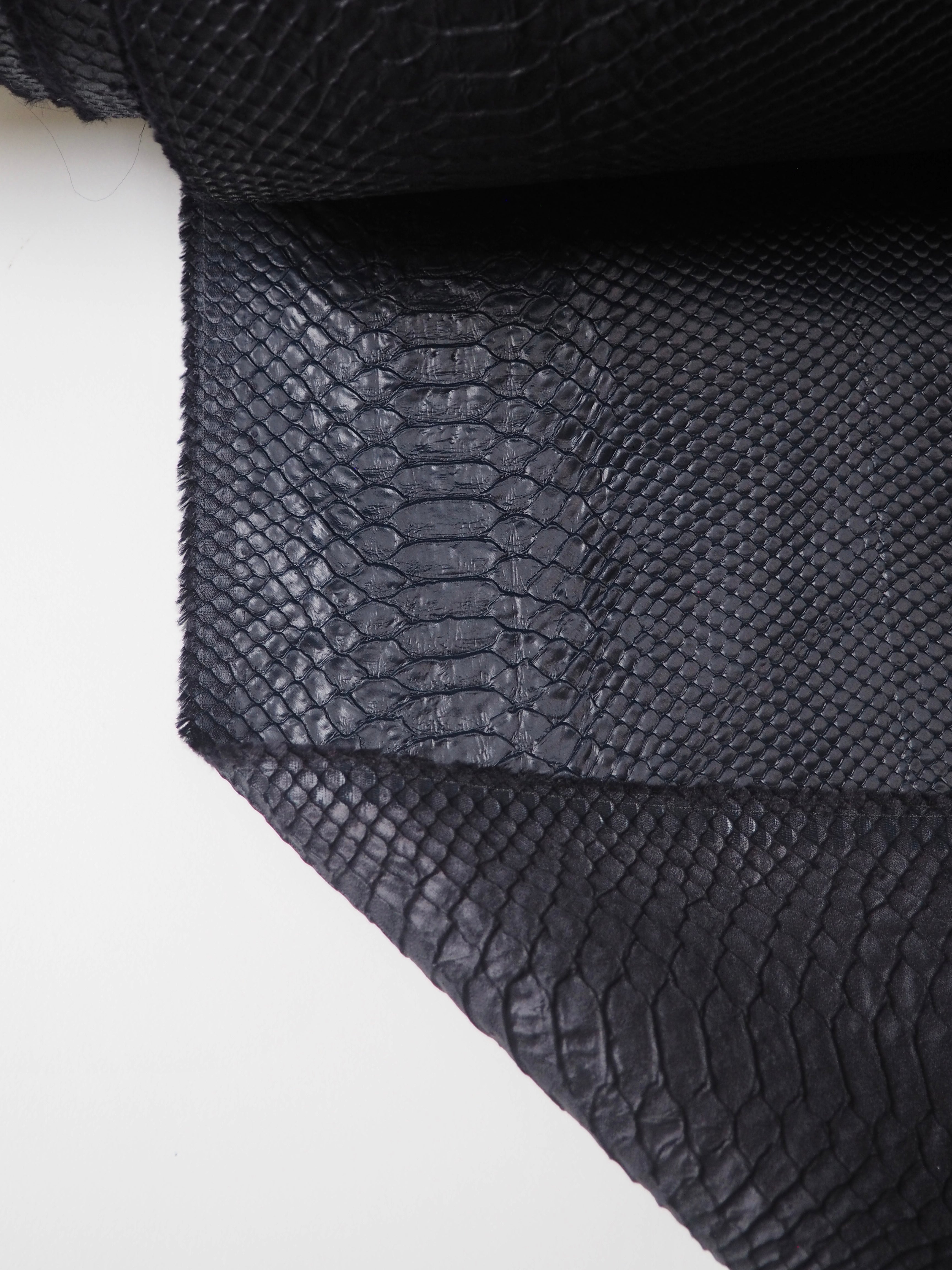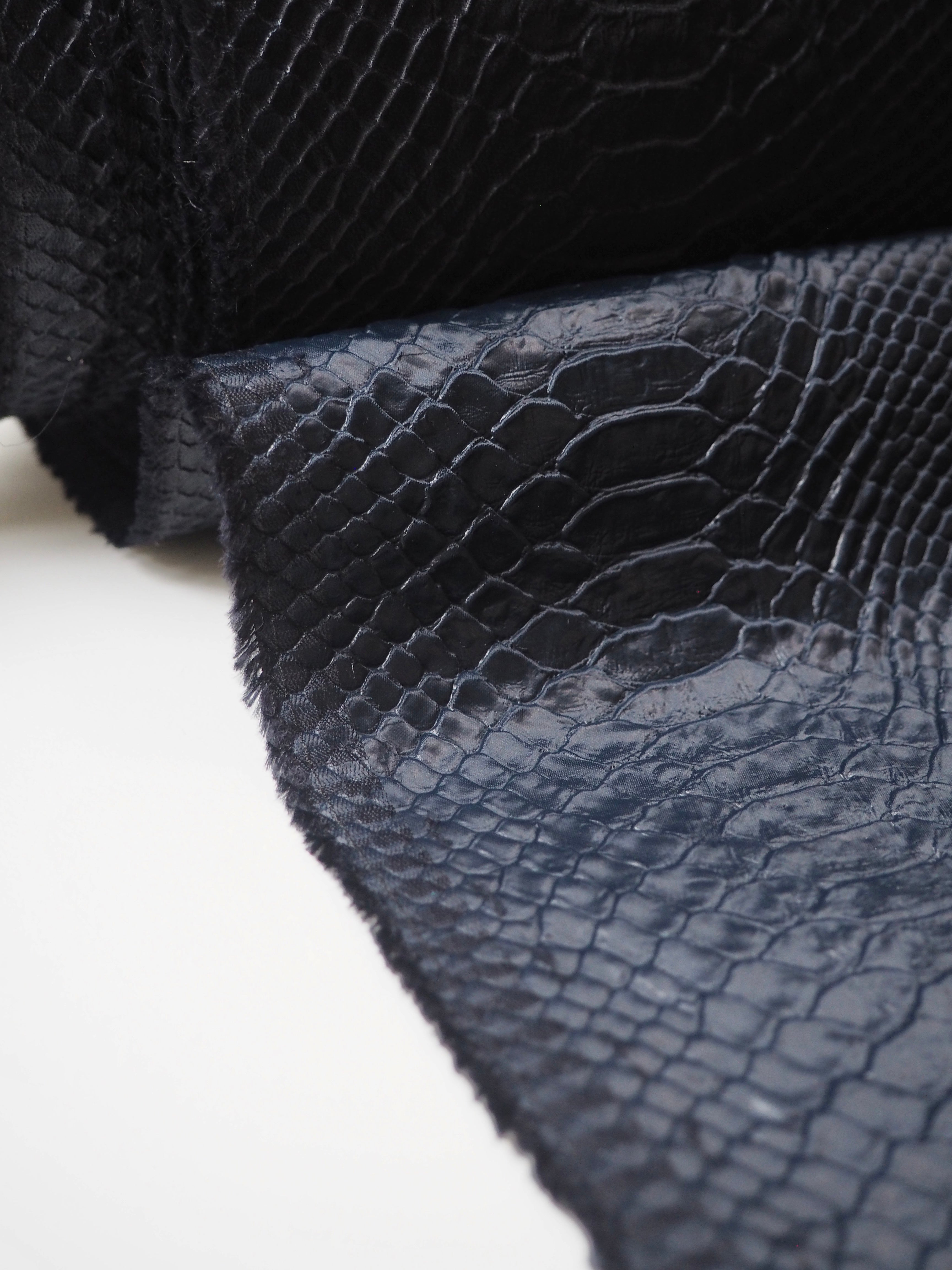 This ex-designer fabric is a unique cloth! It's a viscose/acetate blend, with a python embossed texture in repeating pattern. It has a medium shine, with a fantastic texture. Has a crisp, rustle-y handle and great structure. Perfect for a bag, jacket, or home project!