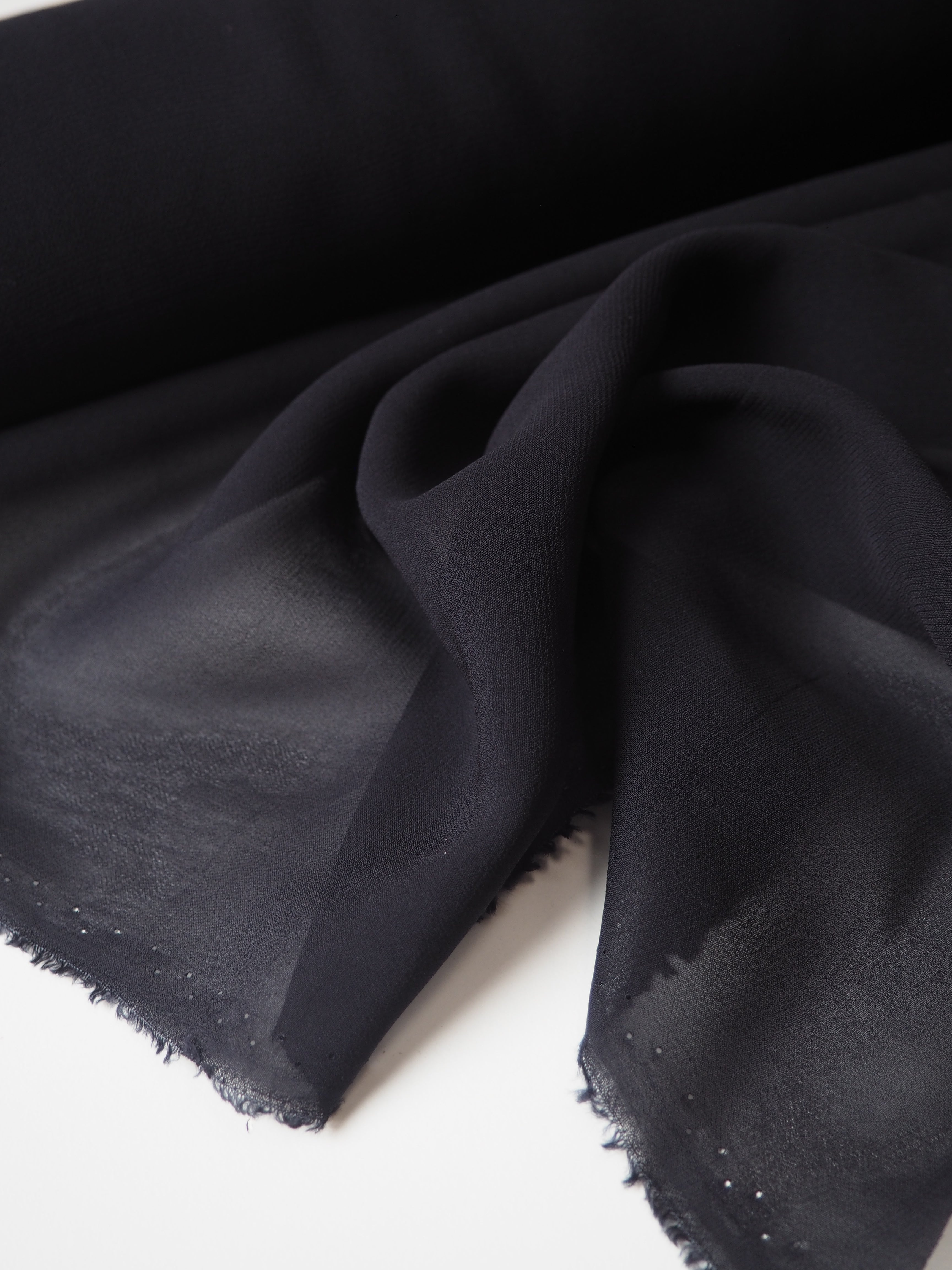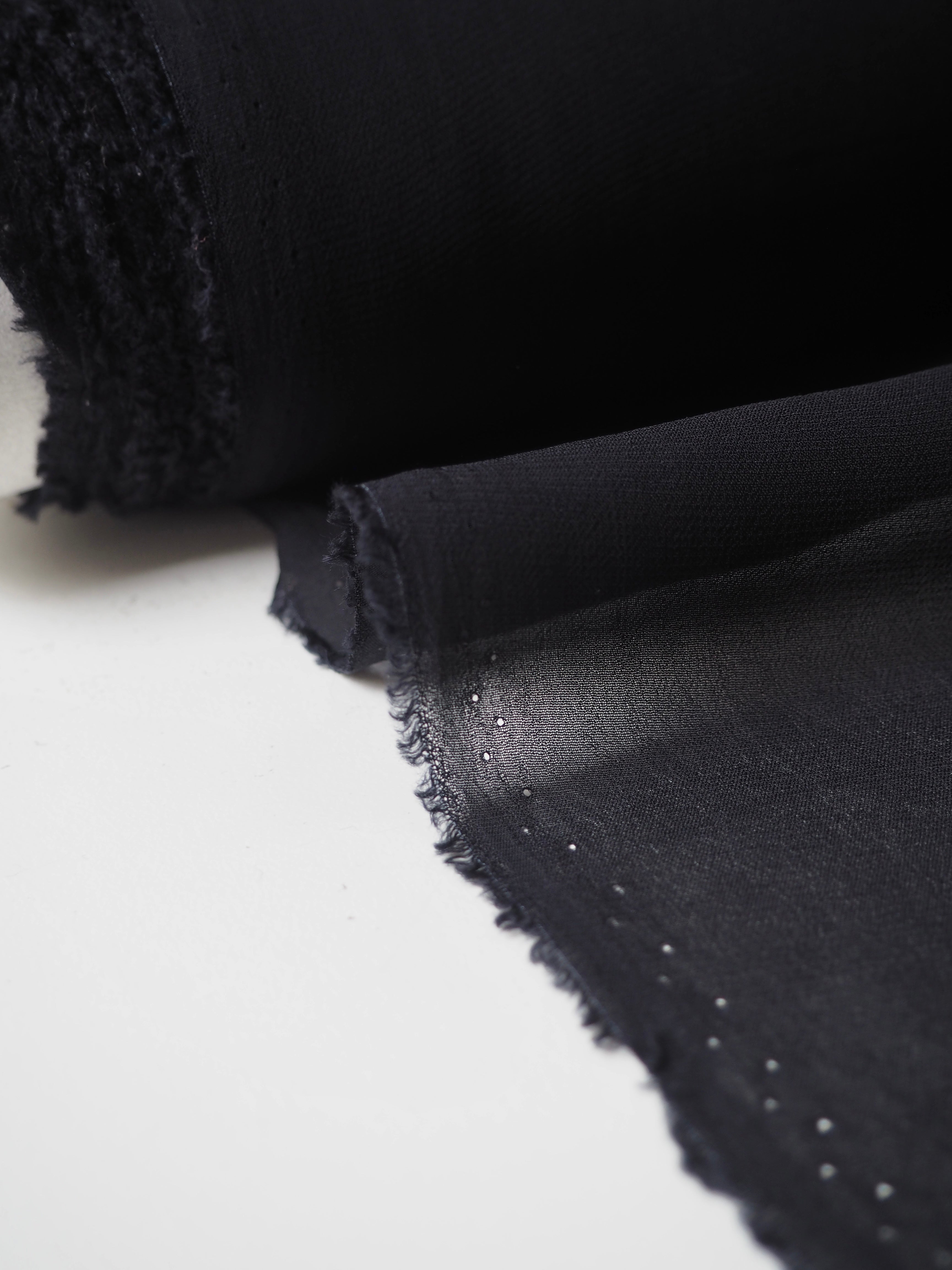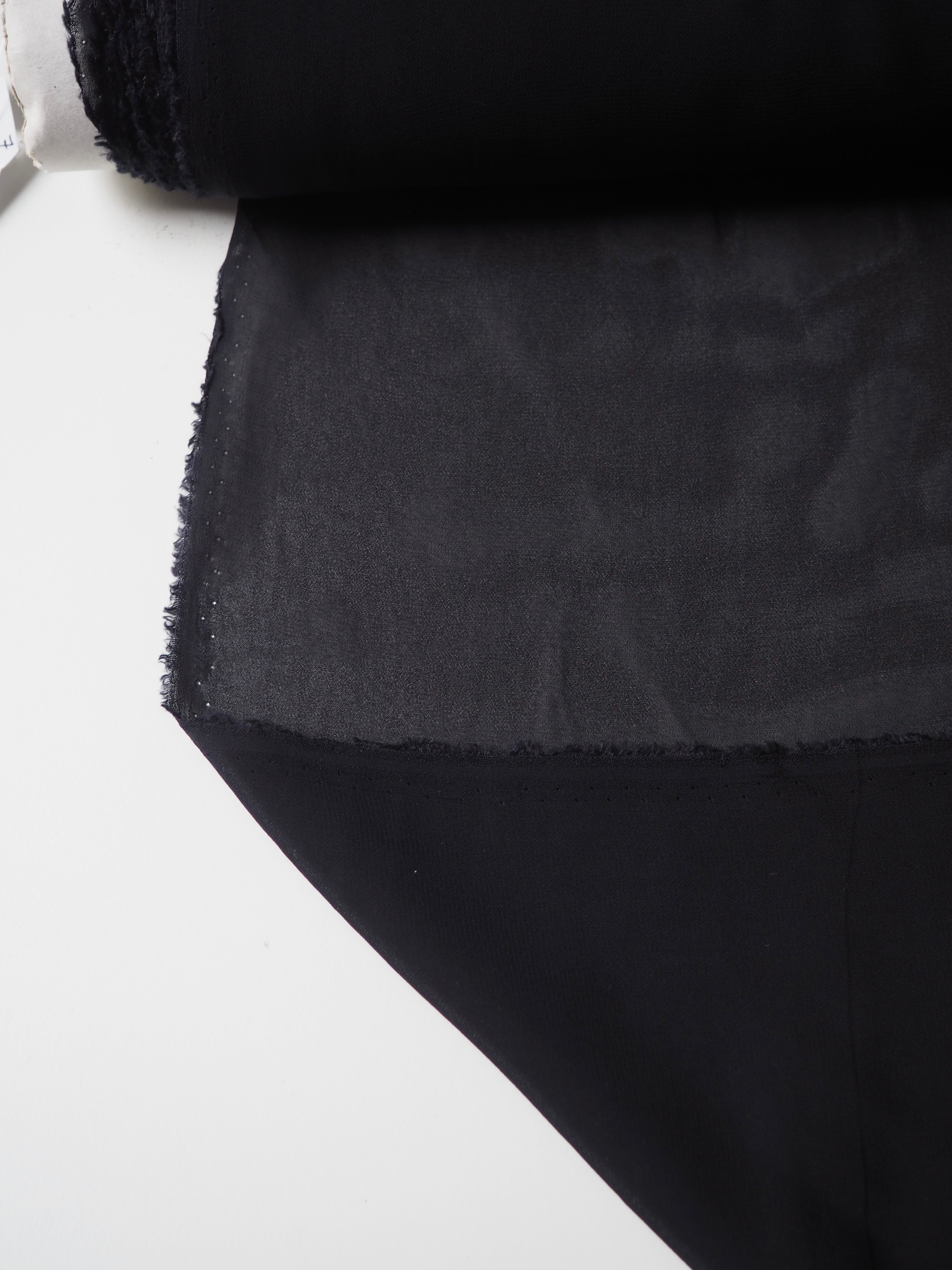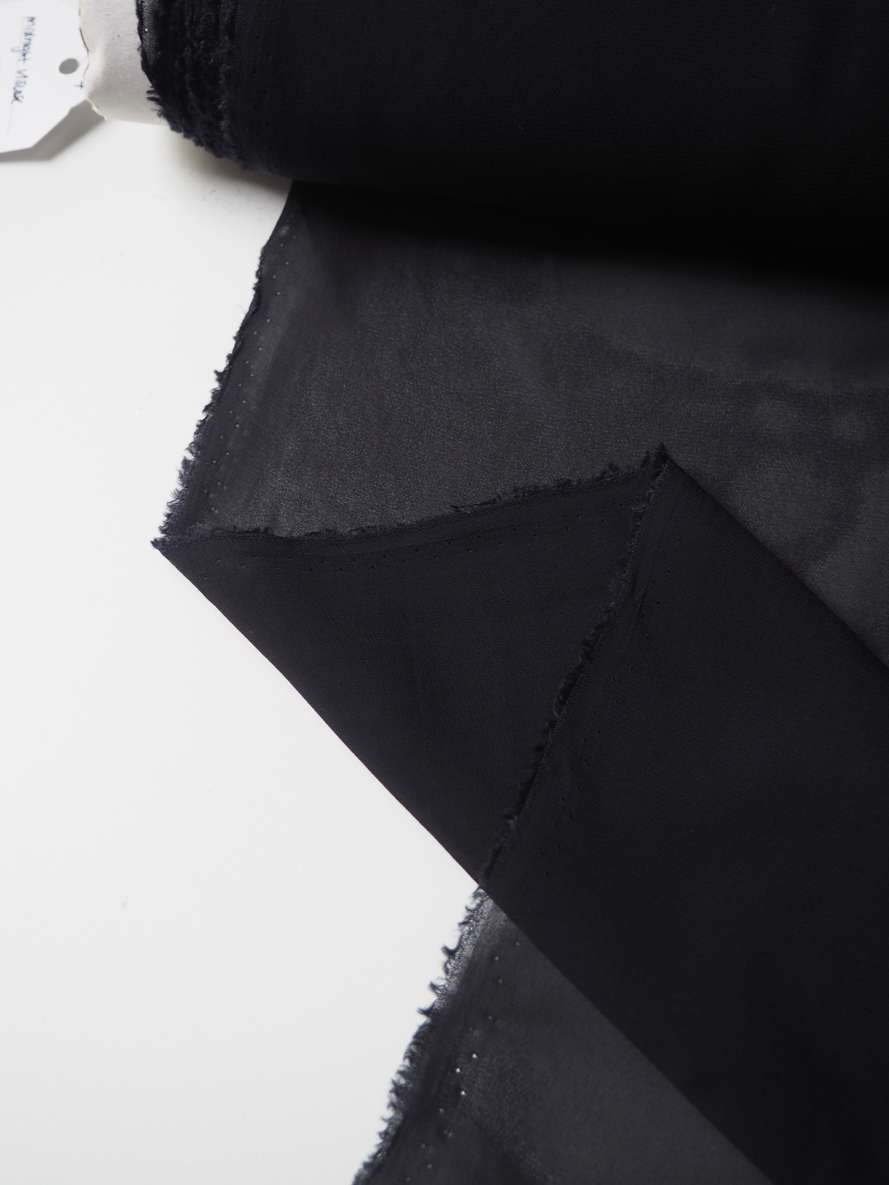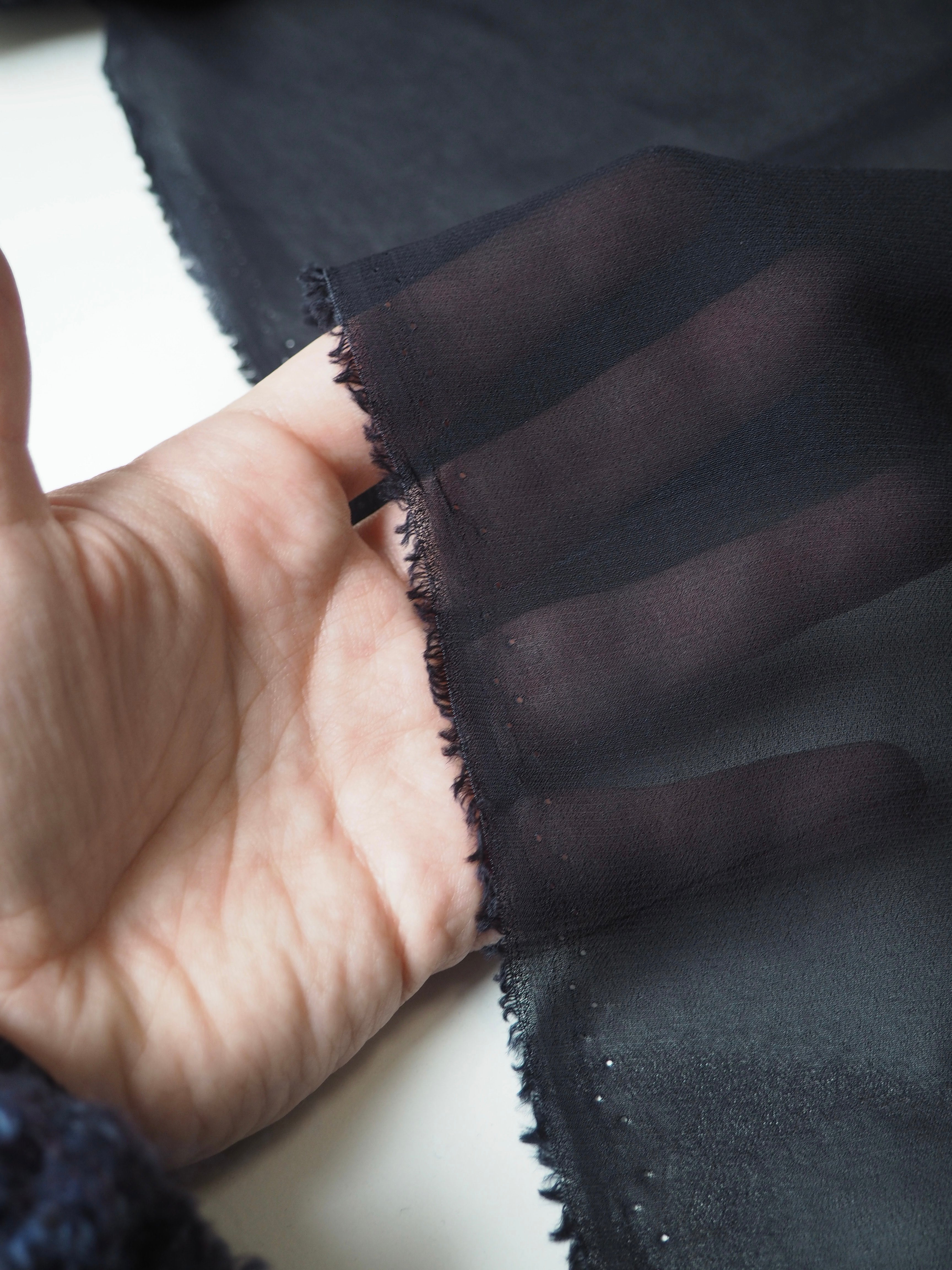 This ex-designer fabric is a chiffon. In a rich deep midnight blue colour, and semi-sheer. Has a great handle with a slightly crepe-like texture. Super light and airy, and has great movement. Ideal for a floaty top or for an overlay on a skirt!