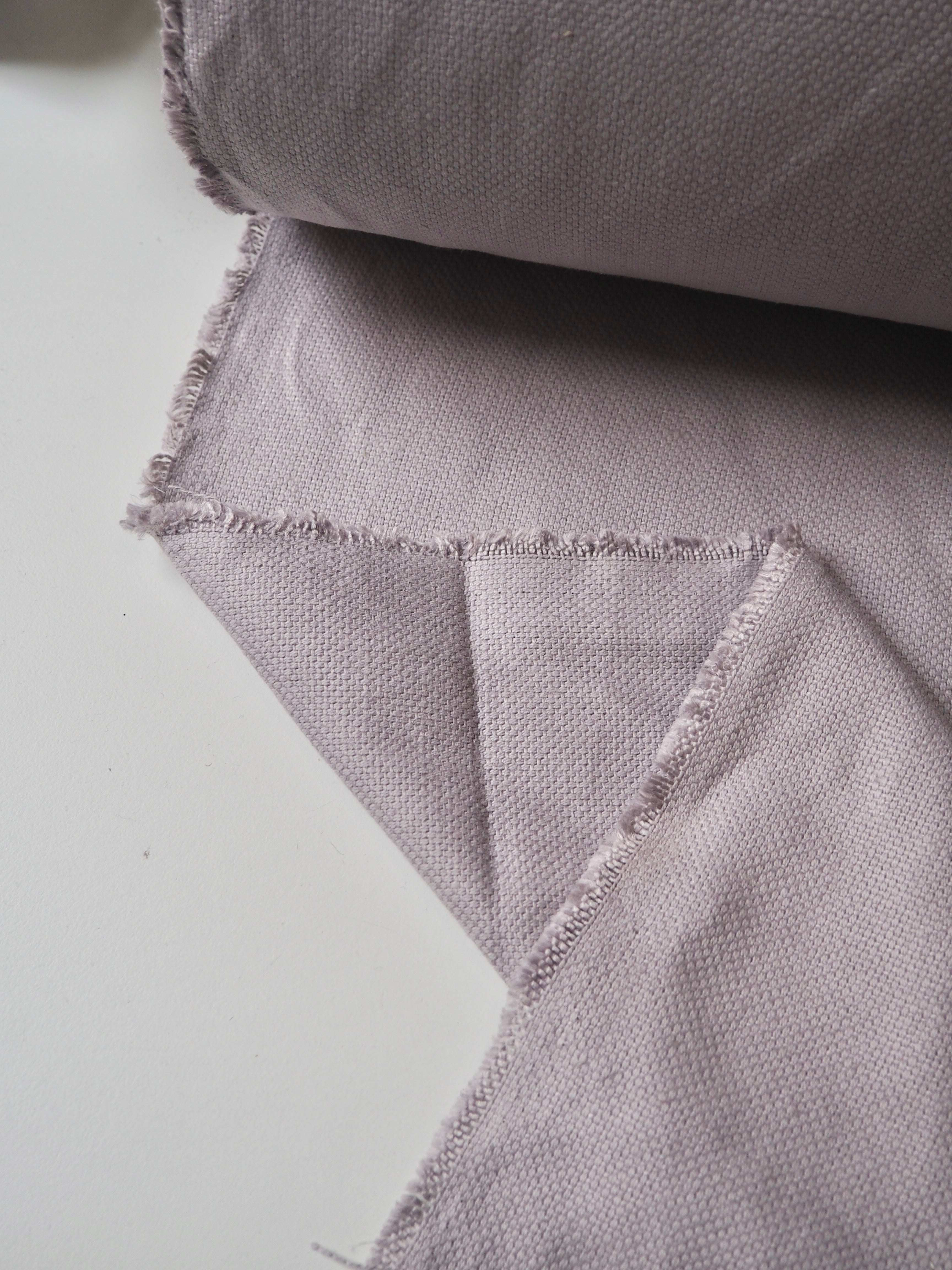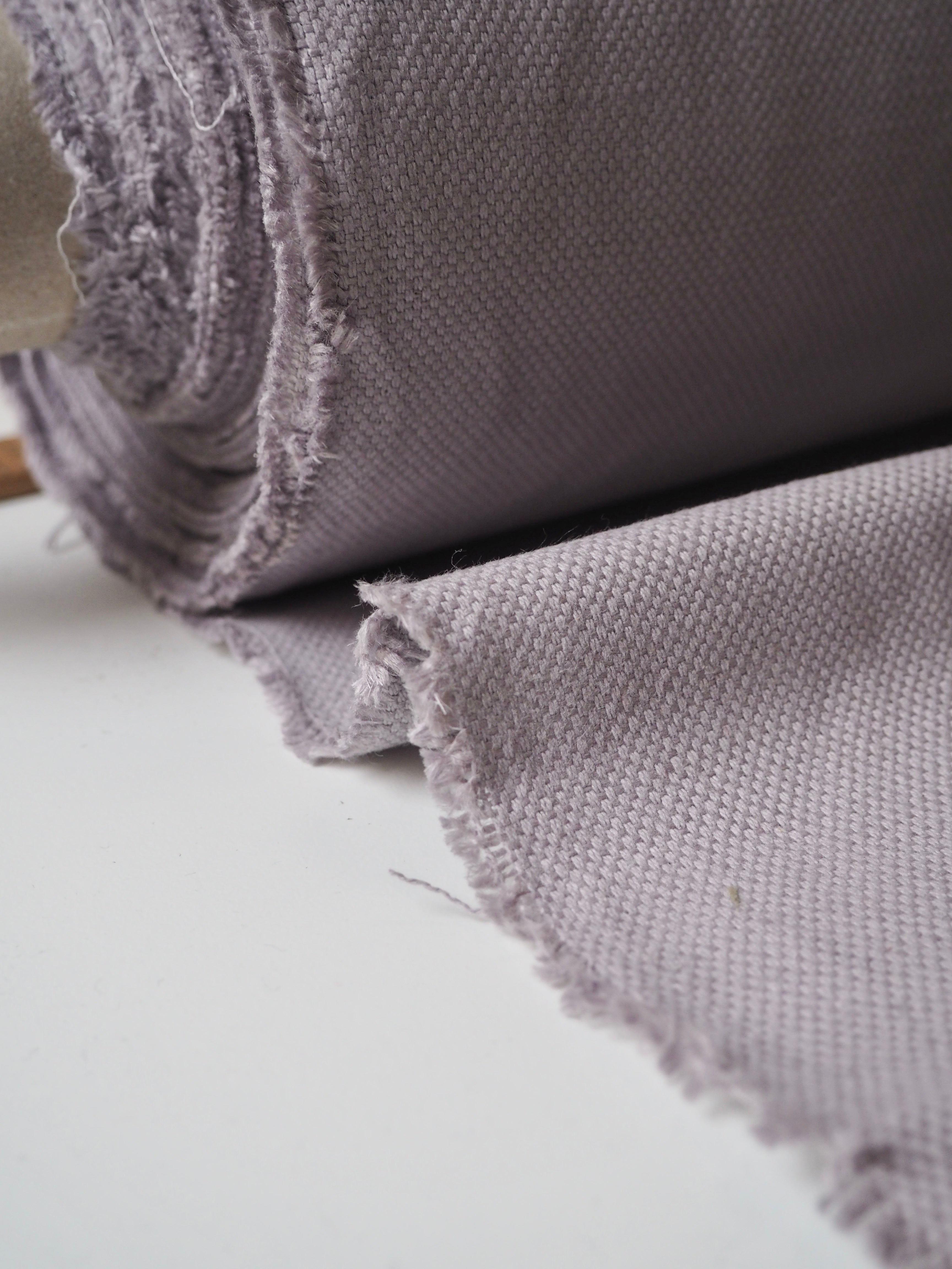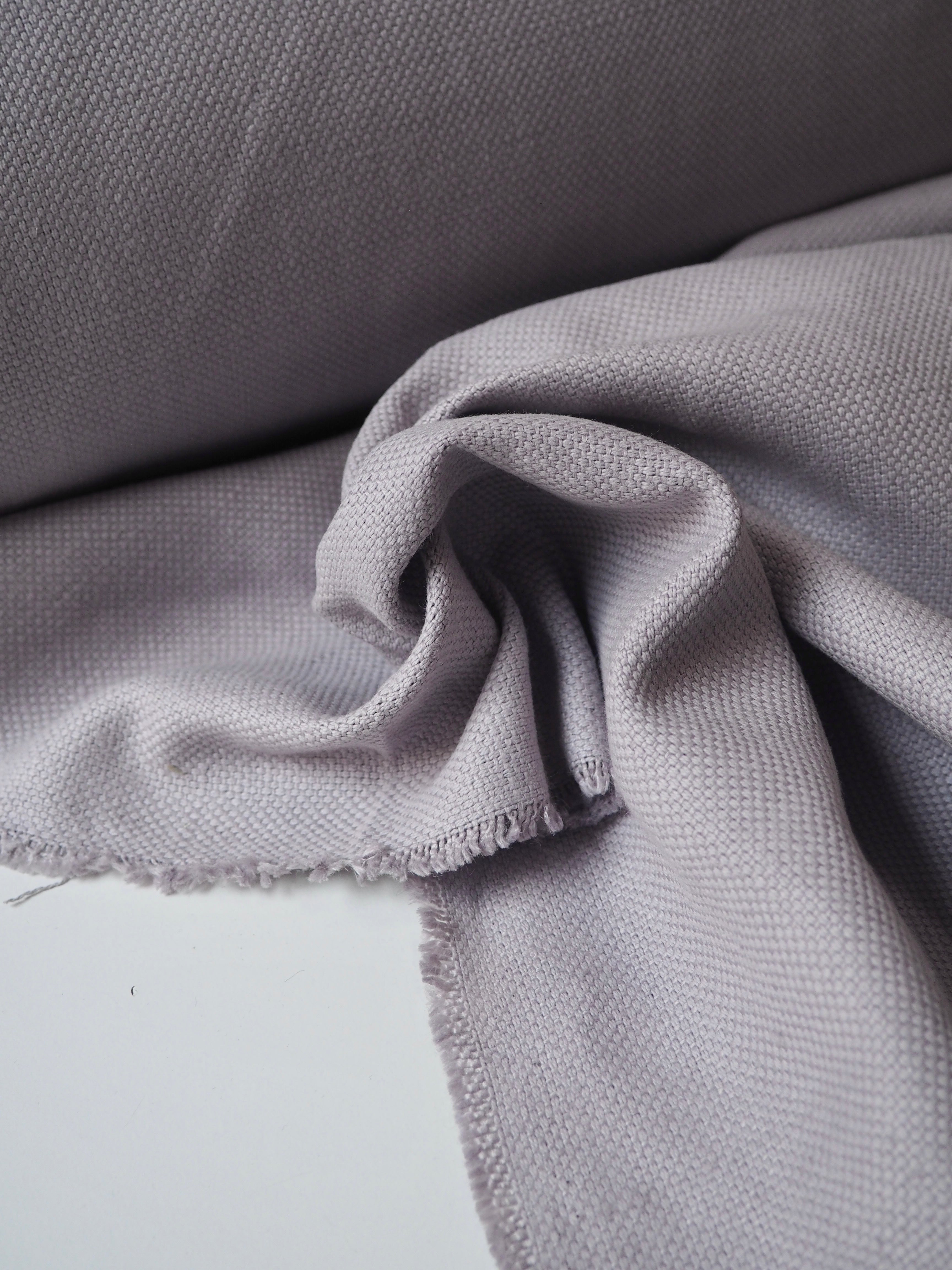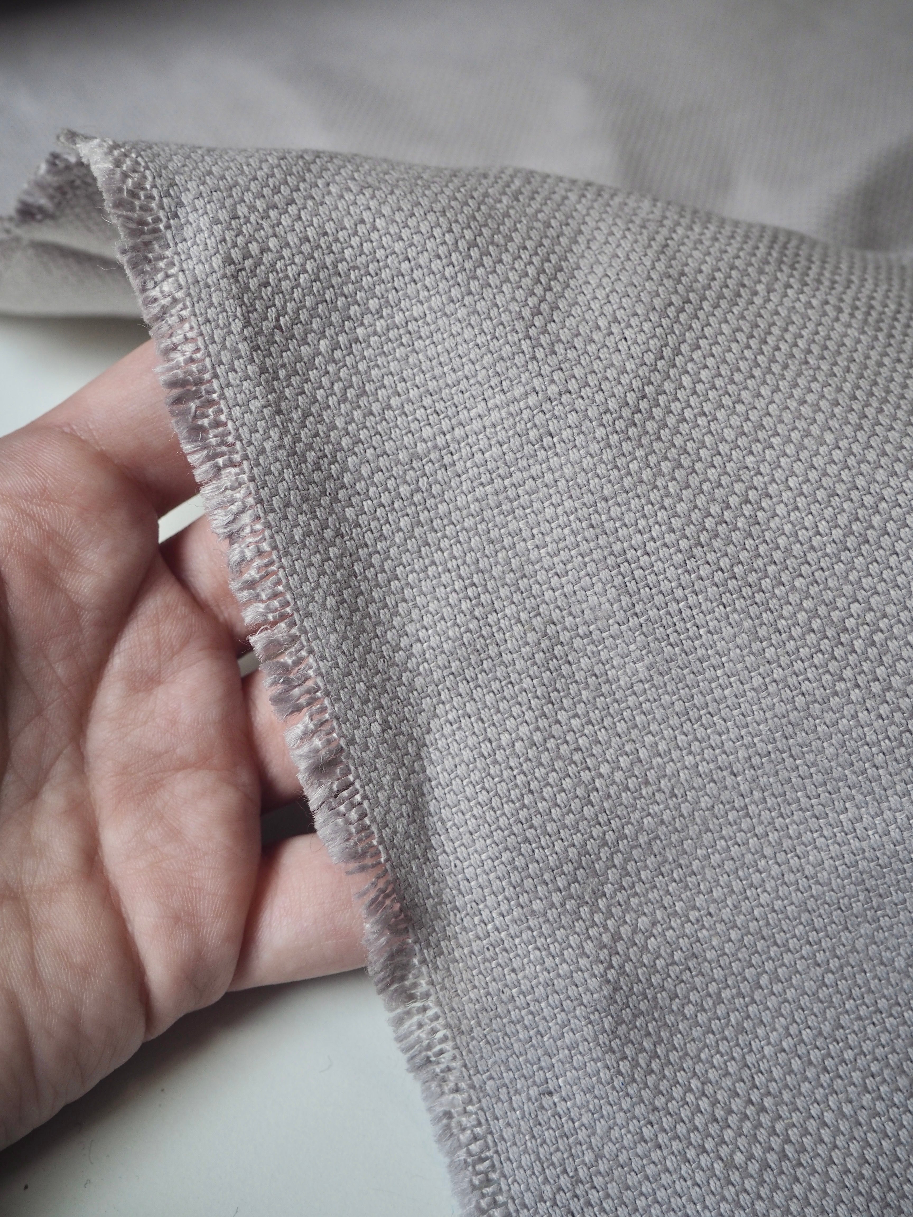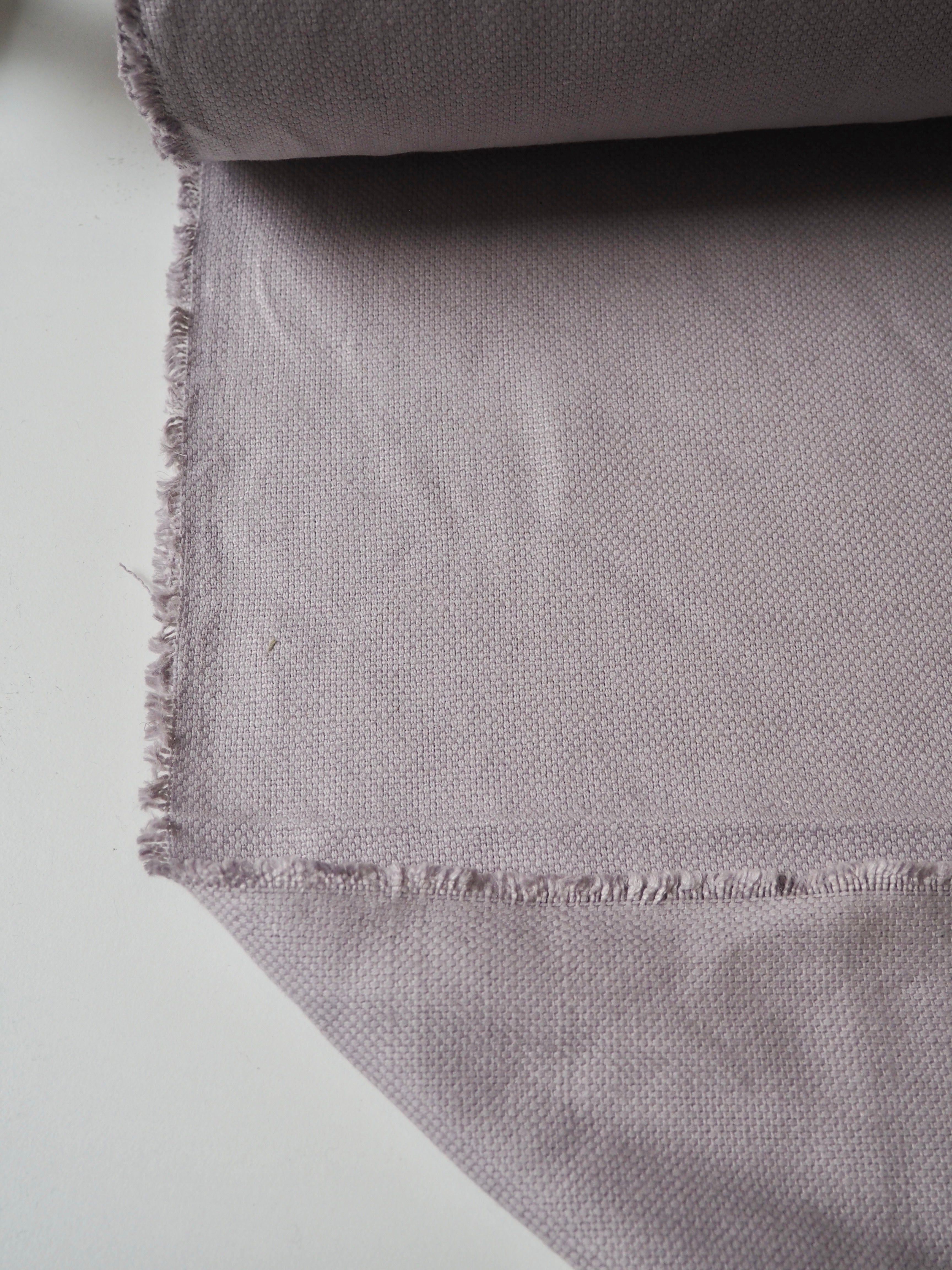 This ex-designer fabric is a linen/cotton. It's a strong basketweave cloth, with a great texture in a medium to heavy weight. It has the same texture and similar weave to a canvas. Made in a balanced cotton and linen blend. Very soft and fully opaque. In a misty grey colour, with a purple undertone. Has a great structure, perfect for a jumpsuit or jacket! The designer, Stalf, use this to make jumpsuits!